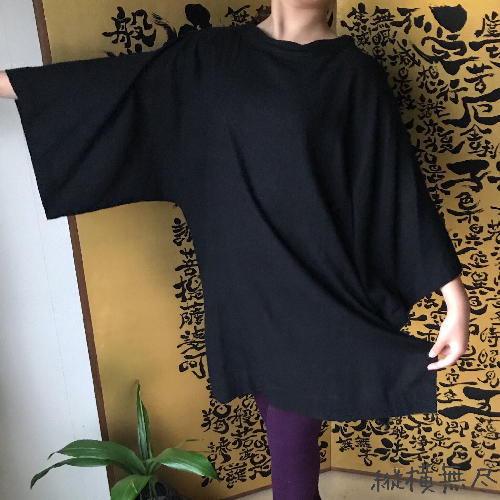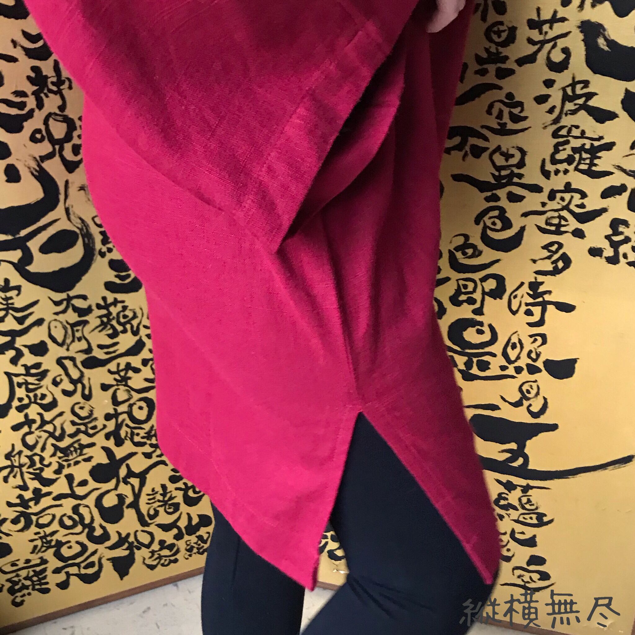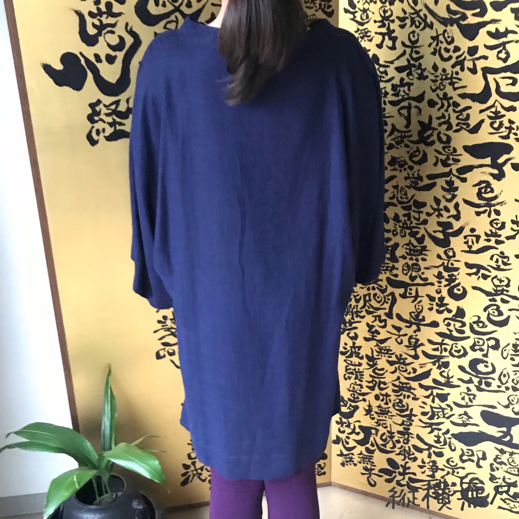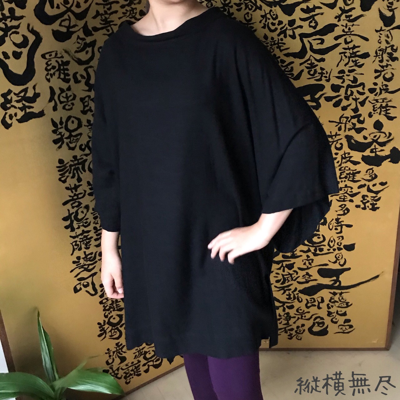 襟のラウンドネックと裾のスリットが着やすさと動きやすさを感じさせてくれます。