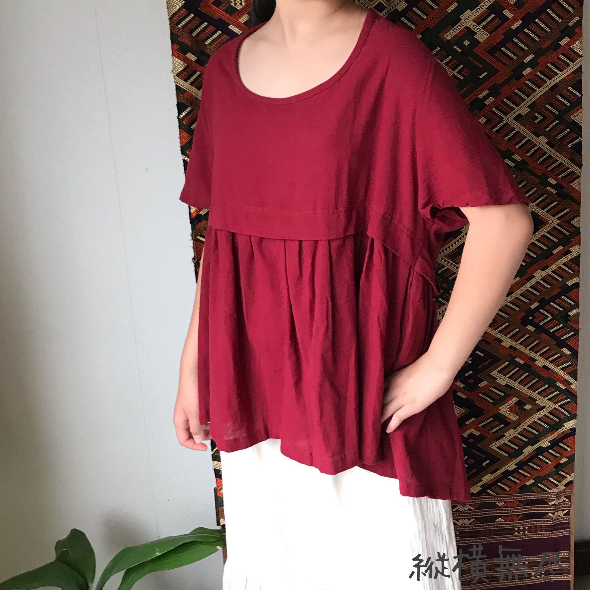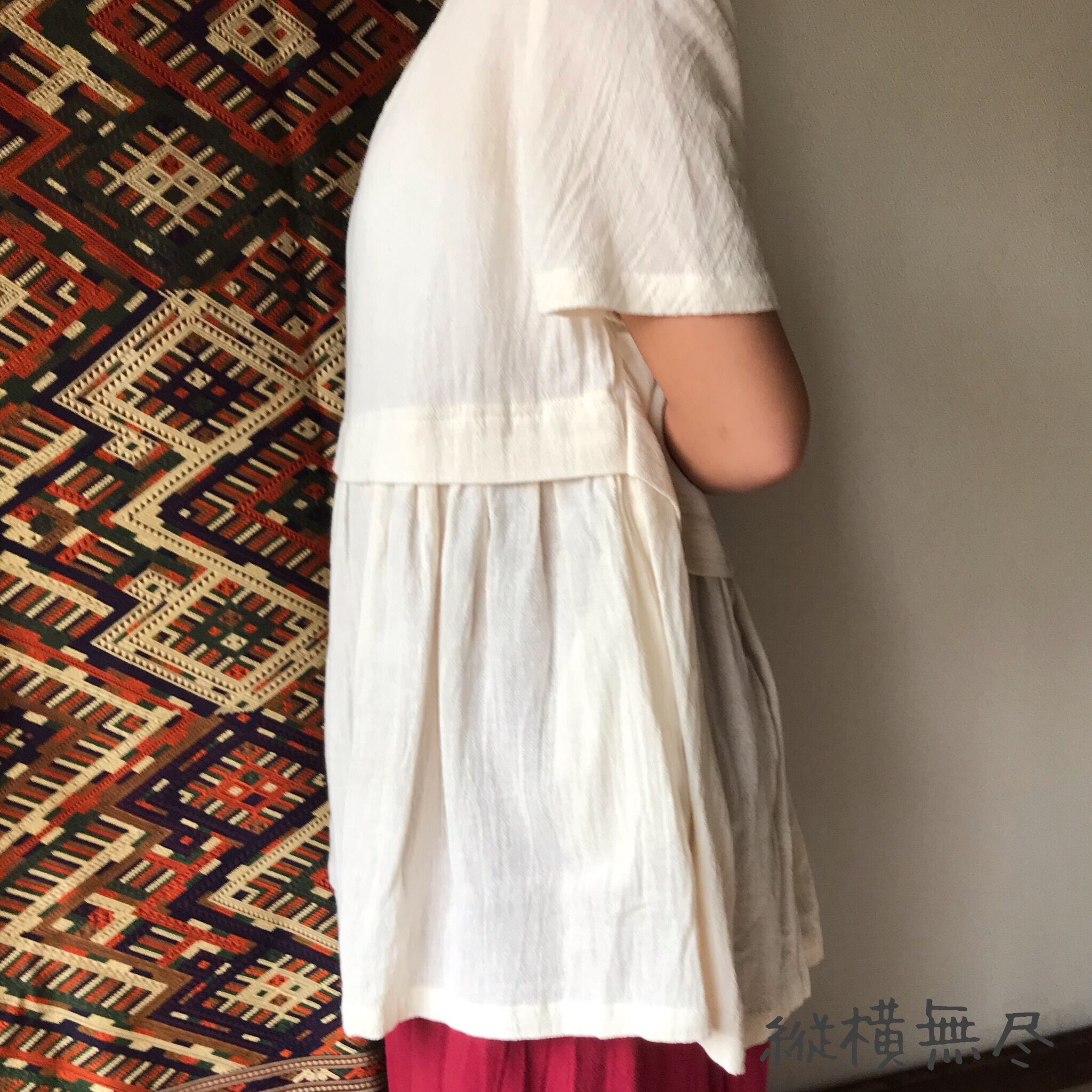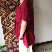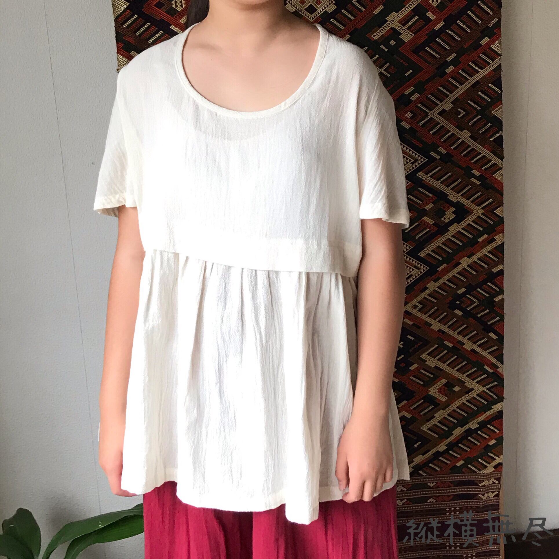 前裾と後ろ裾にほどこされたたっぷりシャーリングが涼しげにかつエレガントに体型をカバーしてくれるブラウスです。