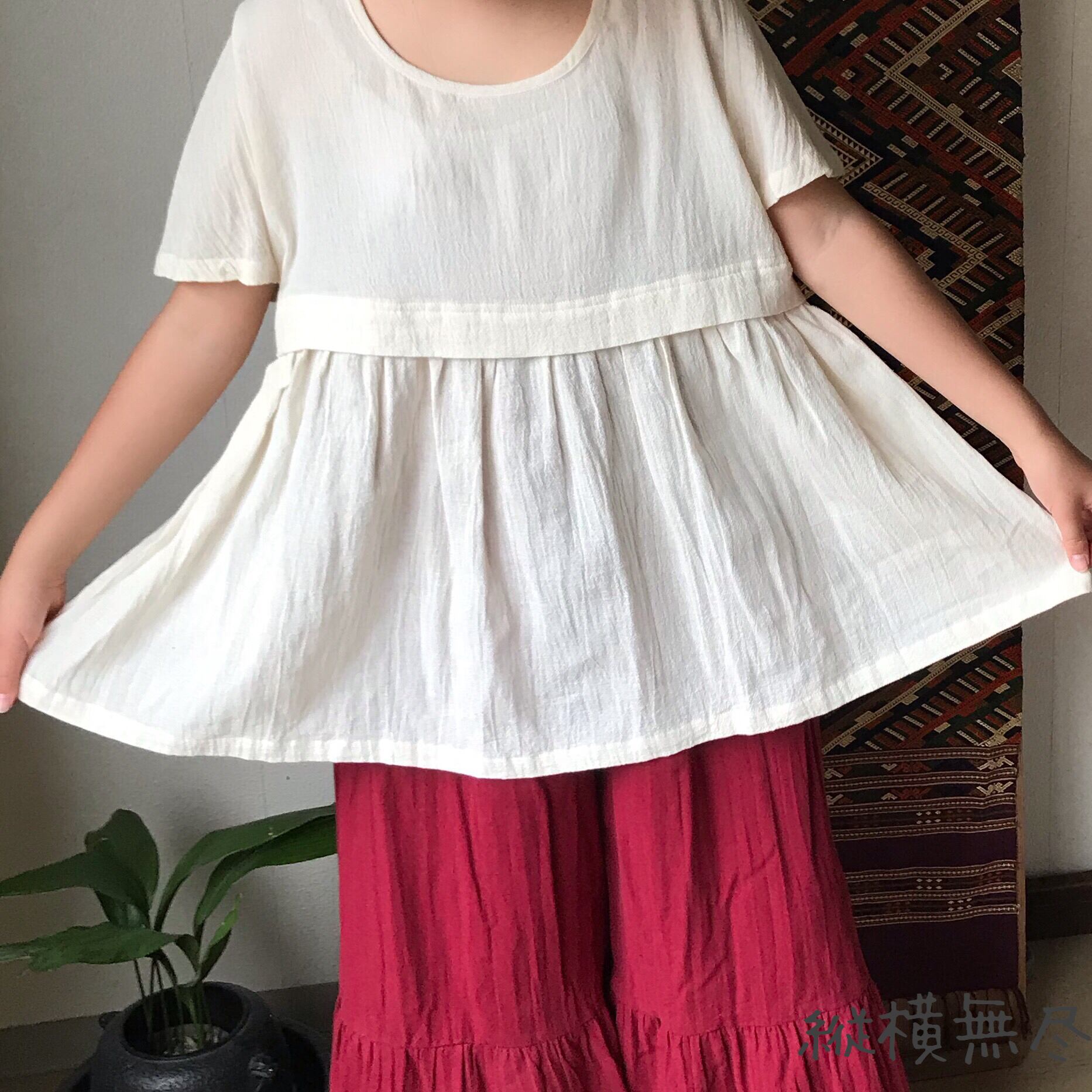 『前裾と後ろ裾が可愛い丸首のコットンブラウス』