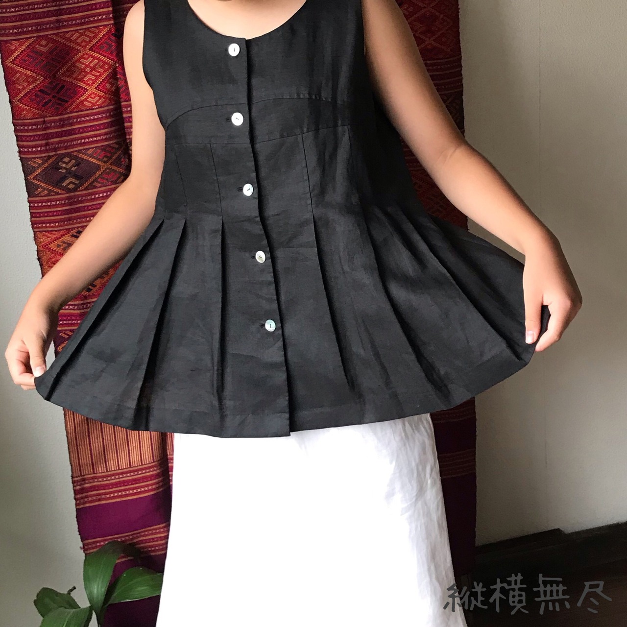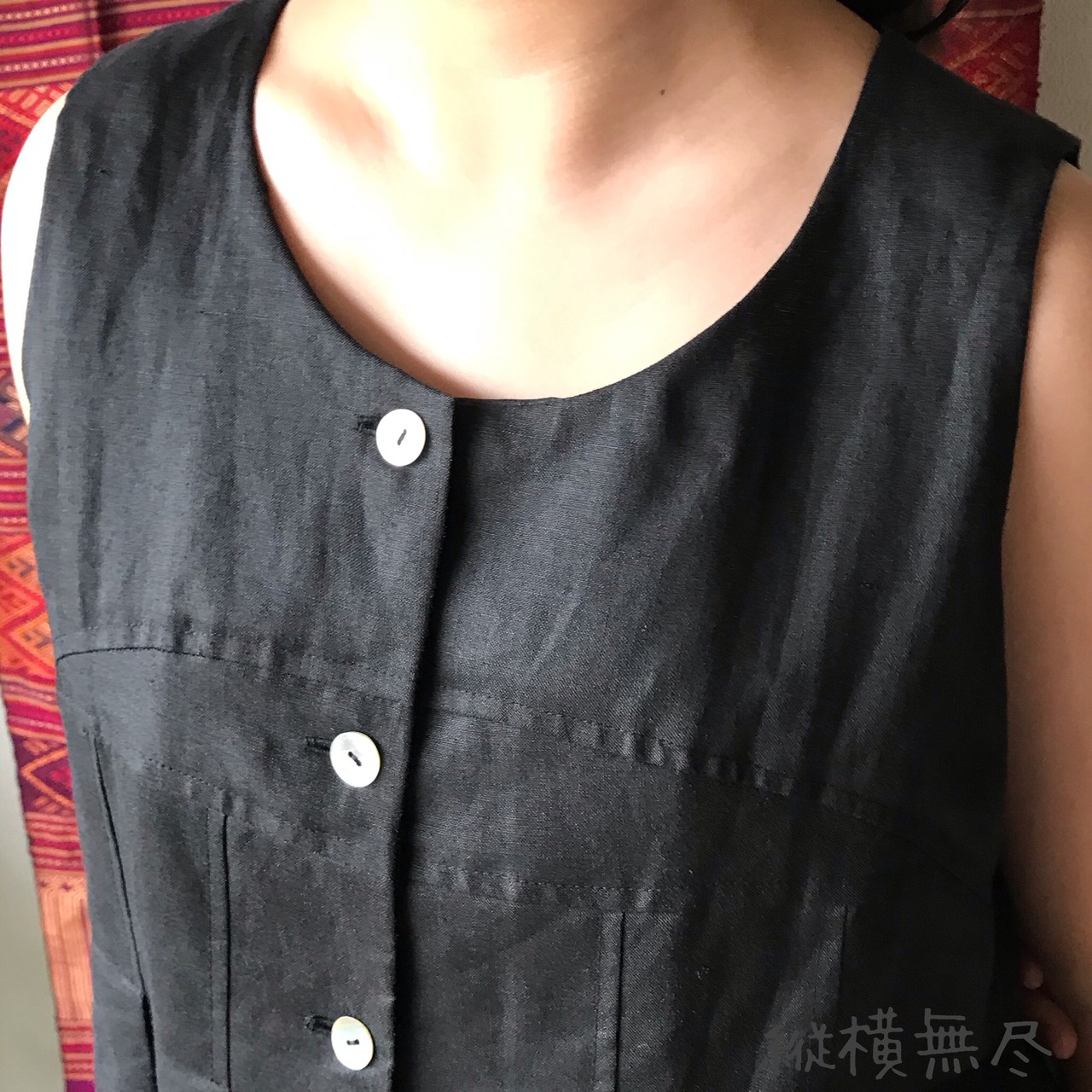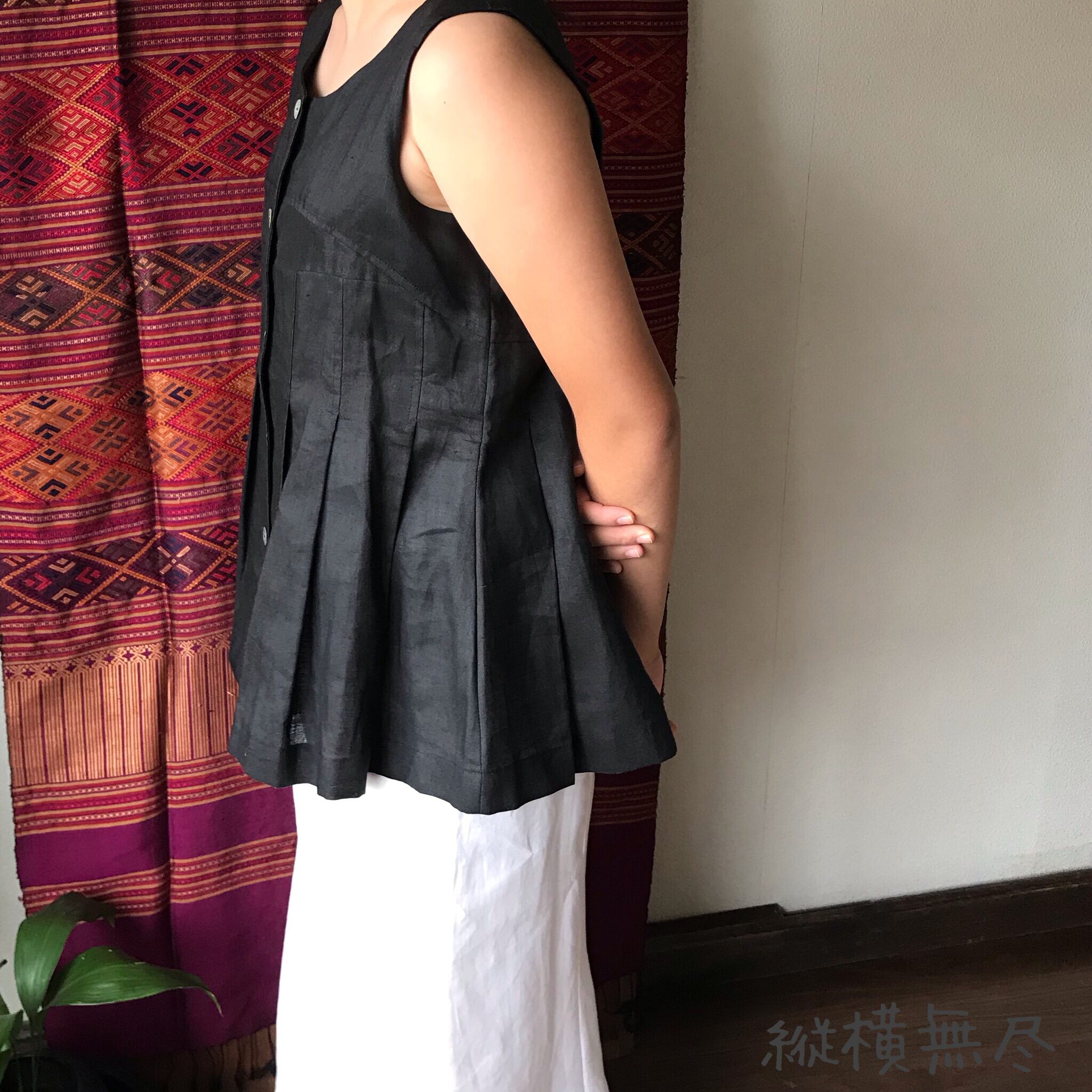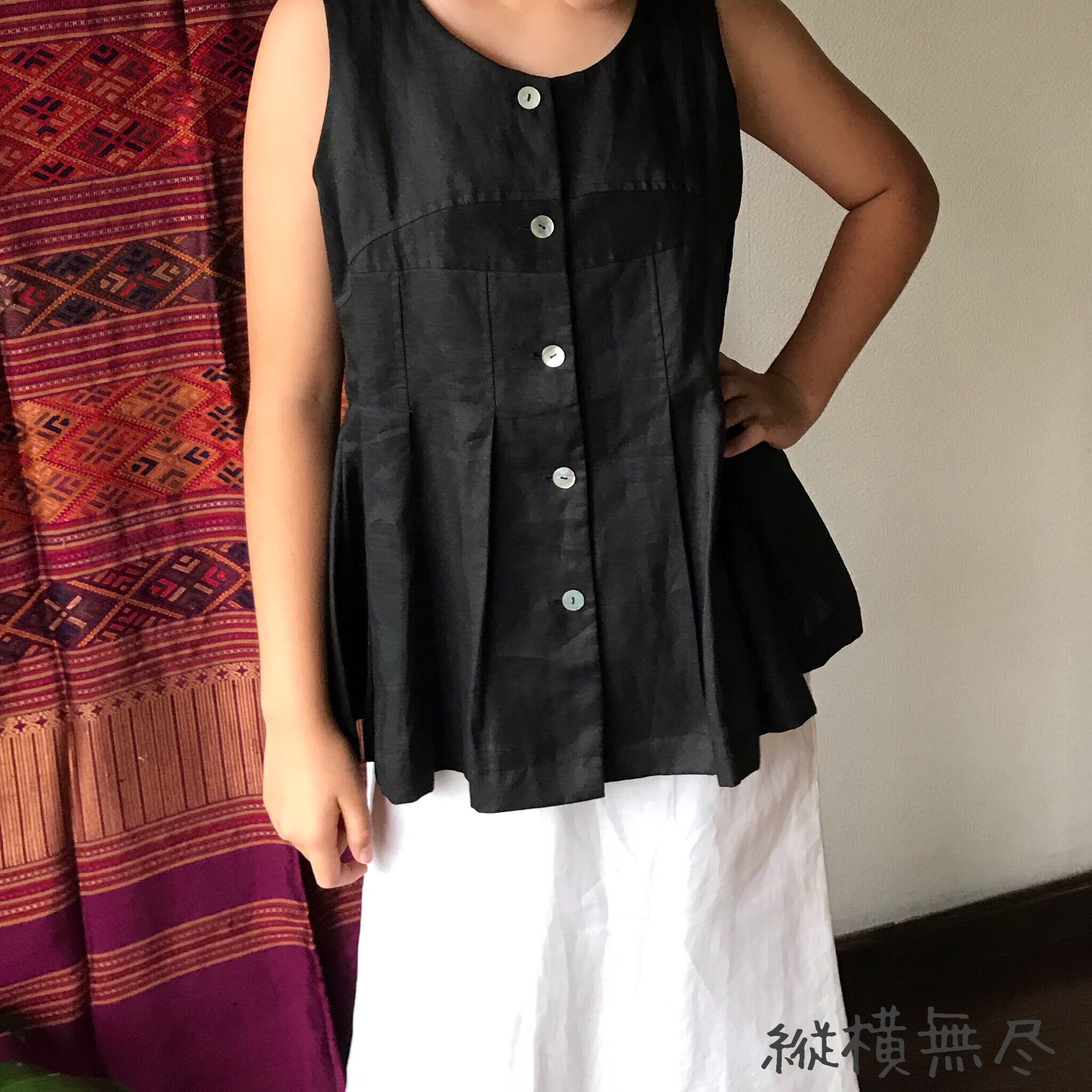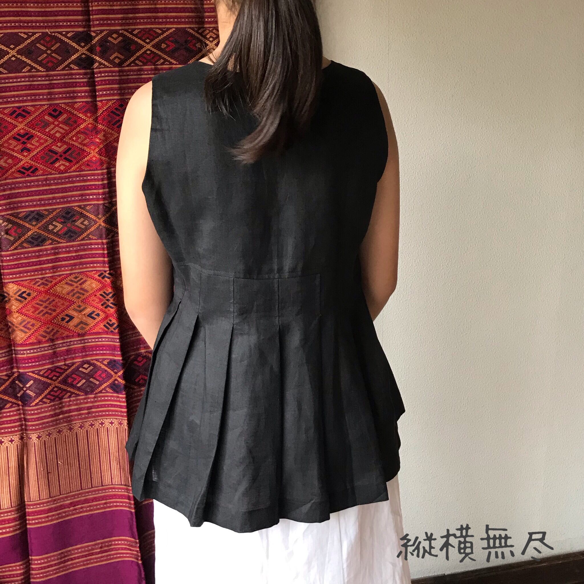 前身頃の切り替えと裾フリルが可愛いリネンの前開きベストブラウス