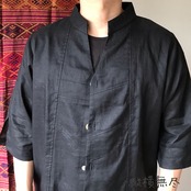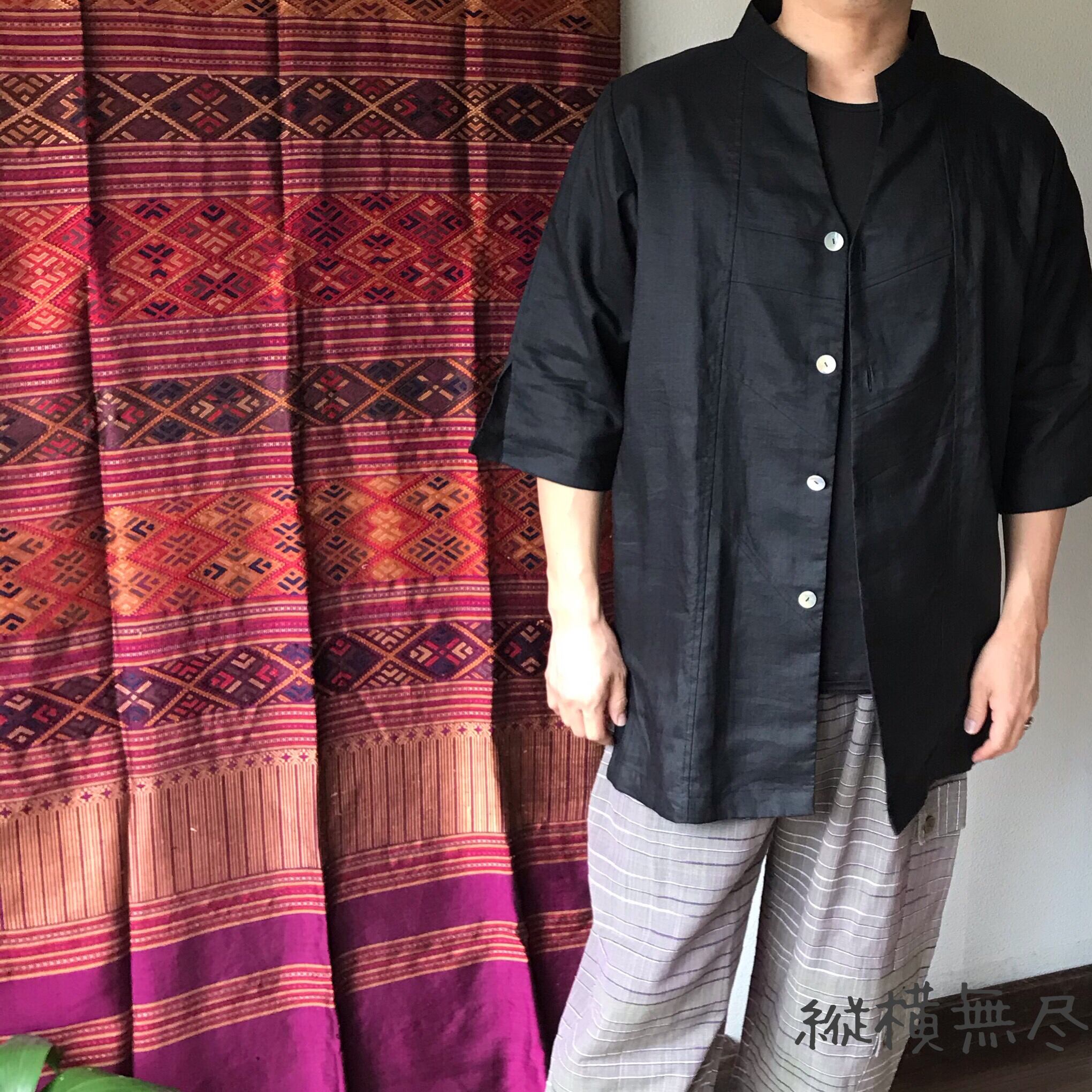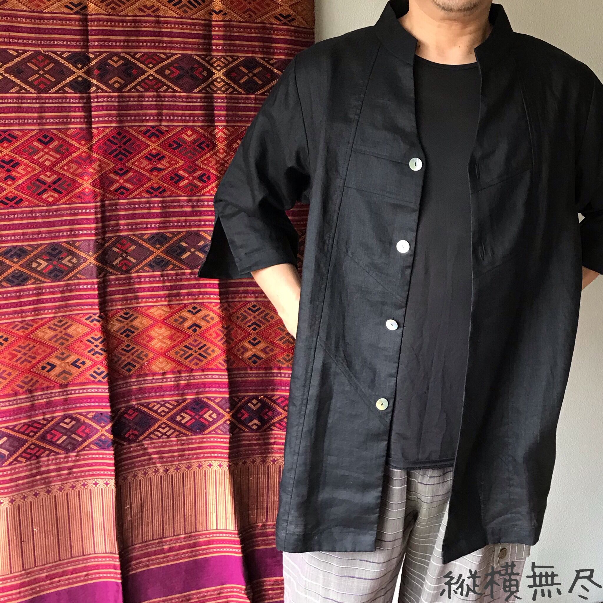 『前後の凝ったセンター切り返しが渋いリネンメンズ半袖ブラウス』