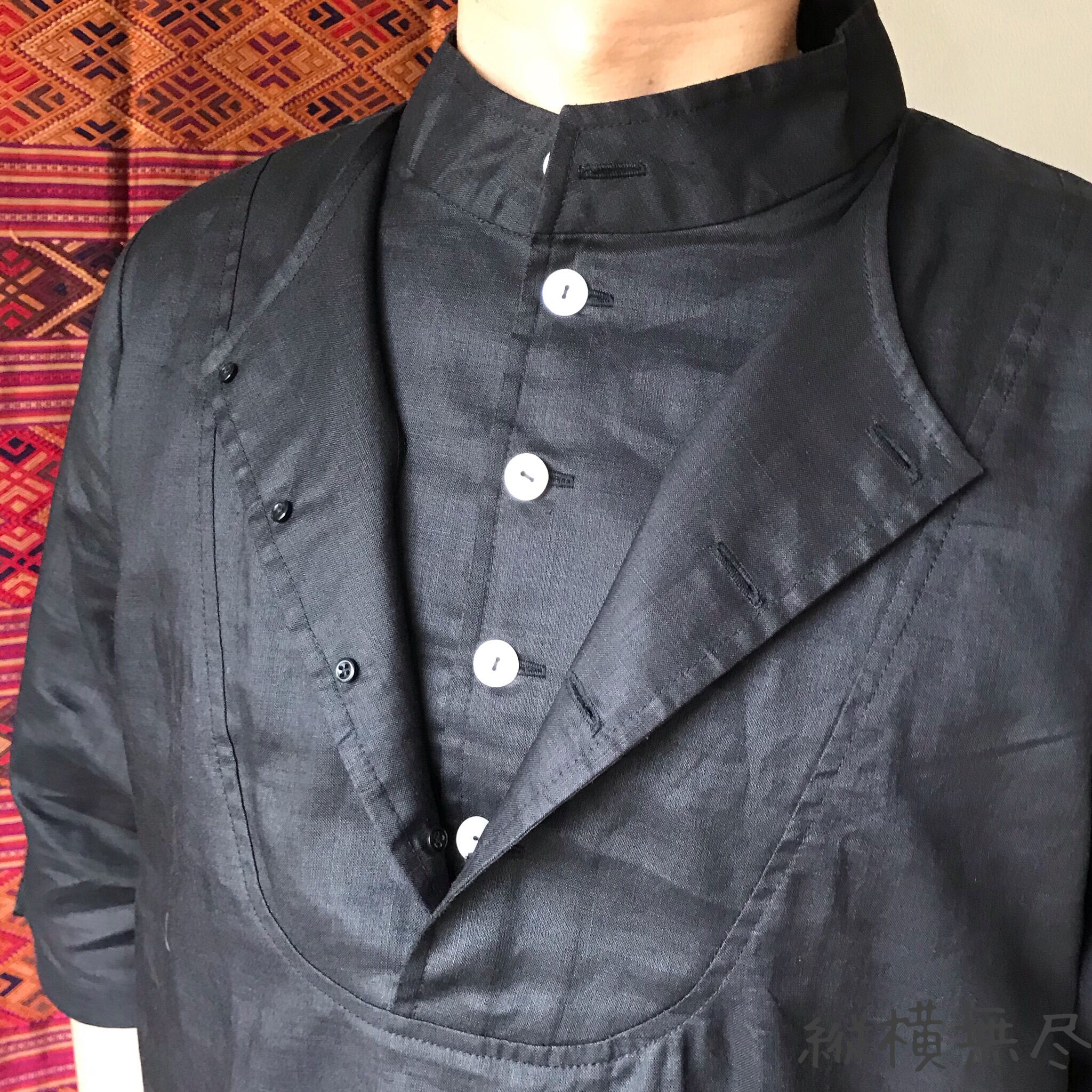 『2重の襟が個性的でかっこいいリネンのメンズ半袖ブラウス』