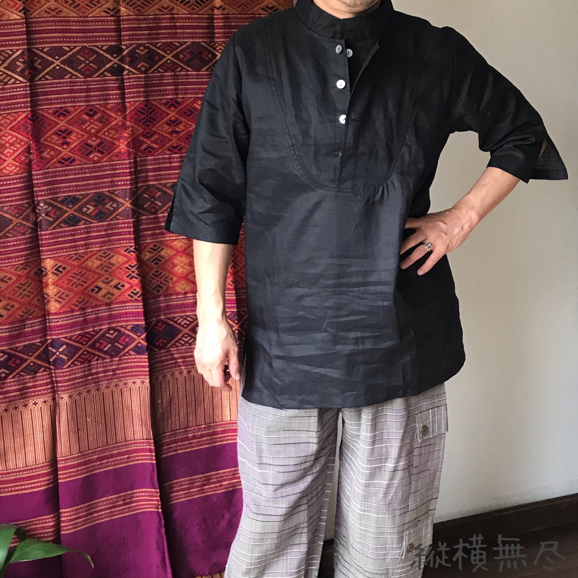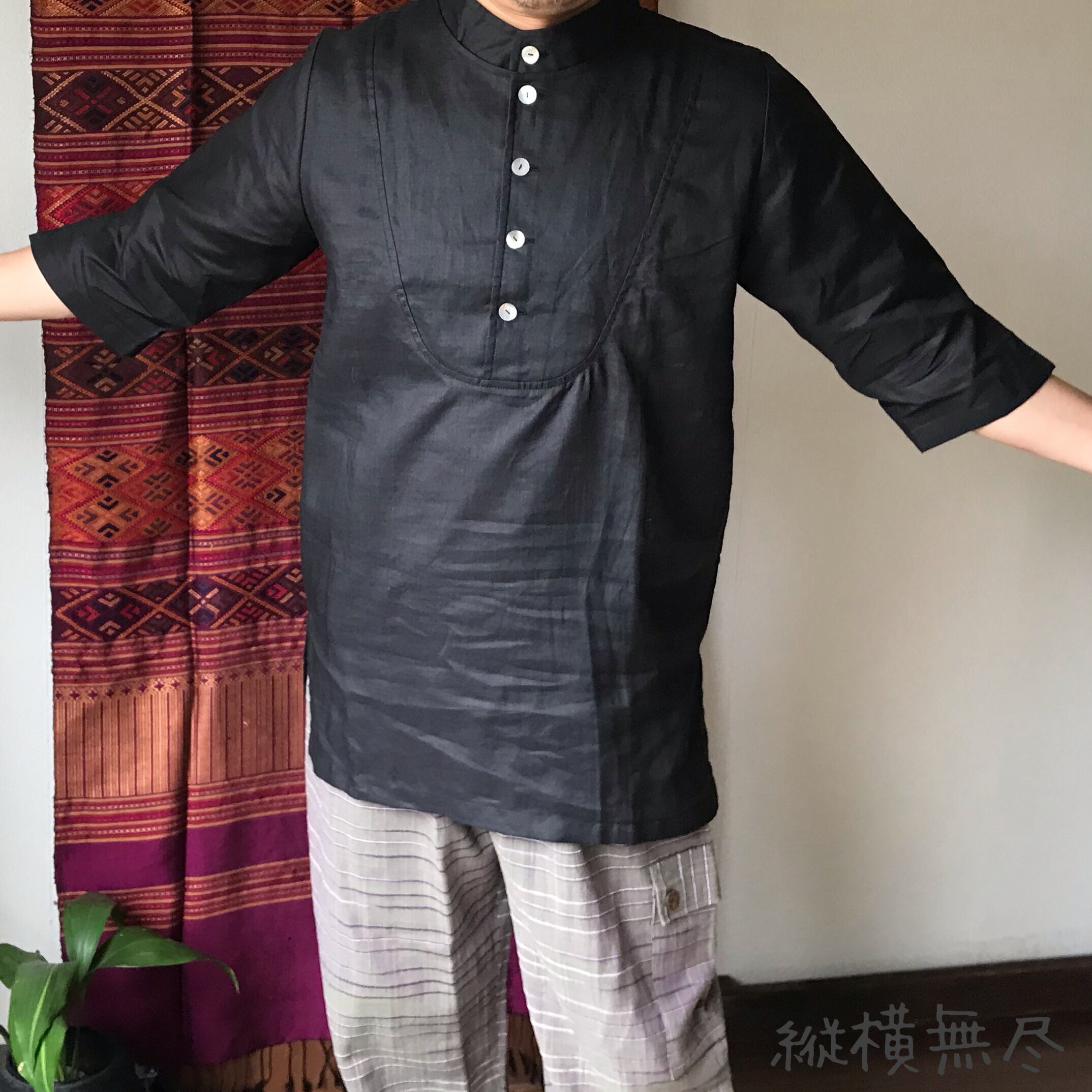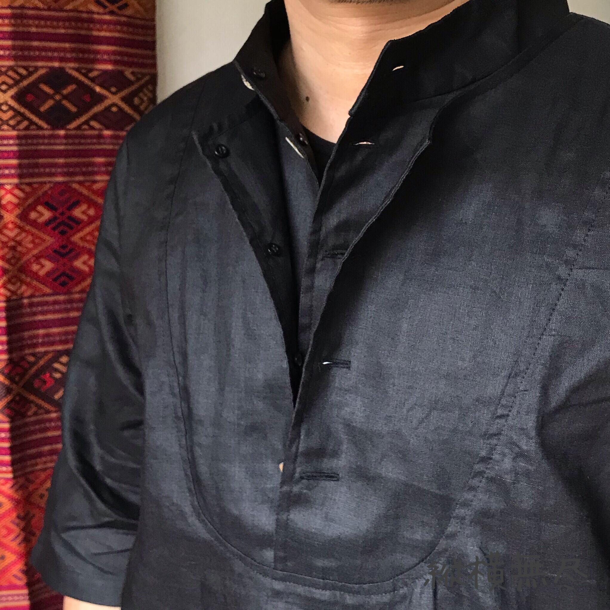 襟が二重になっているので、一つだけ開いてもよし、全部留めてもよし、全部開いてもよしの個性的なメンズブラウスです。
