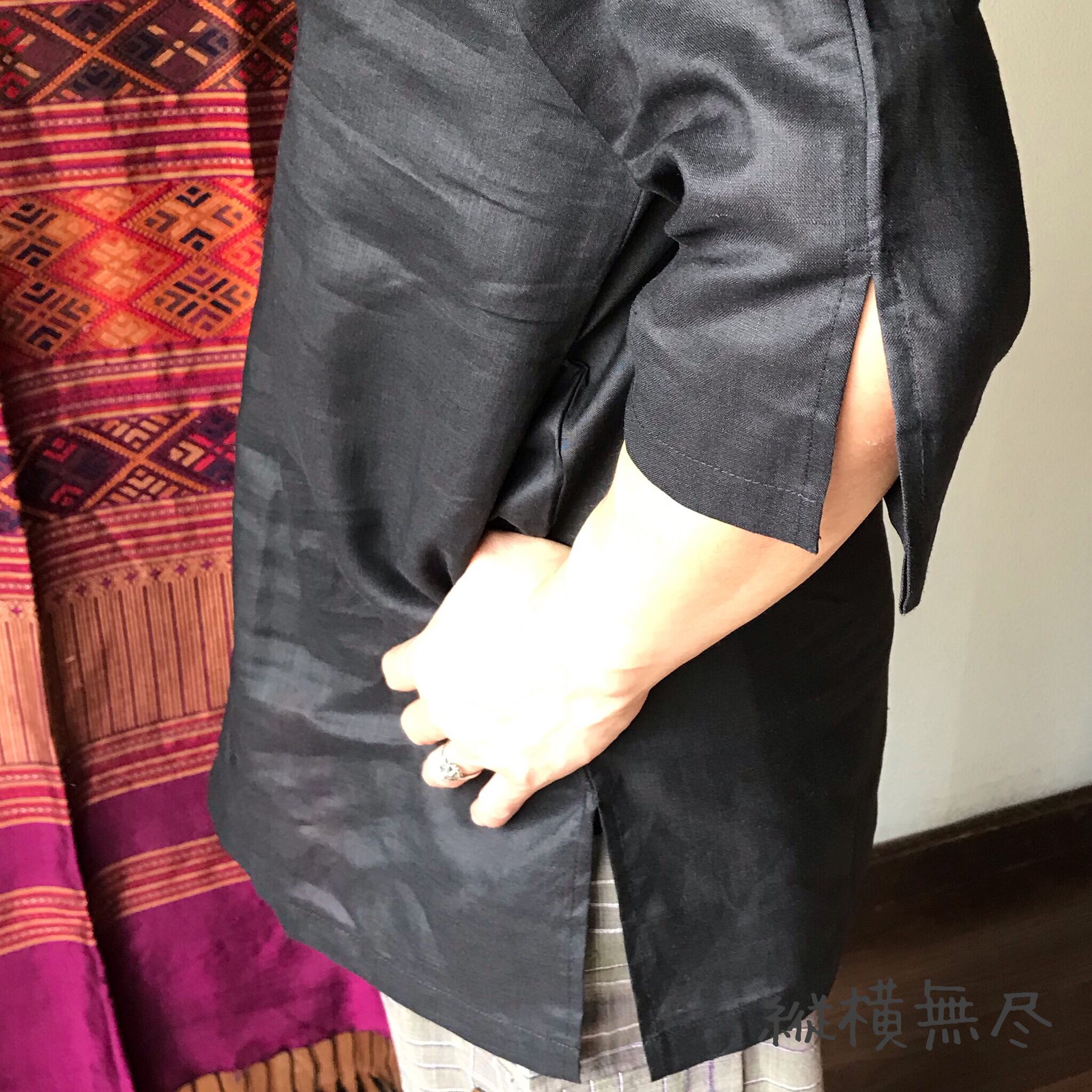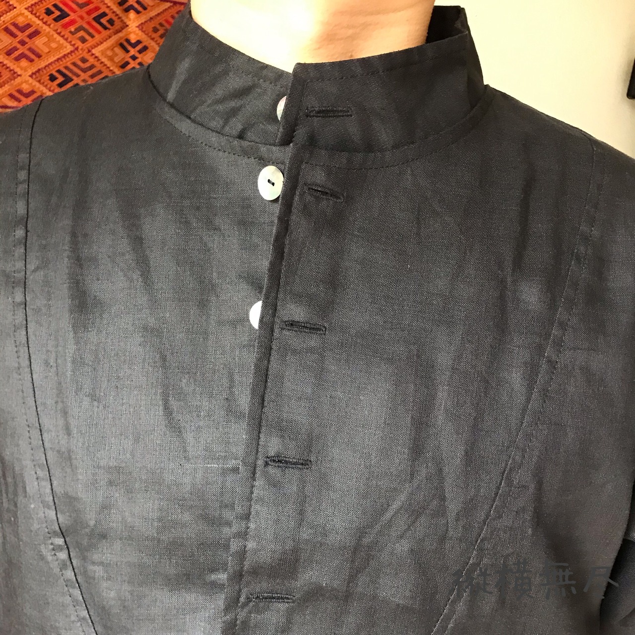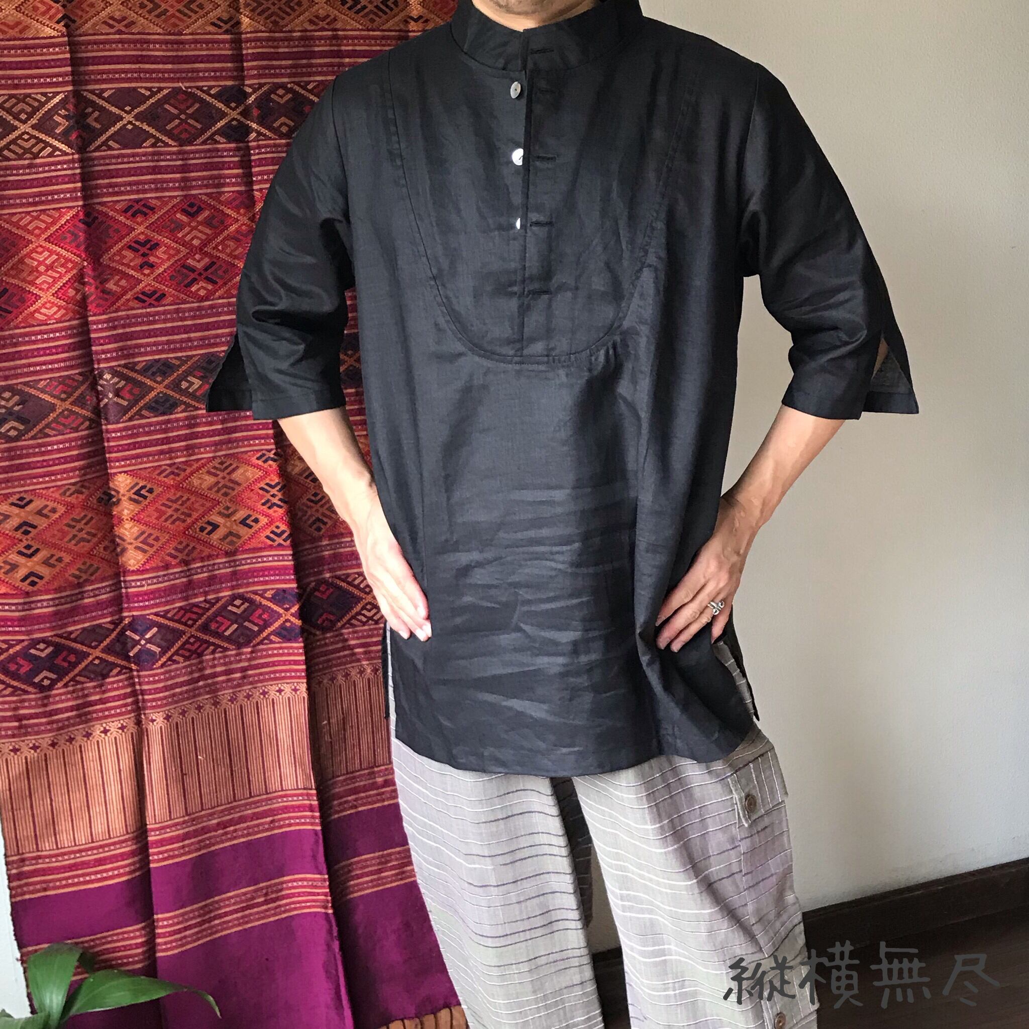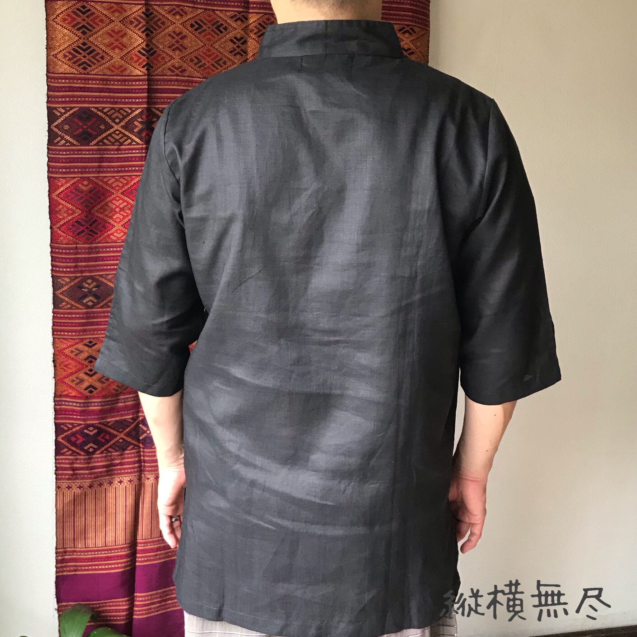 襟が二重になっているので、一つだけ開いてもよし、全部留めてもよし、全部開いてもよしの個性的なメンズブラウスです。