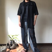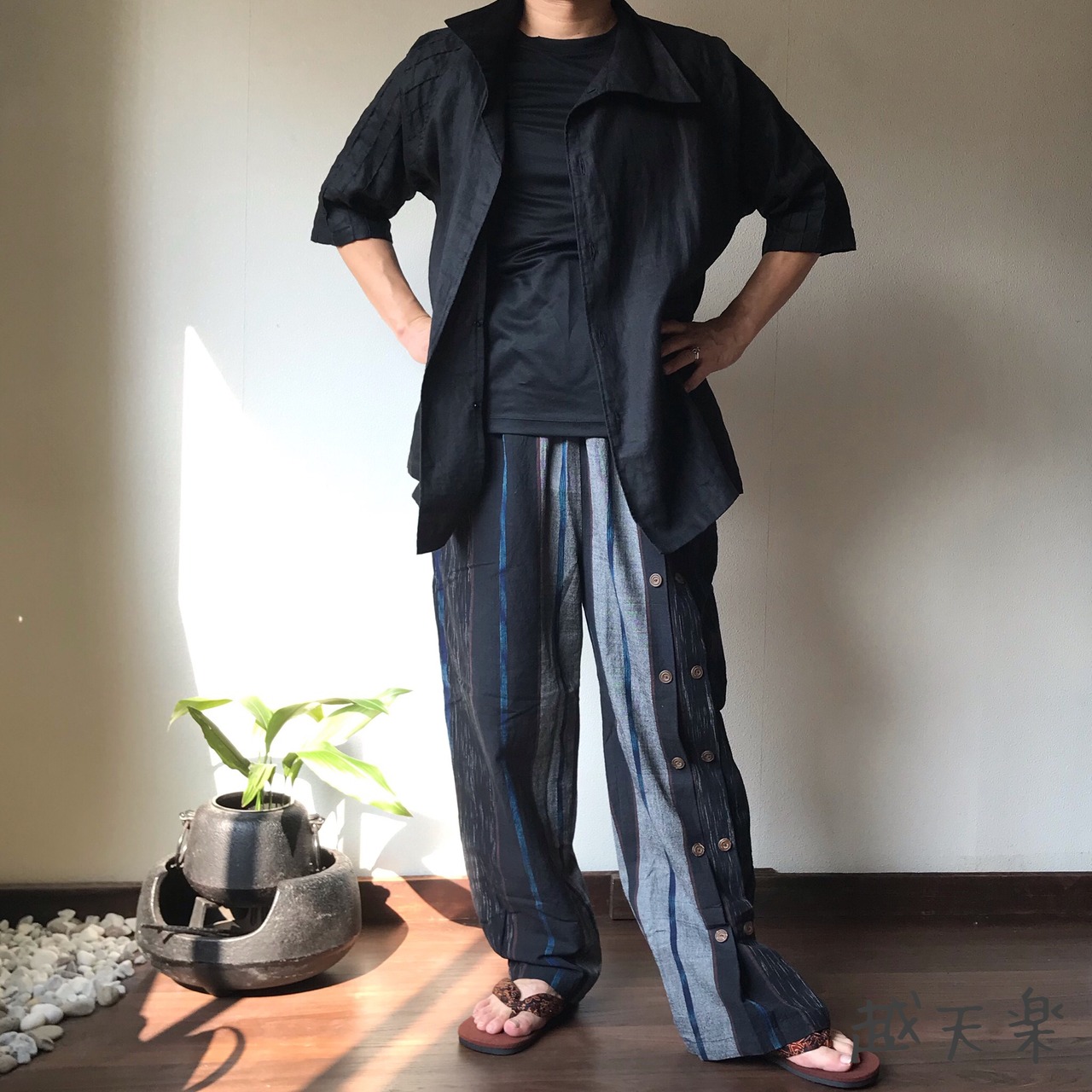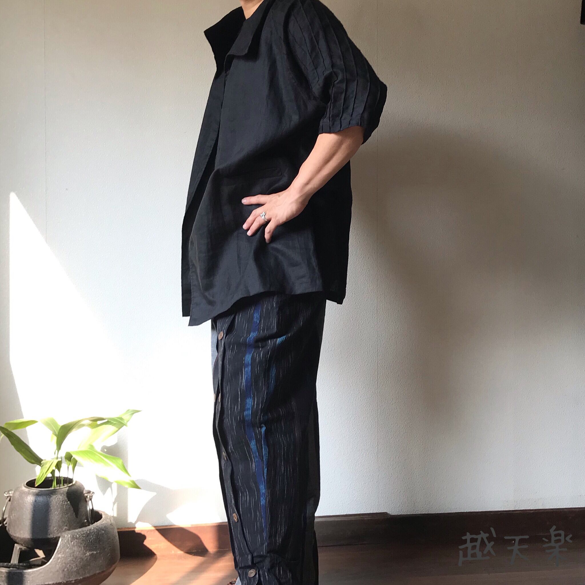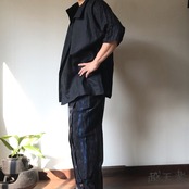 写真セットで履いているダブルボタン黒青絣と黒無地の手織り綿パンツはこちら↓