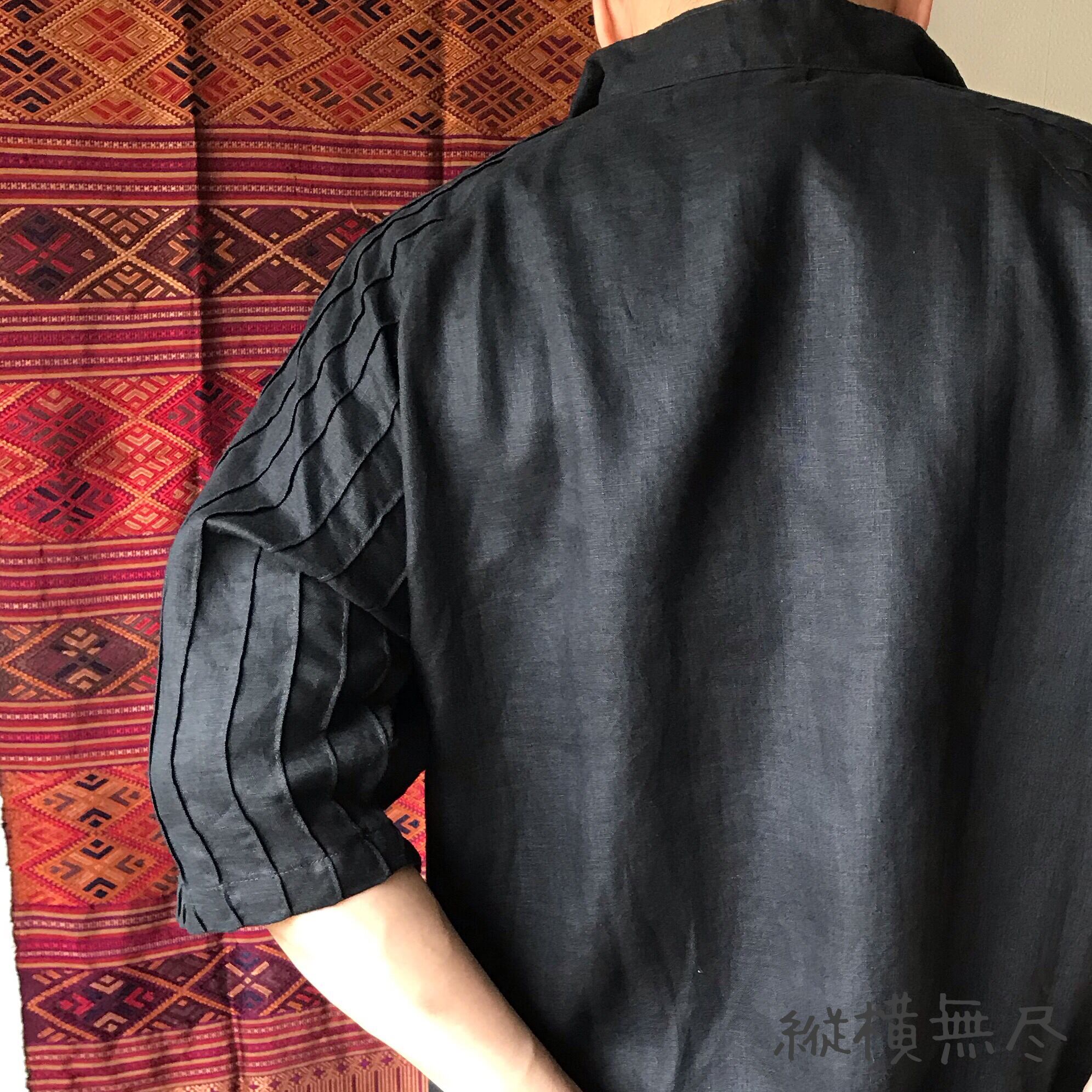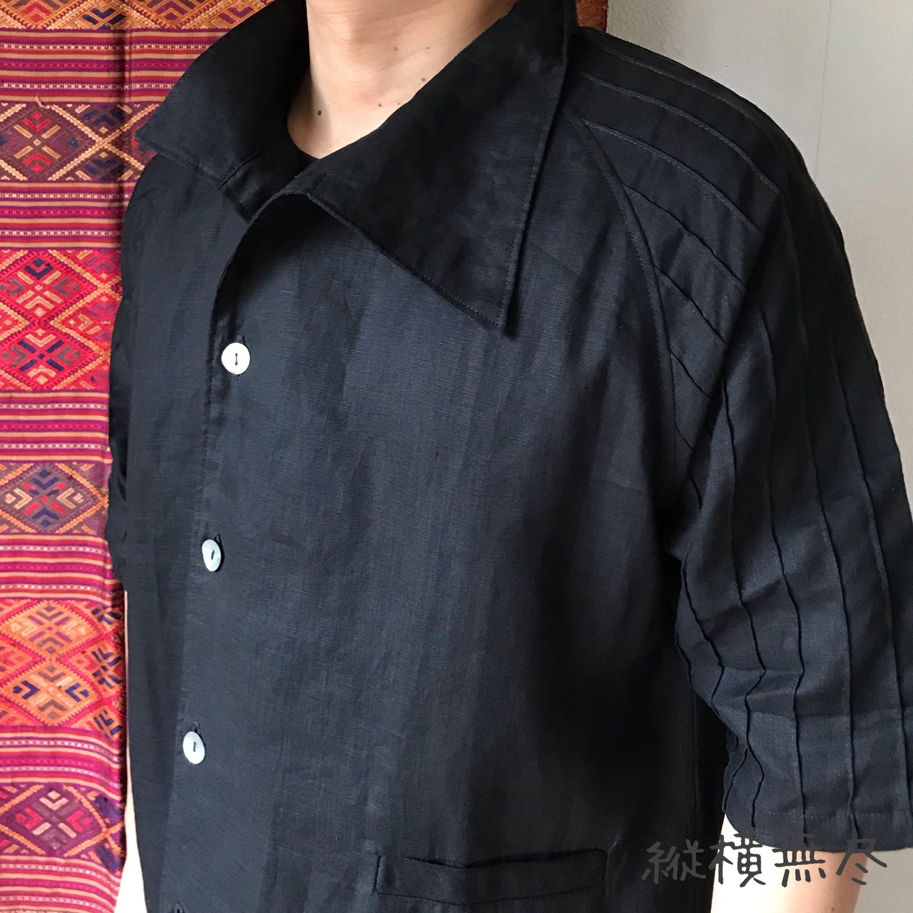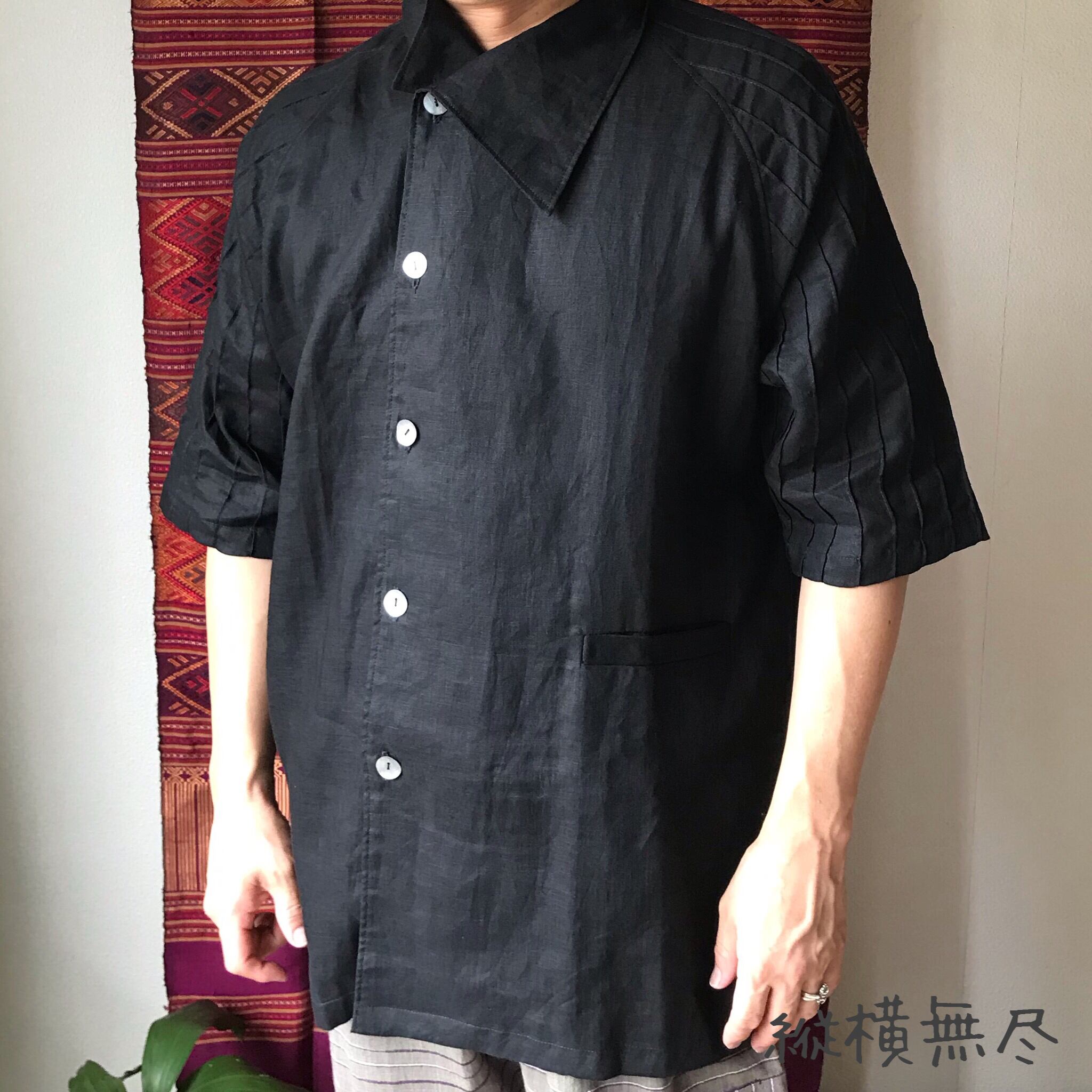 『アシンメトリー襟とピンタックの袖がシャープな印象のリネンのメンズ半袖ブラウス』
