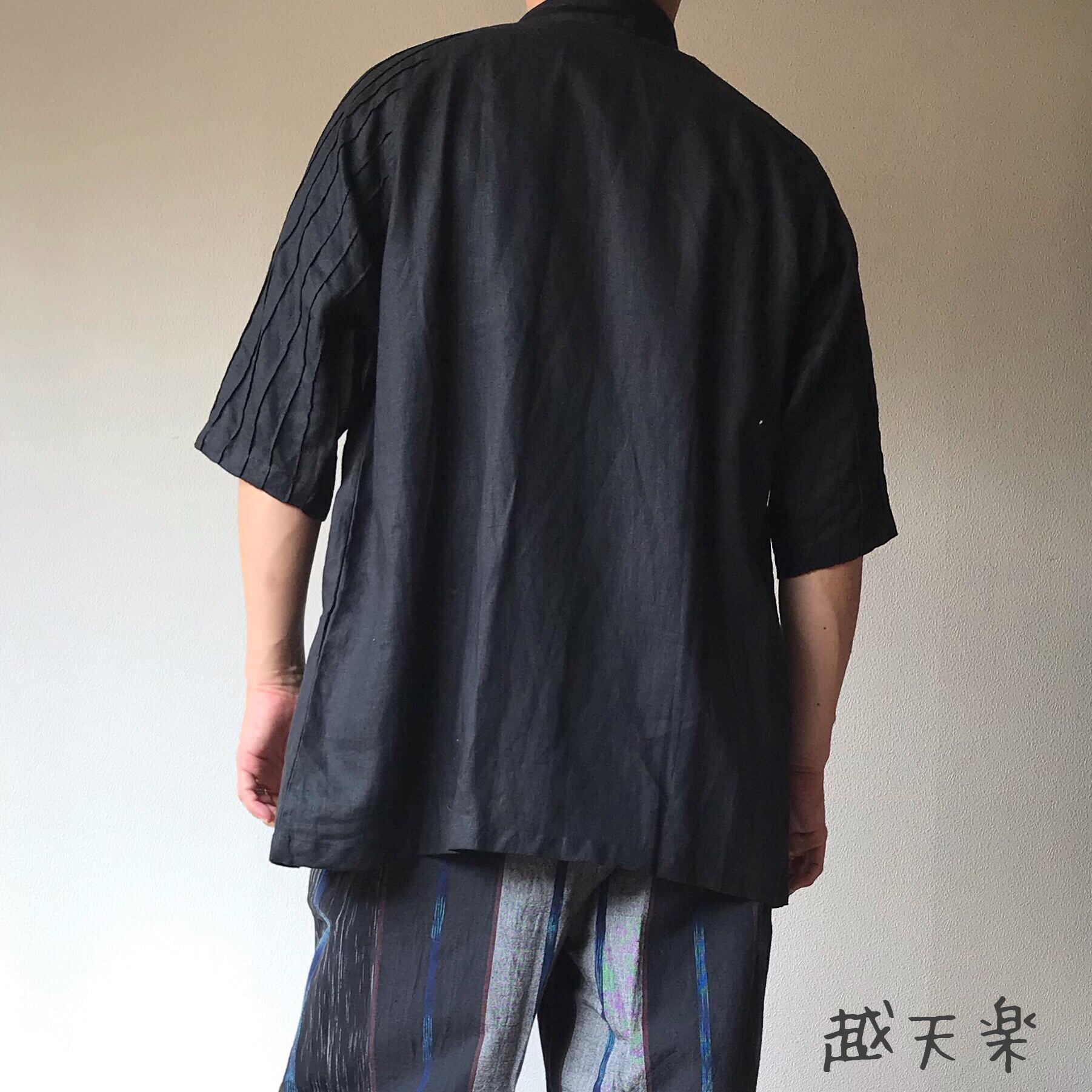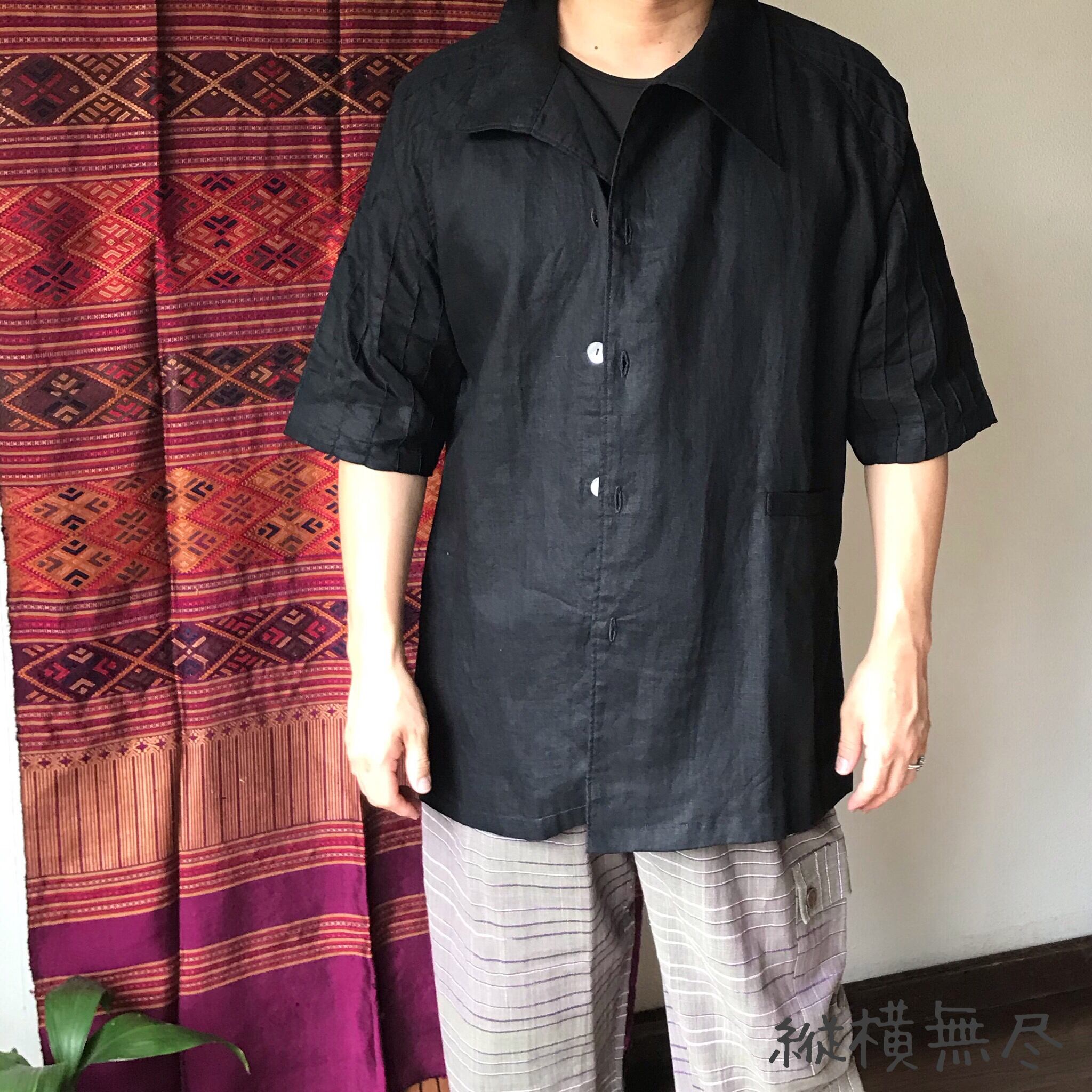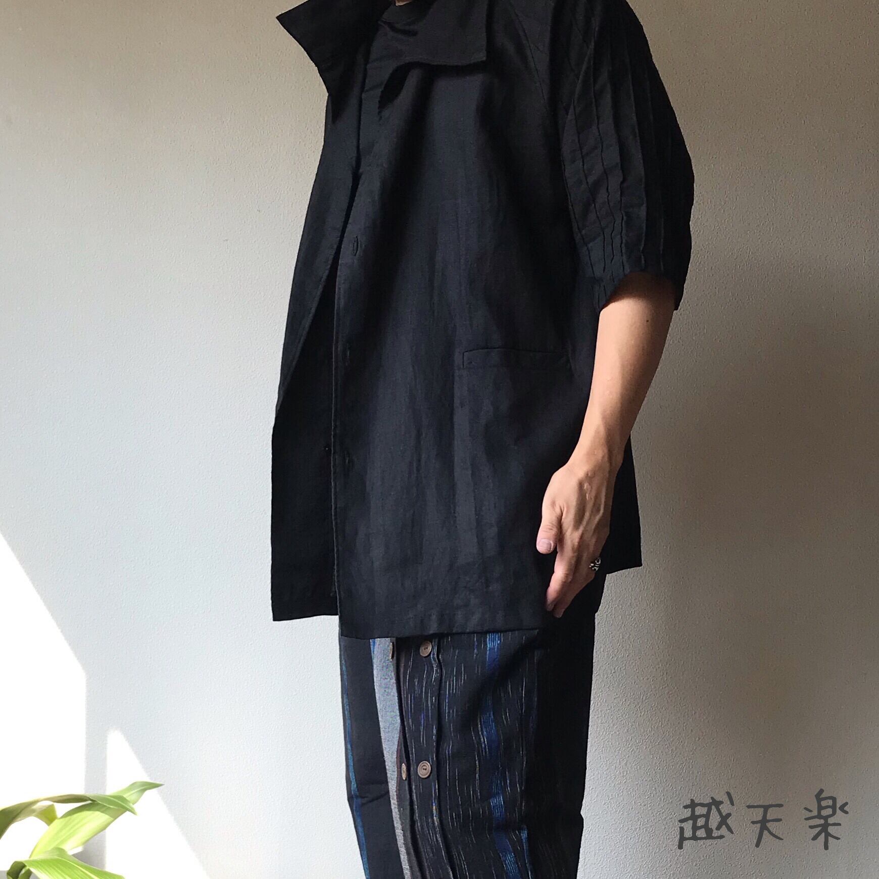 『アシンメトリー襟とピンタックの袖がシャープな印象のリネンのメンズ半袖ブラウス』