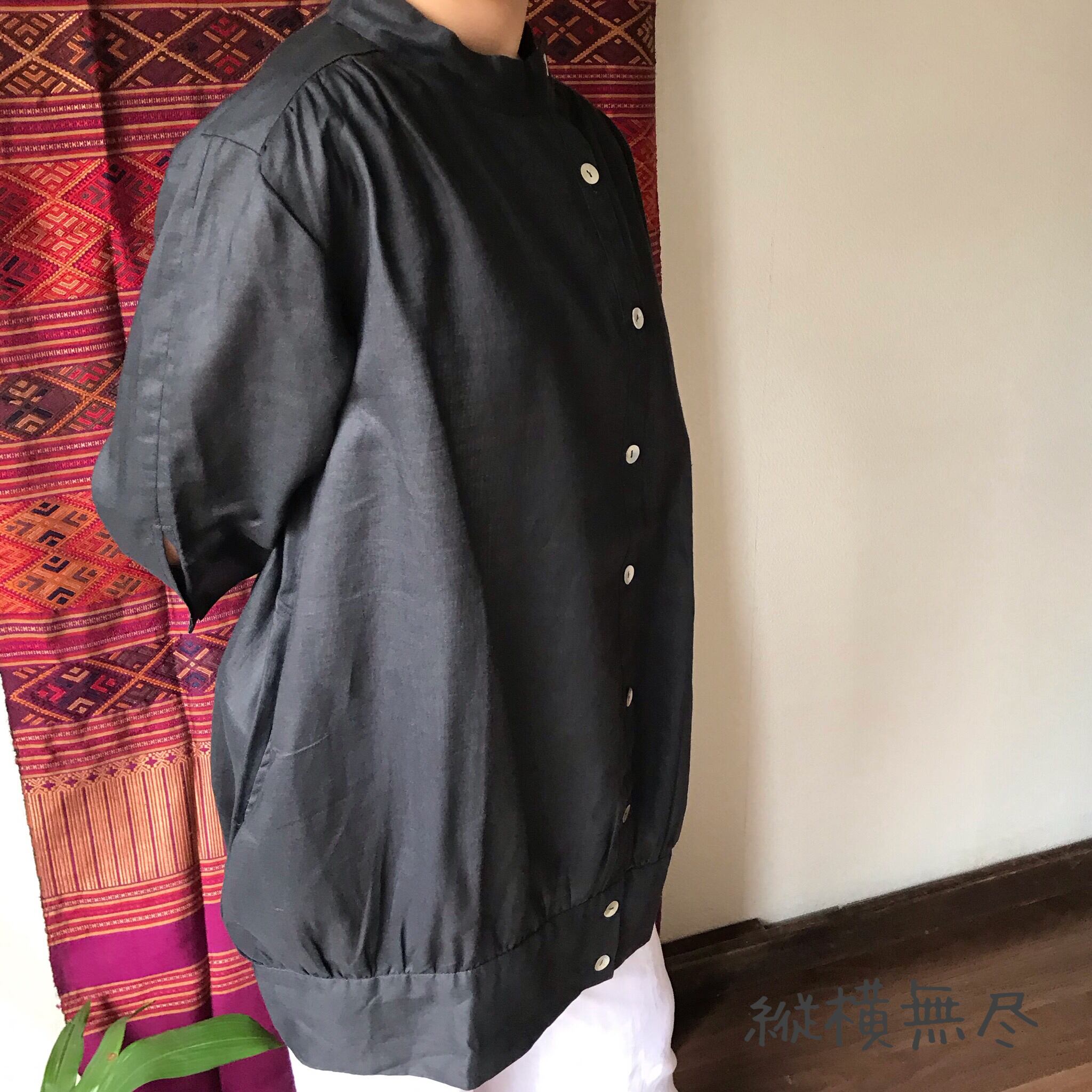 両サイドにポケットもついており、繊細な貝ボタンでの前開きなので、脱ぎ着しやすいです。