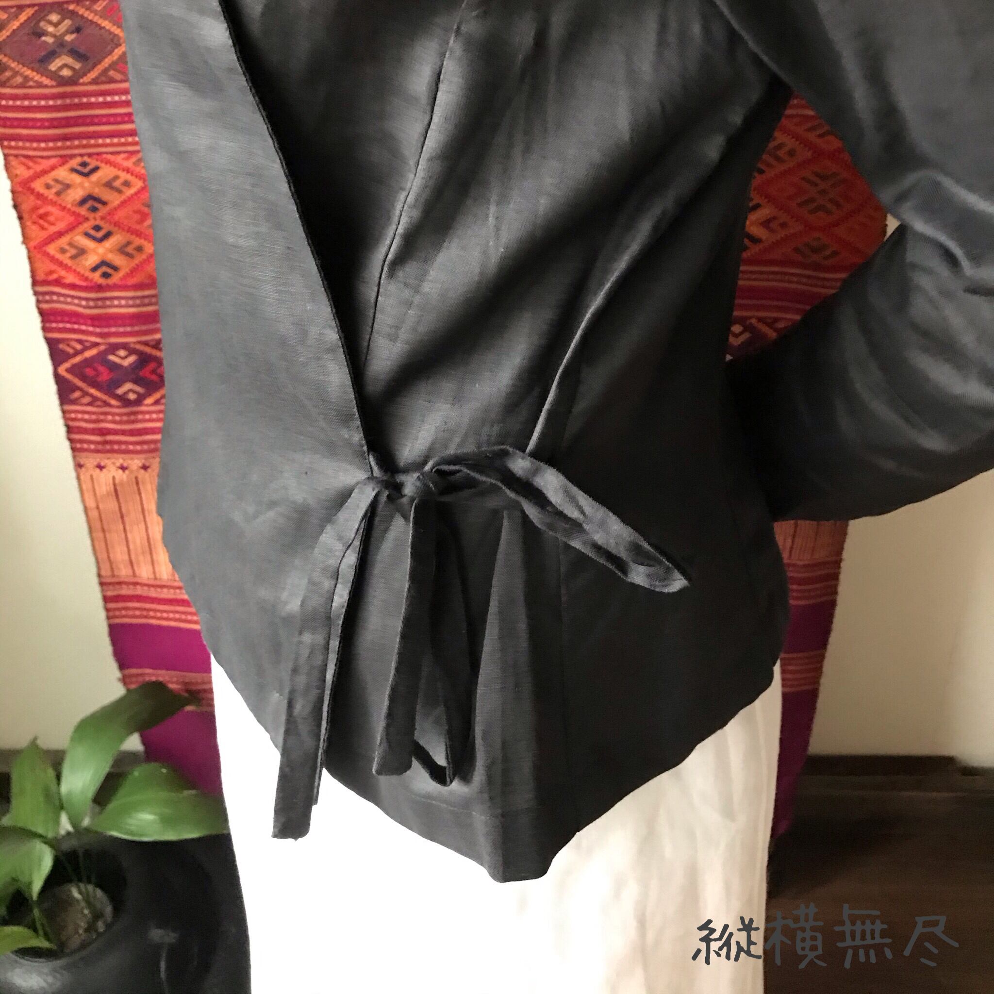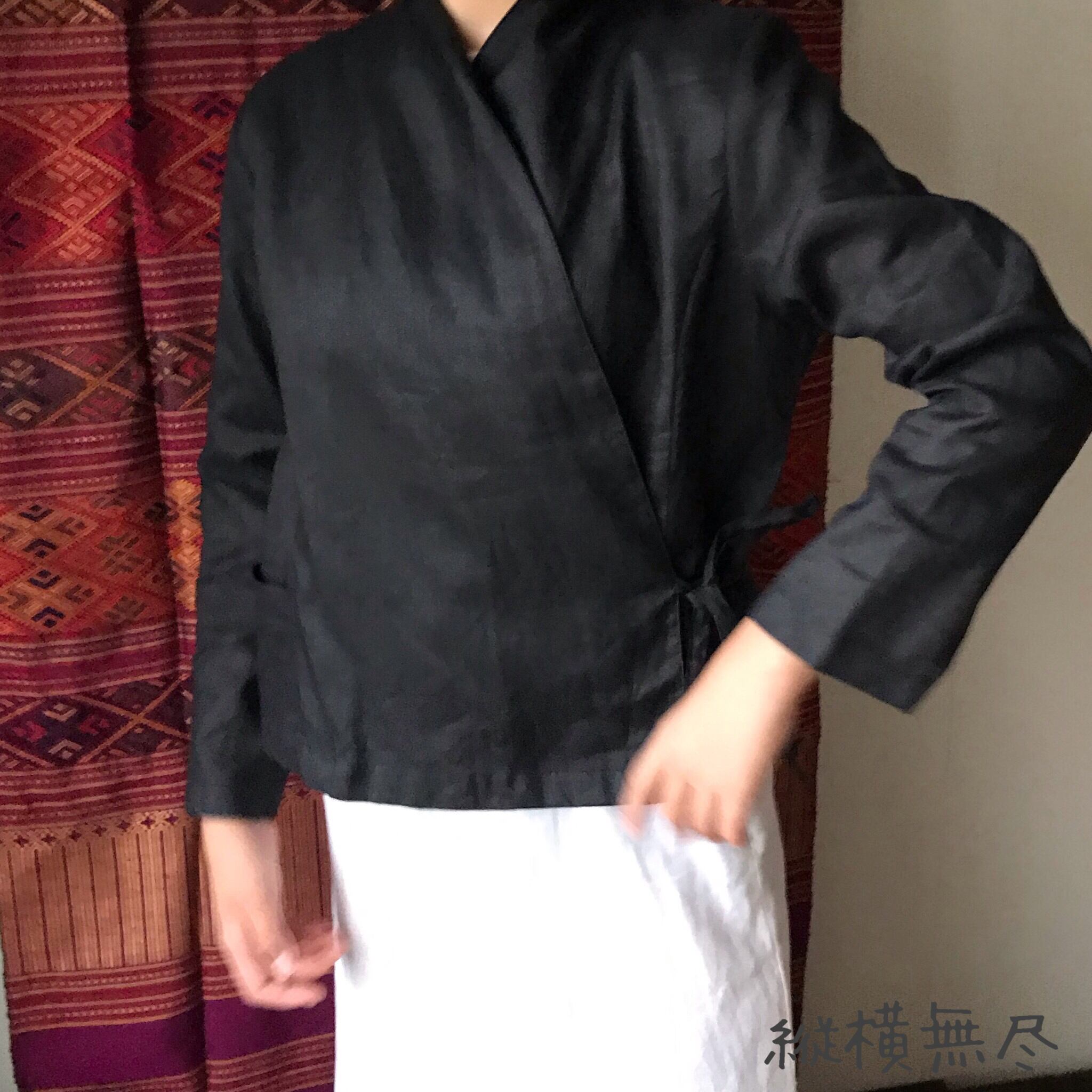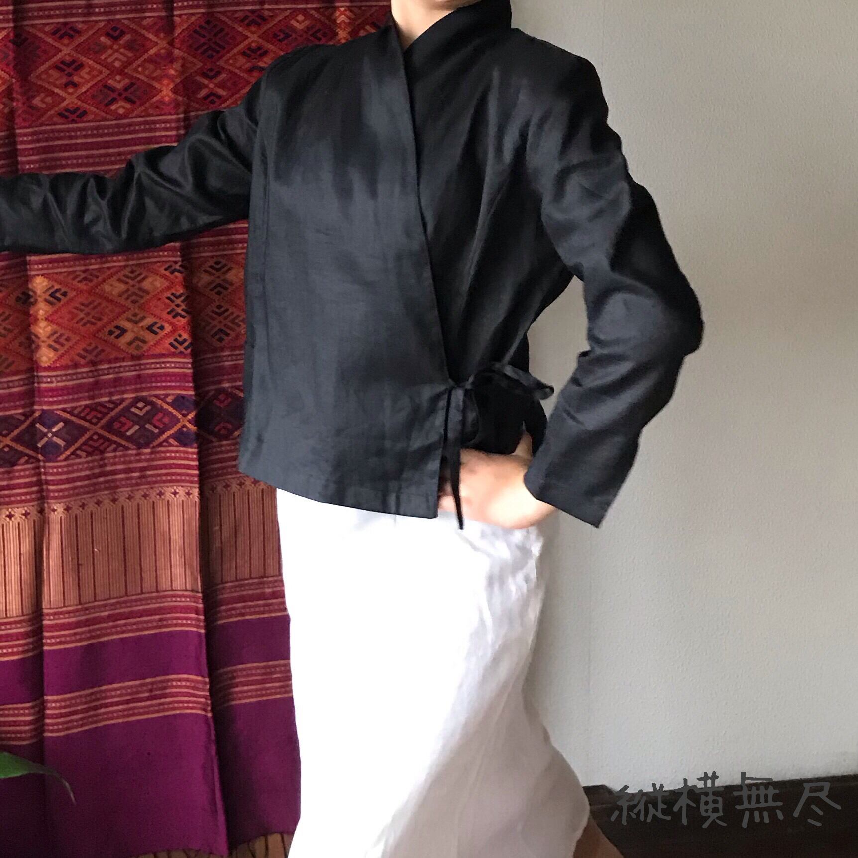 『紐留め着物風がエレガントなリネンの前開き長袖ブラウス』