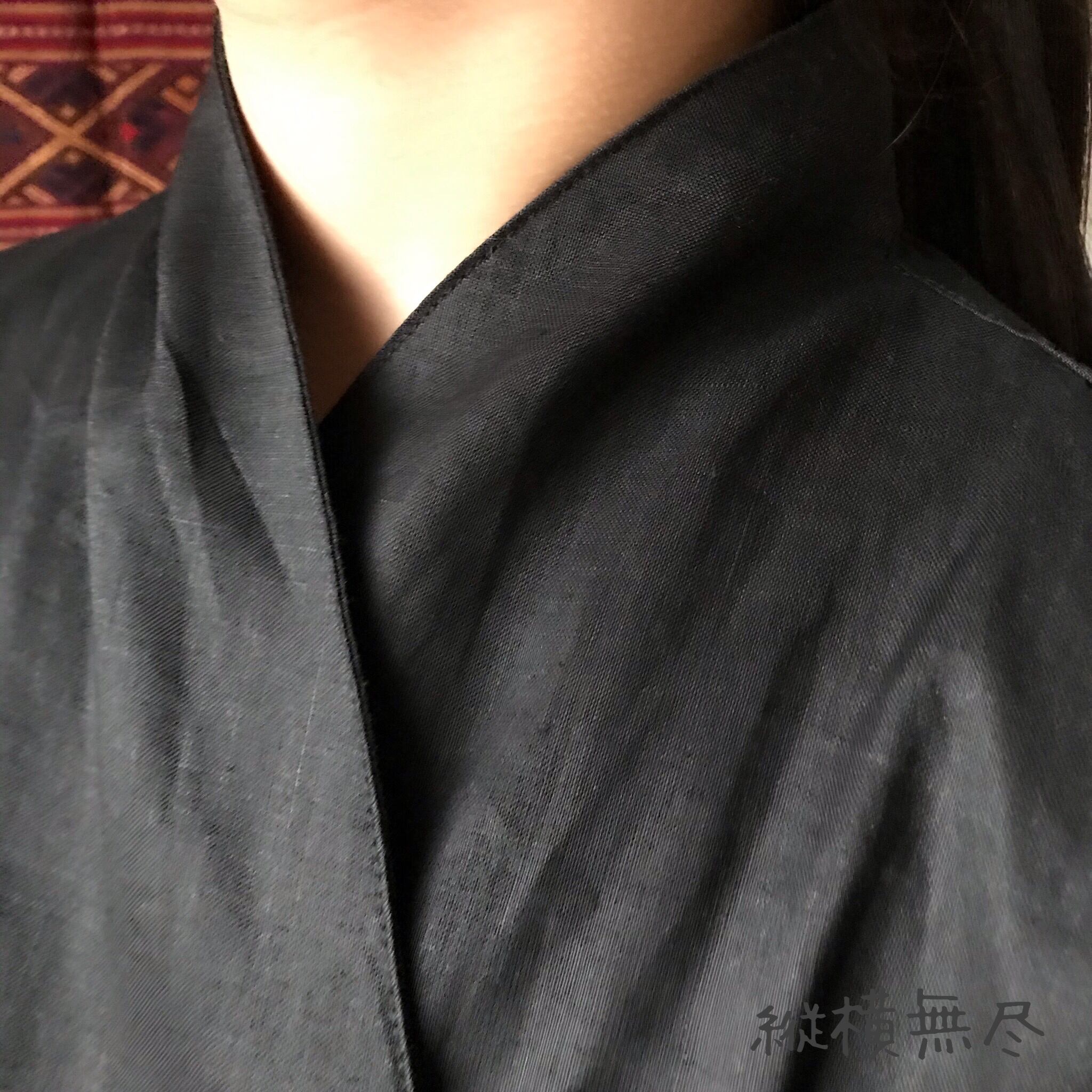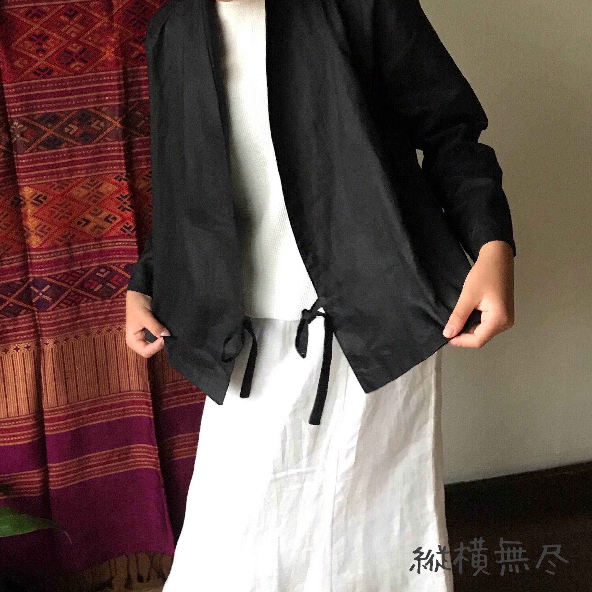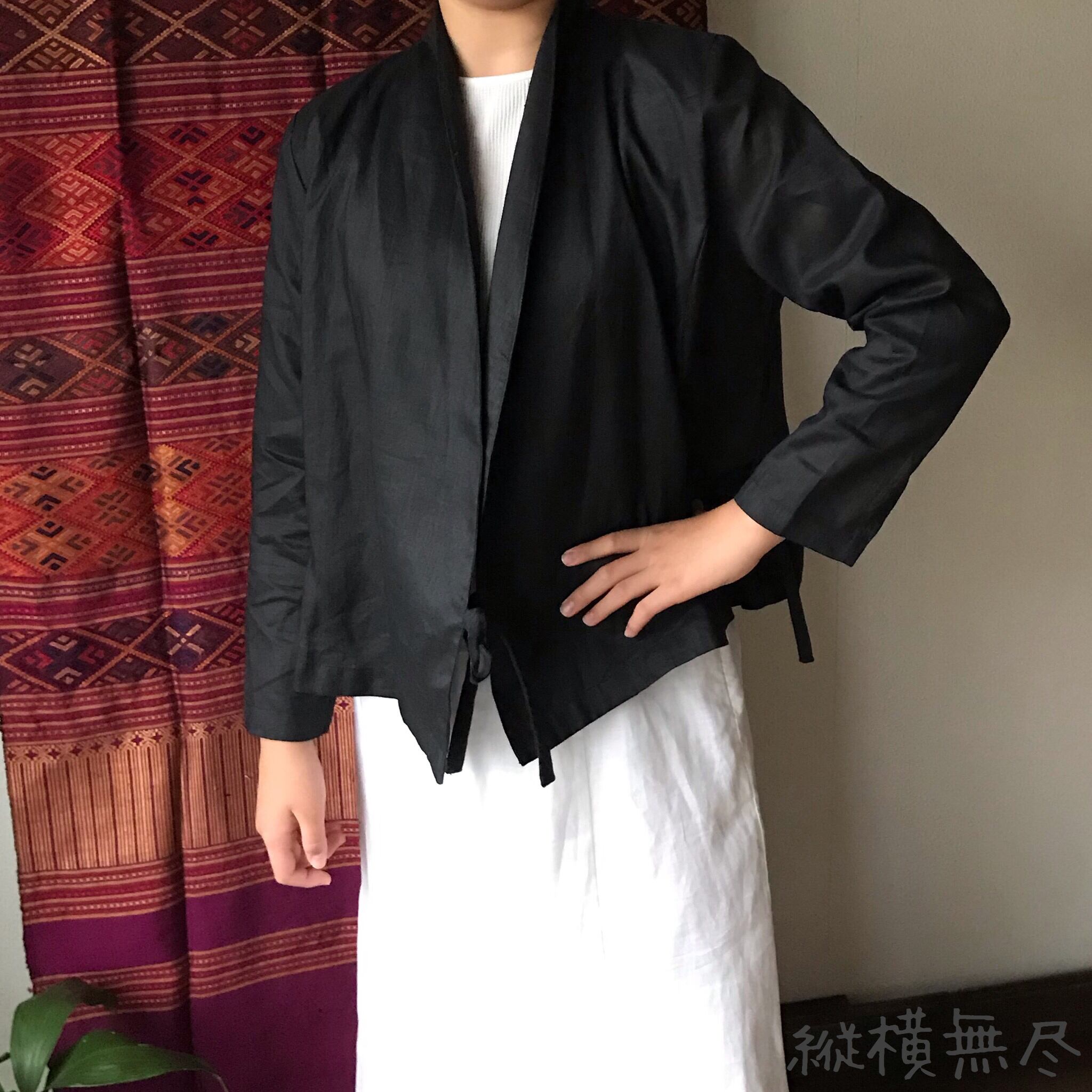 『紐留め着物風がエレガントなリネンの前開き長袖ブラウス』