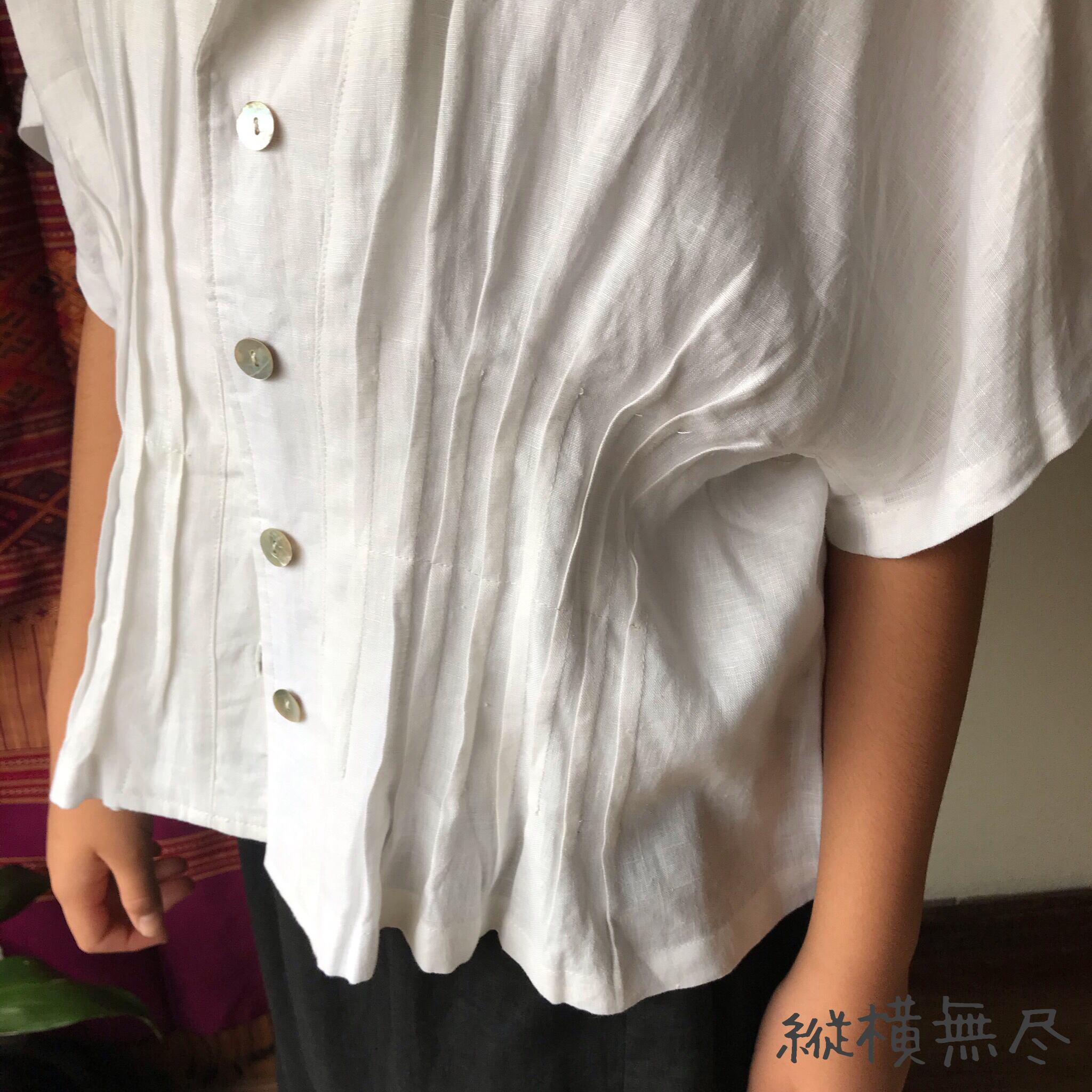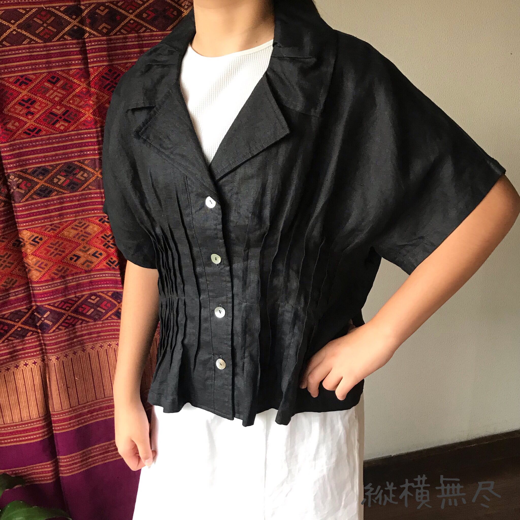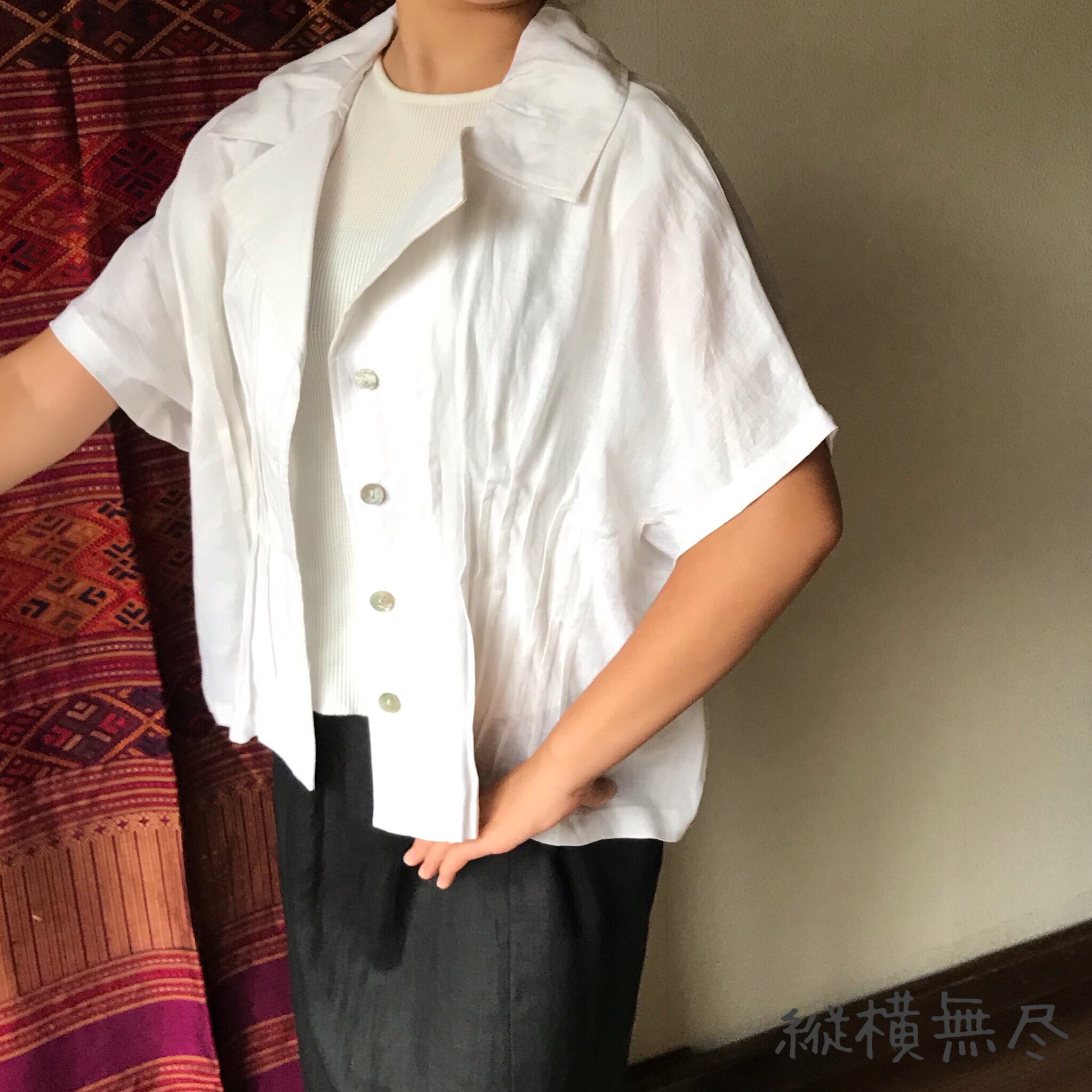 『前後のピンタックと大き目の襟が大人可愛いリネンの前開きブラウス』