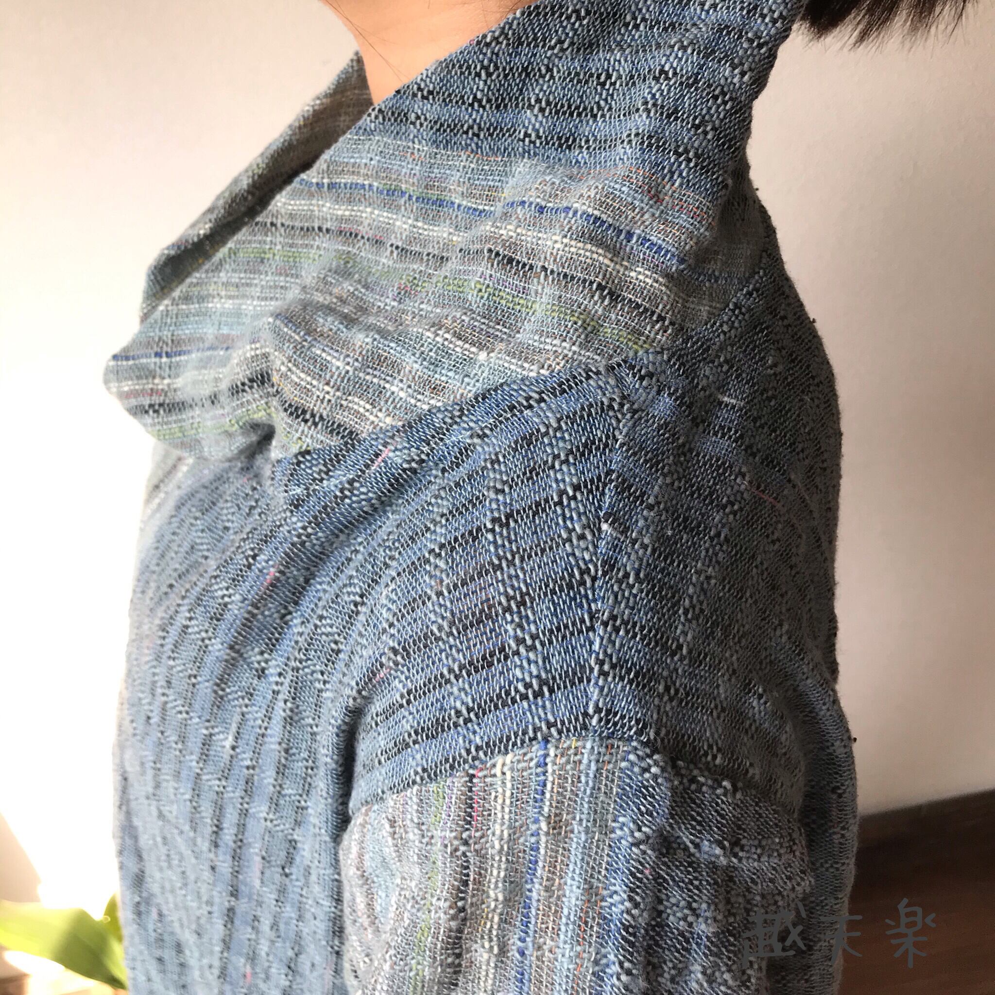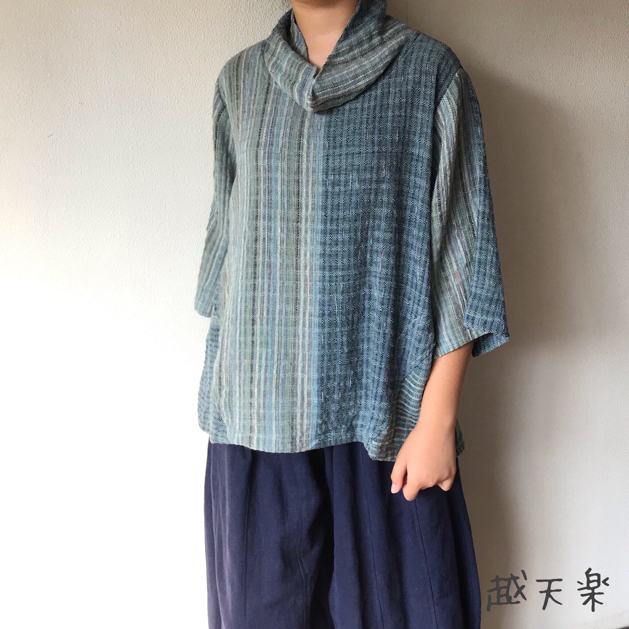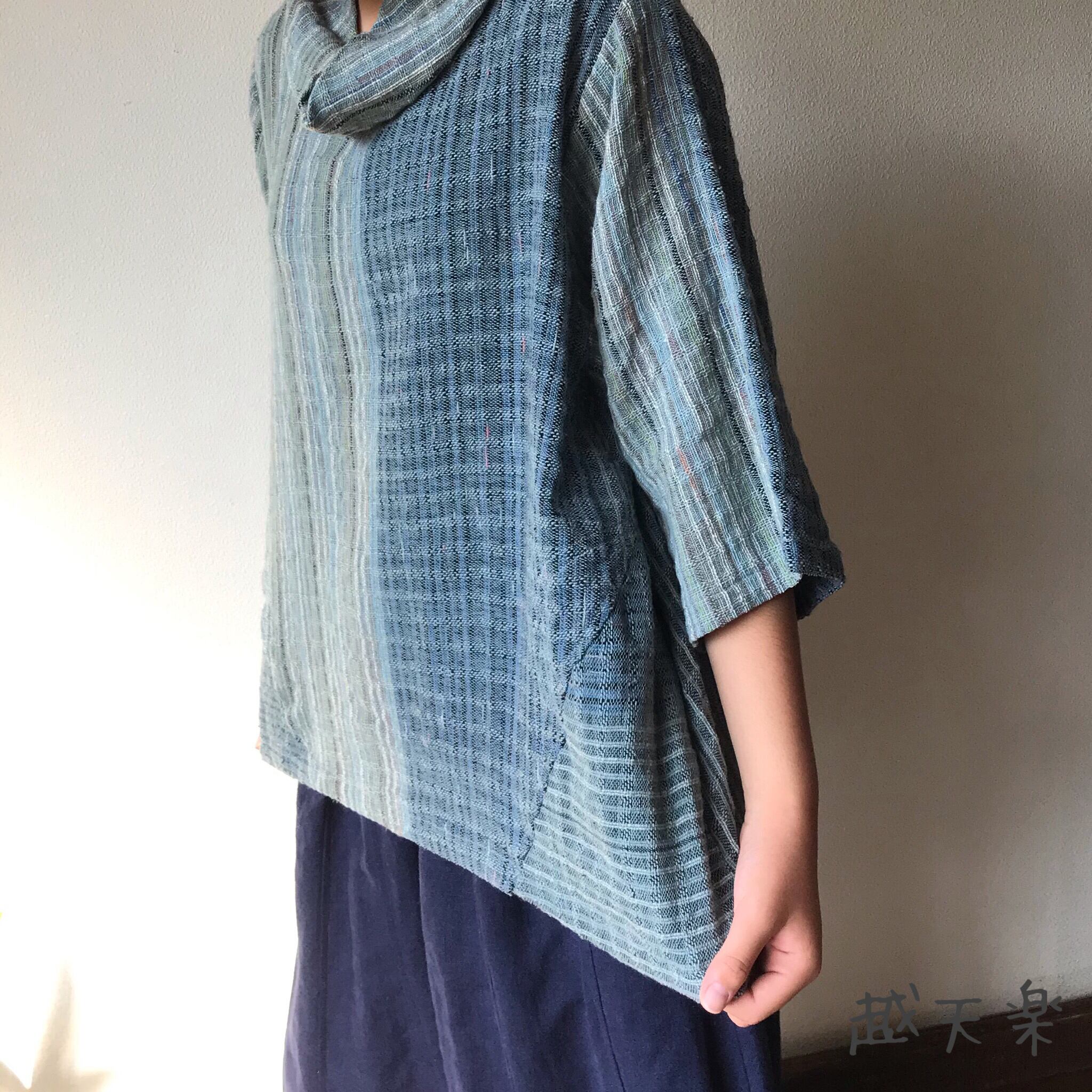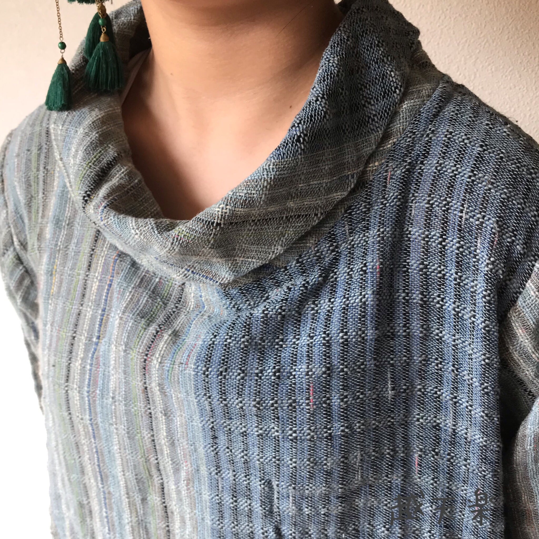 袖回りゆったり手織り綿ブラウス カッティングが綺麗でスッキリ見える7分袖ロールネック 青グレイ絣