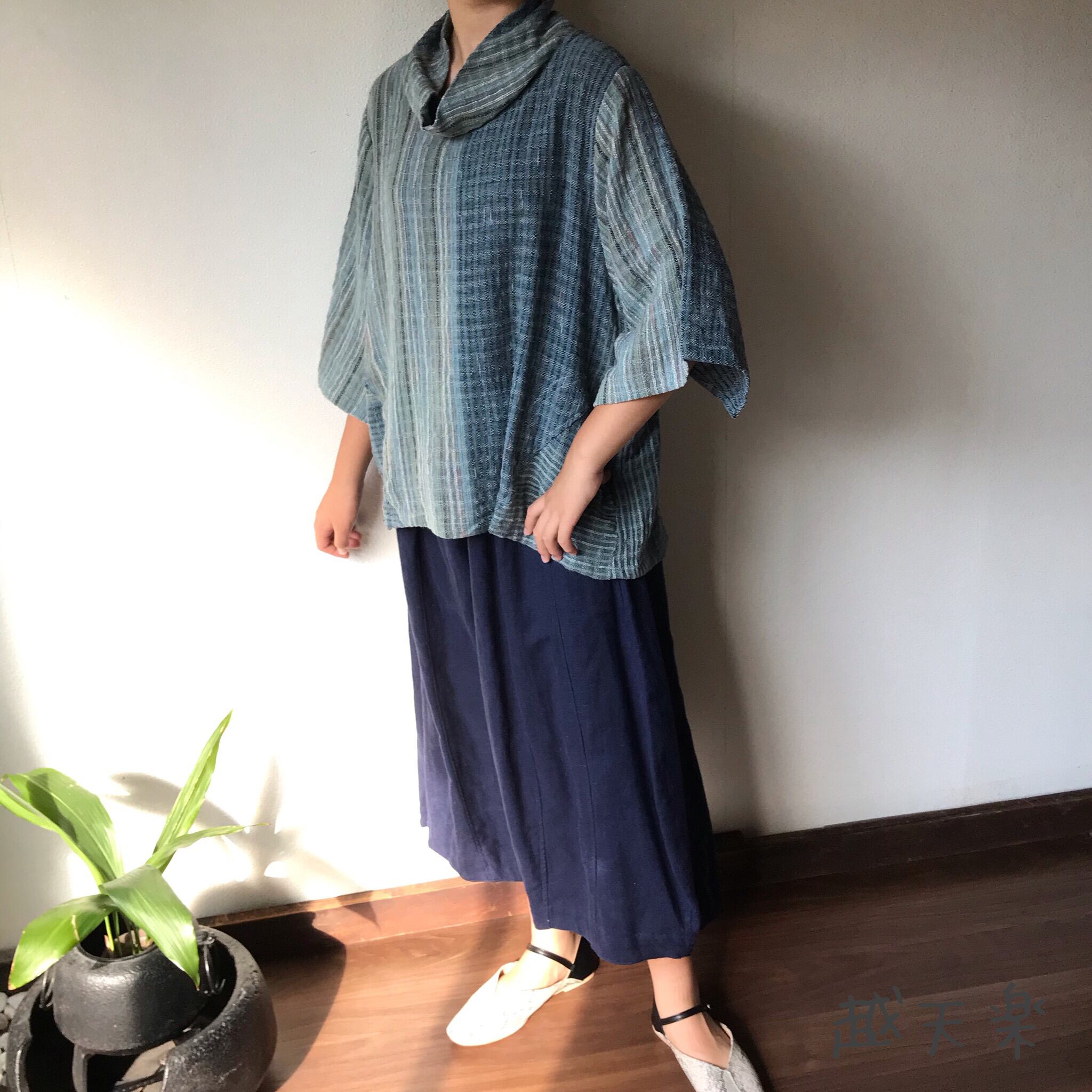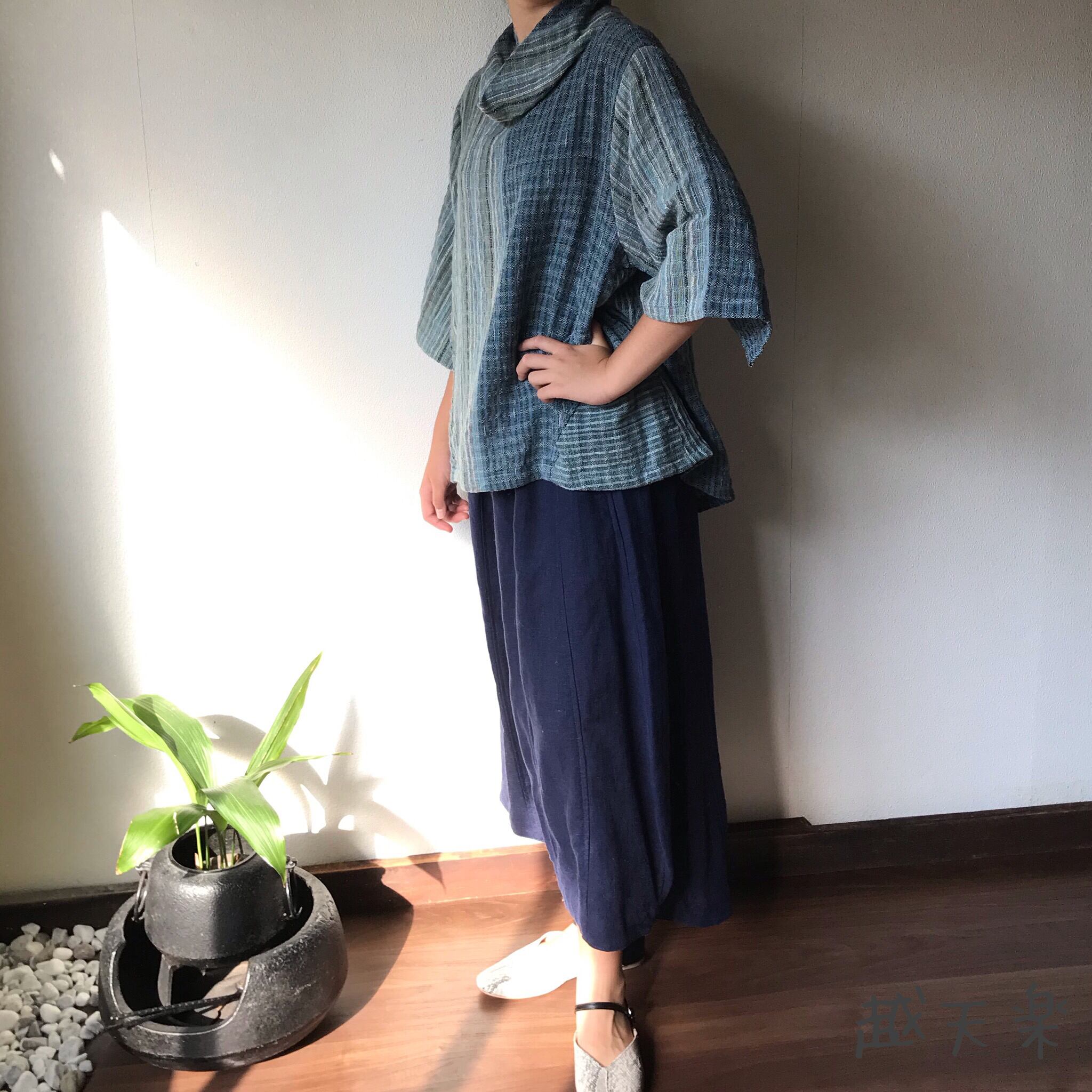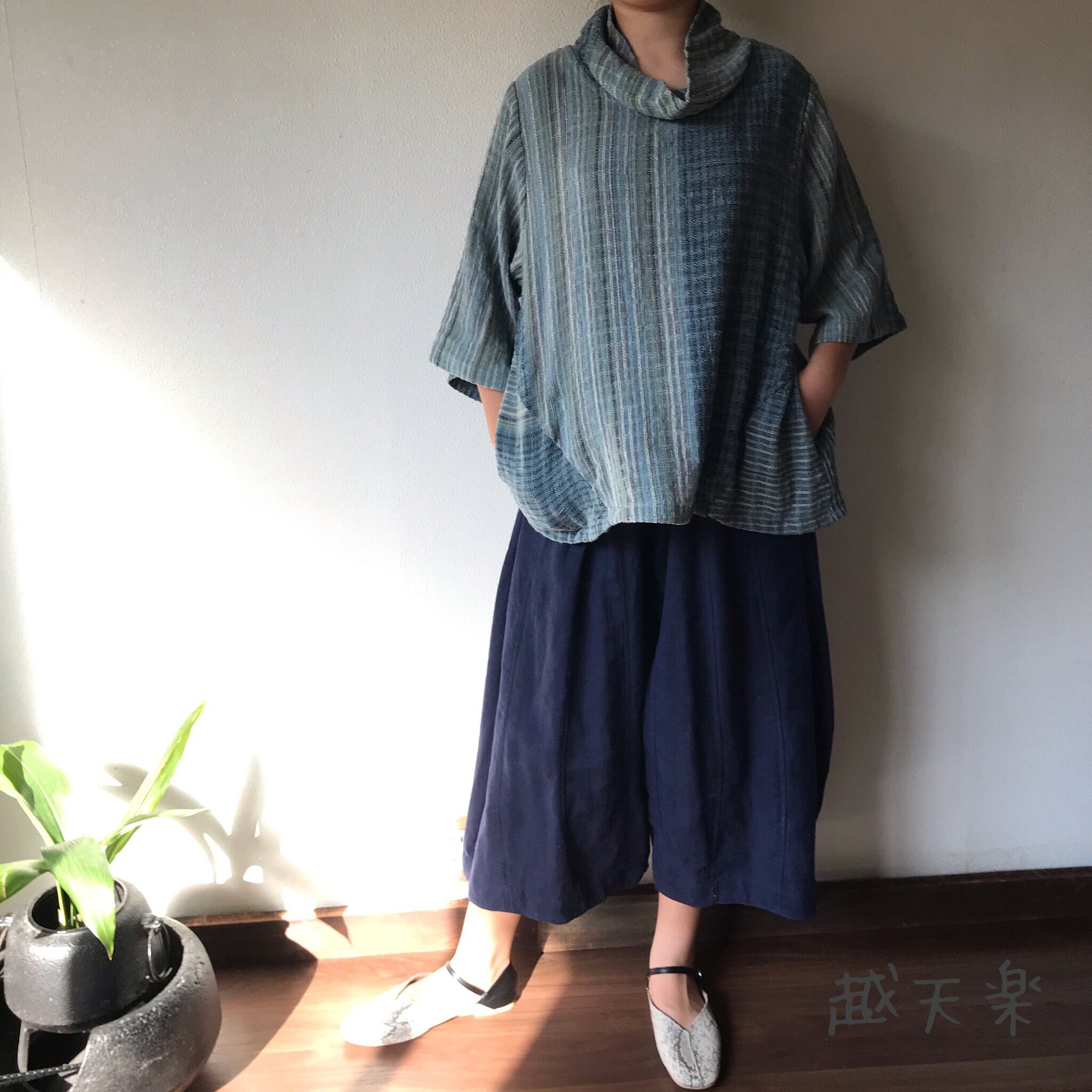 袖回りゆったり手織り綿ブラウス カッティングが綺麗でスッキリ見える7分袖ロールネック 青グレイ絣