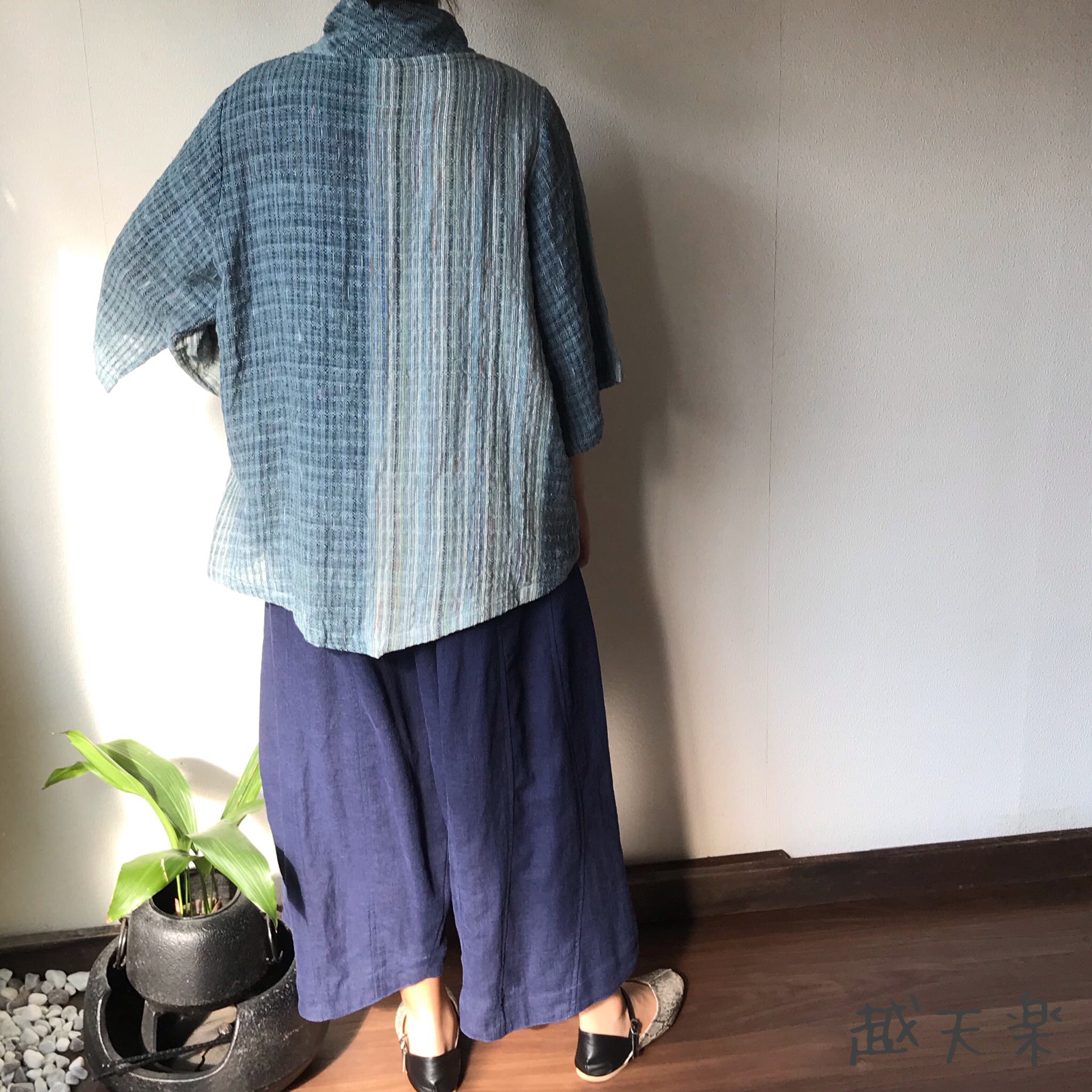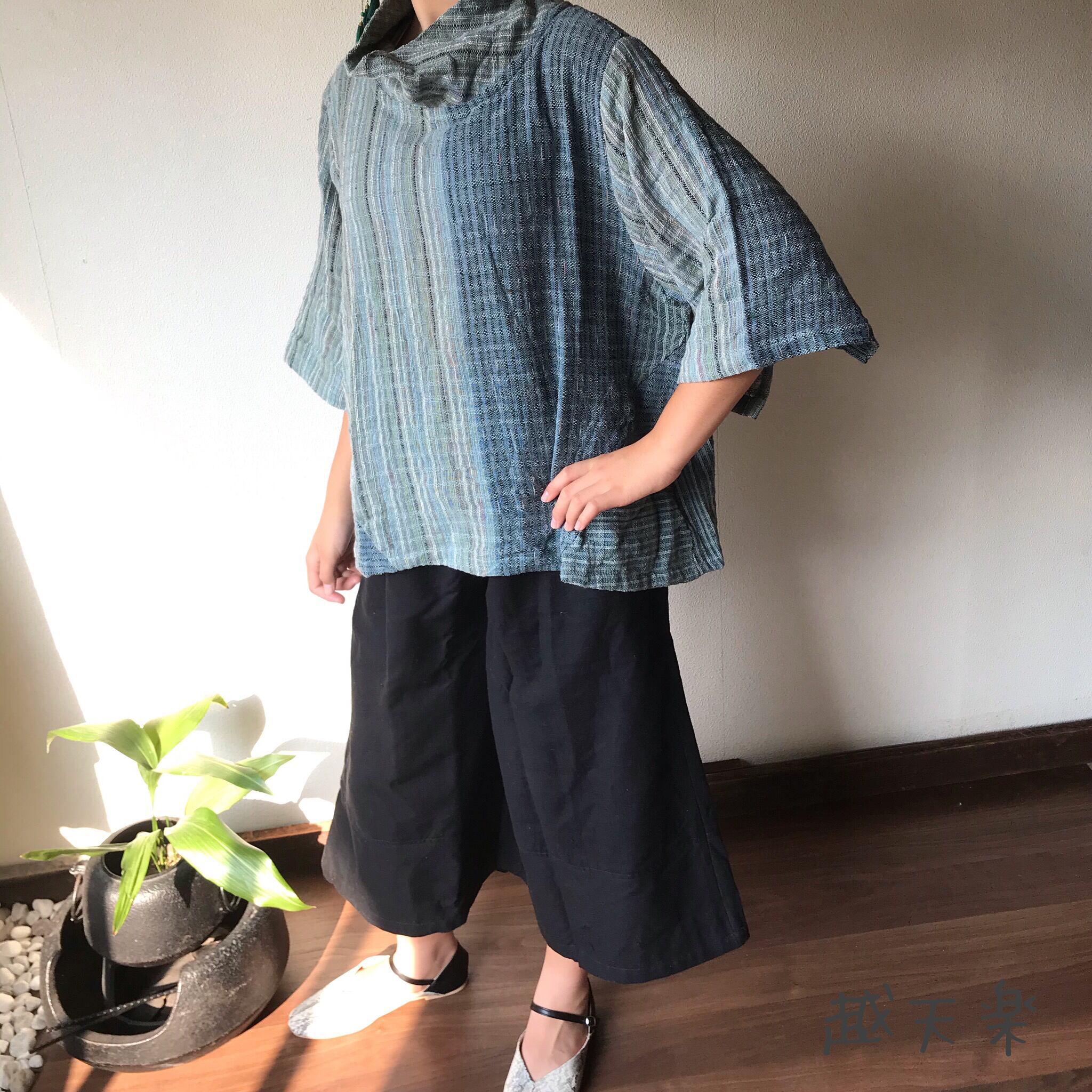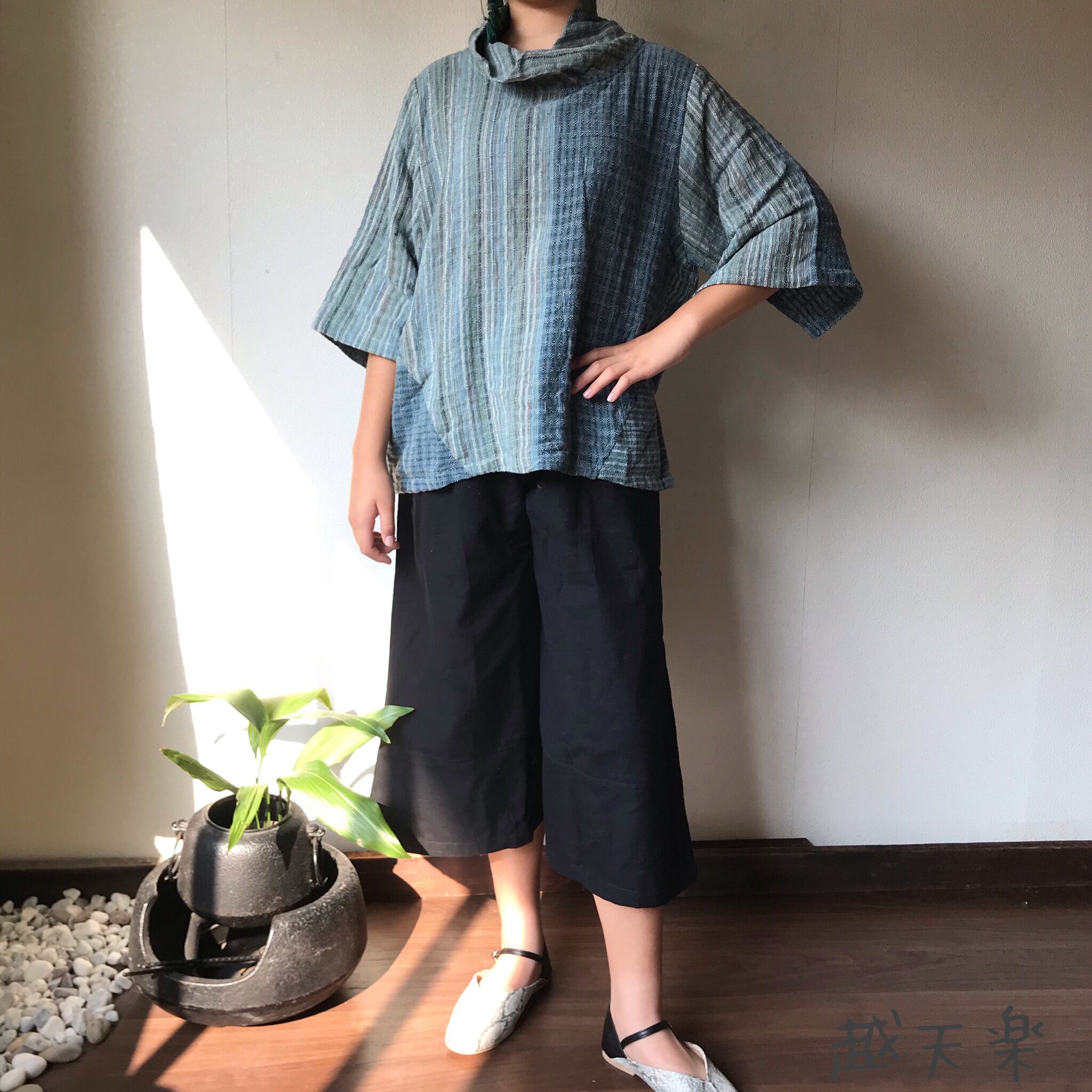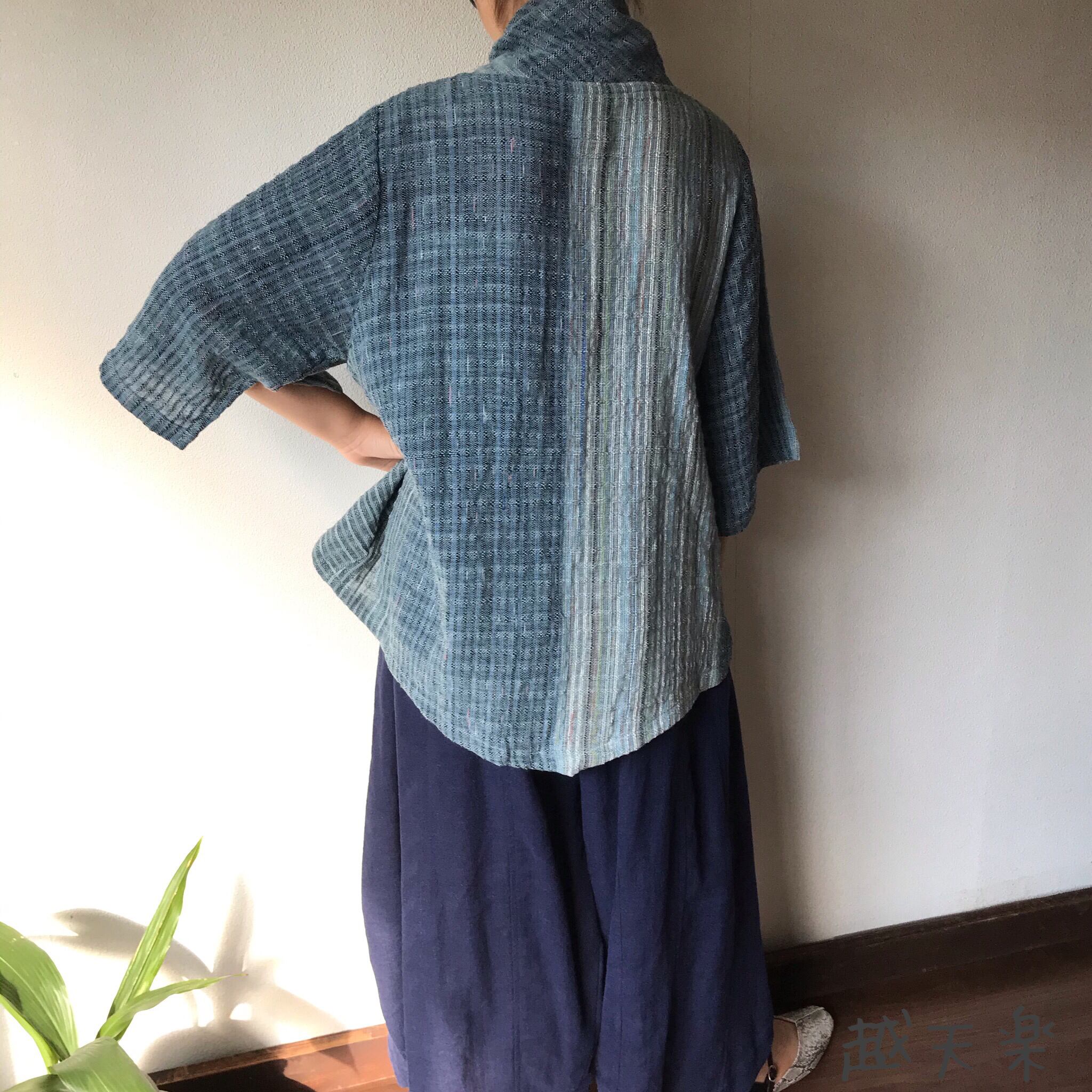袖回りゆったり手織り綿ブラウス カッティングが綺麗でスッキリ見える7分袖ロールネック 青グレイ絣