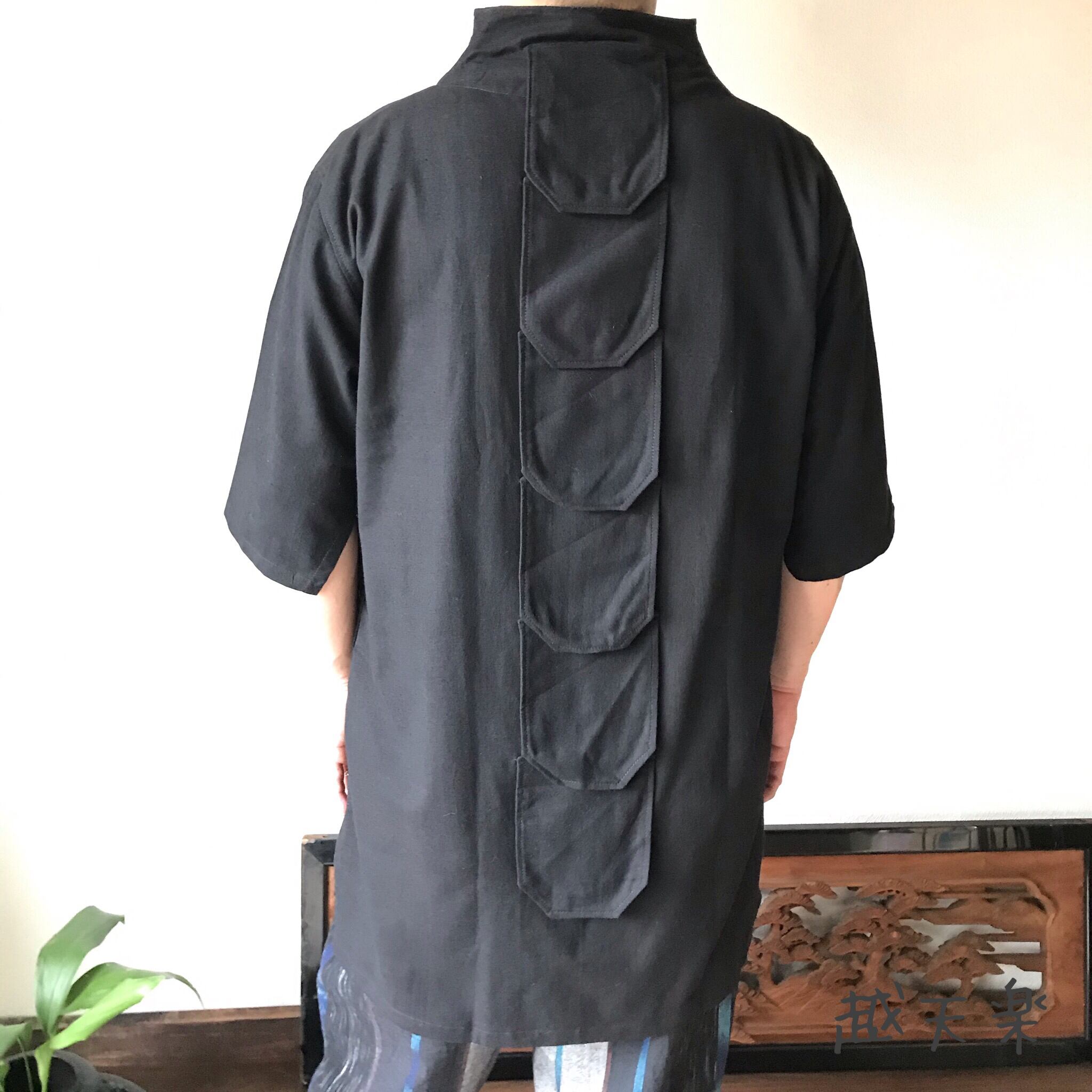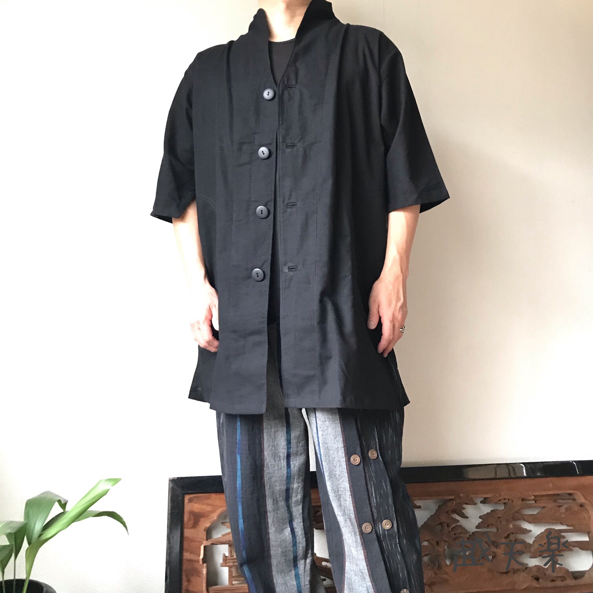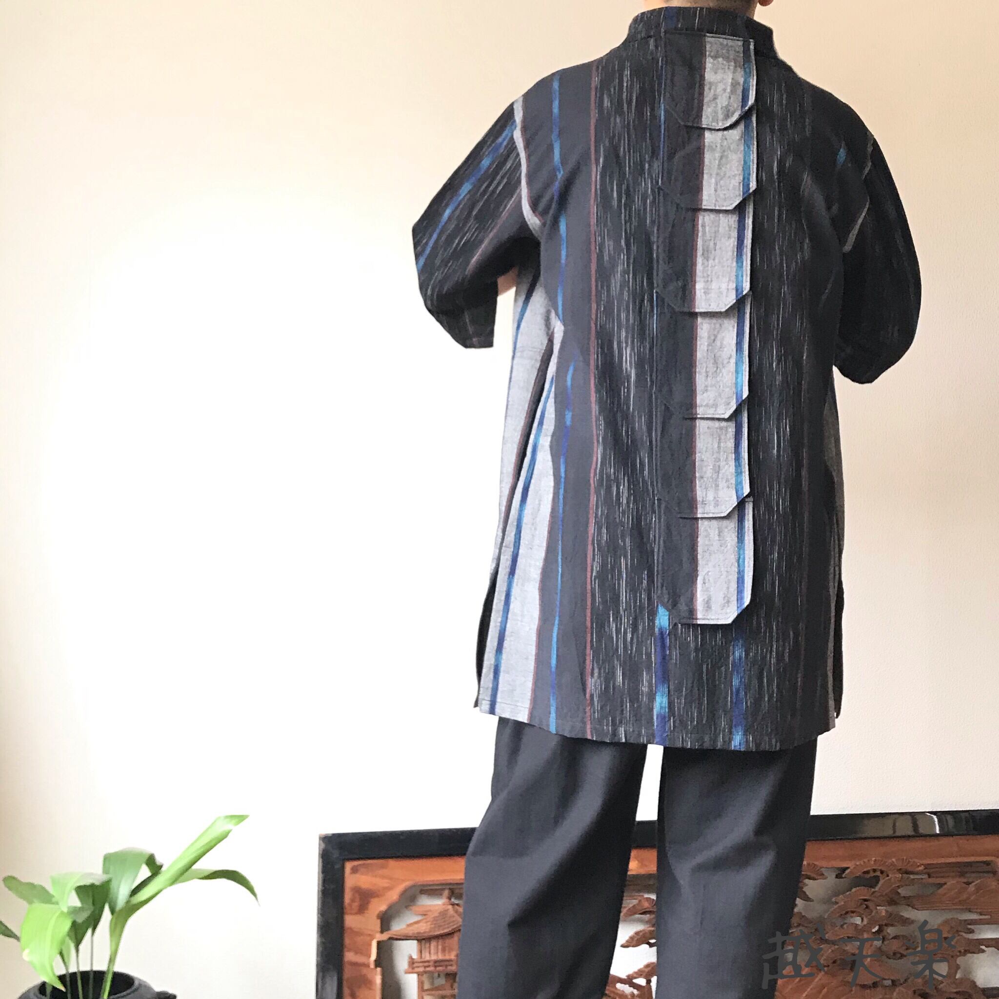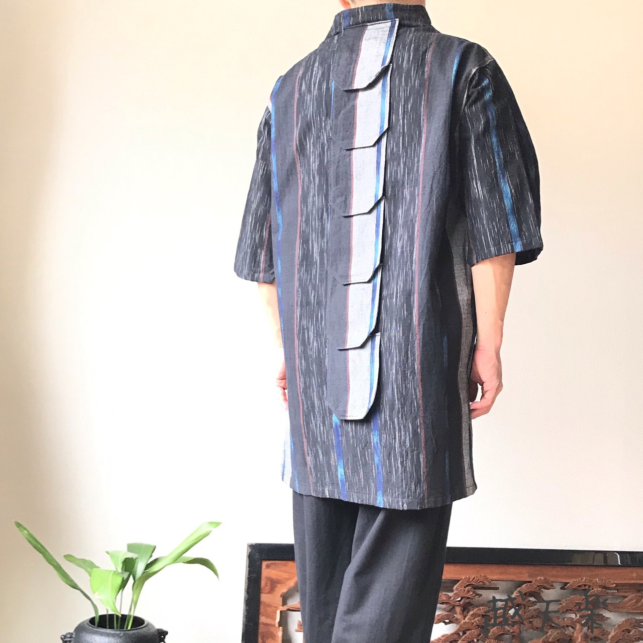 『スラッシュカットのハイカラー、背中の鱗型パッチワークで遊ぶ前開き手織り綿メンズブラウス』