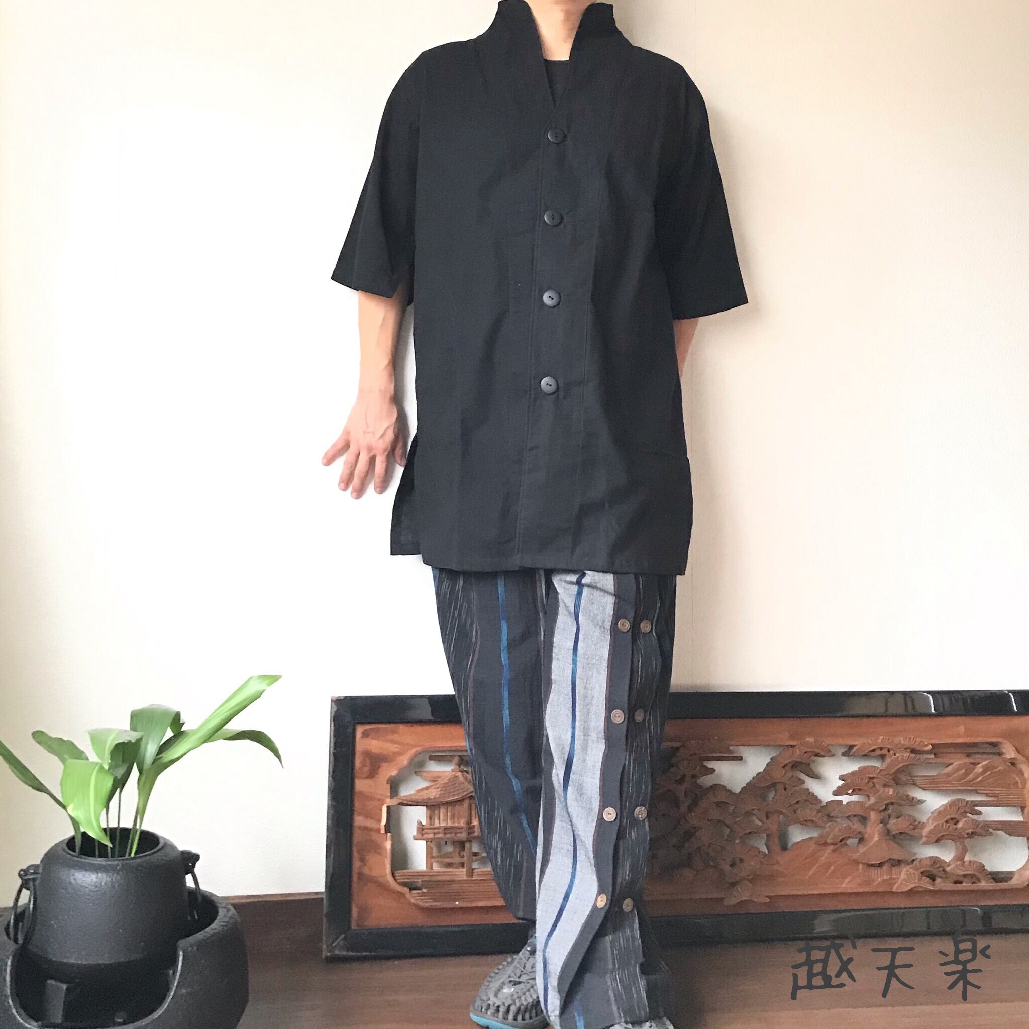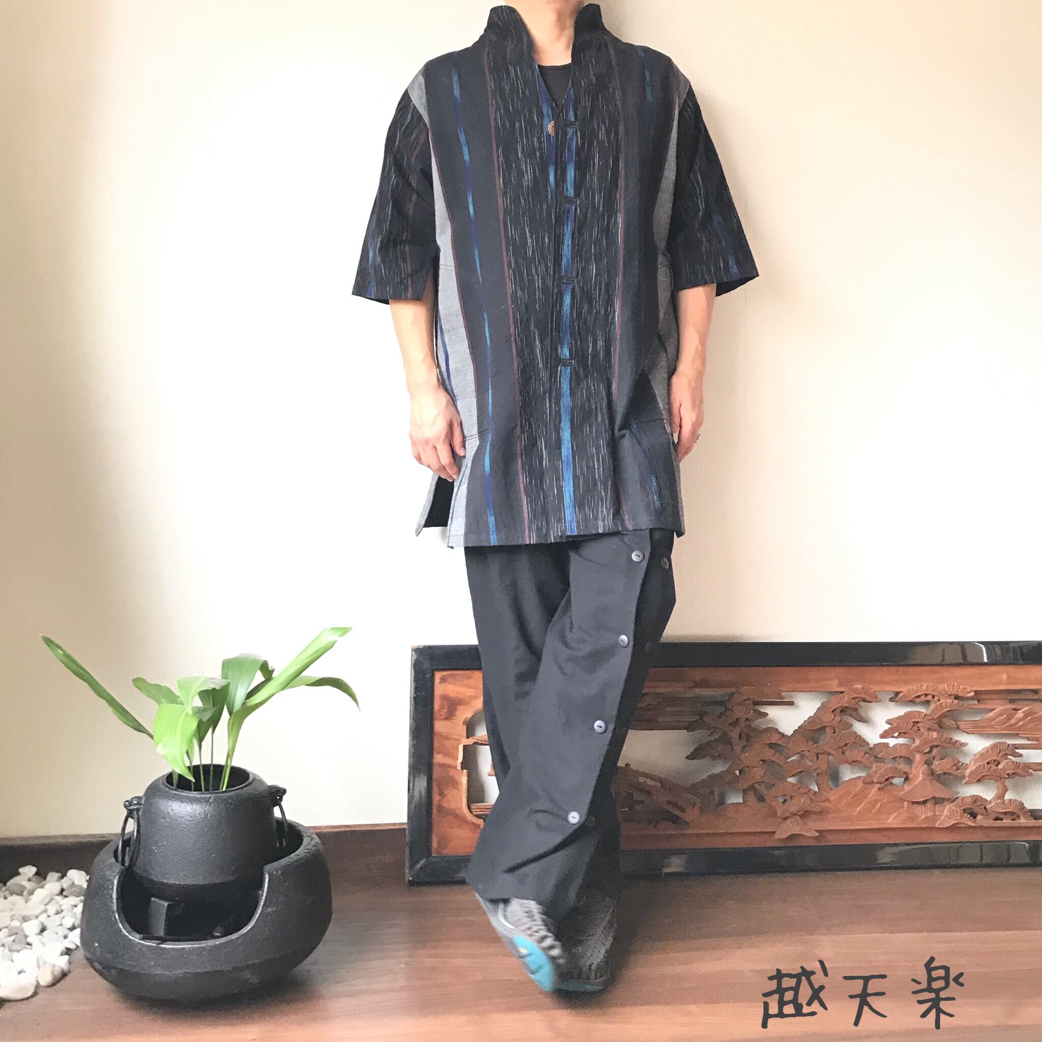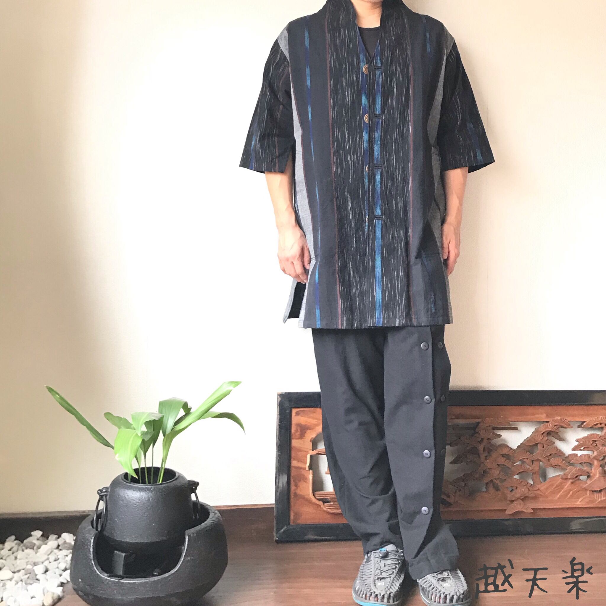 『スラッシュカットのハイカラー、背中の鱗型パッチワークで遊ぶ前開き手織り綿メンズブラウス』