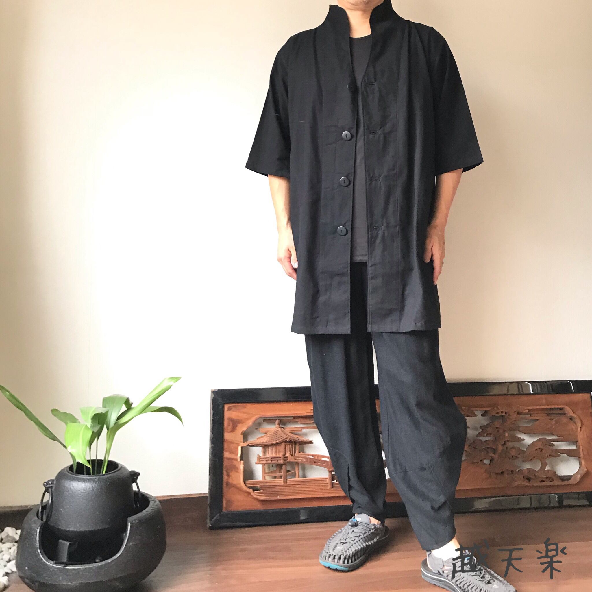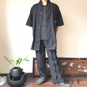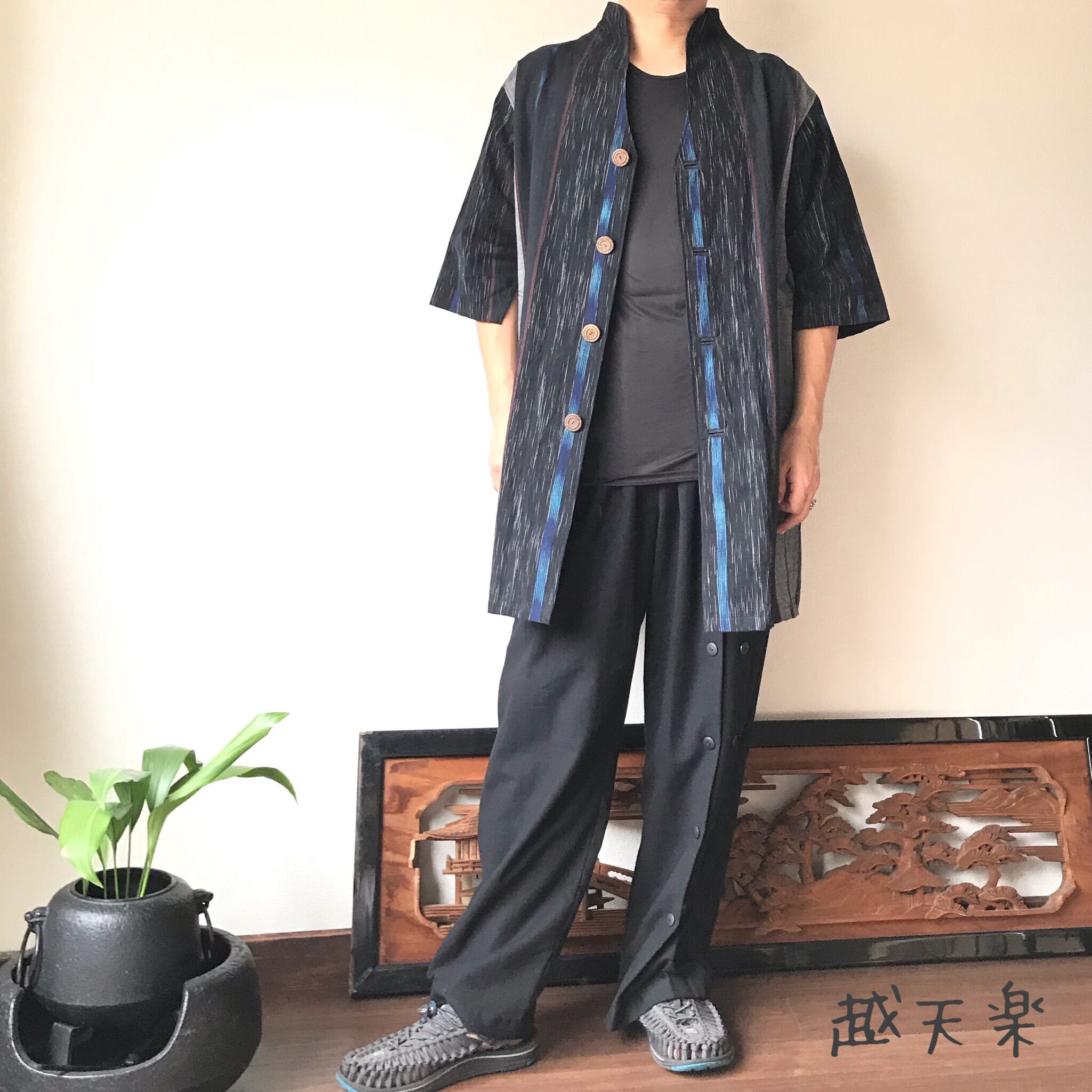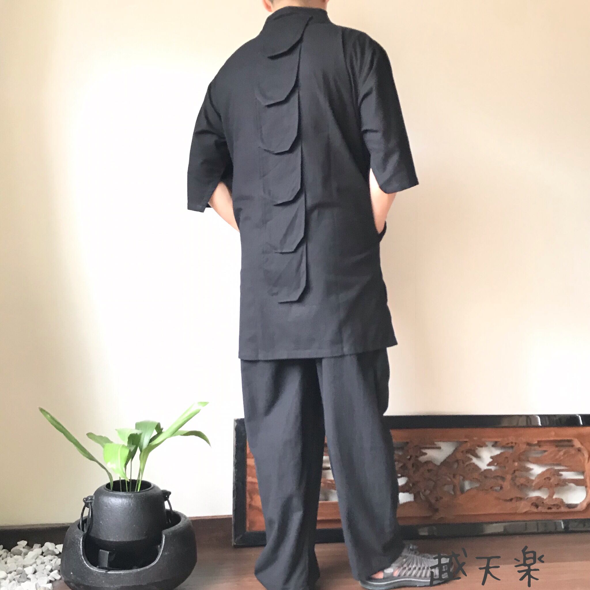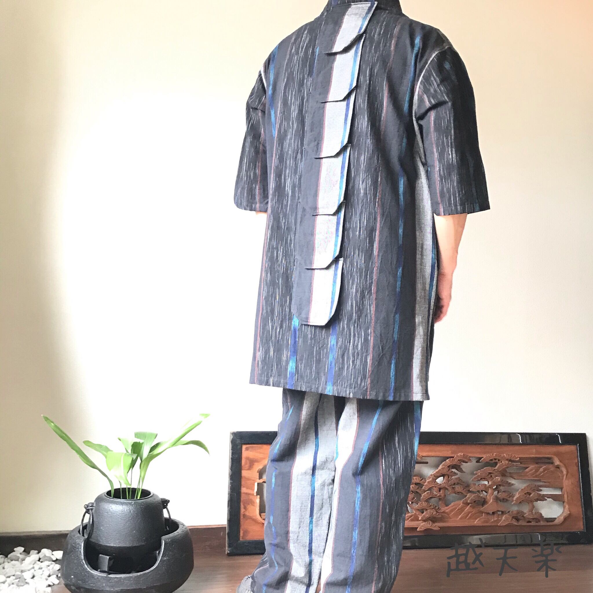 『スラッシュカットのハイカラー、背中の鱗型パッチワークで遊ぶ前開き手織り綿メンズブラウス』