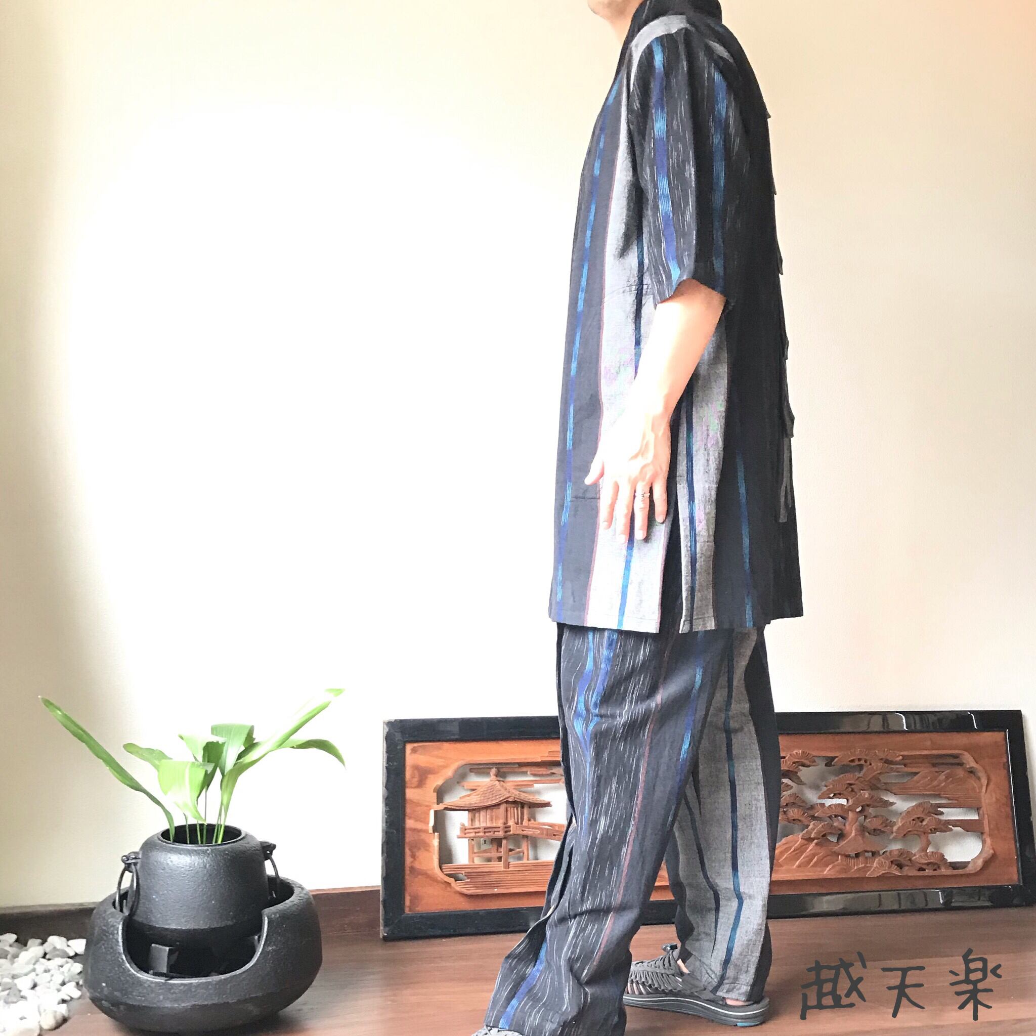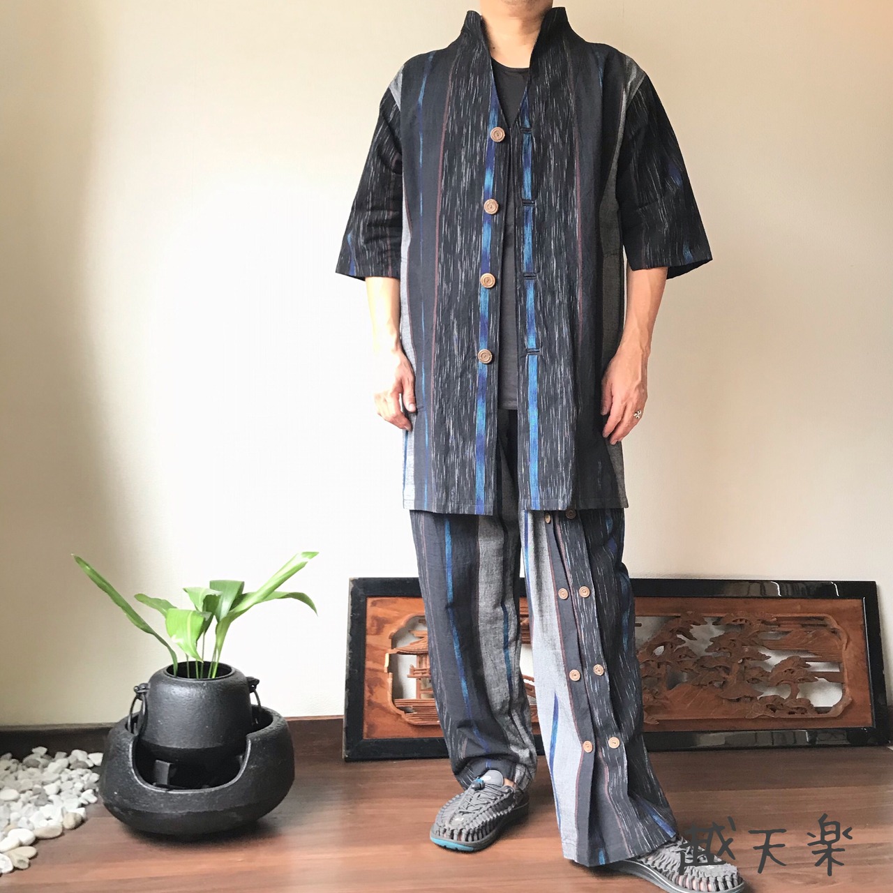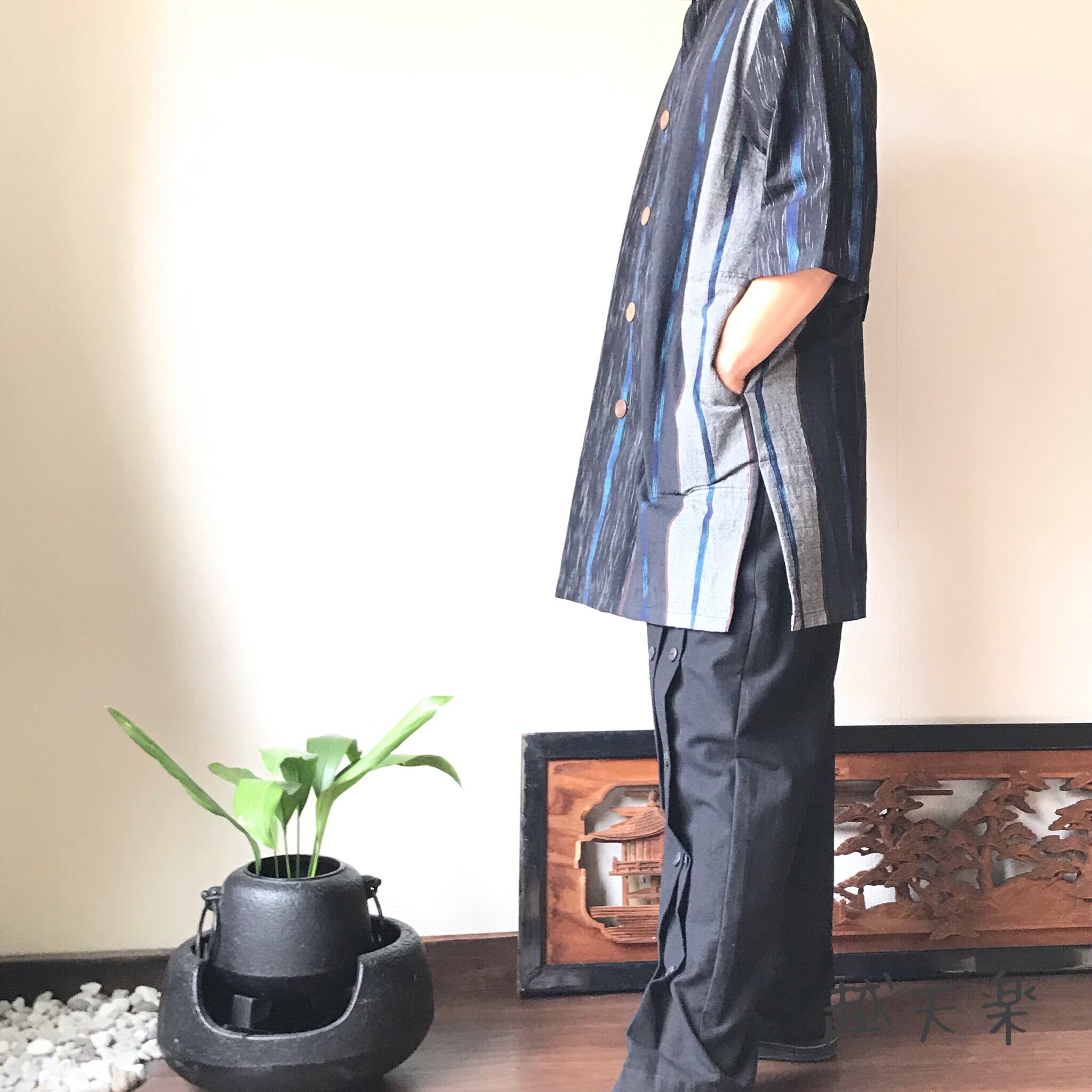 写真共生地セットで履いている手織り綿のダブルボタンメンズパンツはこちら↓