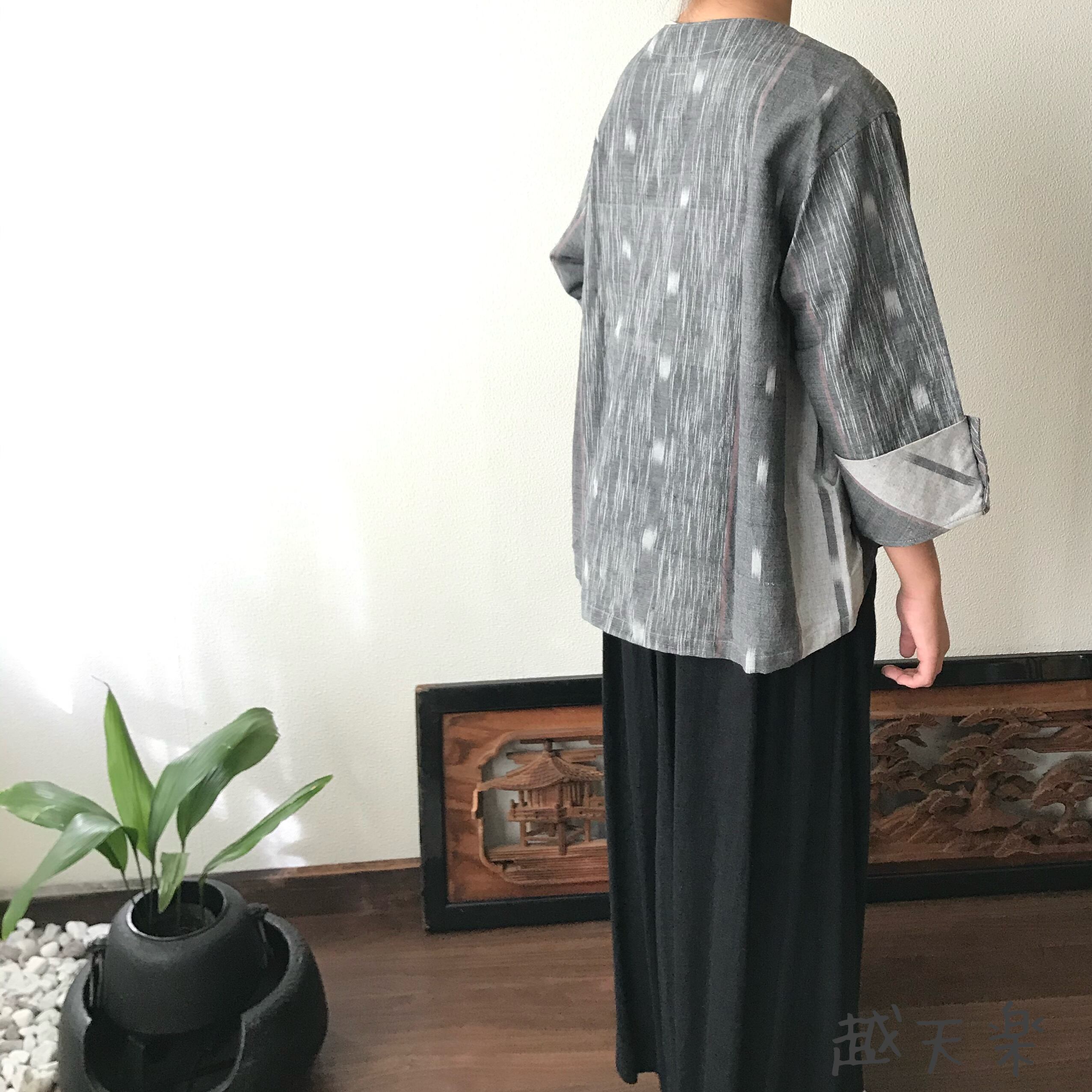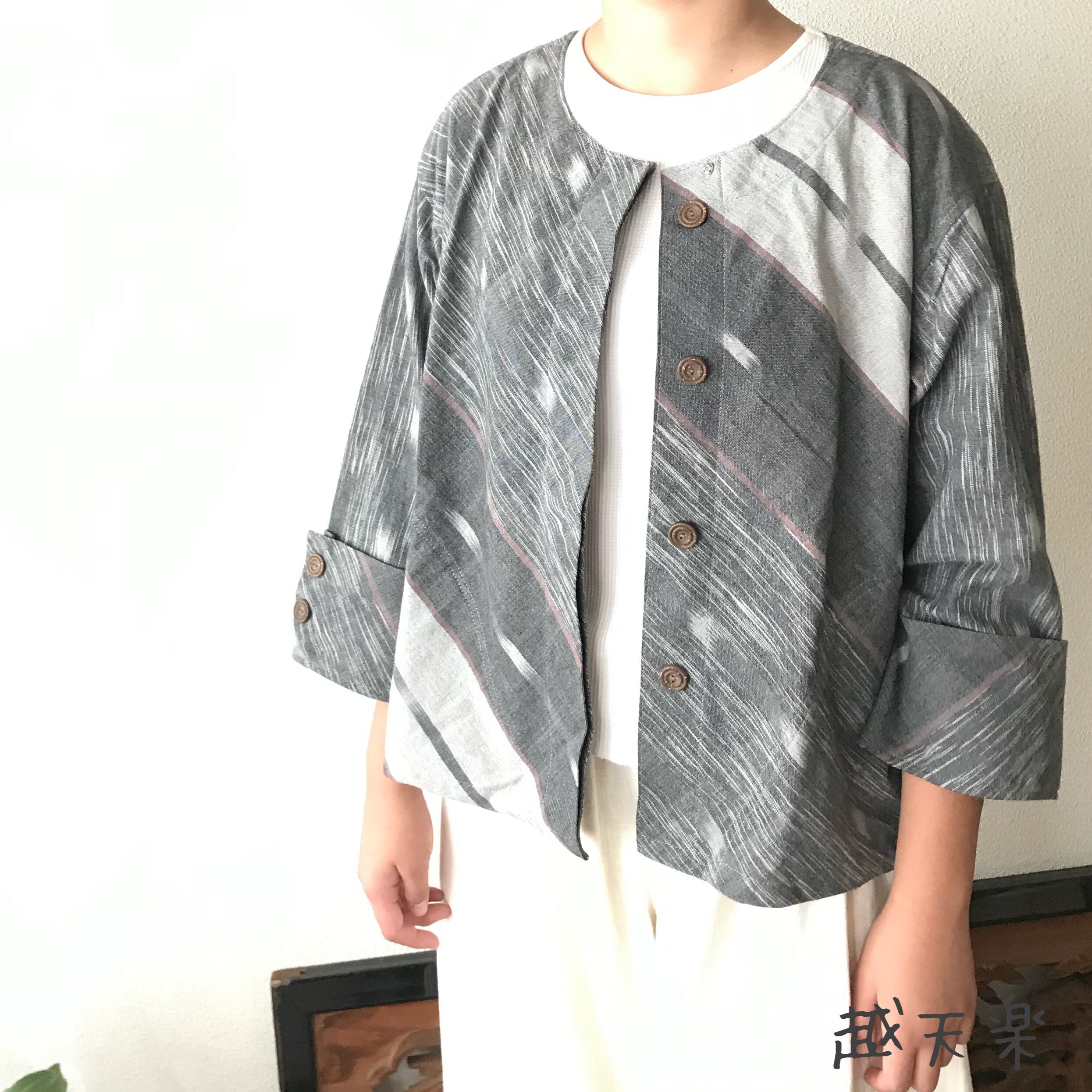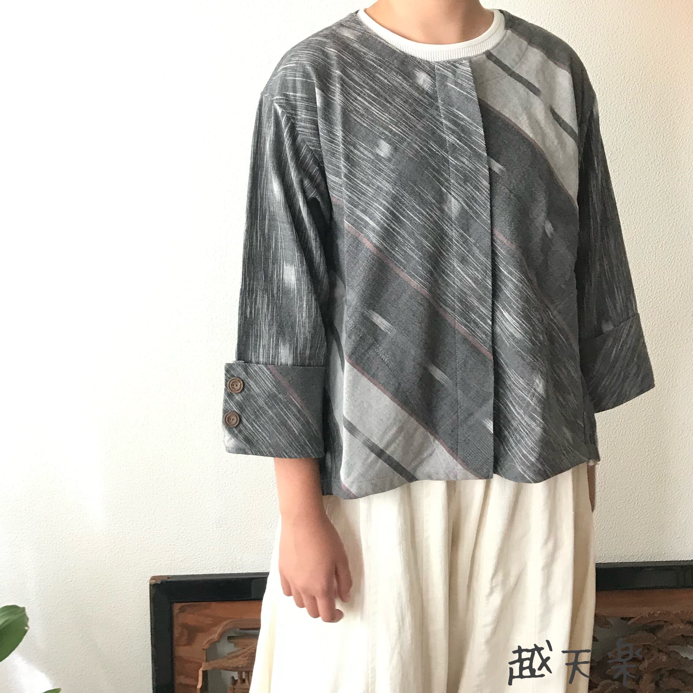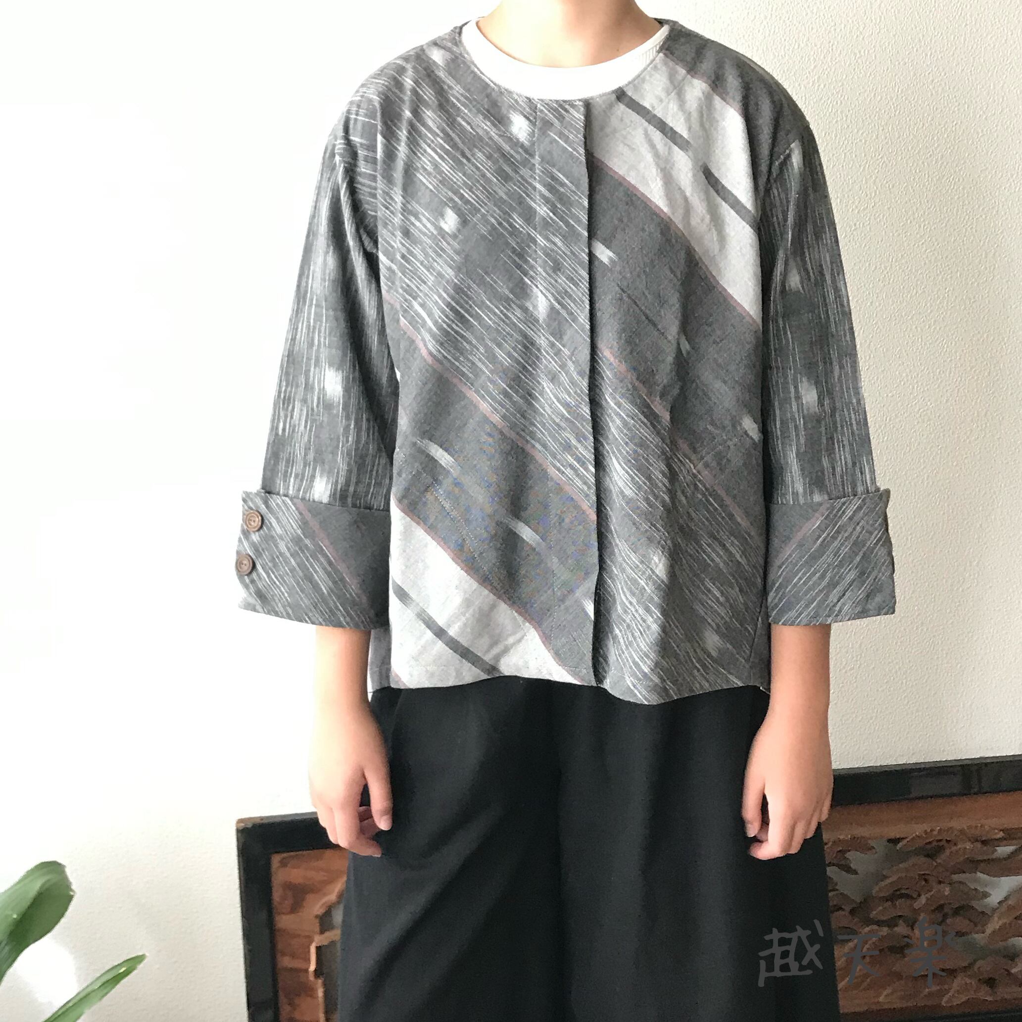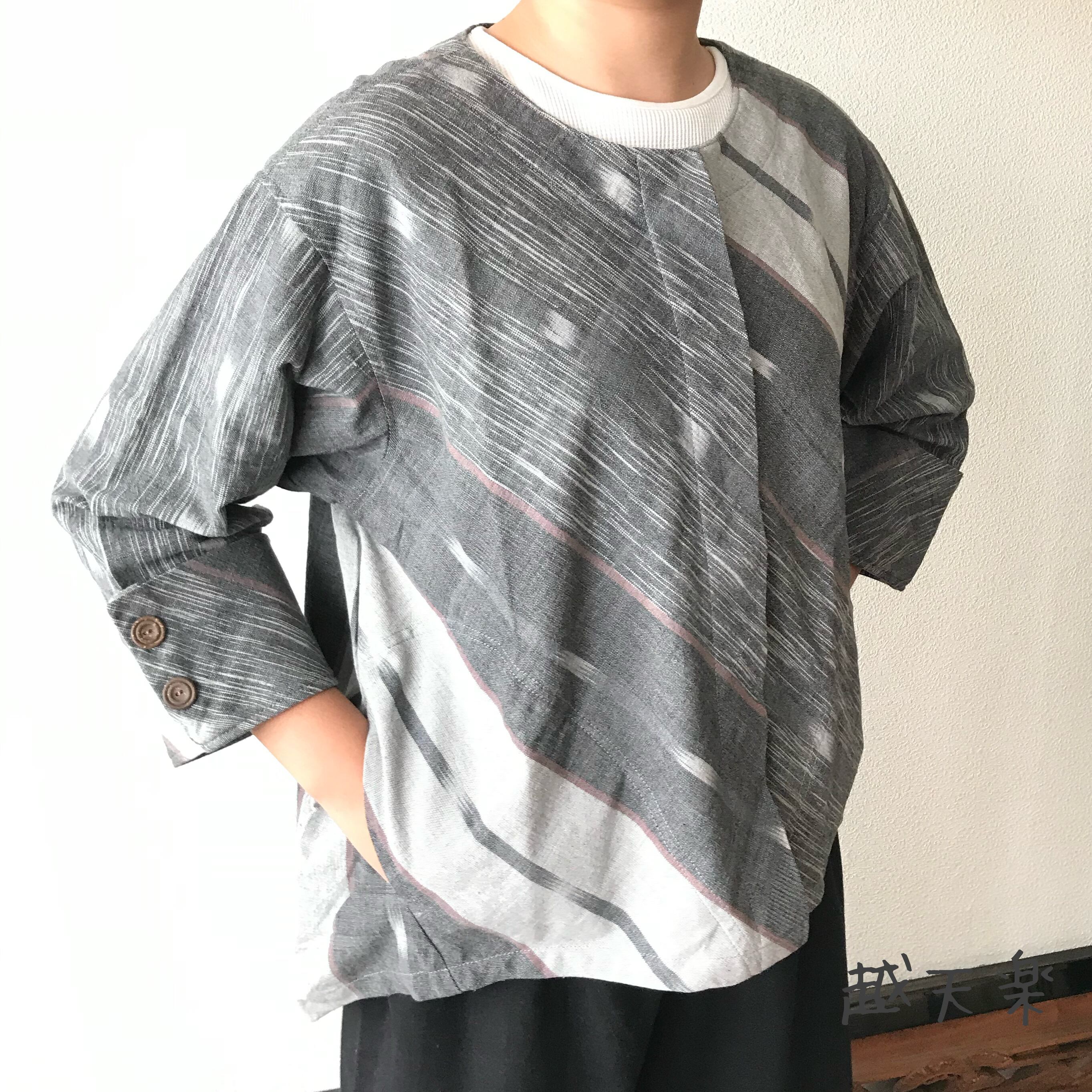 隠しボタンと前身頃のバイヤス、裾の遊びが楽しいノーカラー手織り綿前開きブラウスジャケット グレイ絣