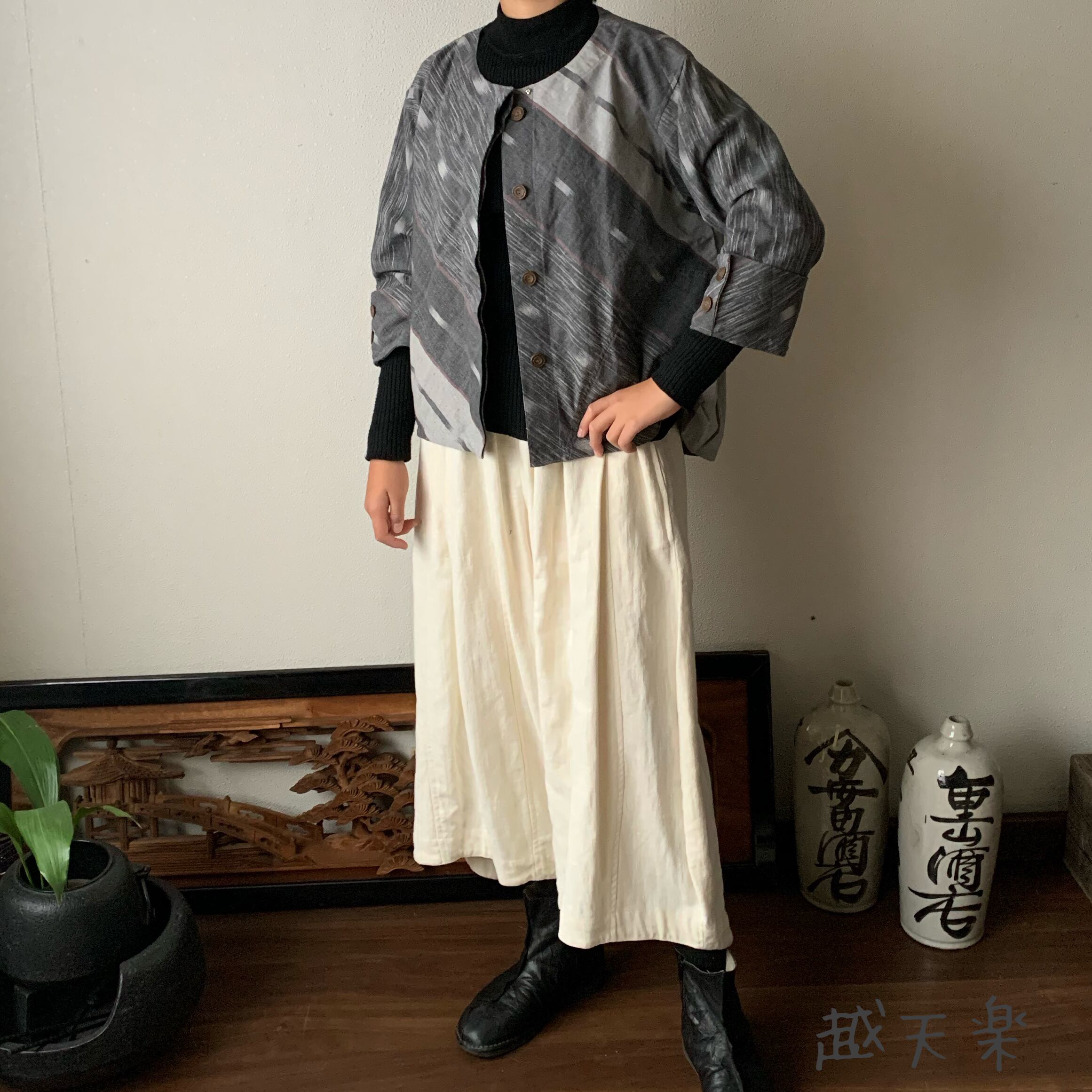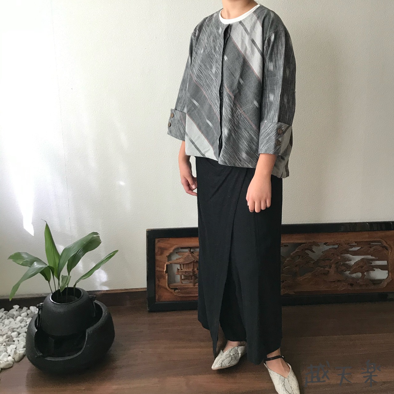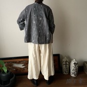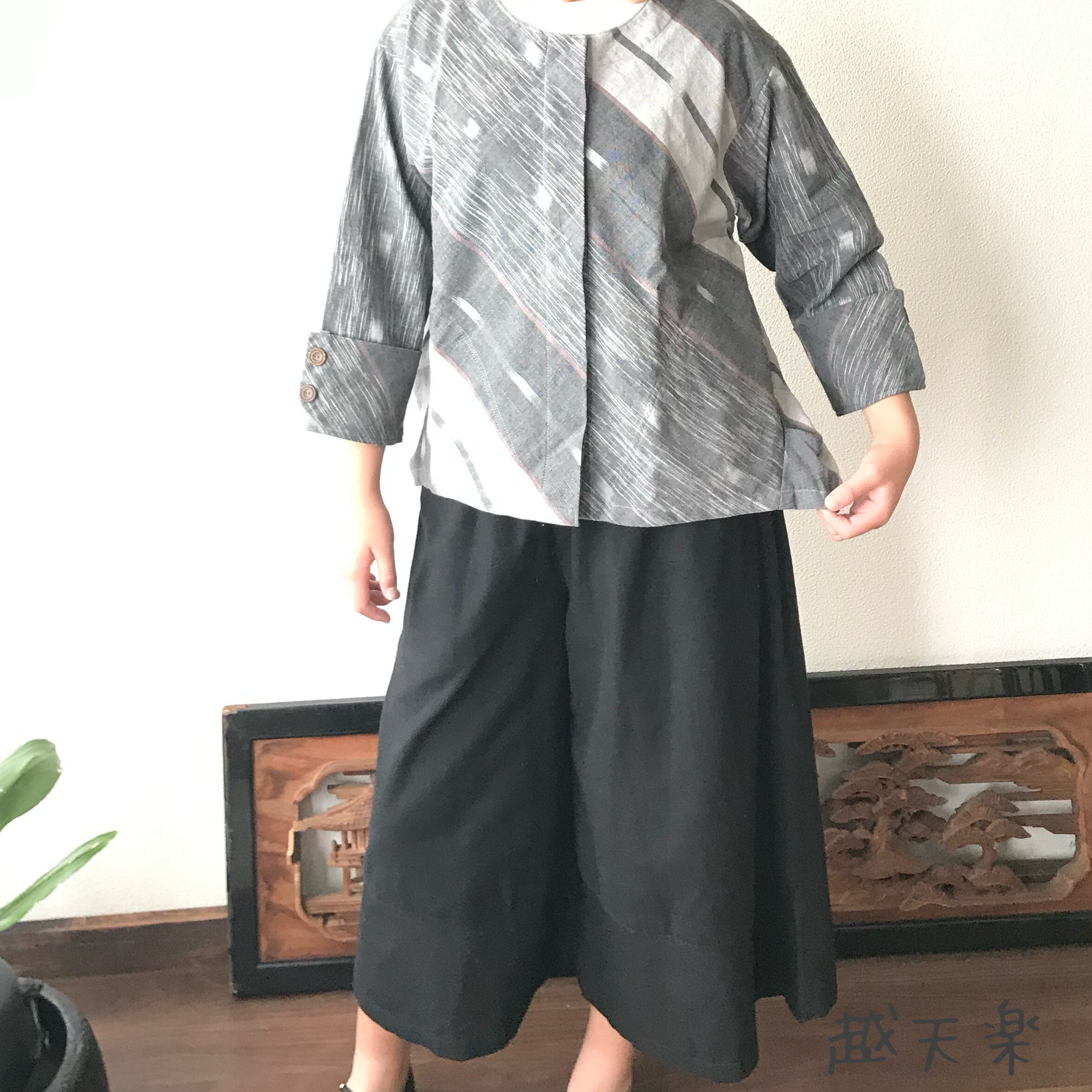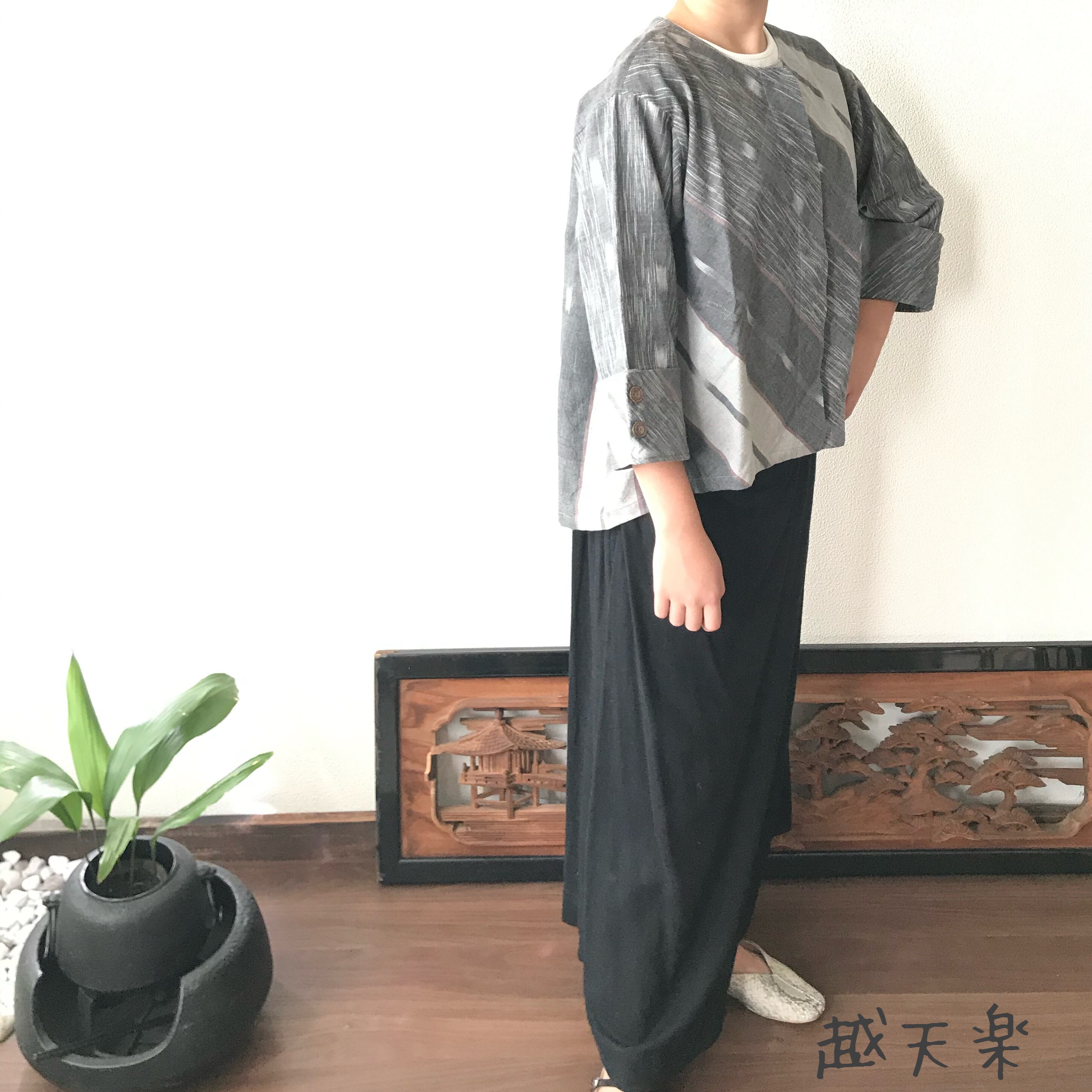 隠しボタンと前身頃のバイヤス、裾の遊びが楽しいノーカラー手織り綿前開きブラウスジャケット グレイ絣