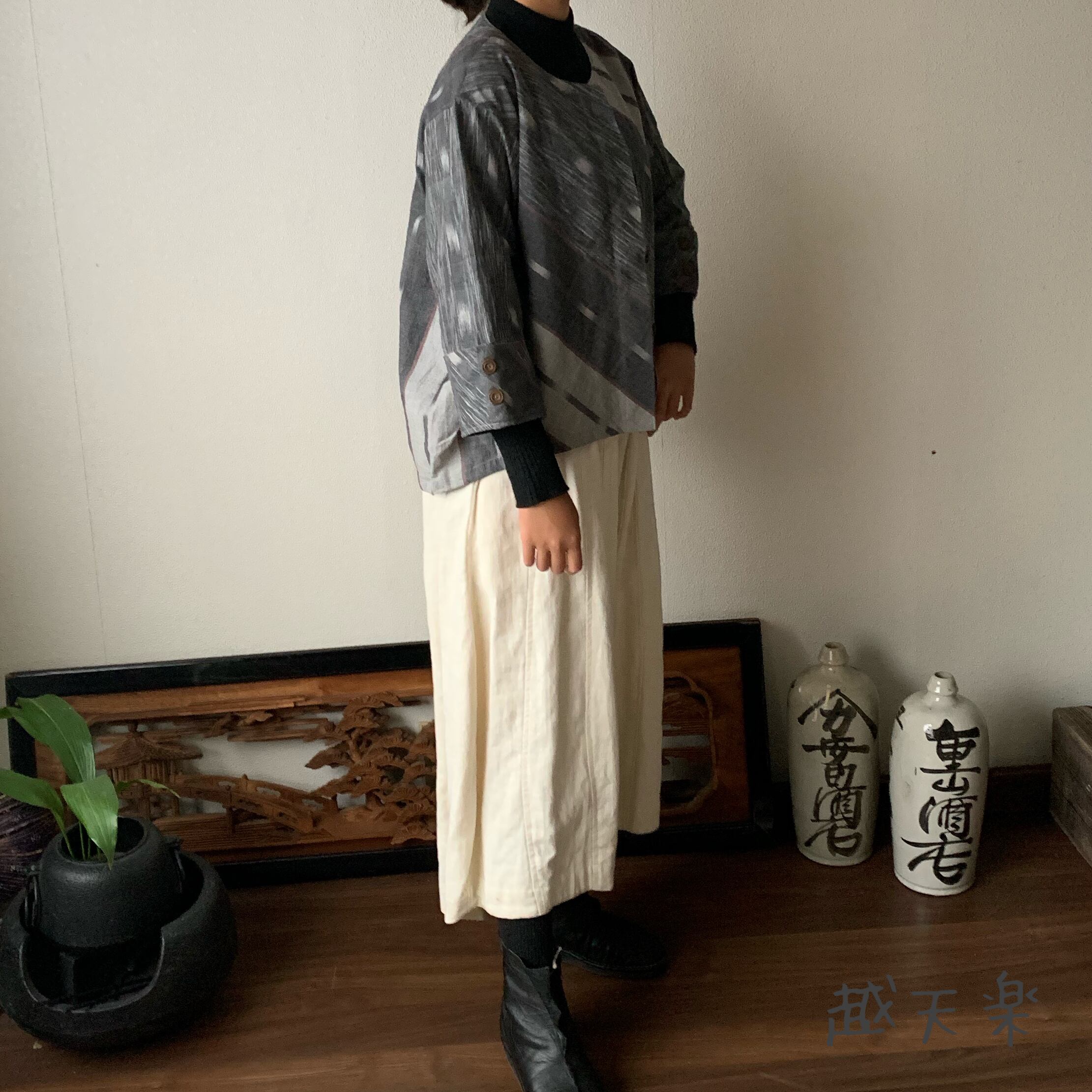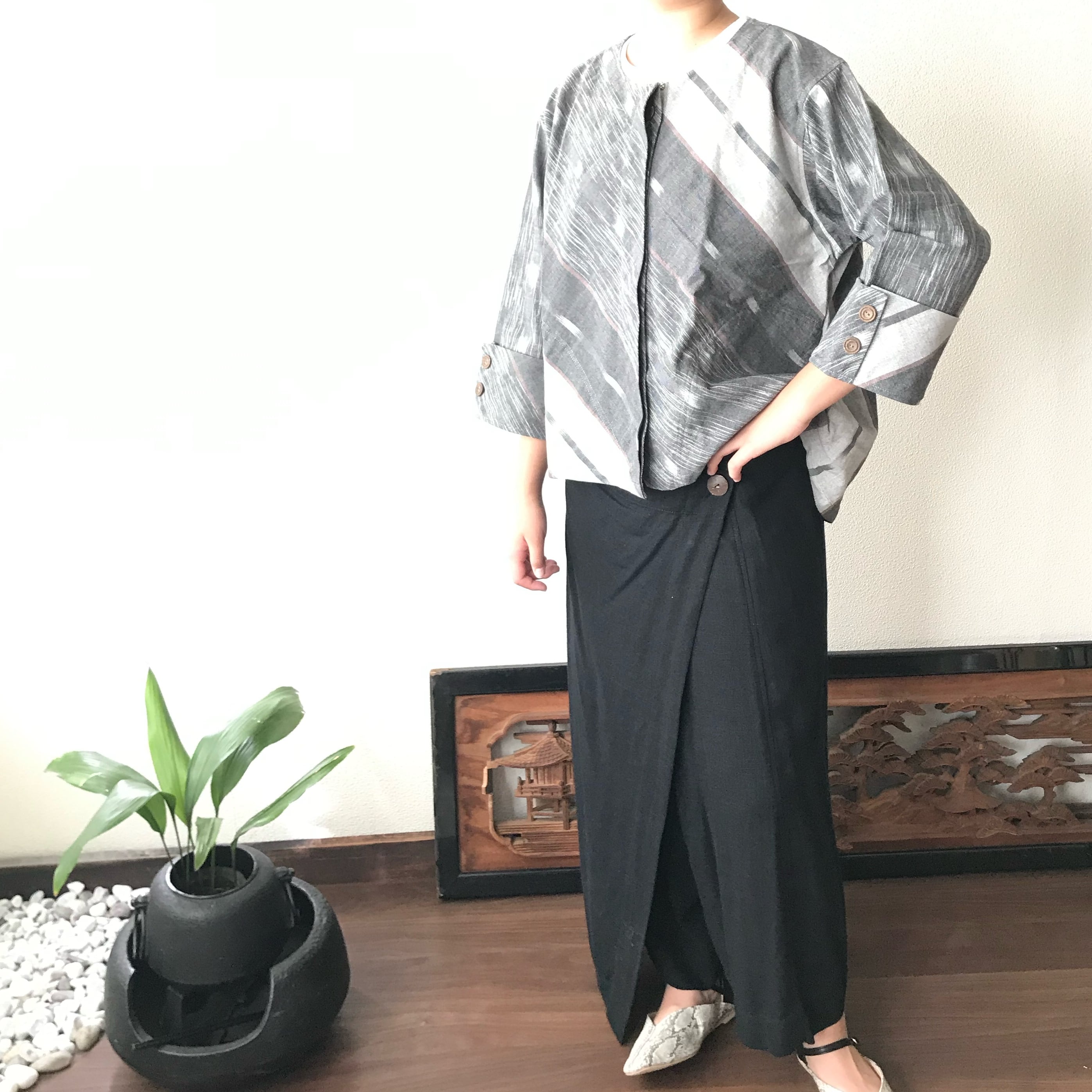 写真セットで履いているヘンプの黒色巻きスカートパンツはこちら↓