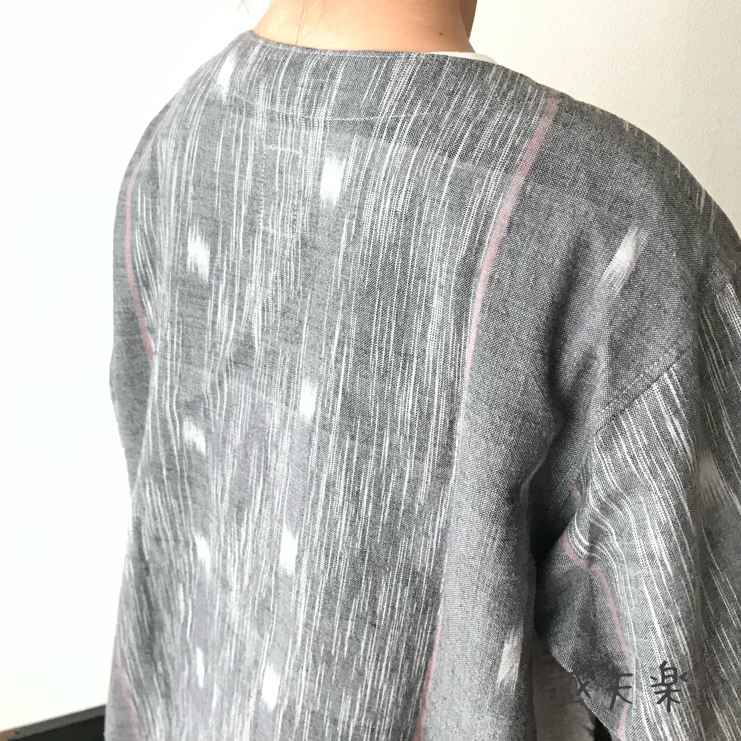 前身頃はバイヤス取りで、後ろ身頃は縦にすっきりの絣です。