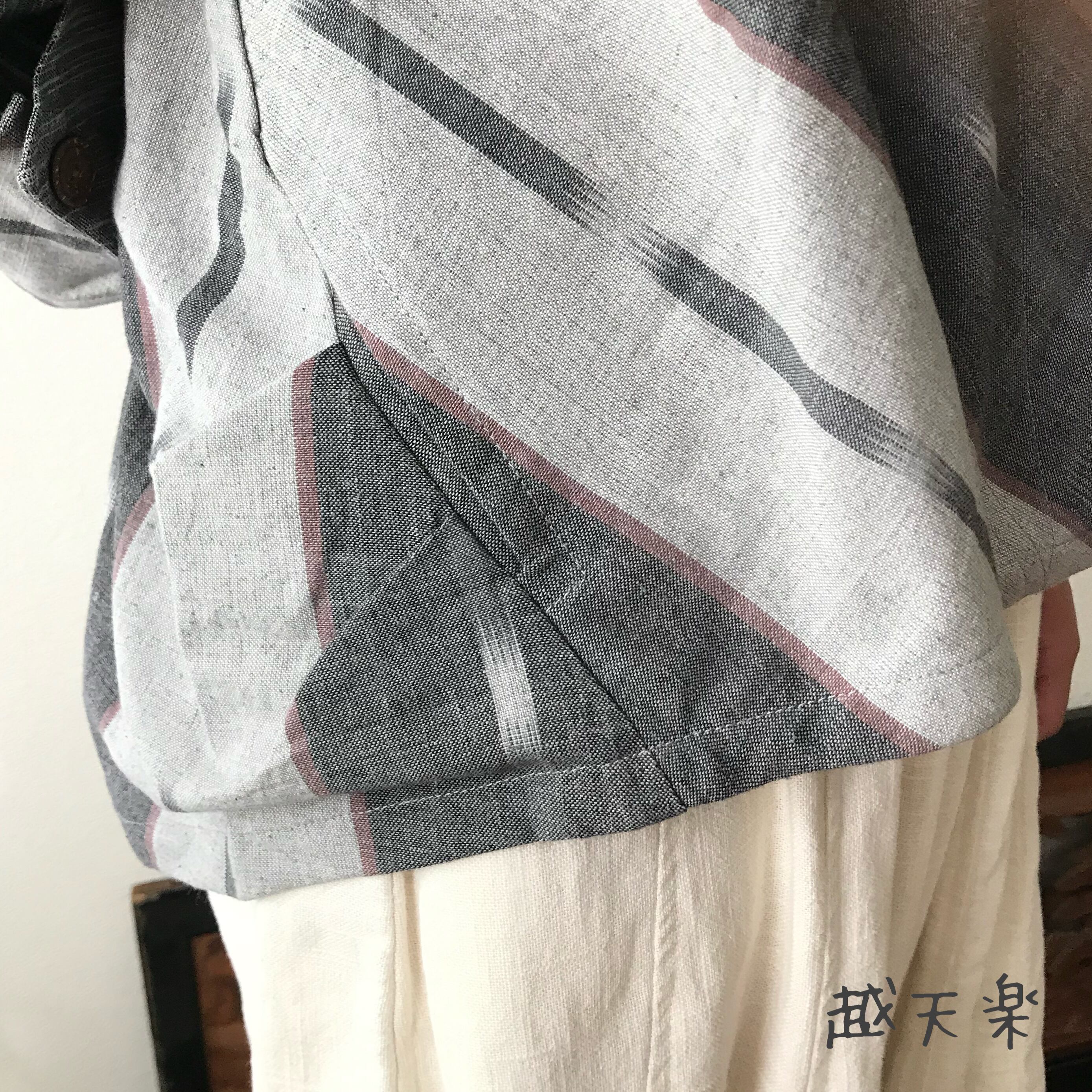 『隠しボタンと前身頃のバイヤス、裾の遊びが楽しいノーカラー手織り綿前開きブラウスジャケット』