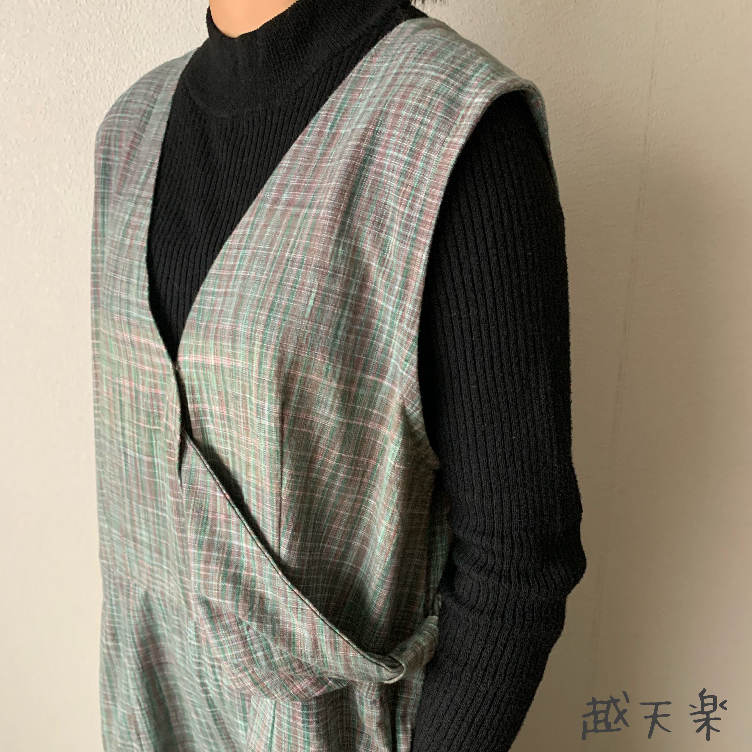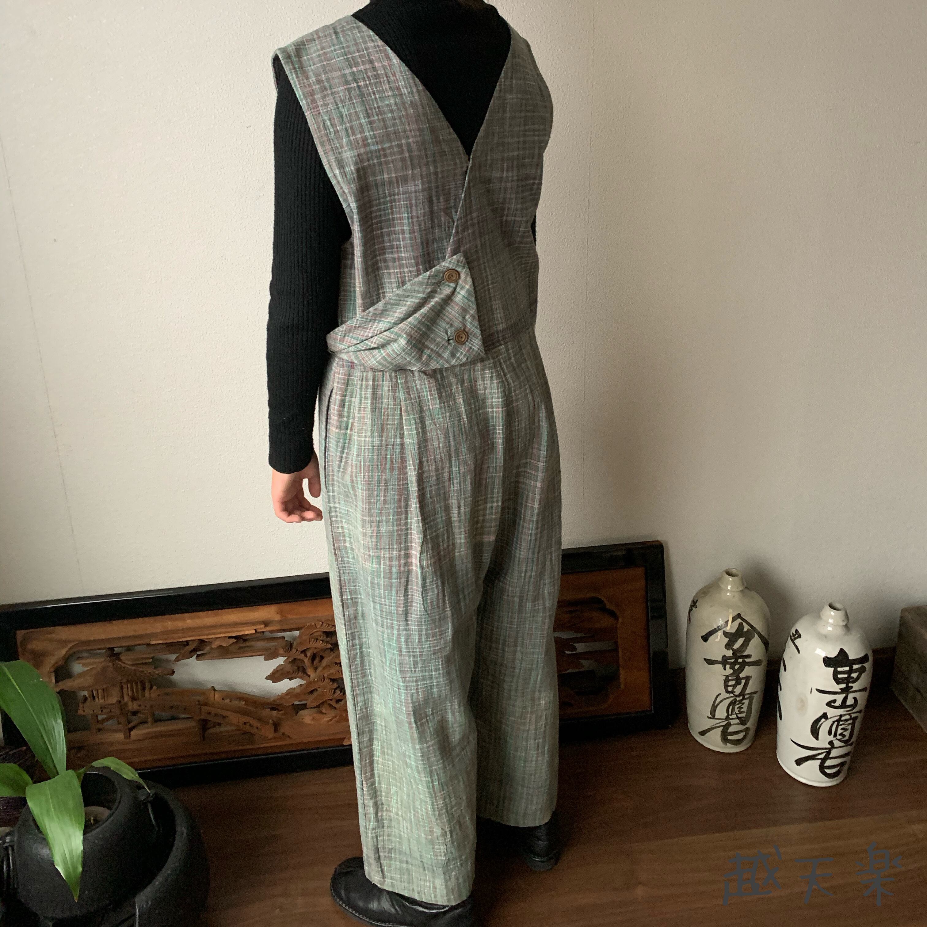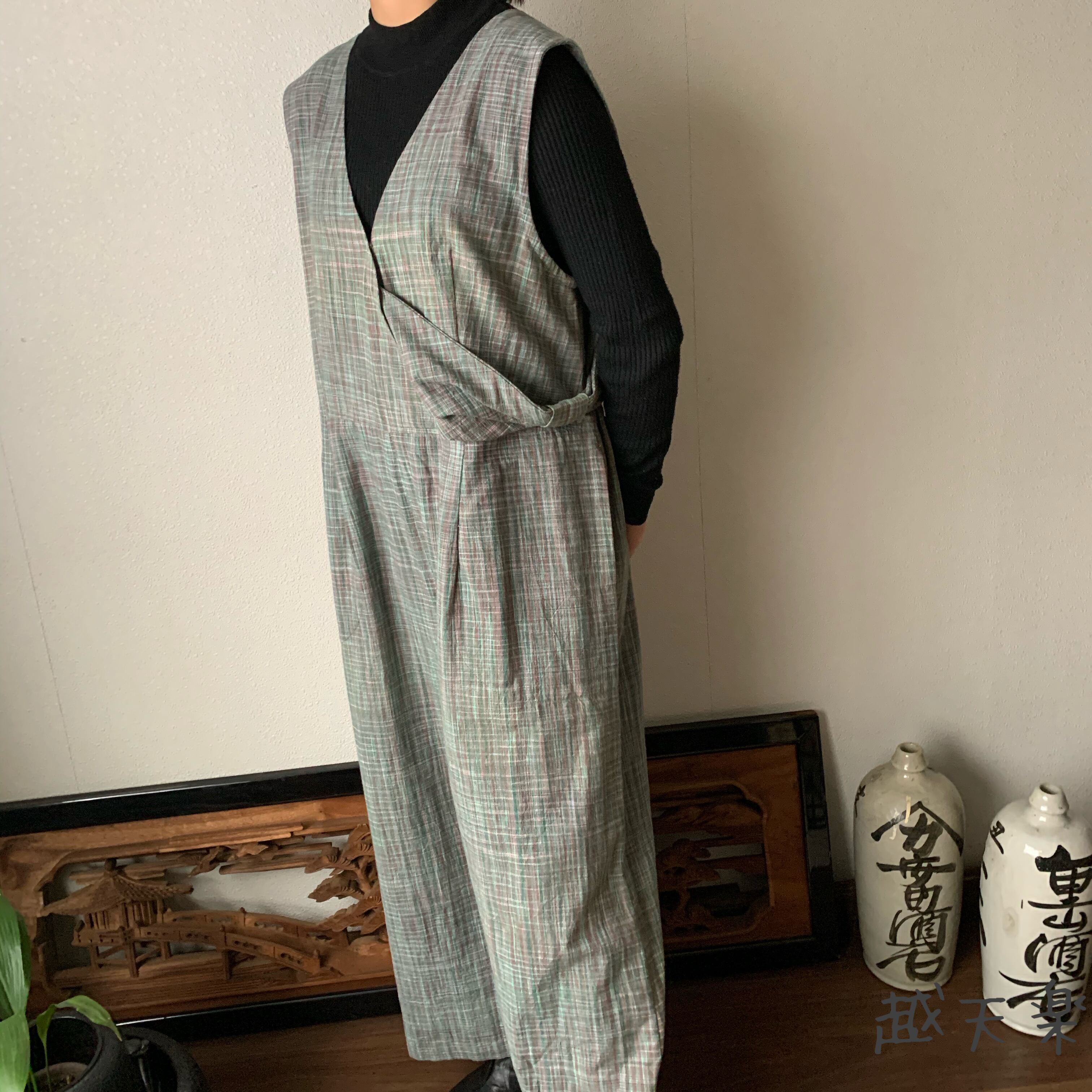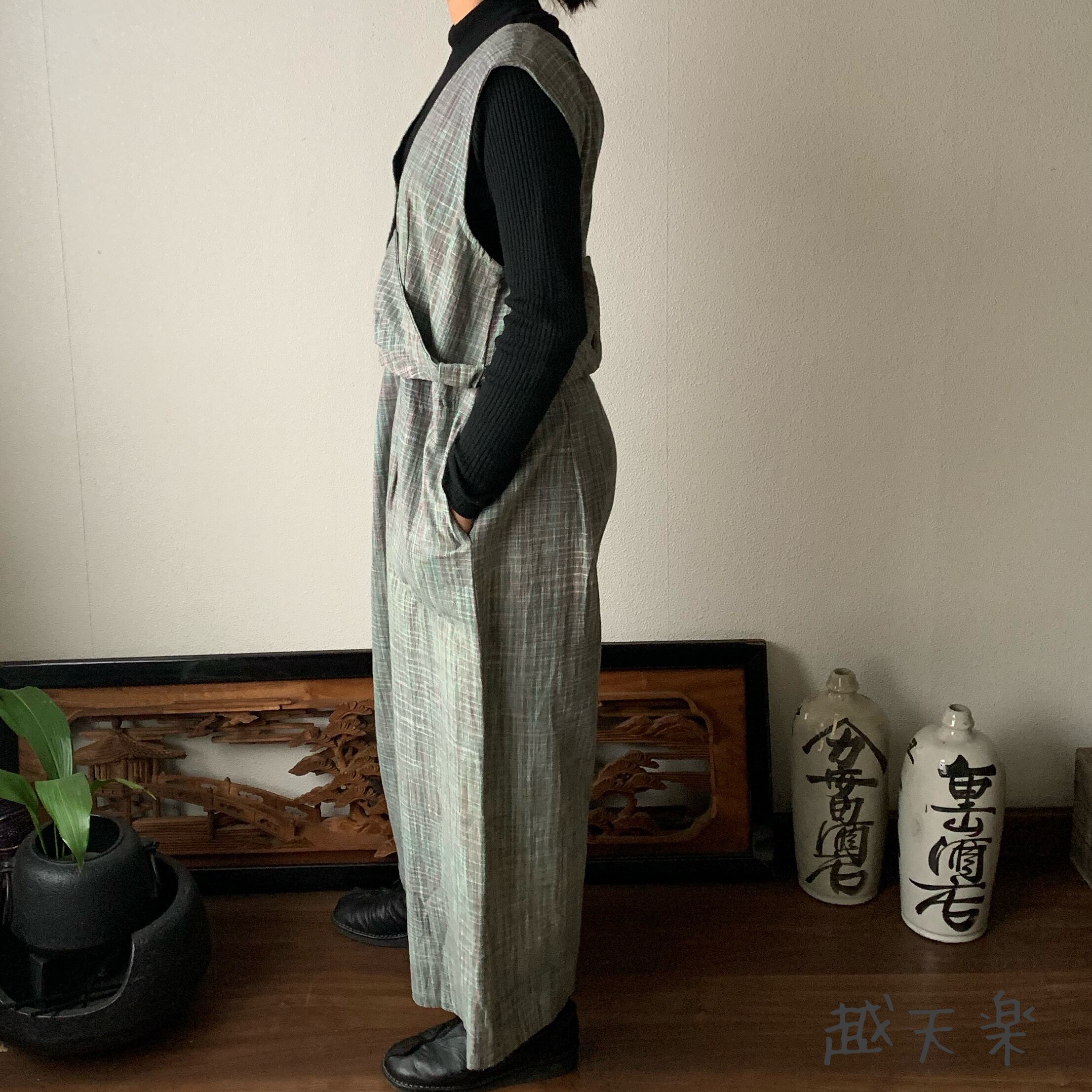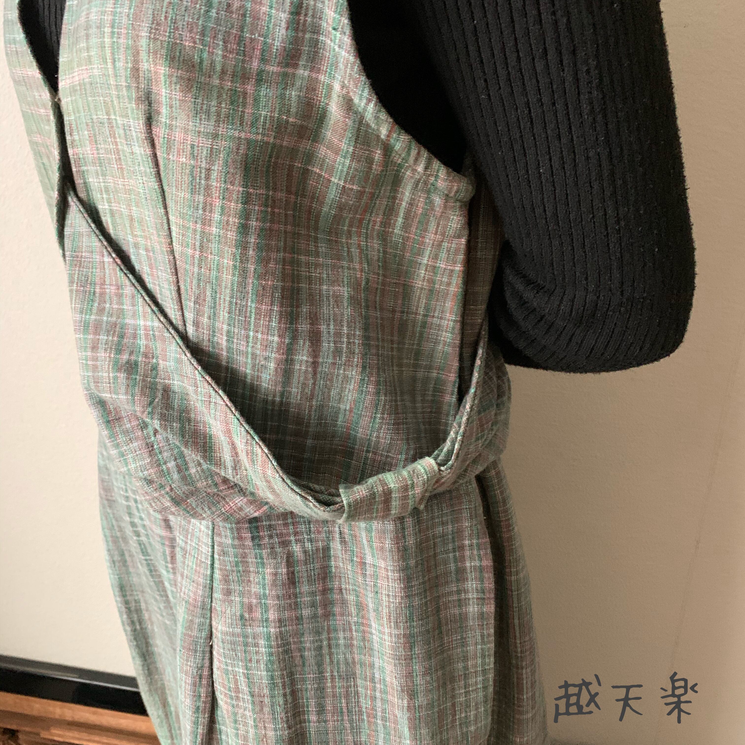 『ゆったり手織り綿サロペット ロング丈とサイドリボンですっきり、前と後のスナップボタンで脱ぎ着楽ちん』