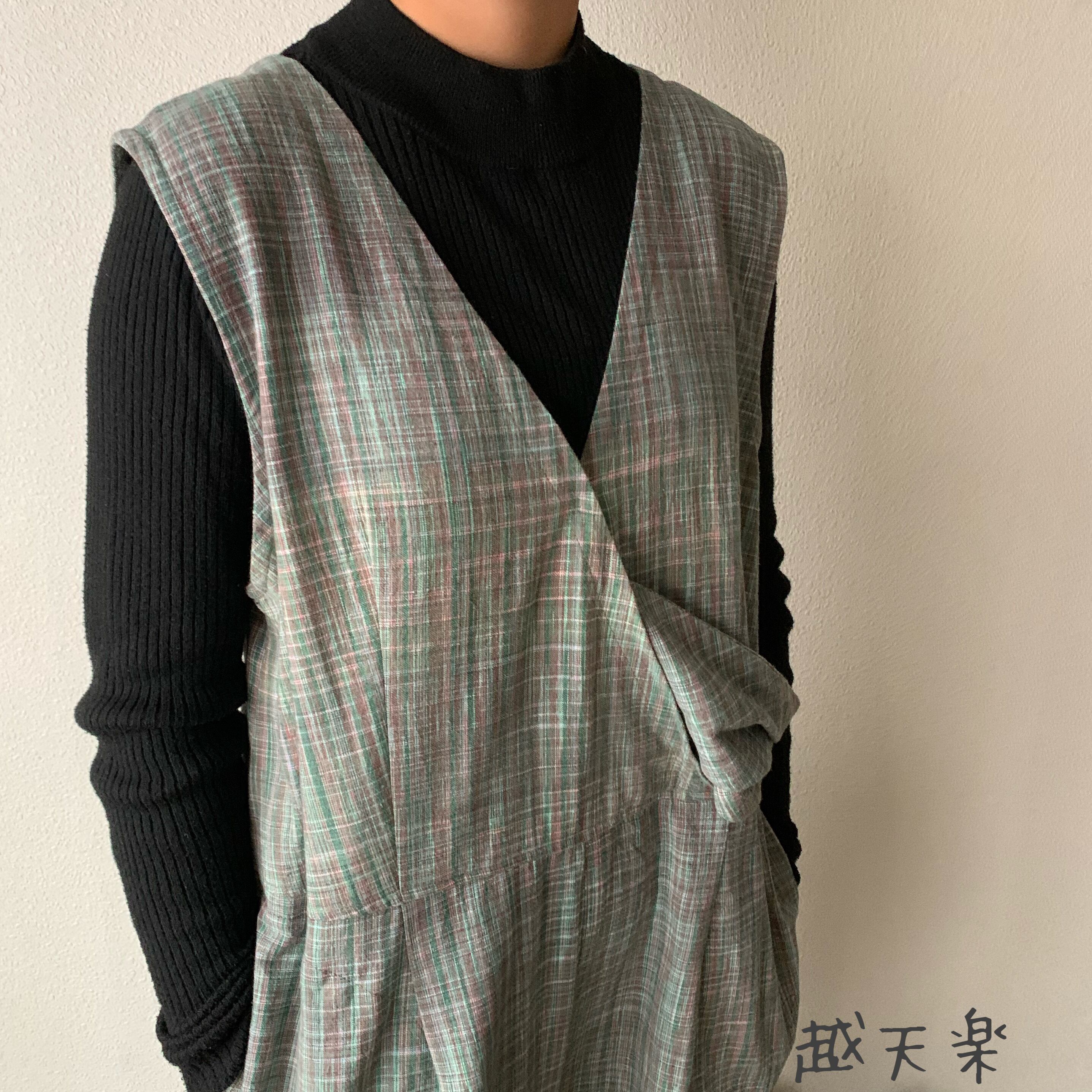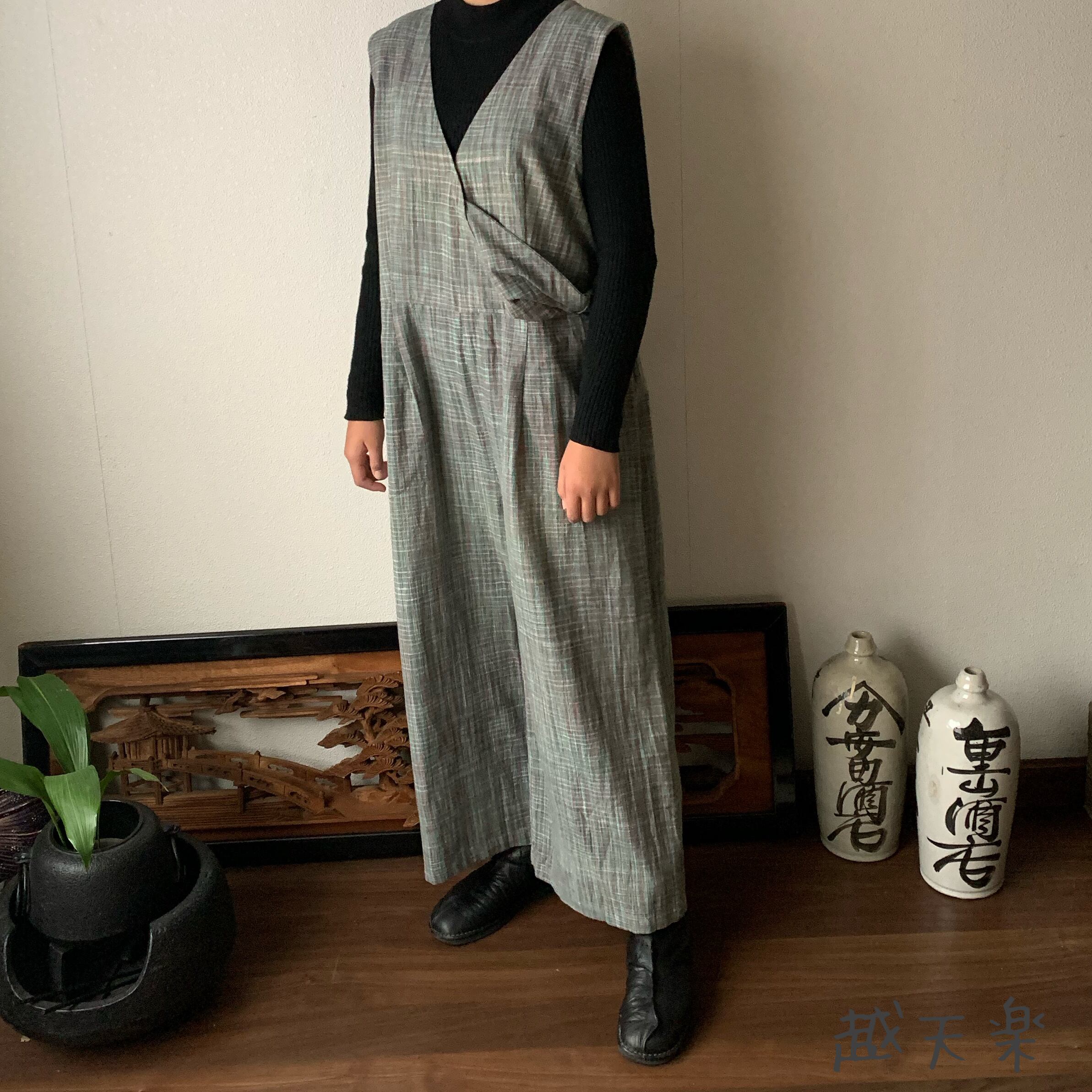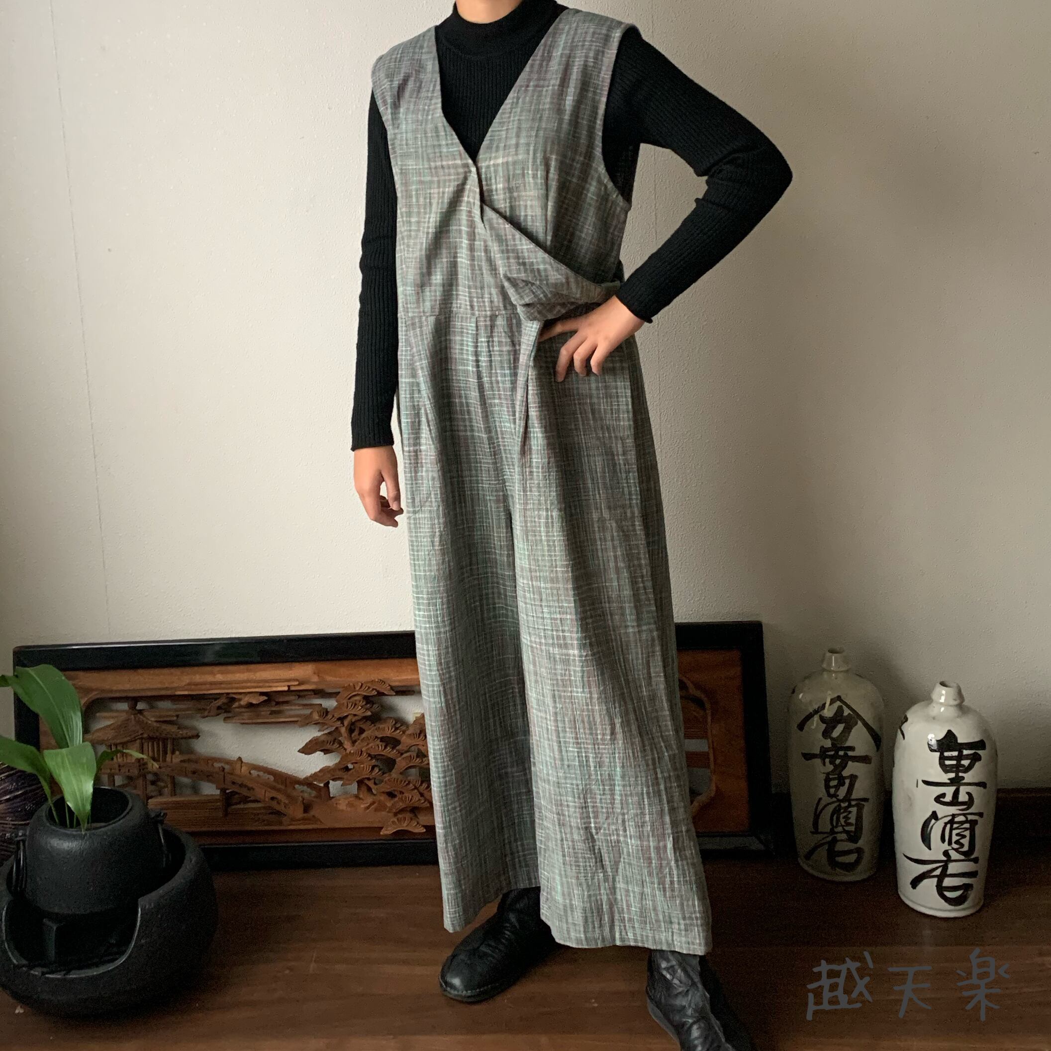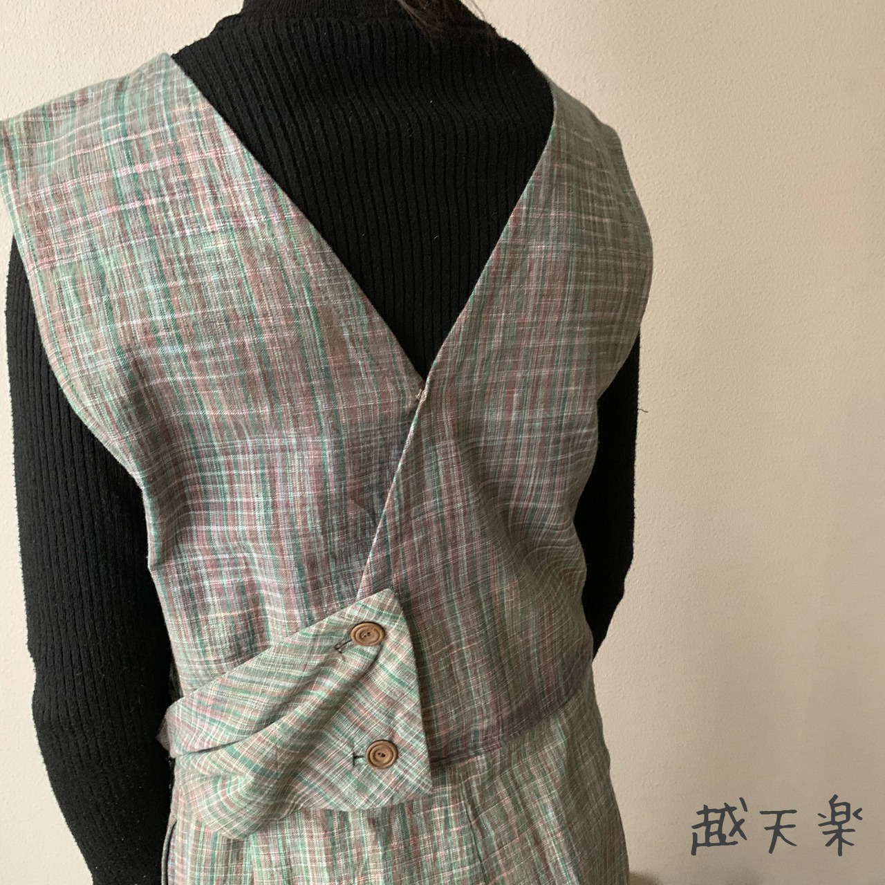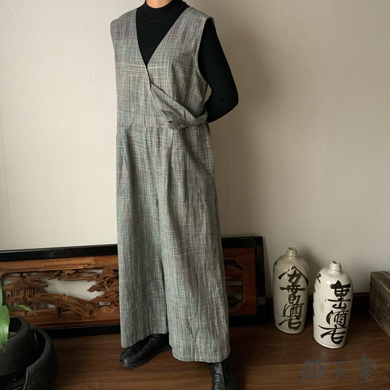 『ゆったり手織り綿サロペット ロング丈とサイドリボンですっきり、前と後のスナップボタンで脱ぎ着楽ちん』