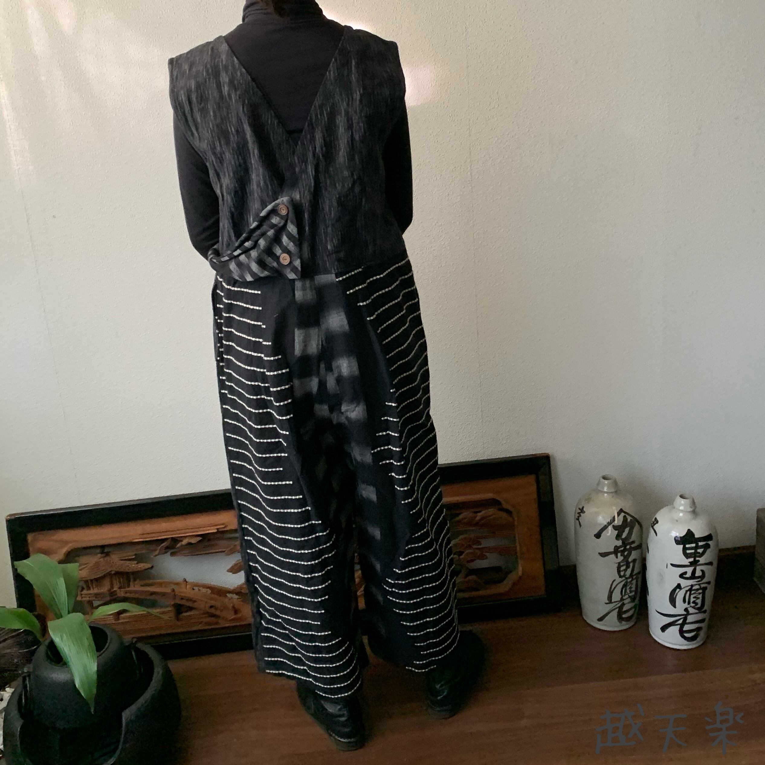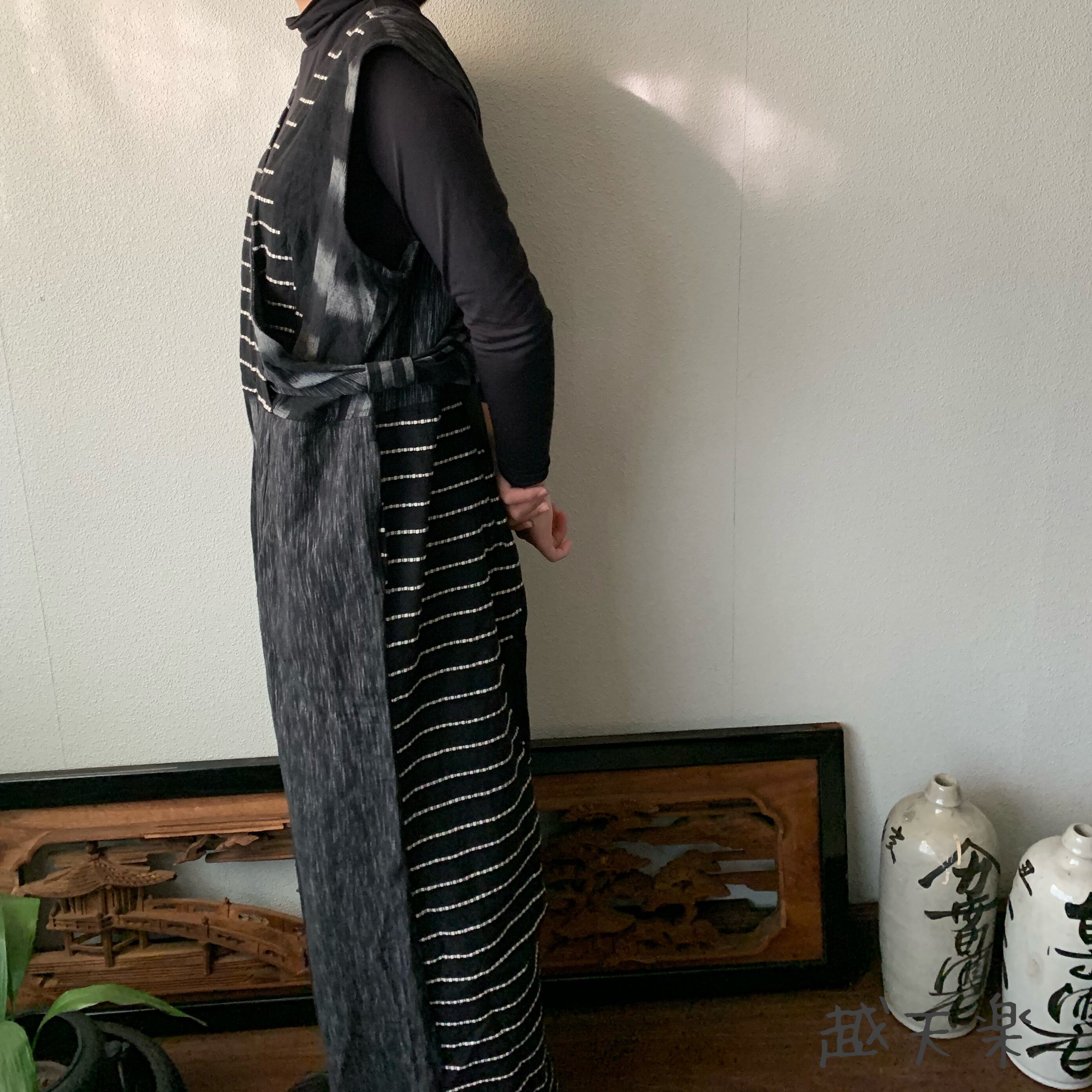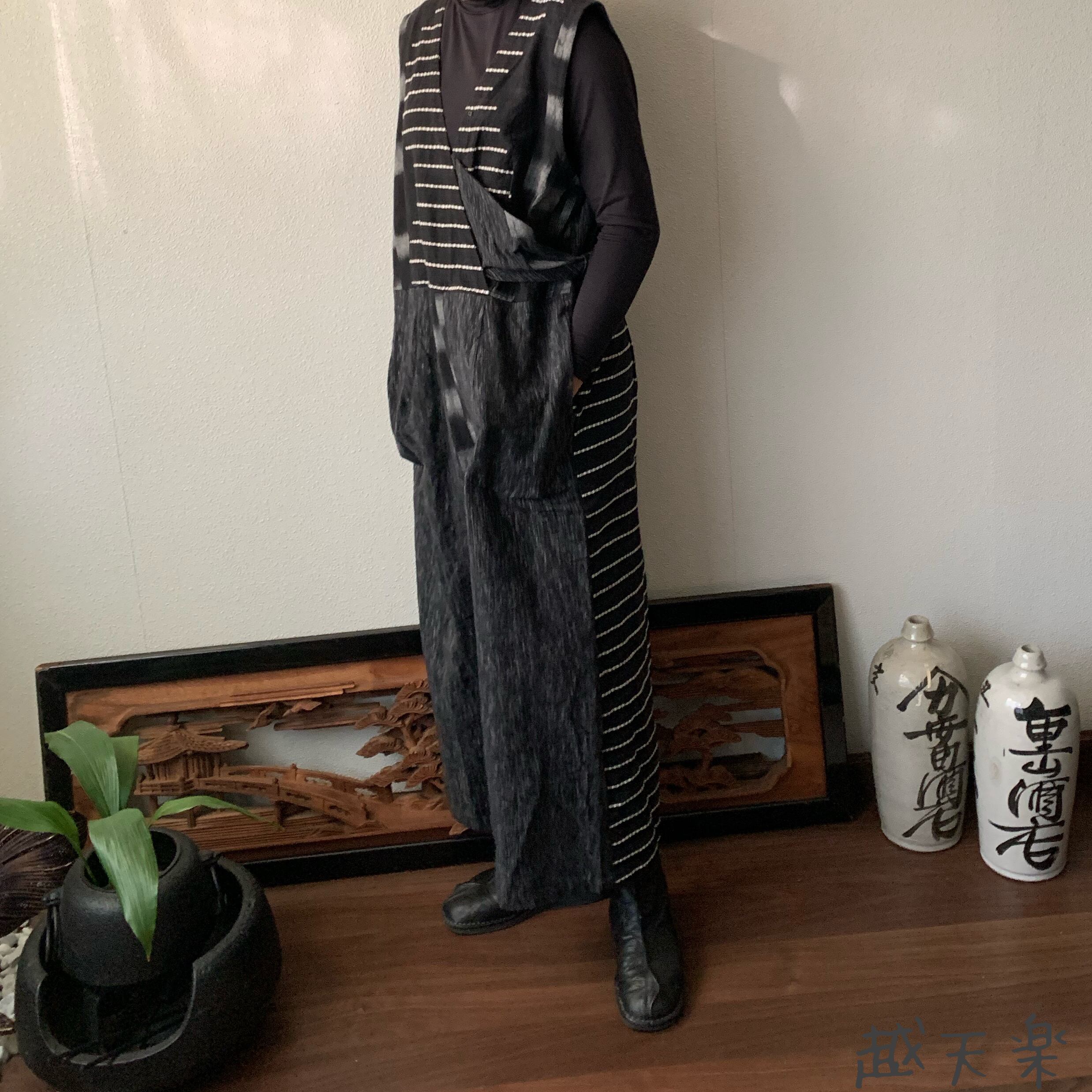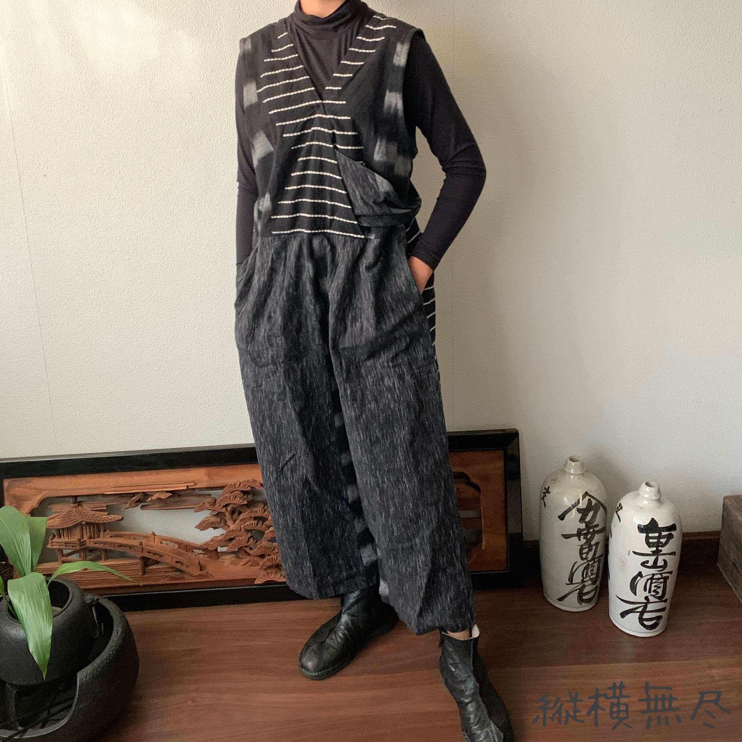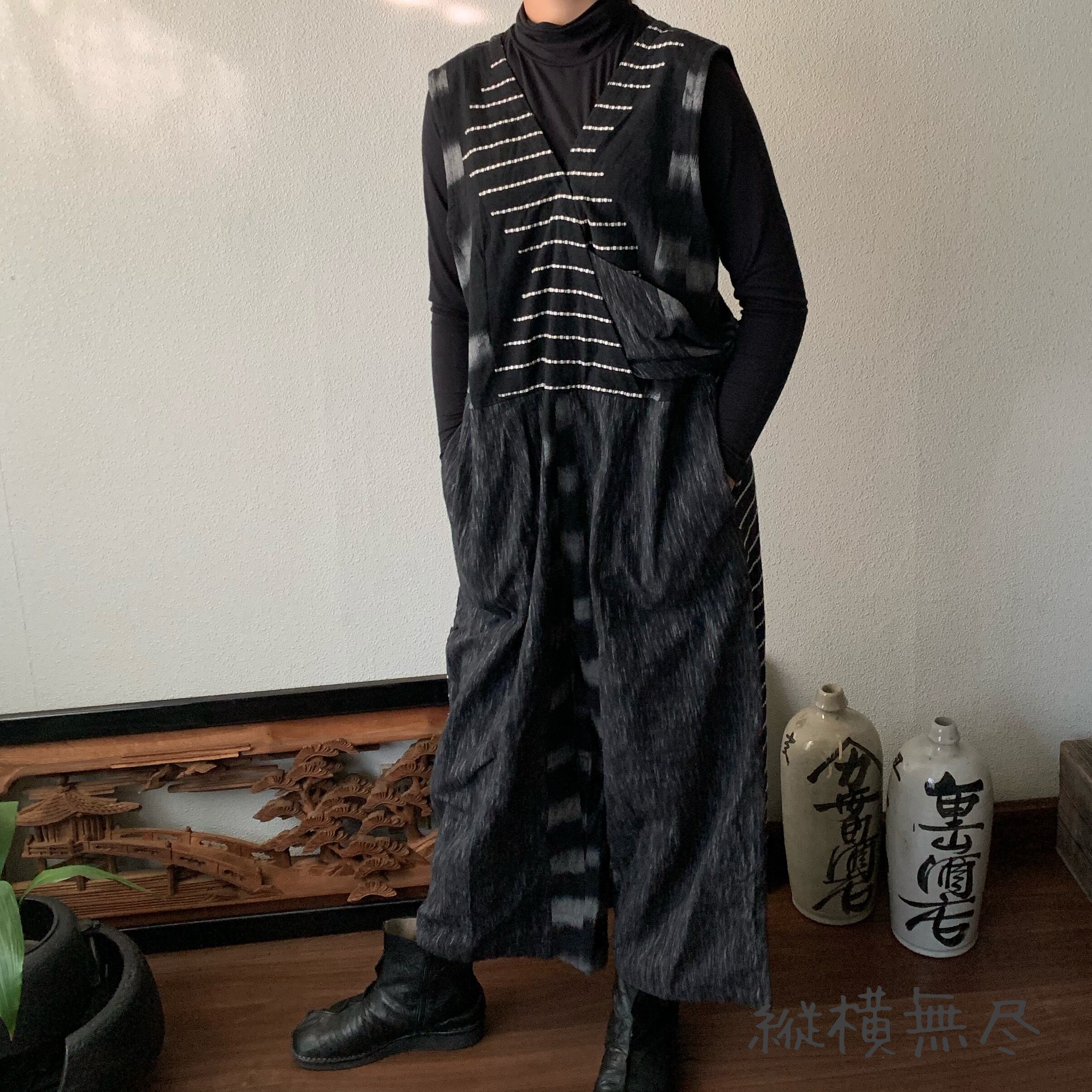 ゆったり手織り綿サロペット ロング丈とサイドリボンですっきり、前と後のスナップボタンで脱ぎ着楽ちん 黒グレイ絣