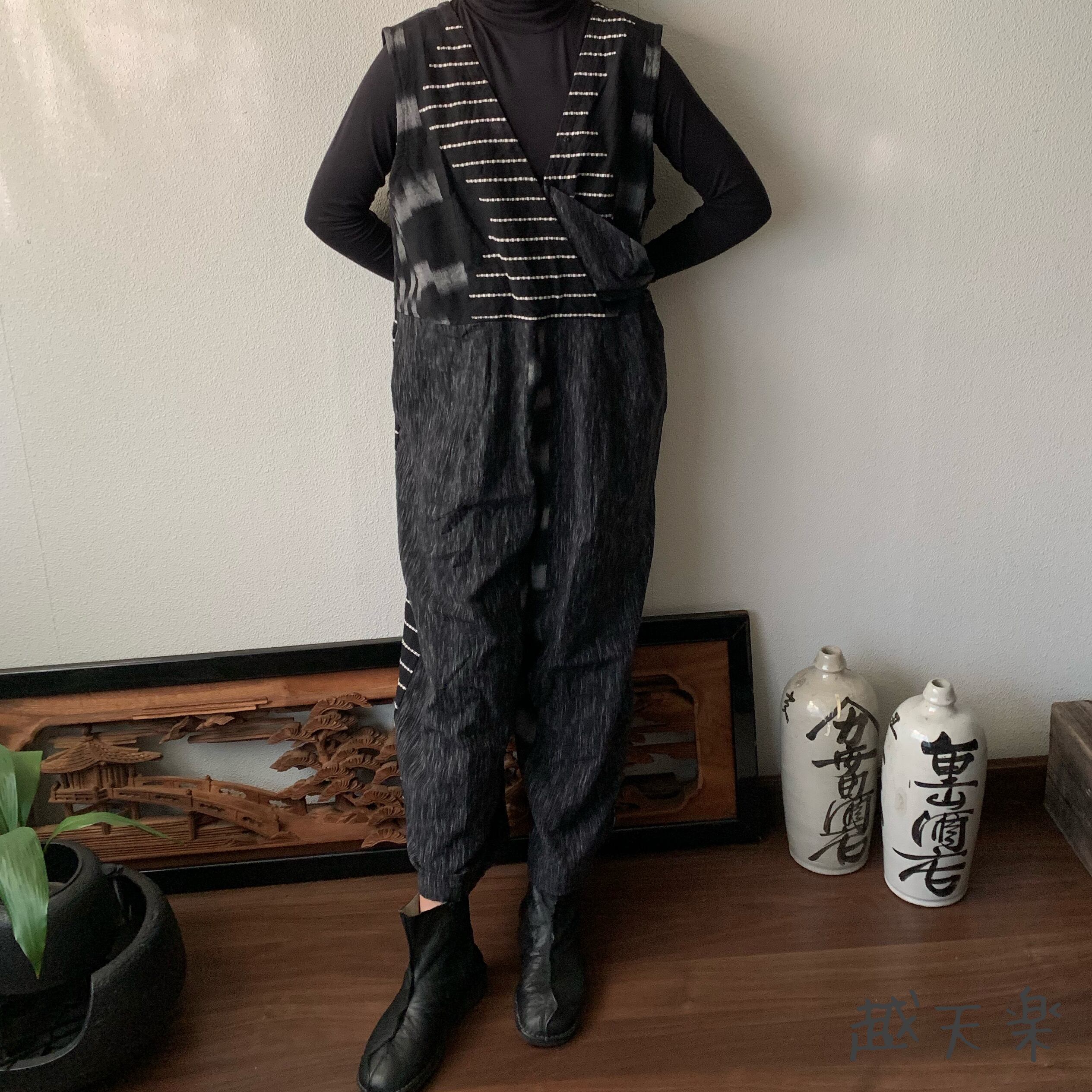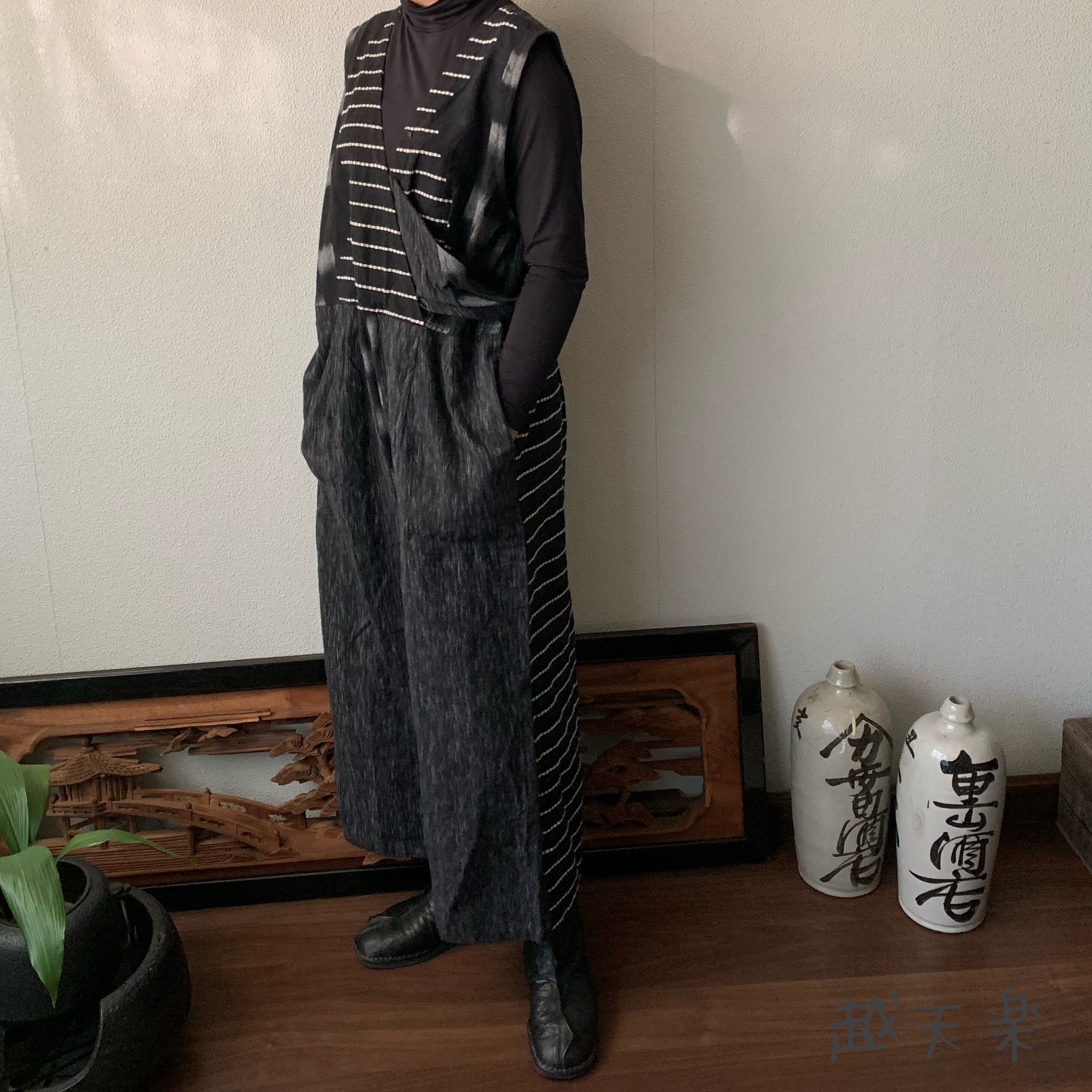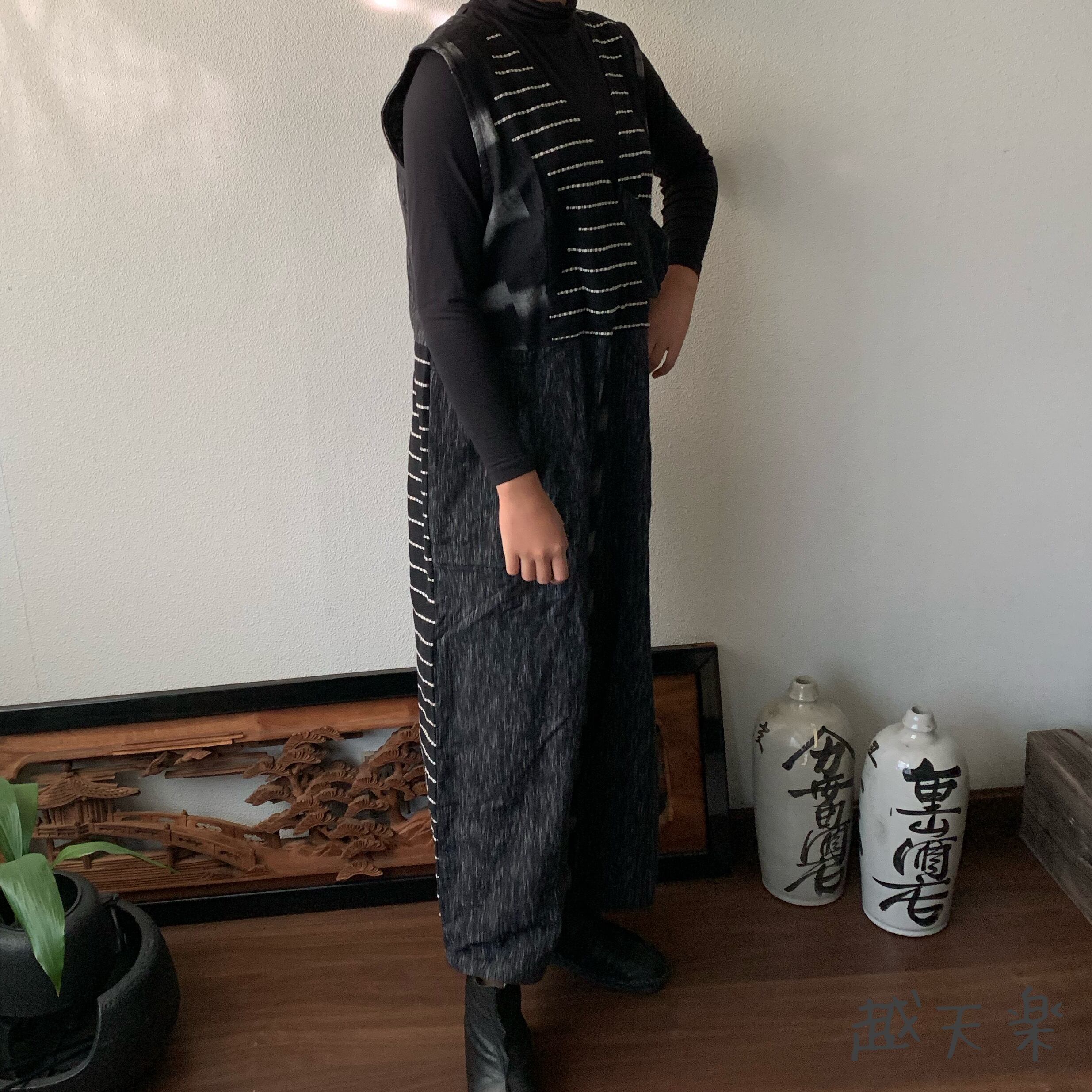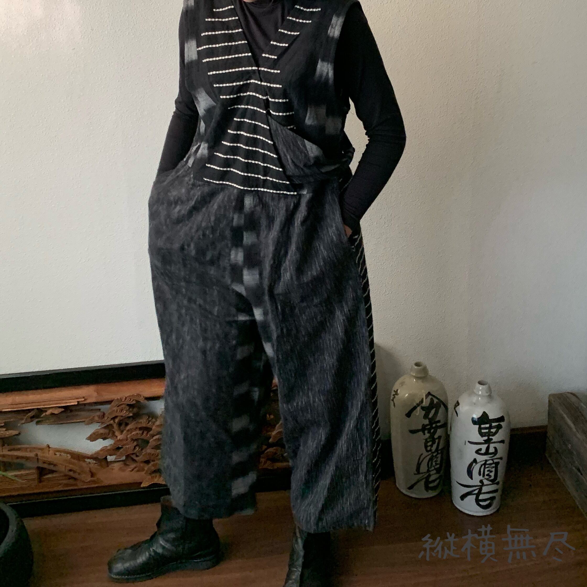 ゆったり手織り綿サロペット ロング丈とサイドリボンですっきり、前と後のスナップボタンで脱ぎ着楽ちん 黒グレイ絣