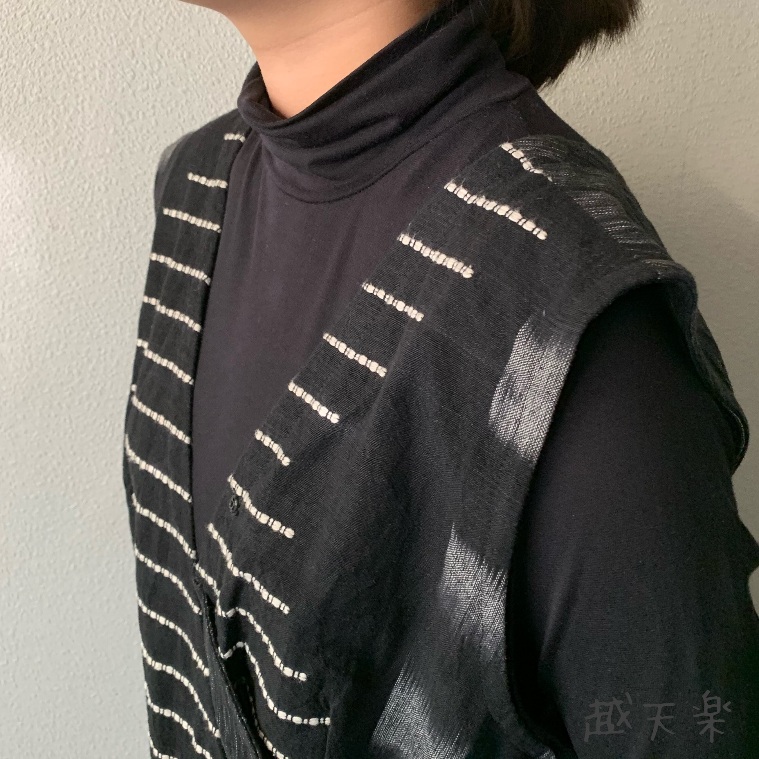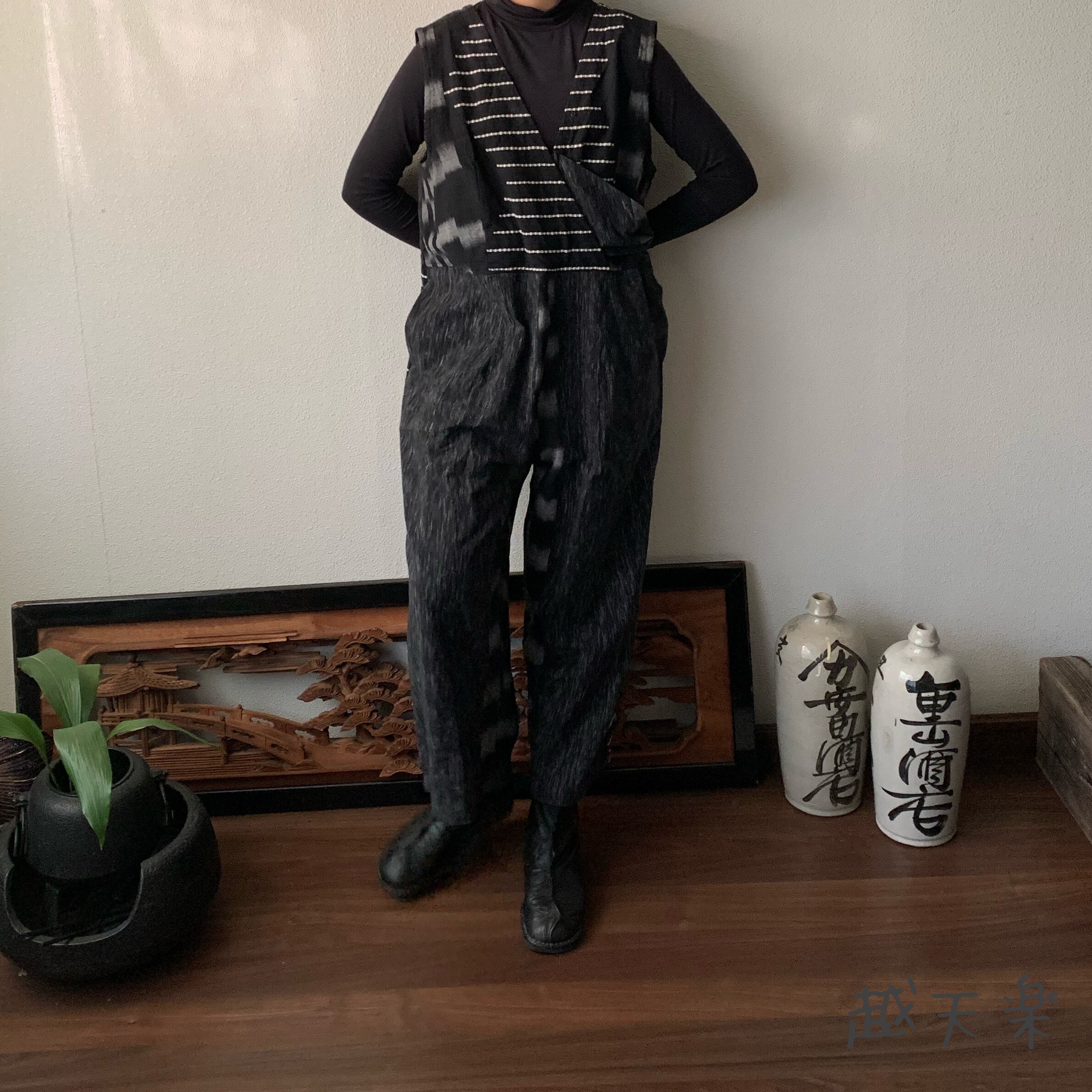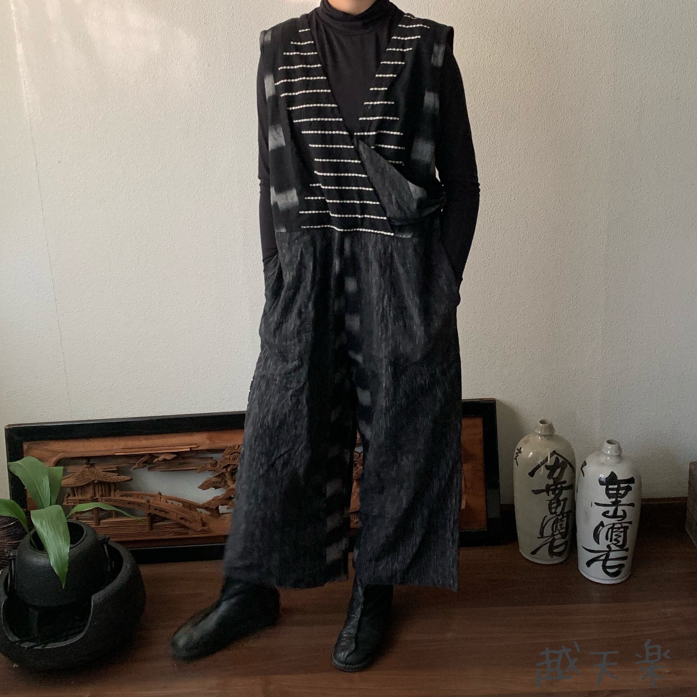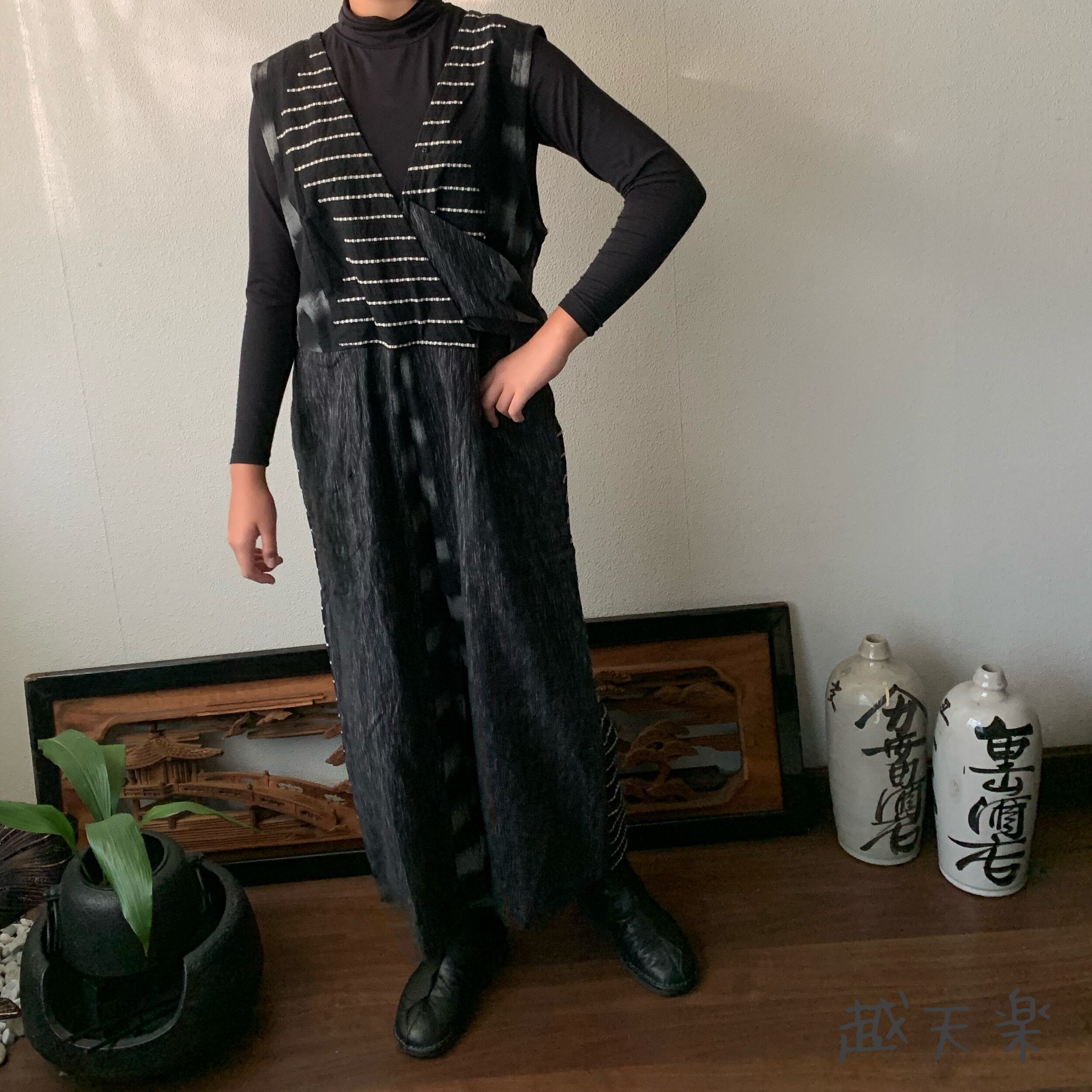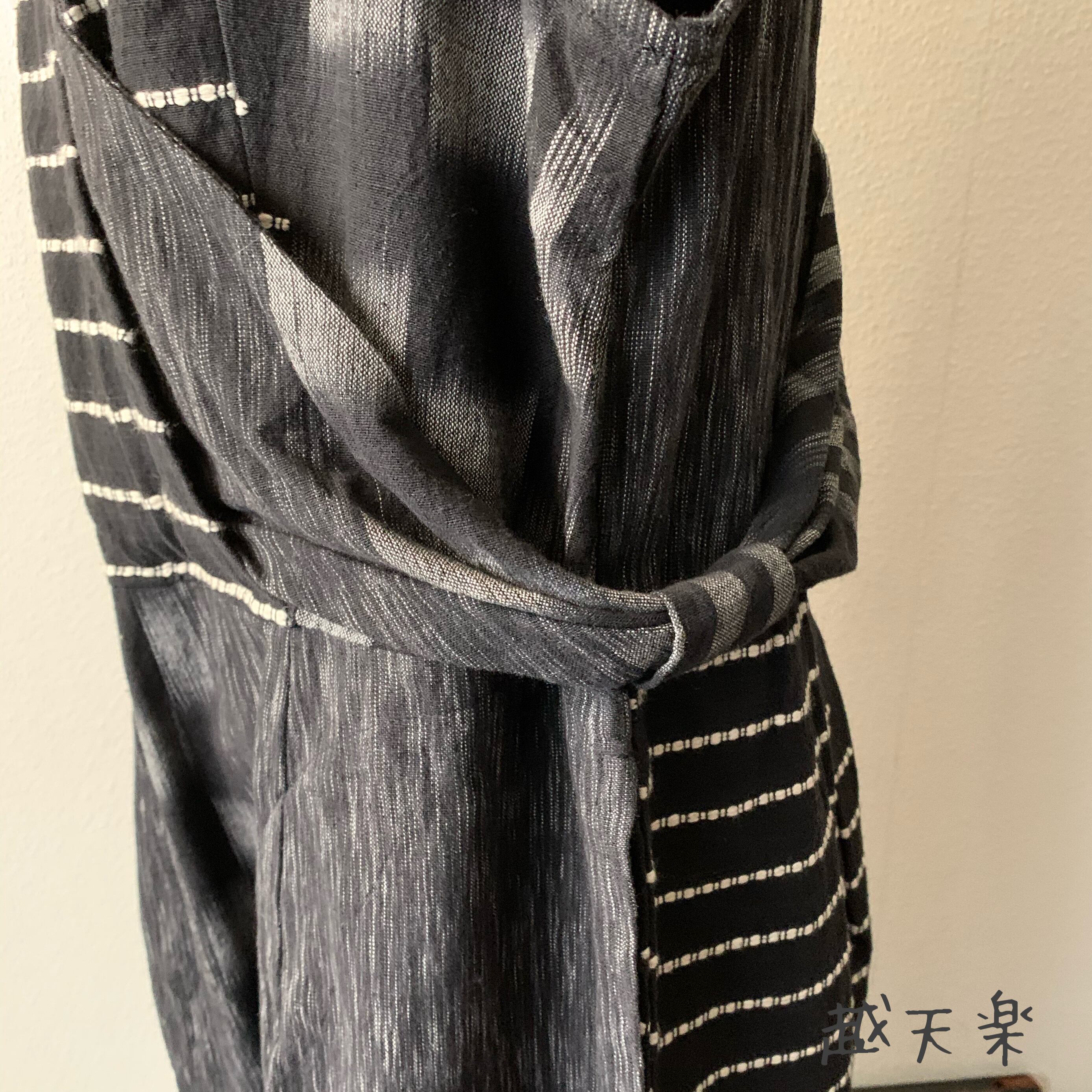 ゆったり手織り綿サロペット ロング丈とサイドリボンですっきり、前と後のスナップボタンで脱ぎ着楽ちん 黒グレイ絣