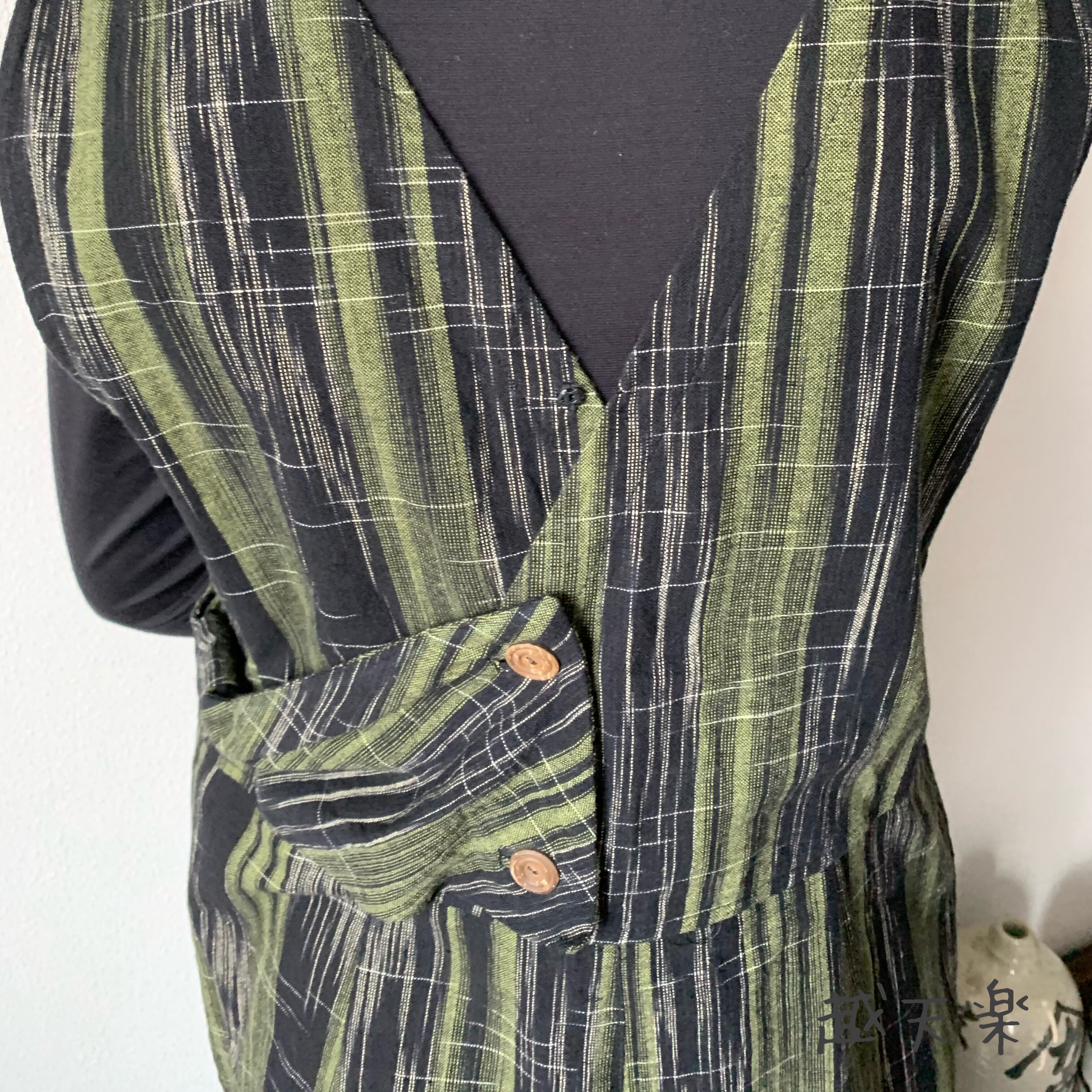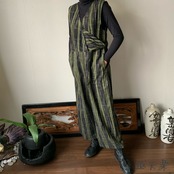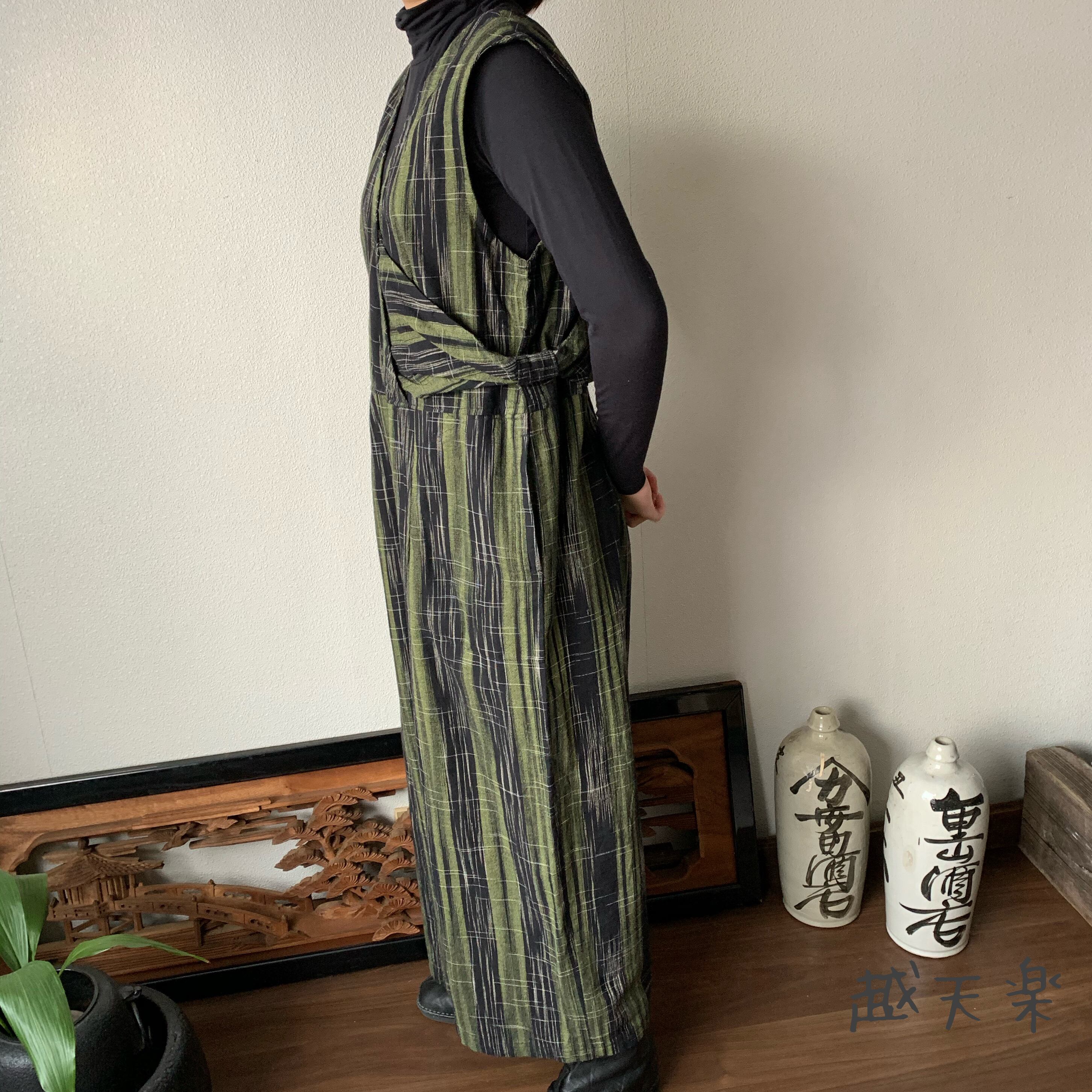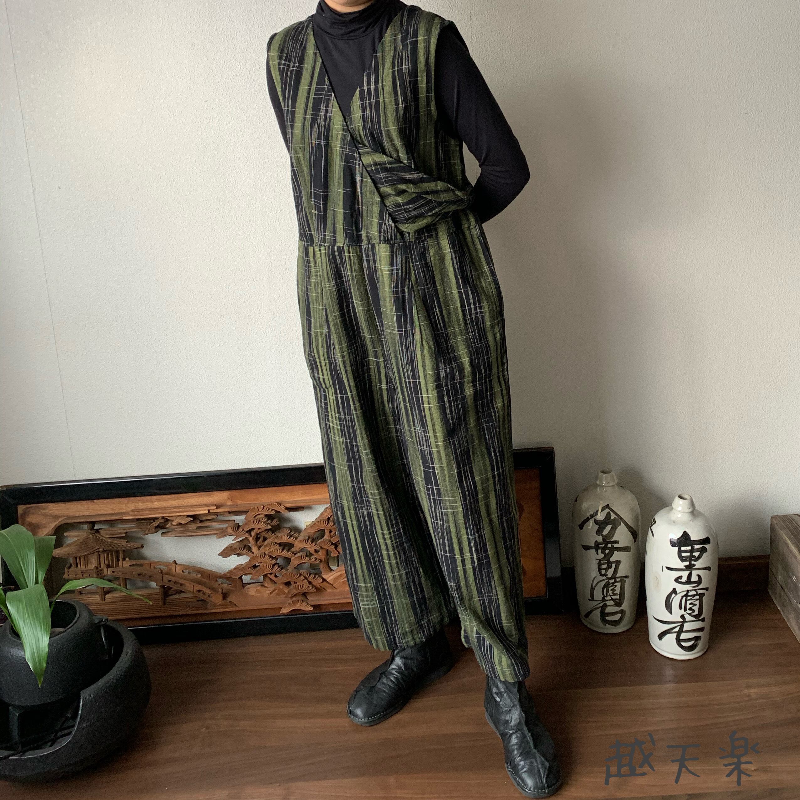 『ゆったり手織り綿サロペット ロング丈とサイドリボンですっきり、前と後のスナップボタンで脱ぎ着楽ちん』