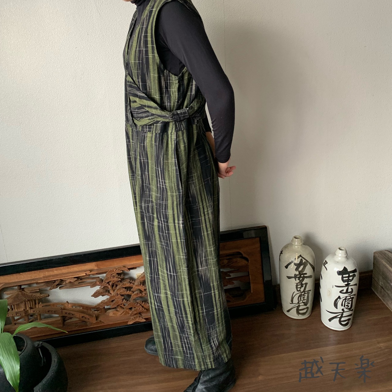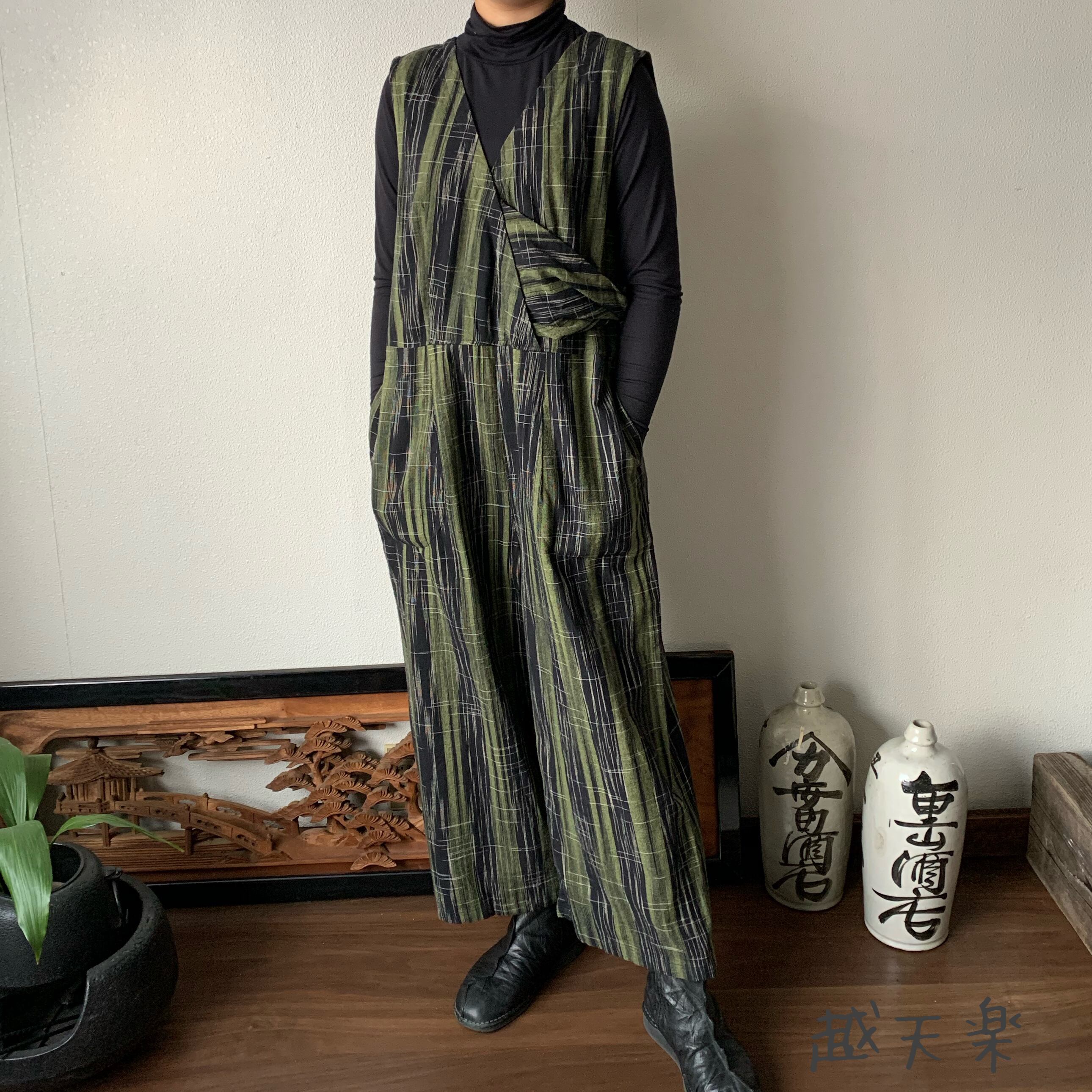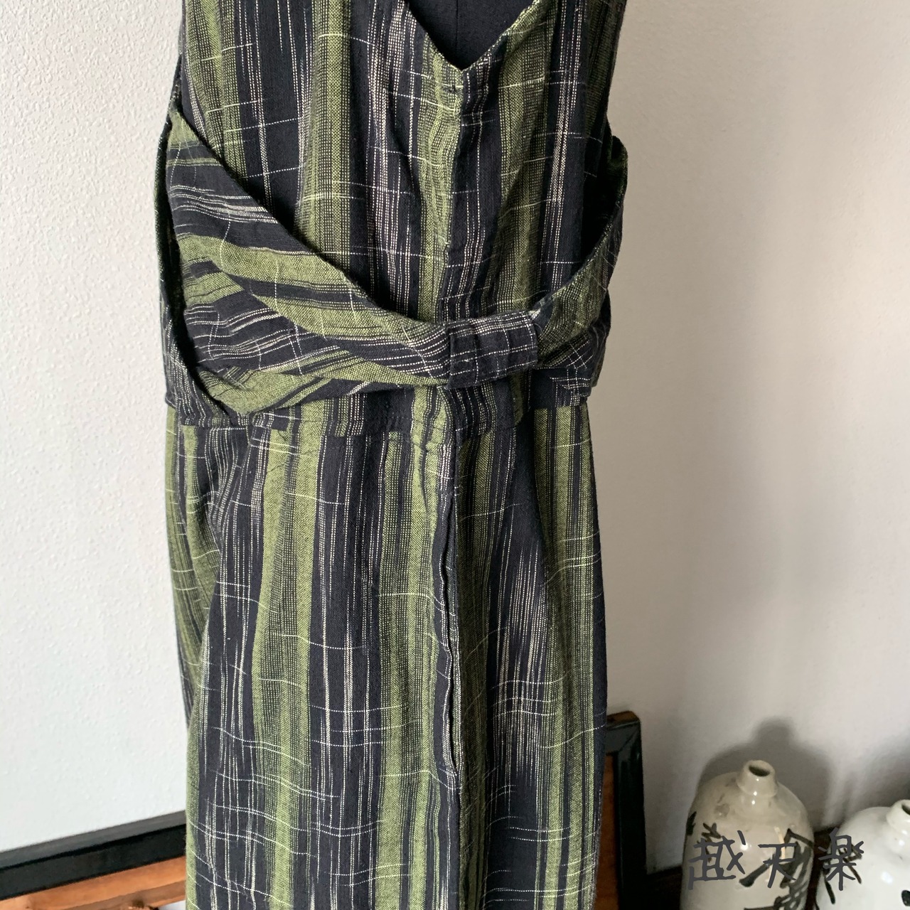 『ゆったり手織り綿サロペット ロング丈とサイドリボンですっきり、前と後のスナップボタンで脱ぎ着楽ちん』