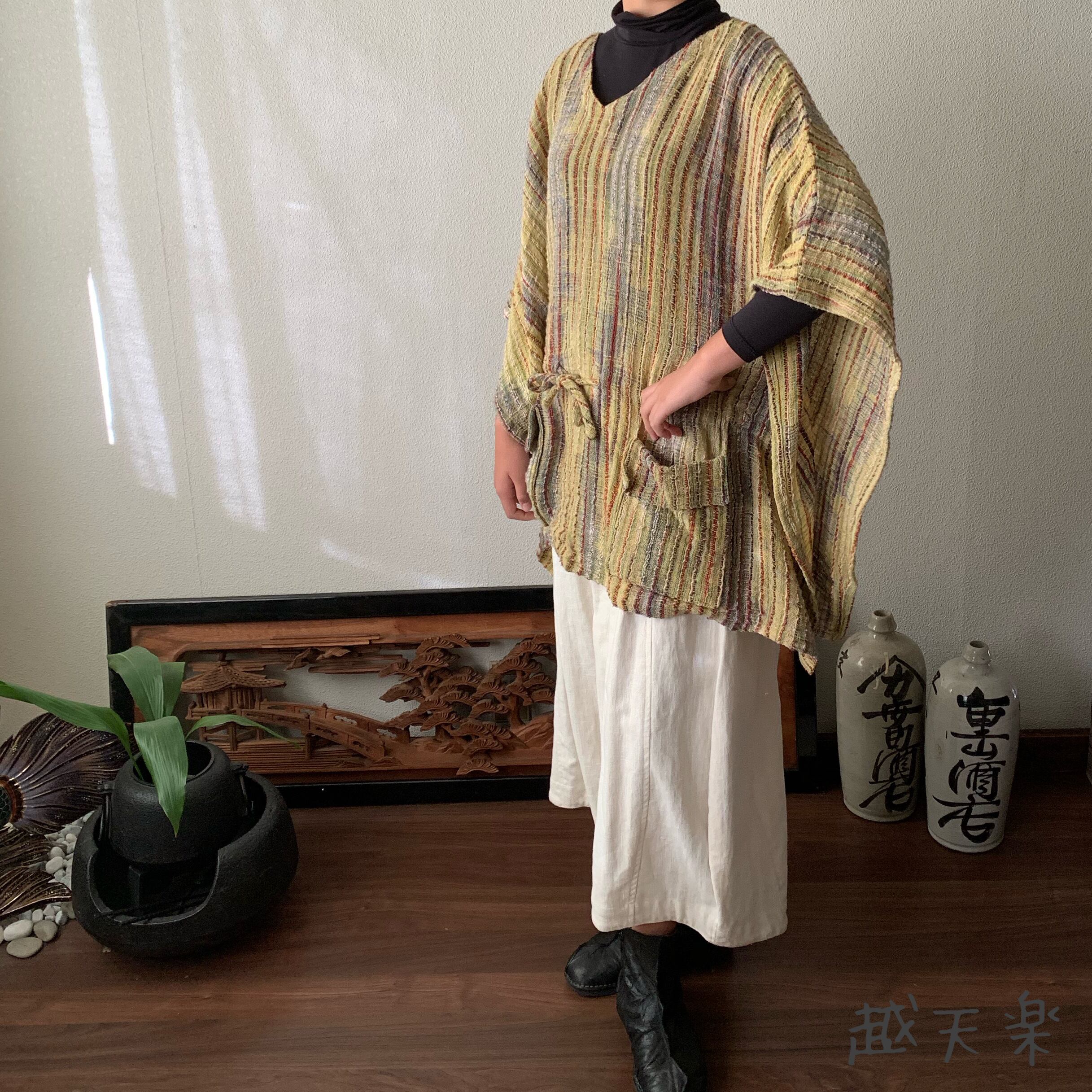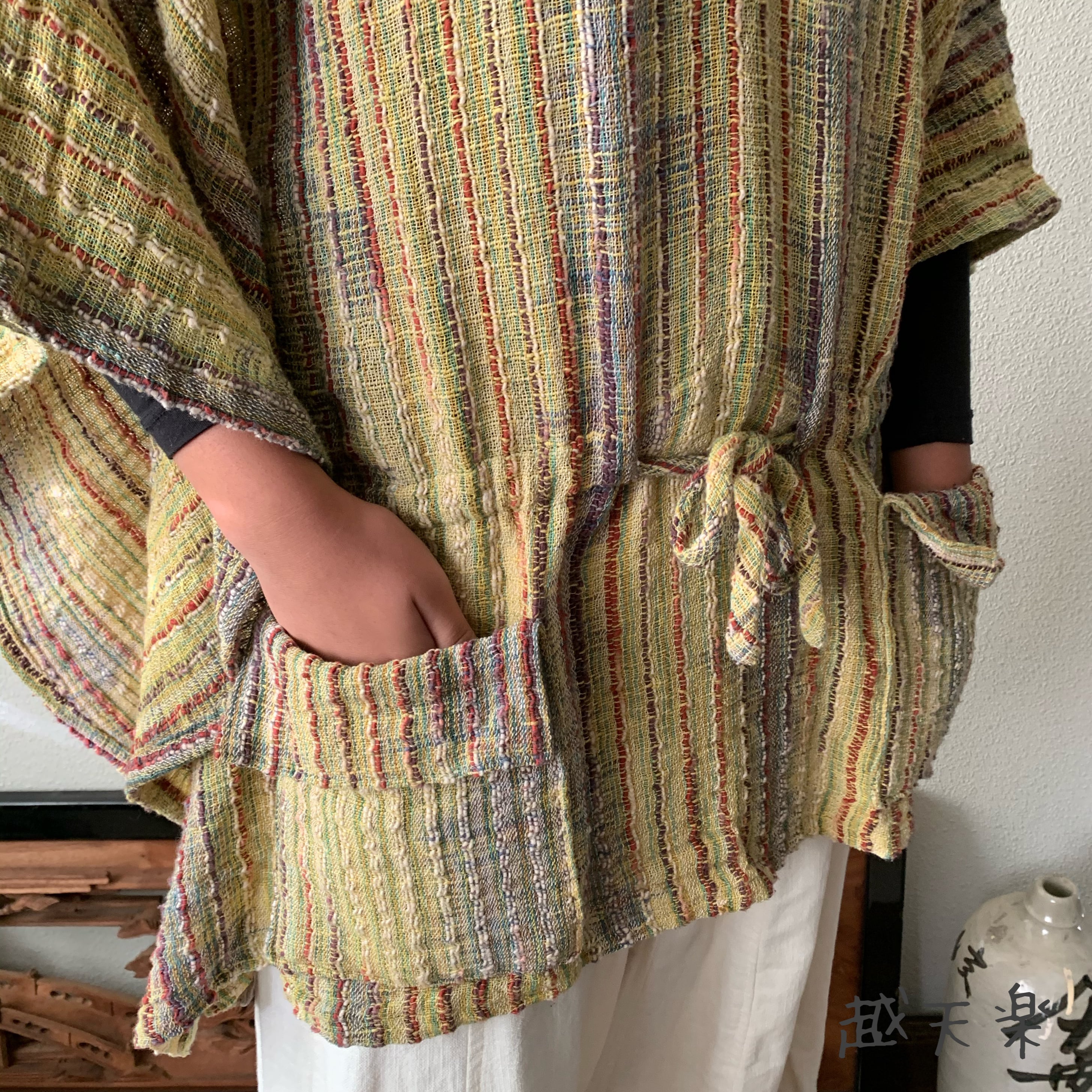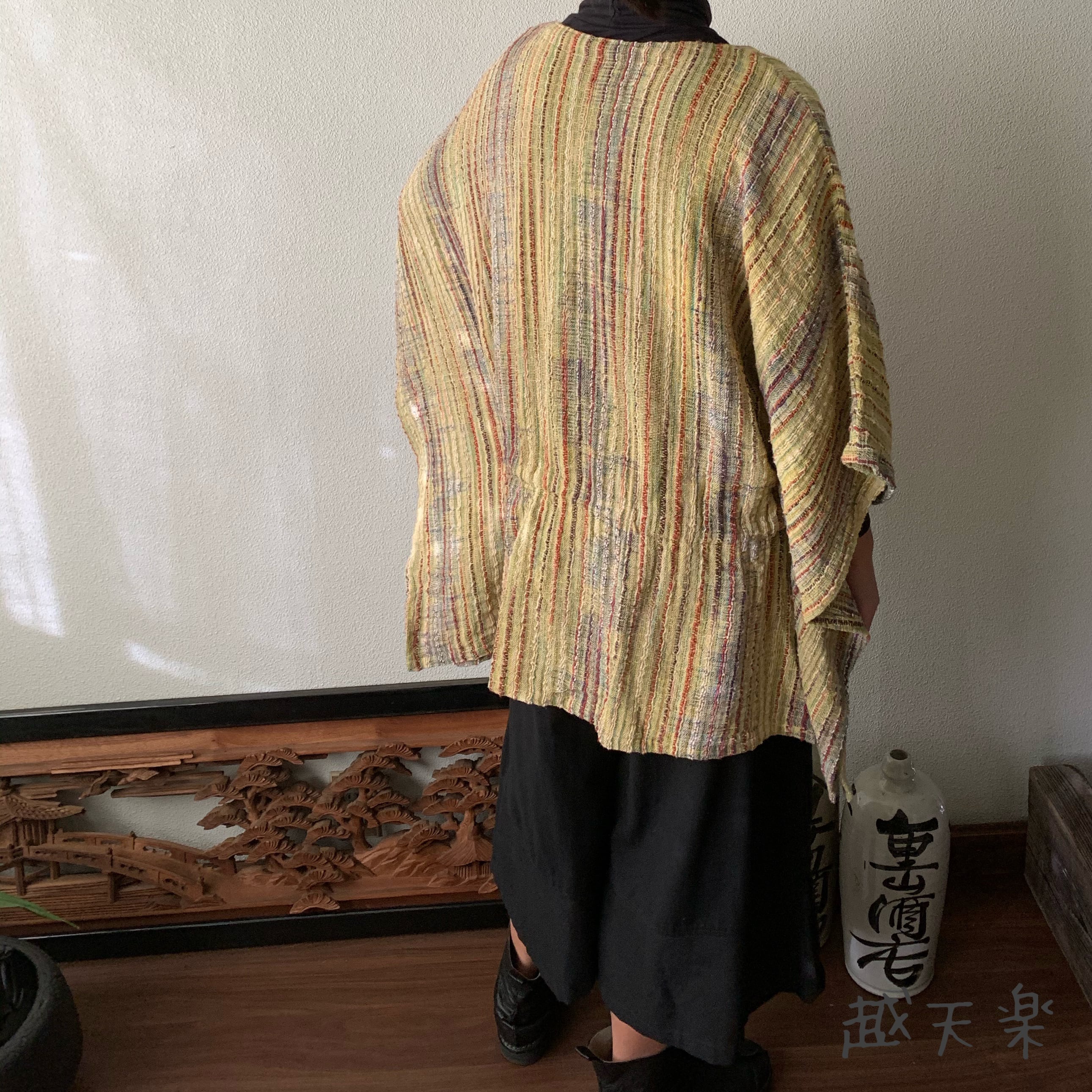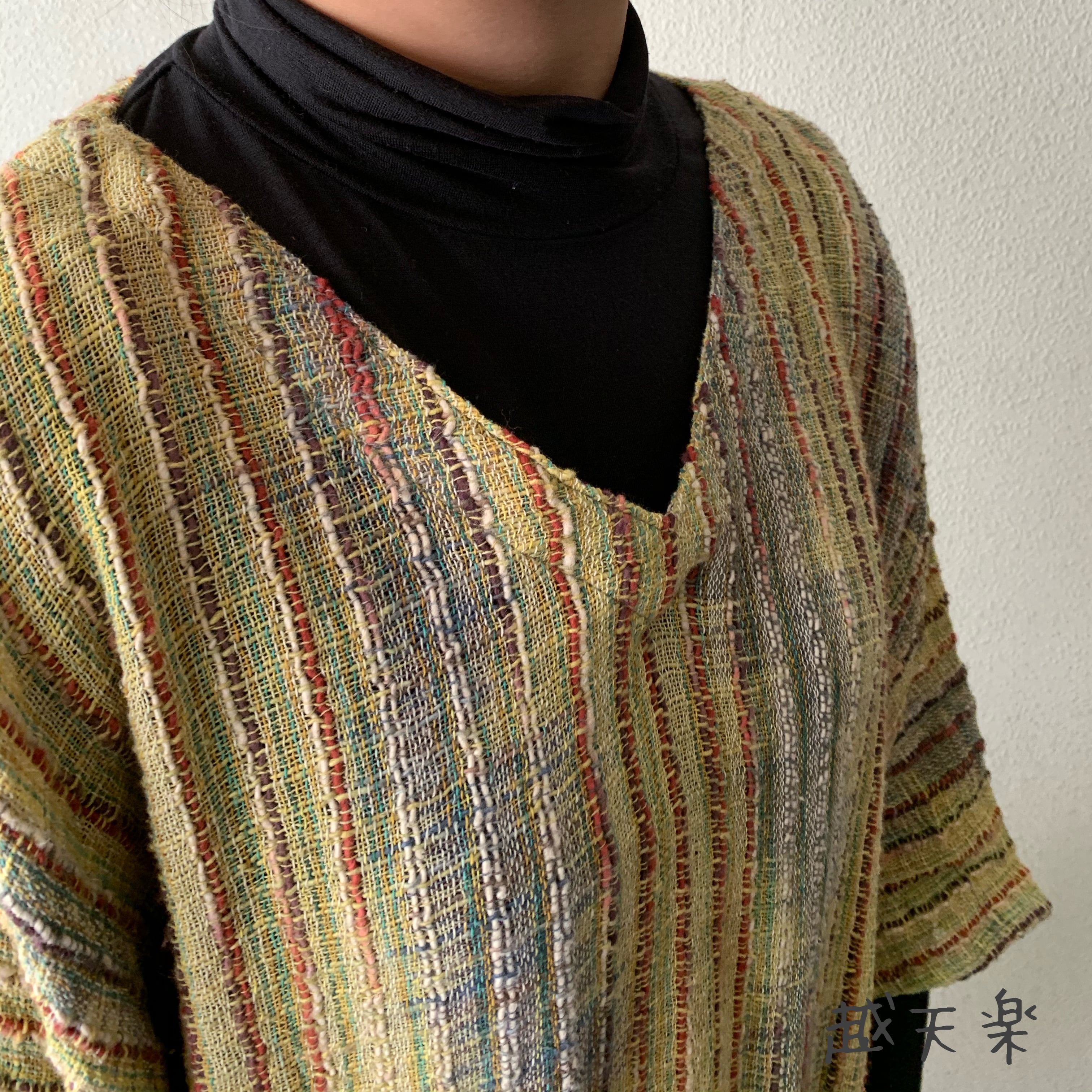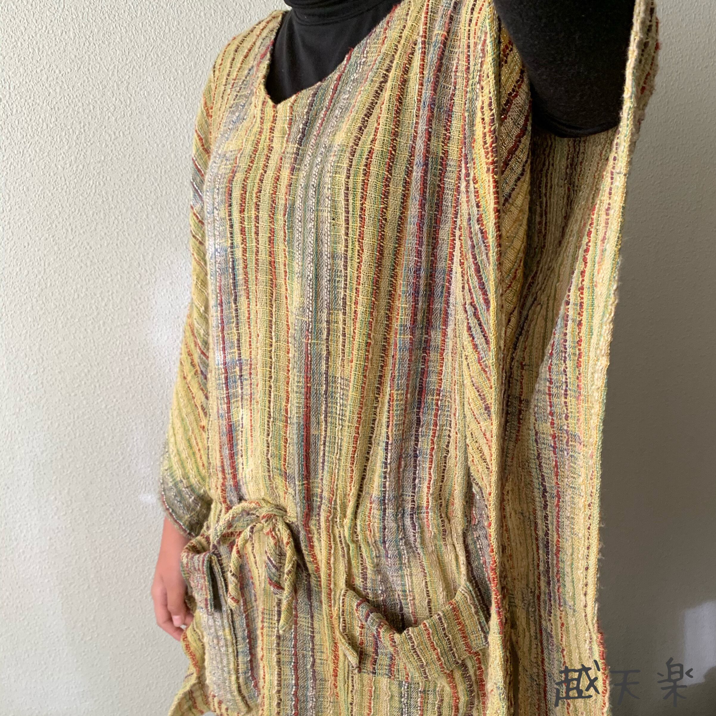 手織り綿の特性上、作品にはシボやネップ等(最後の写真右上部参照)が生地表面に現れる場合がございます。人の手を介して決して同じものが出来上がらない手織り綿の生地に、越天楽のデザインを吹き込んだ作品です。あらかじめご了解の上ご購入ください。なるべくいい状態でお届けいたしますが、気になる場合は細いかぎ針等で裏面から優しく引き抜いていただくと収まるものもあります。素朴で優しい風合いを楽しんでいただければ幸いです。
