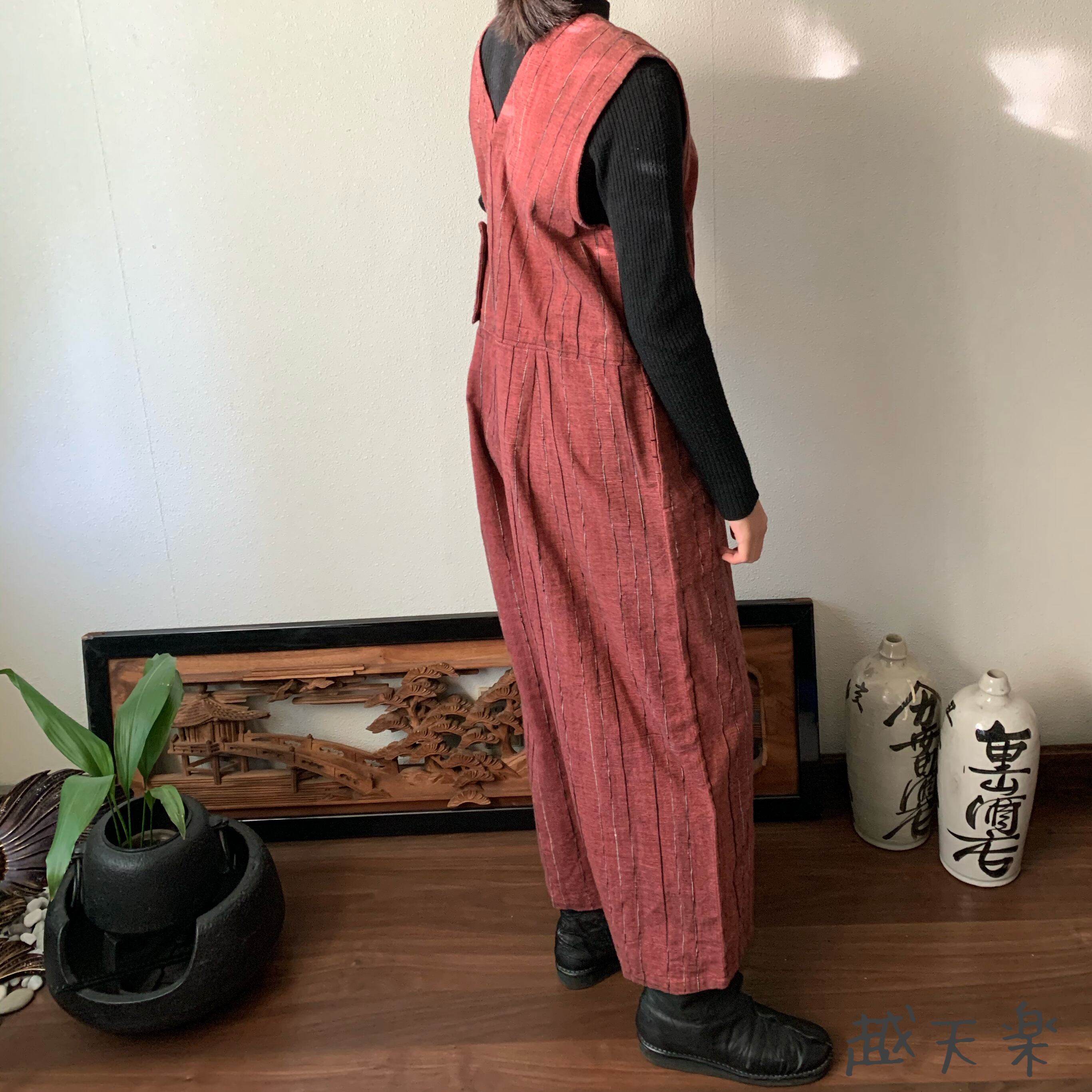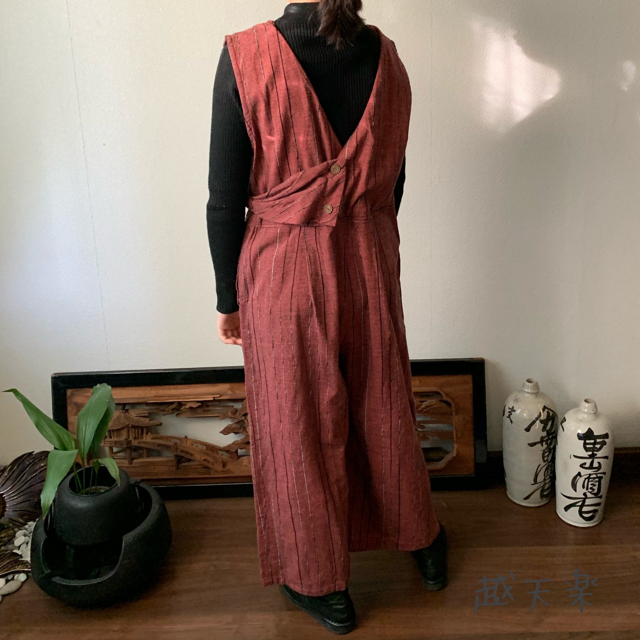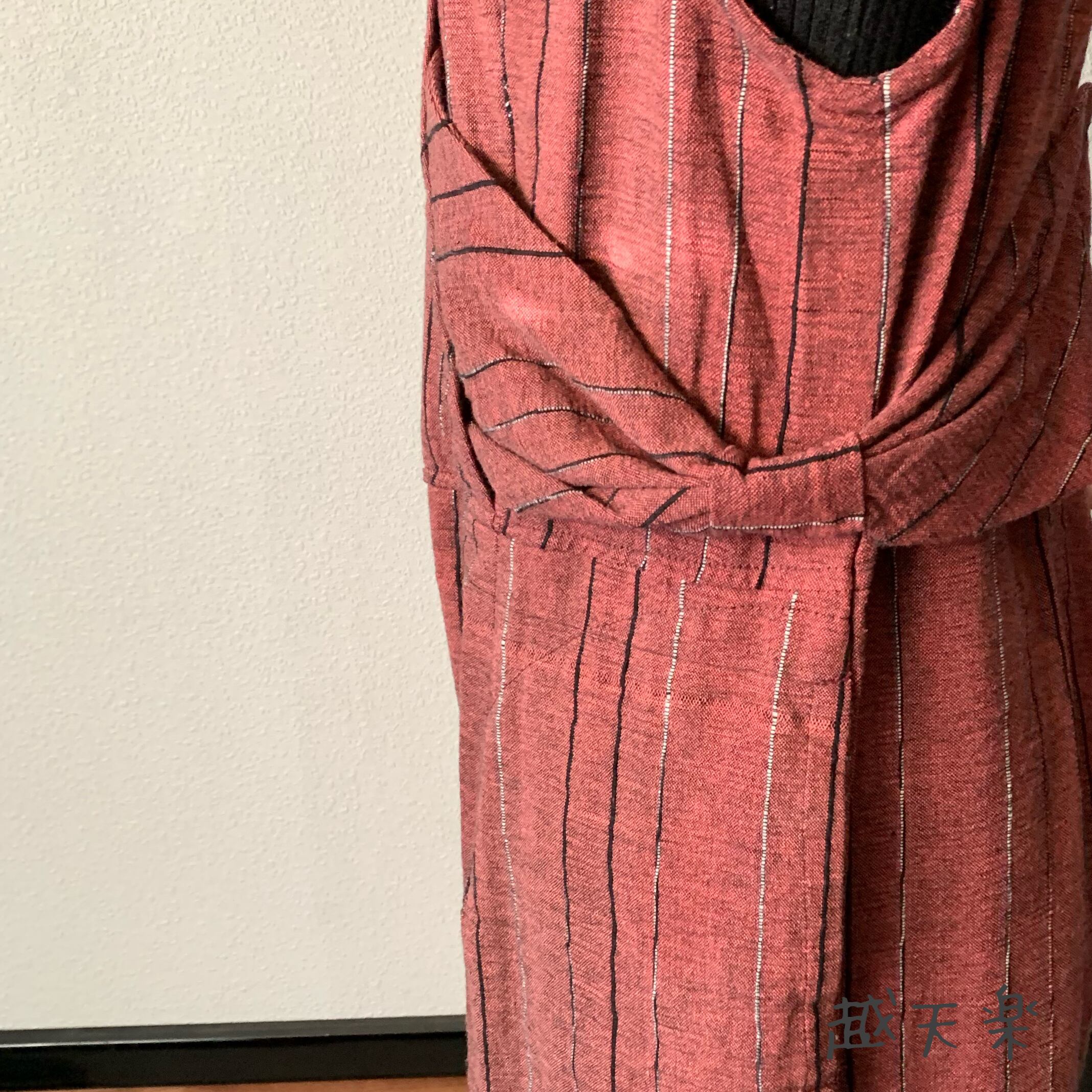 『ゆったり手織り綿サロペット ロング丈とサイドリボンですっきり、前と後のスナップボタンで脱ぎ着楽ちん』