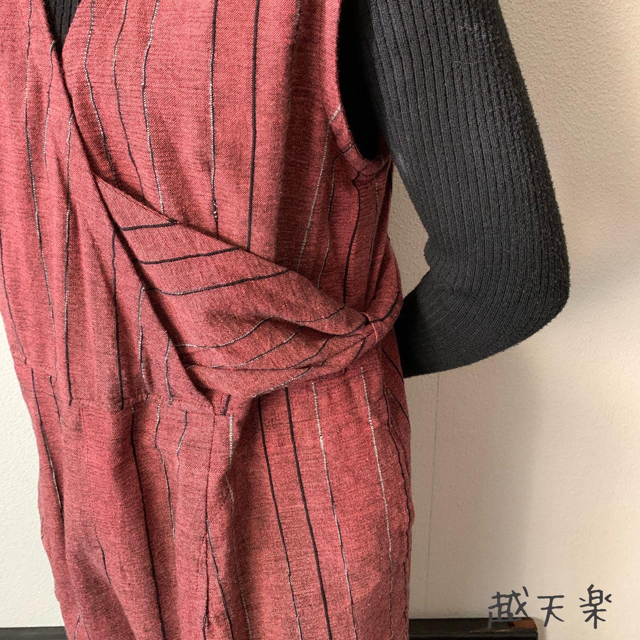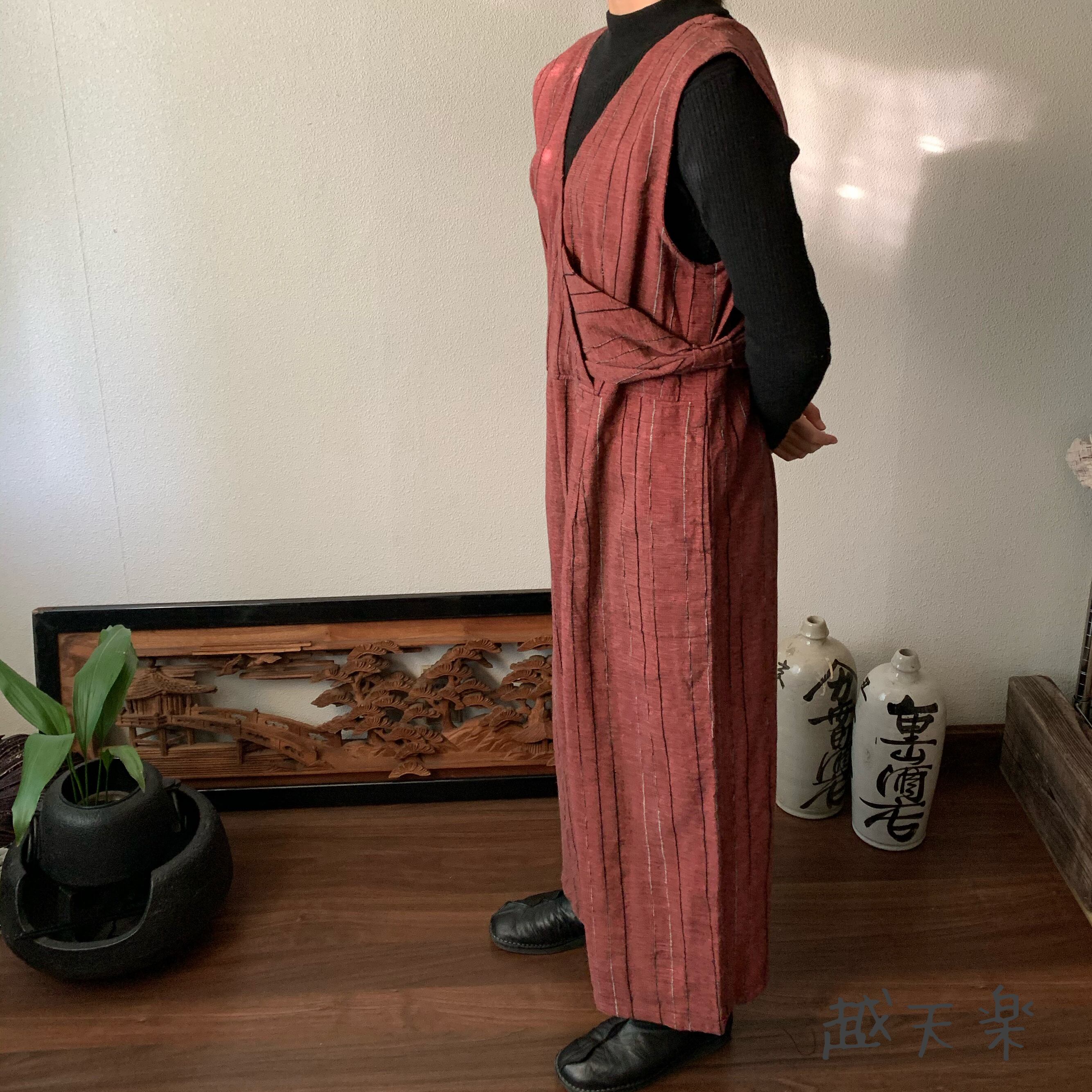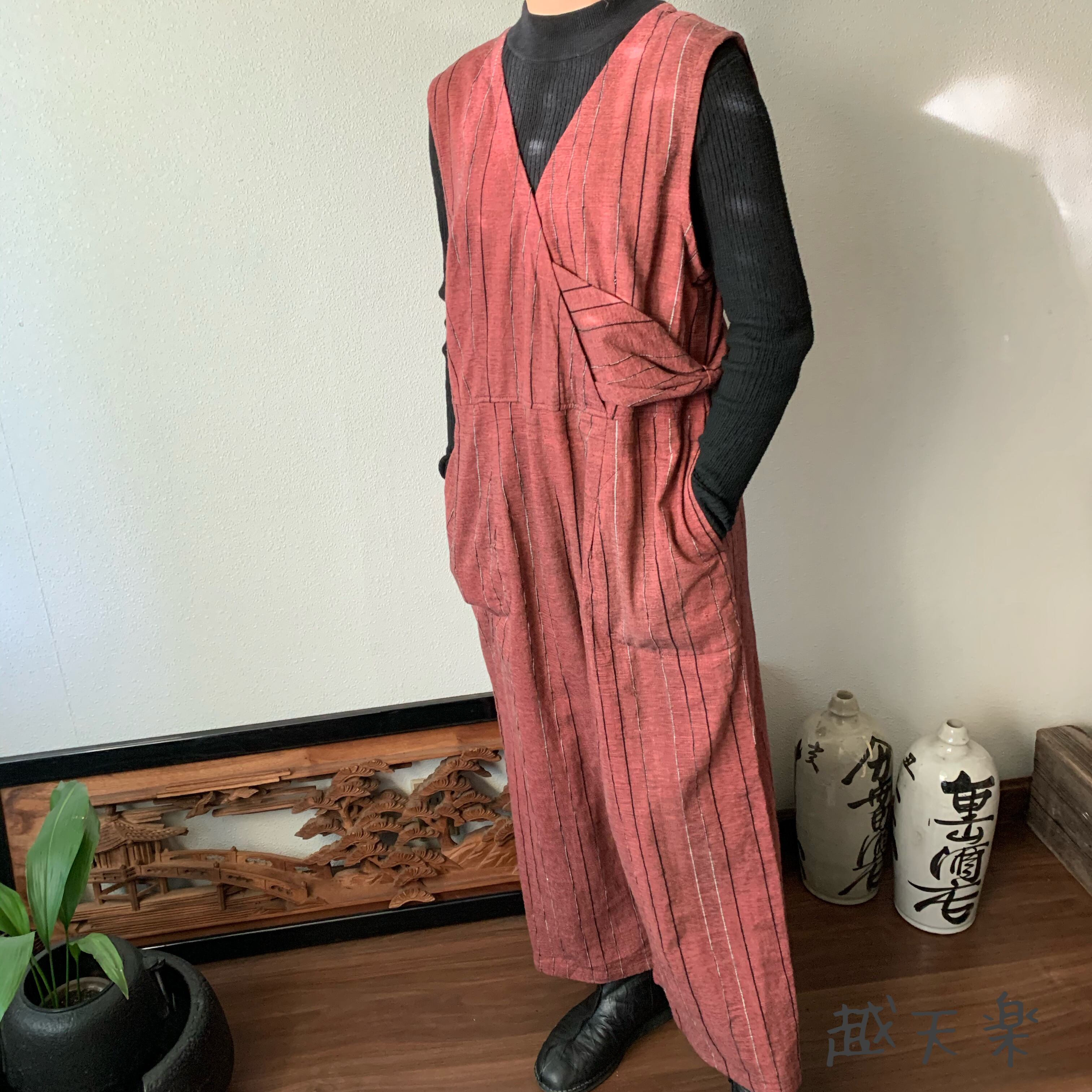 『ゆったり手織り綿サロペット ロング丈とサイドリボンですっきり、前と後のスナップボタンで脱ぎ着楽ちん』