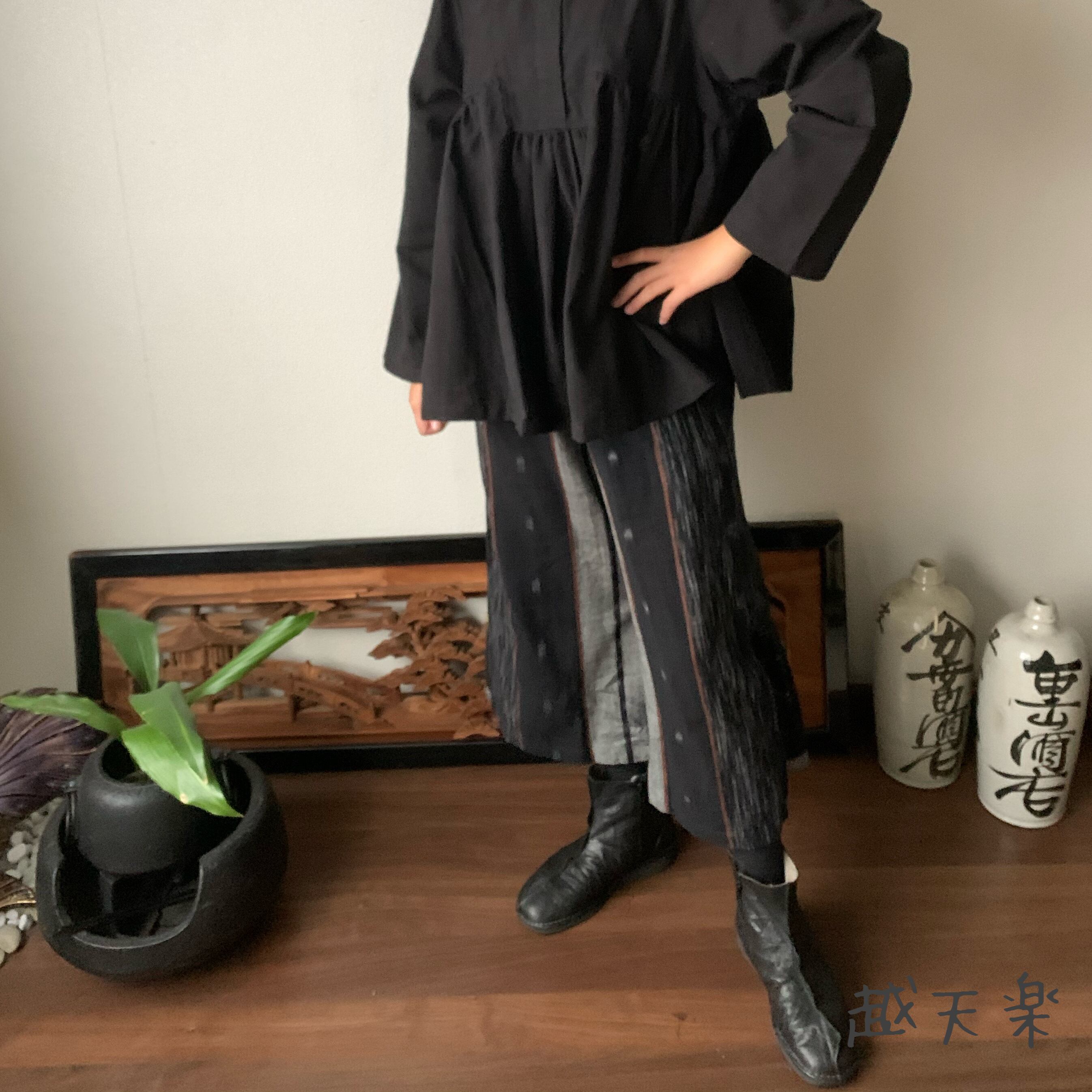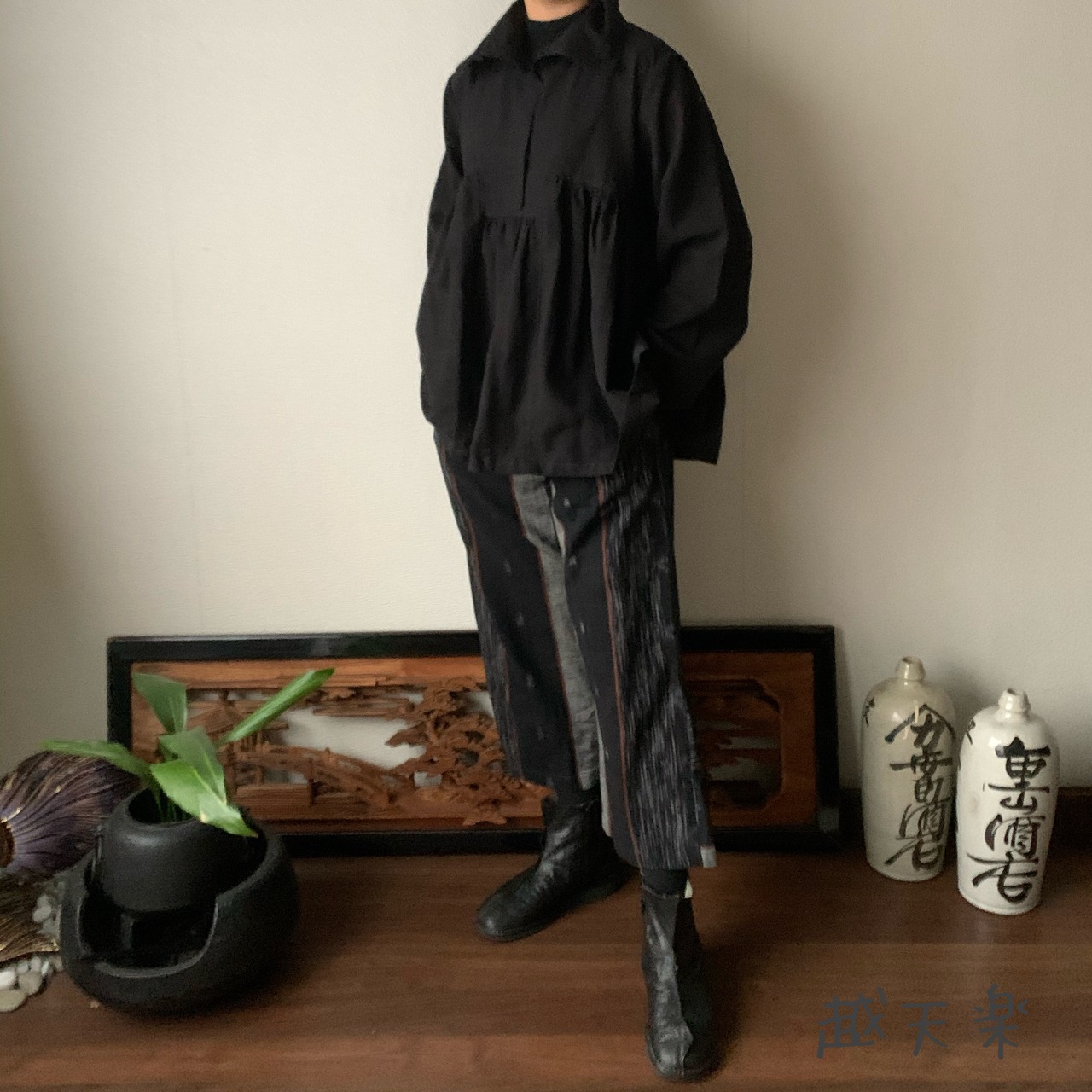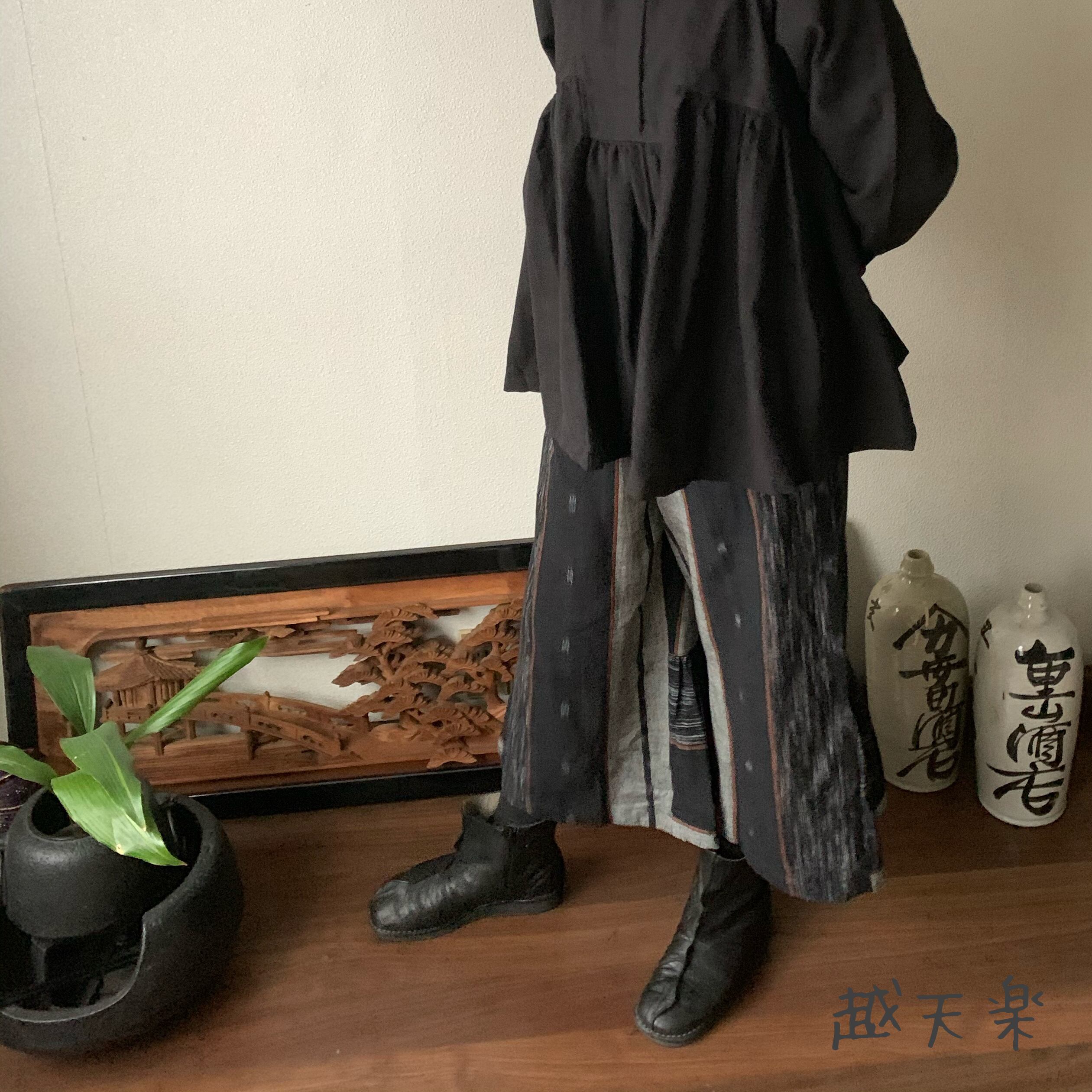 写真セットで着ている高めのスタンドカラー手織り綿ブラウスはこちら↓