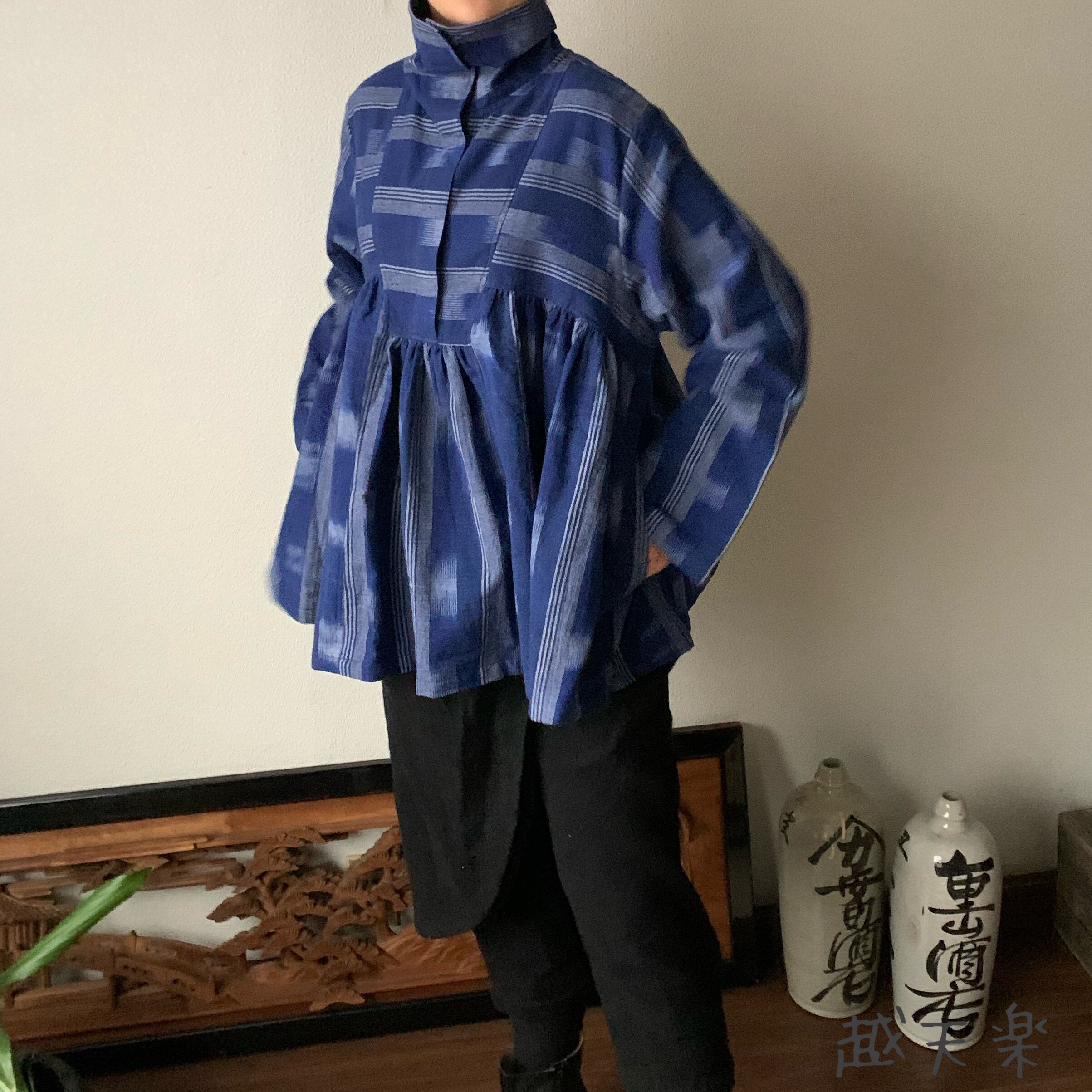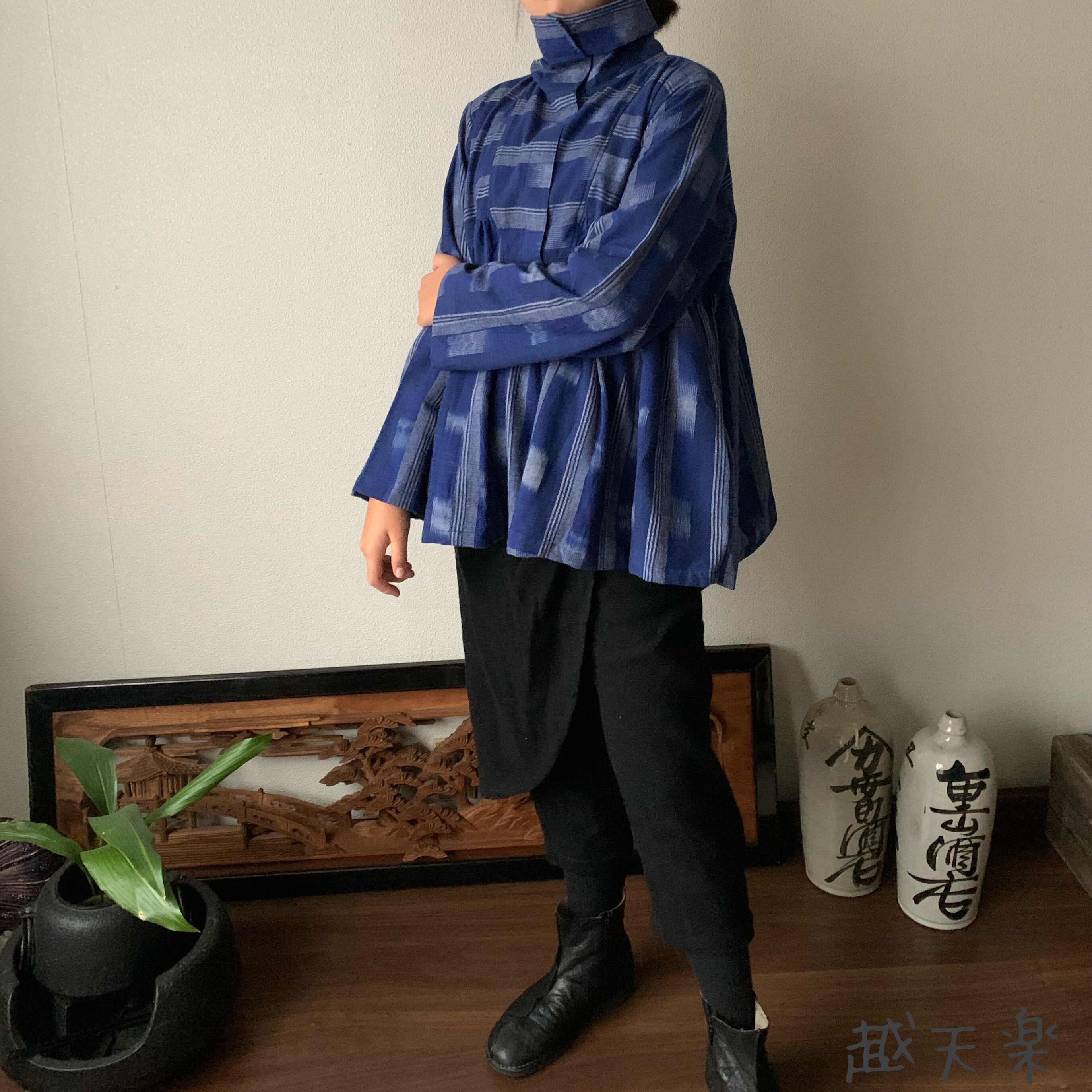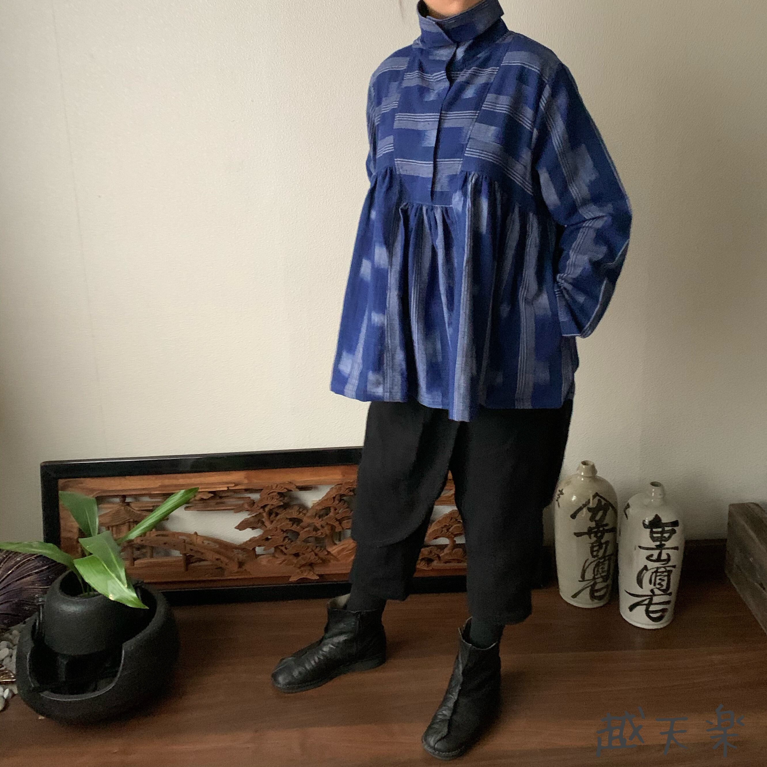『高めのスタンドカラー手織り綿ブラウス バストラインギャザーで動きが楽しい手を入れやすい切れ込み両サイドポケットです』