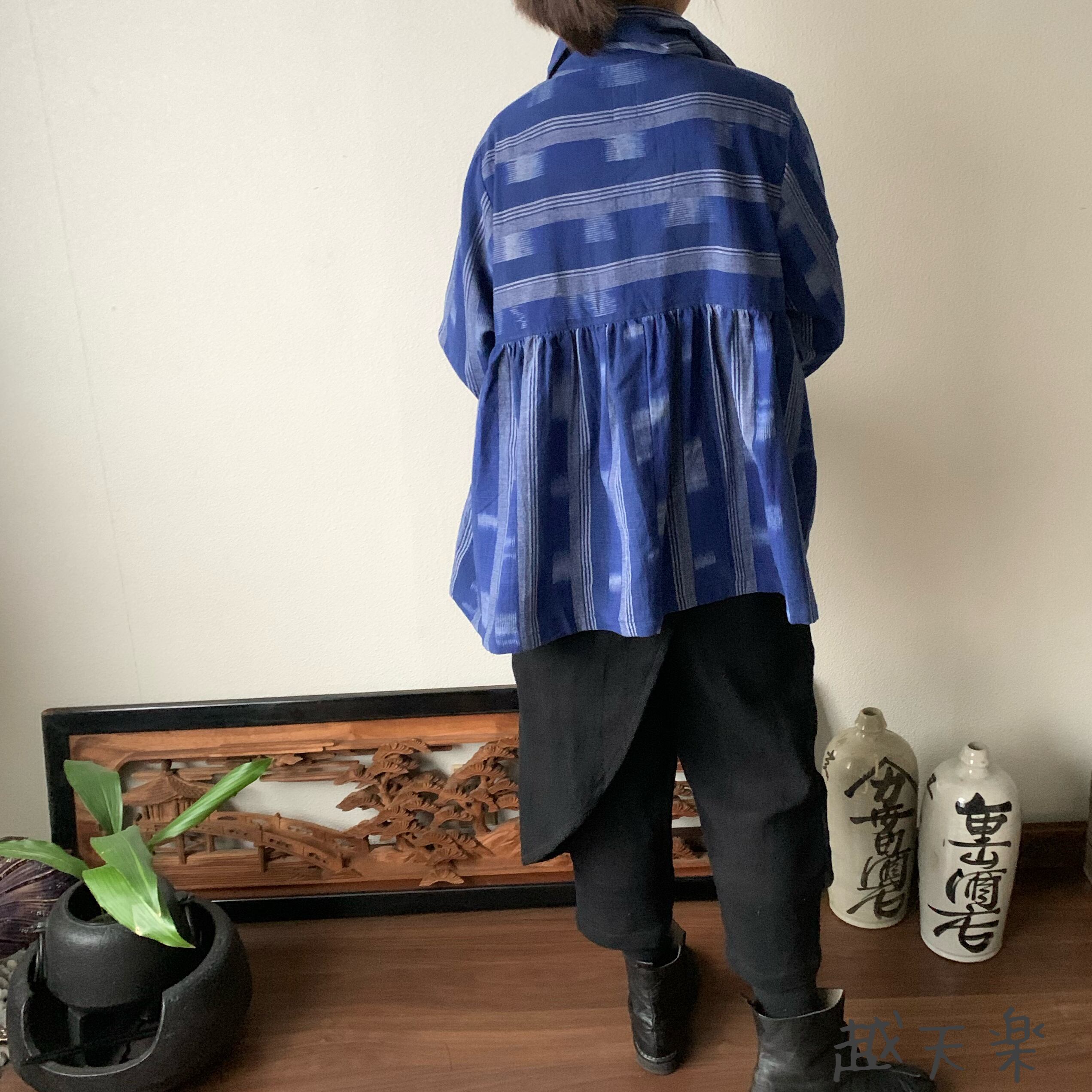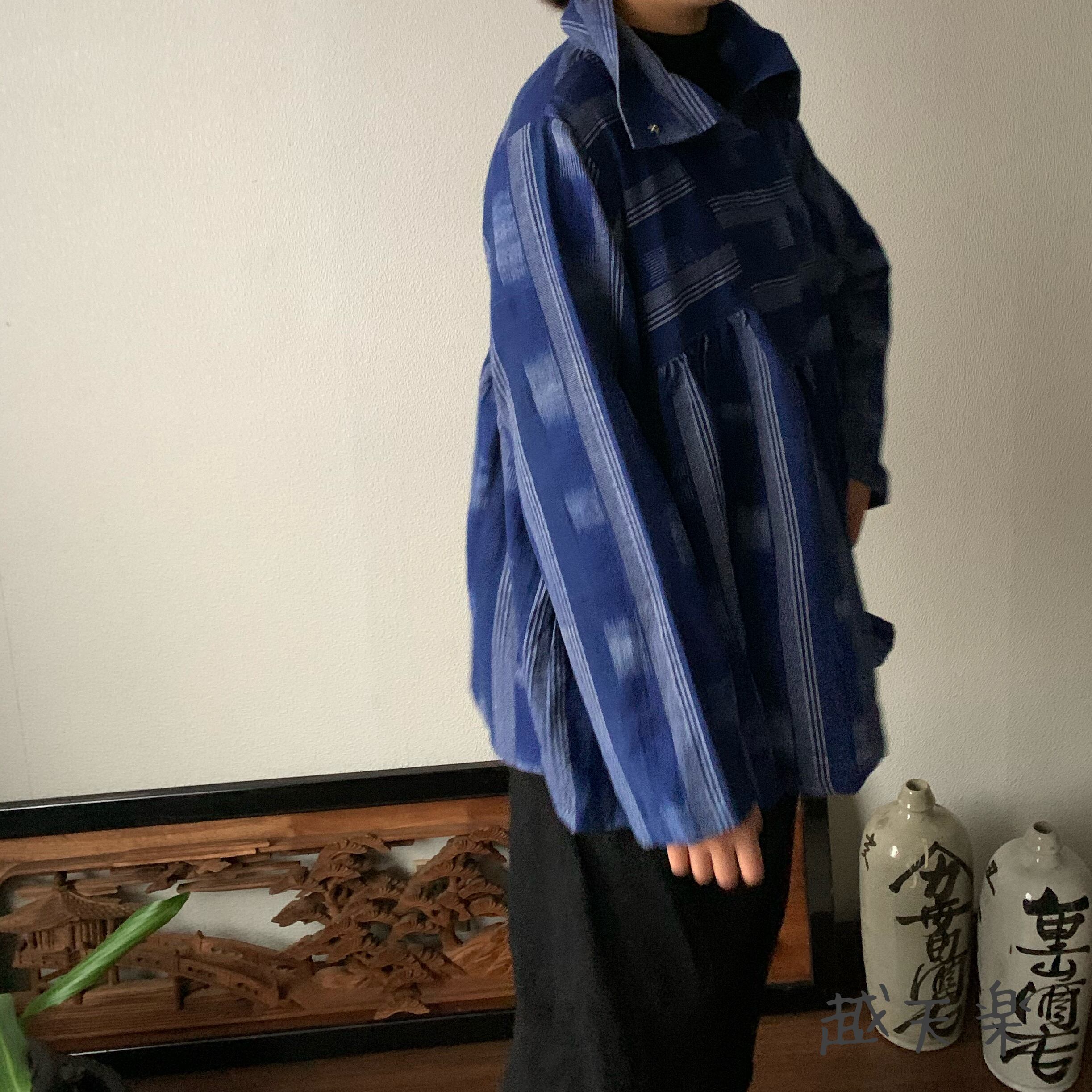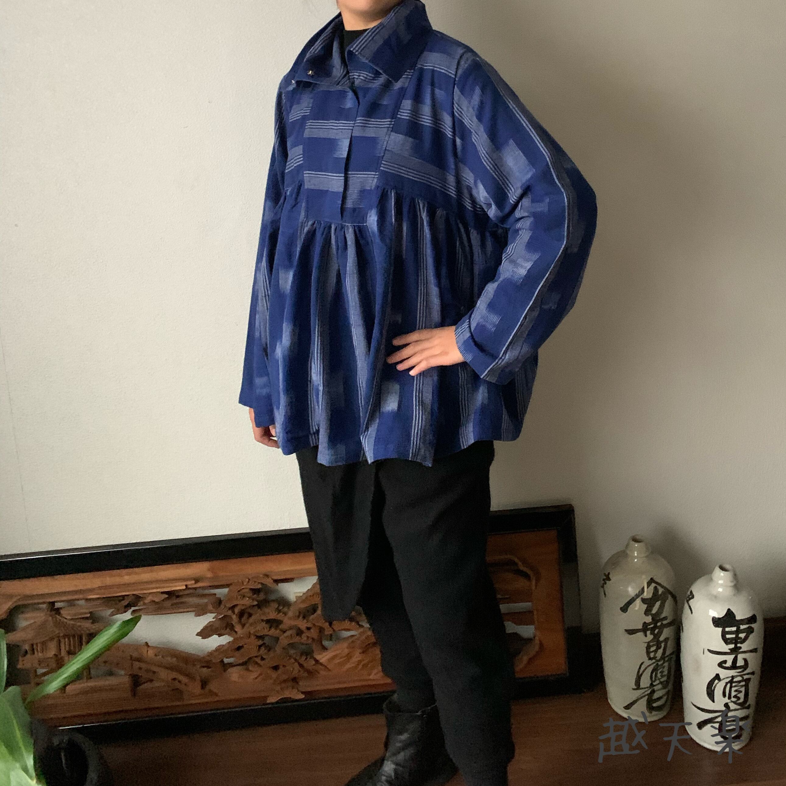 『高めのスタンドカラー手織り綿ブラウス バストラインギャザーで動きが楽しい手を入れやすい切れ込み両サイドポケットです』