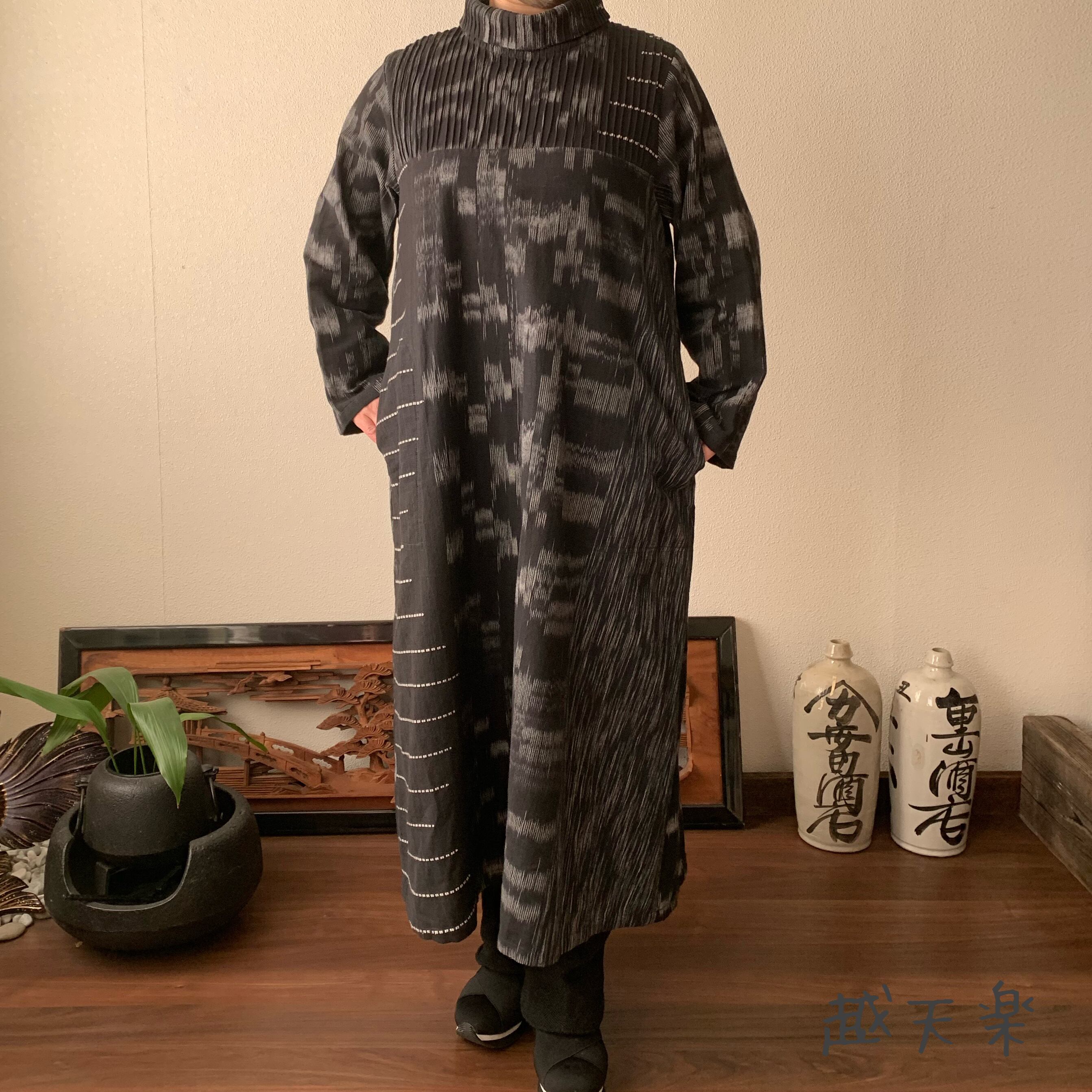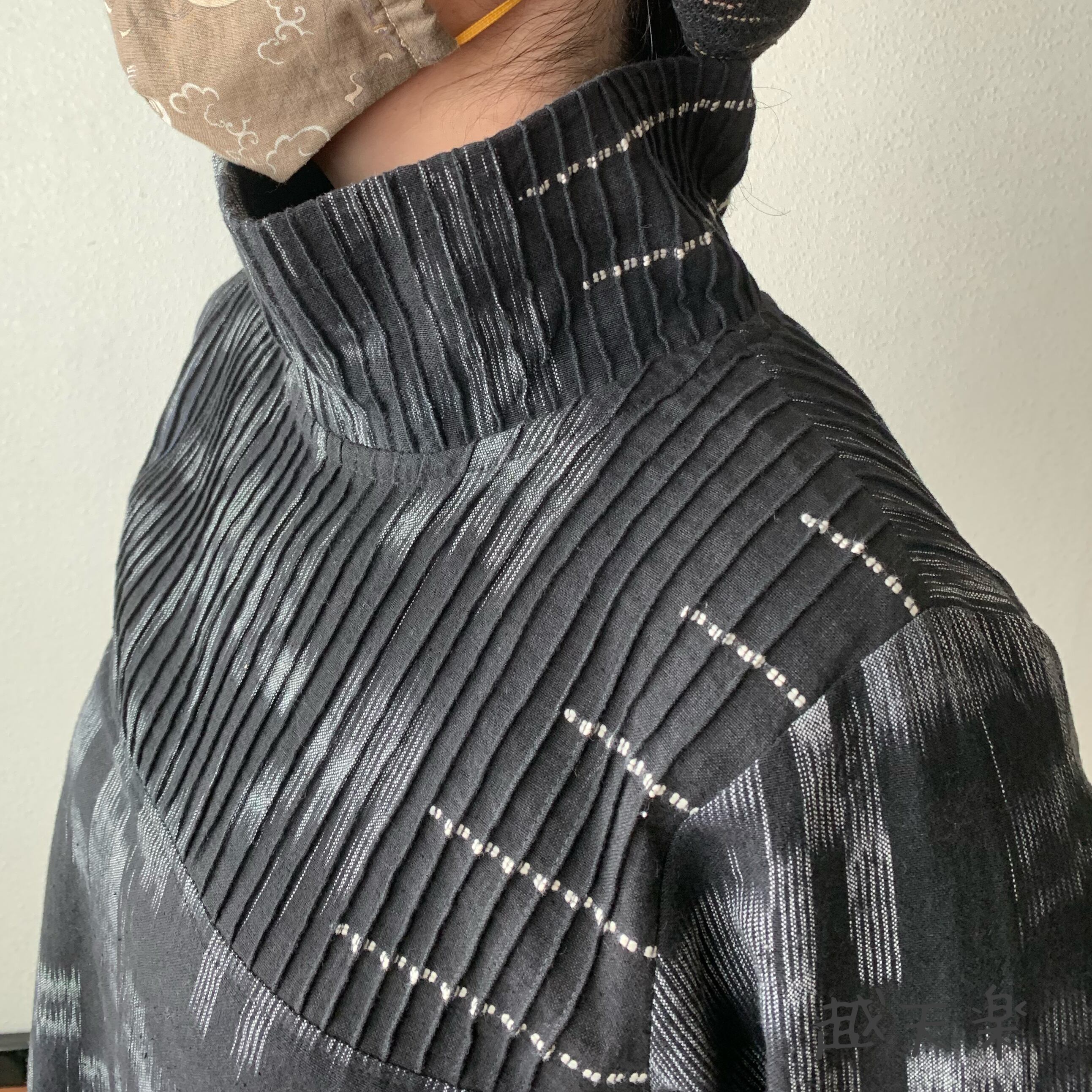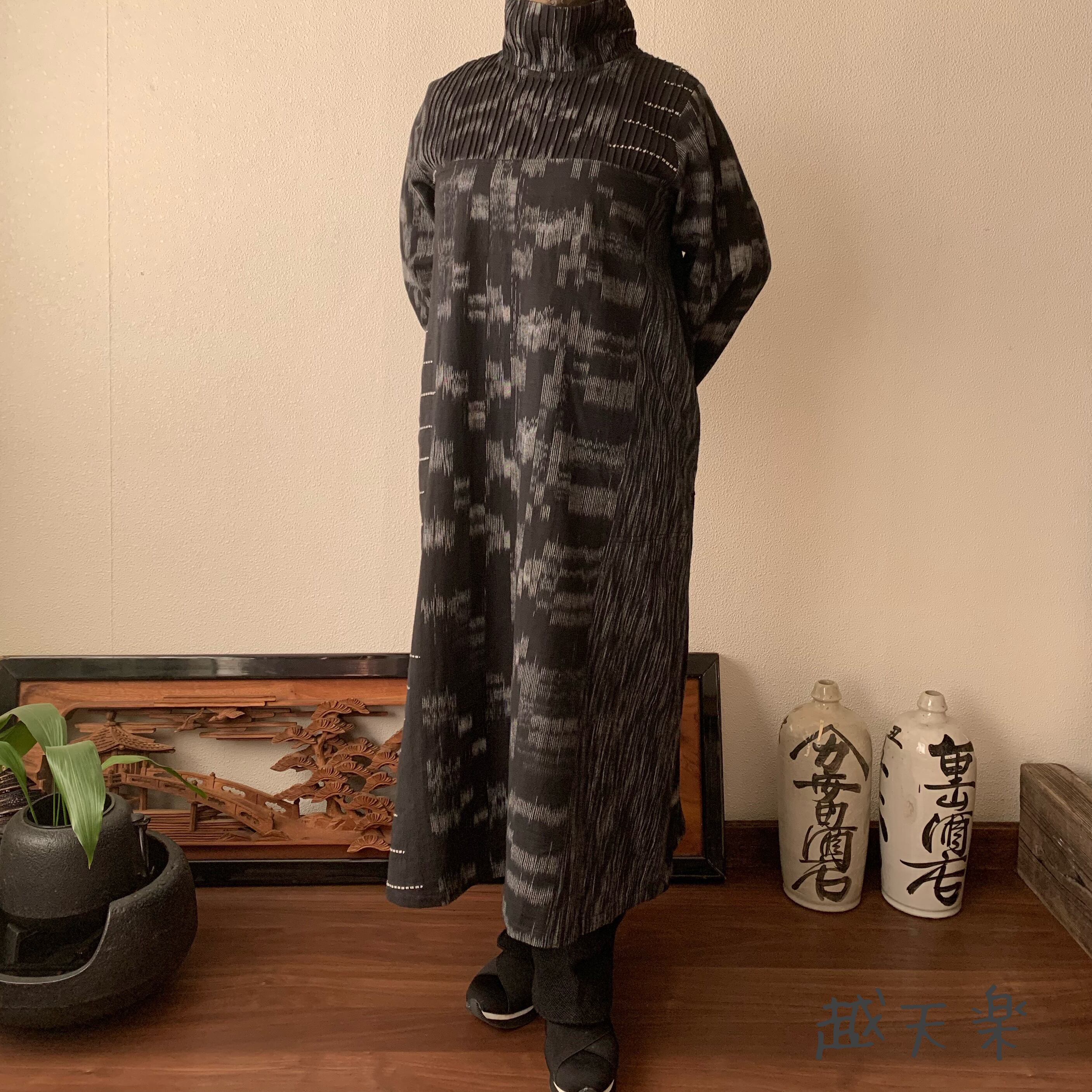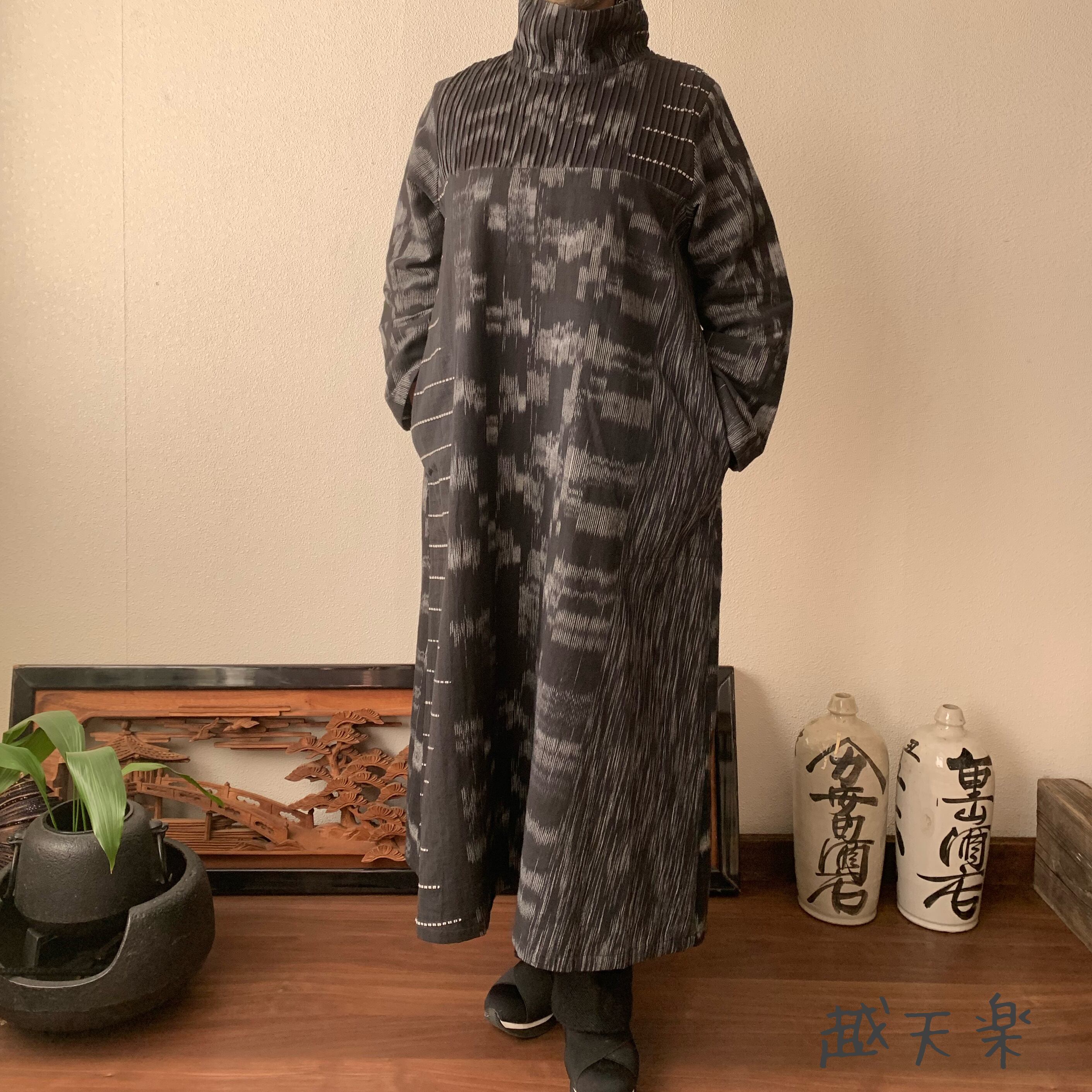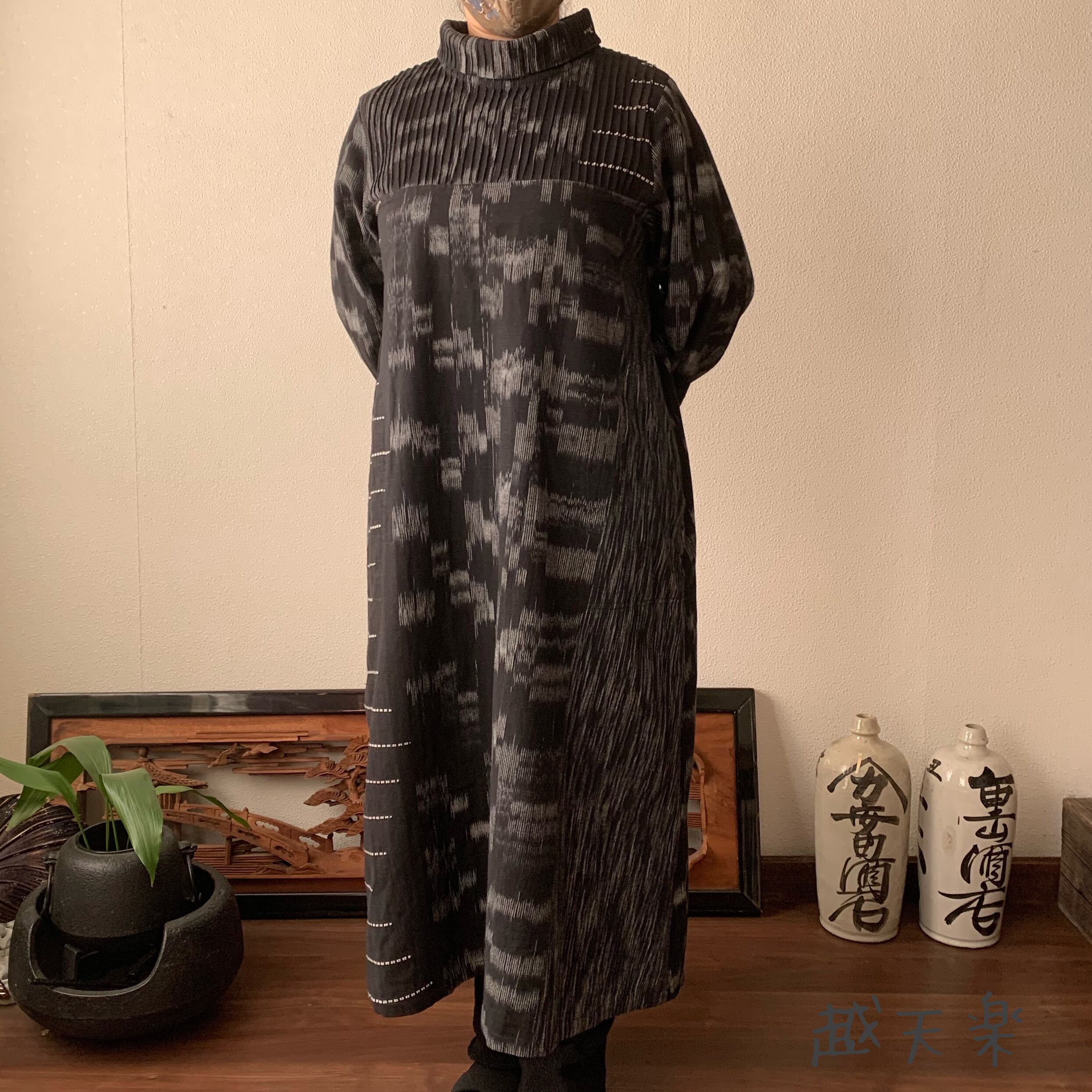 ハイネック、上半身総ピンタック手織り綿長袖ワンピース 高め襟と後ろ上下に走るボタンですっきり着こなし 黒グレイ絣