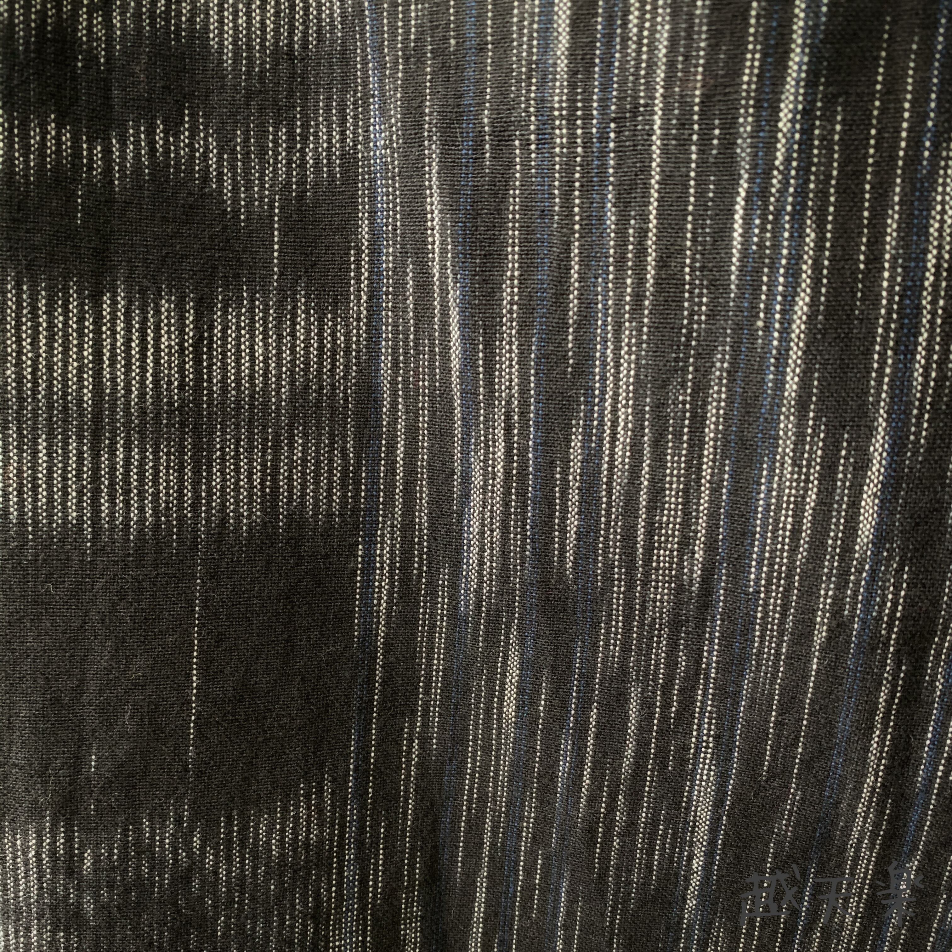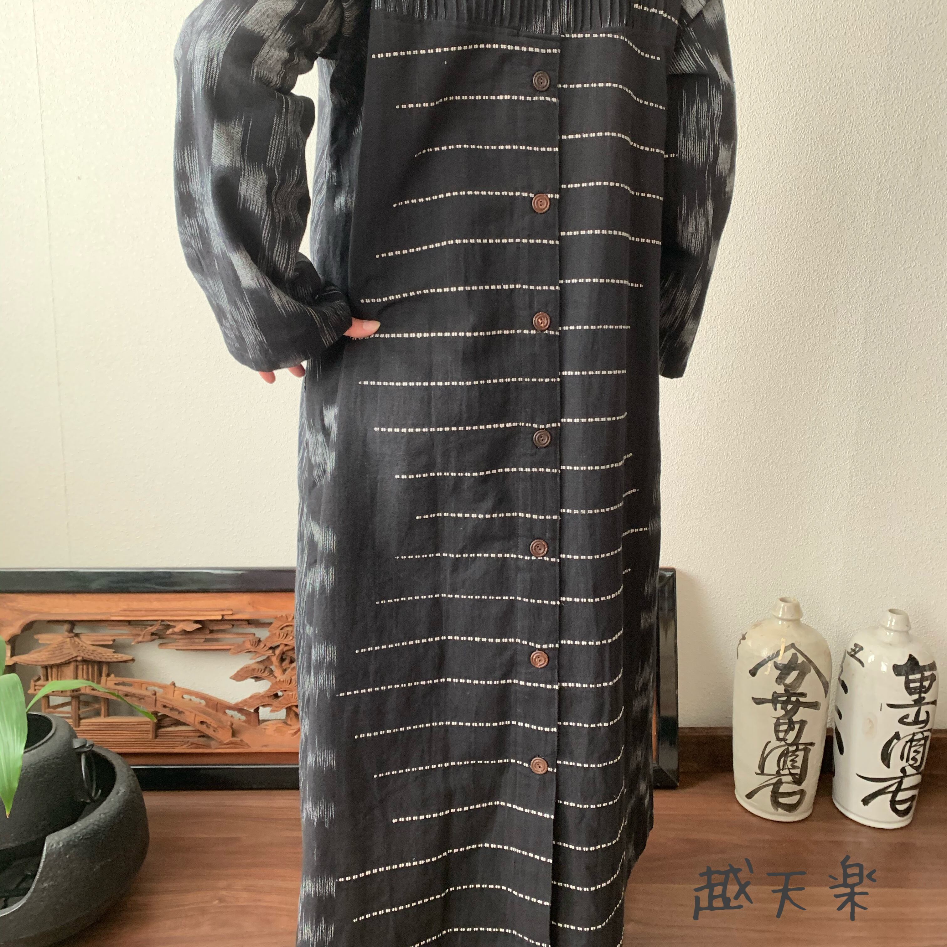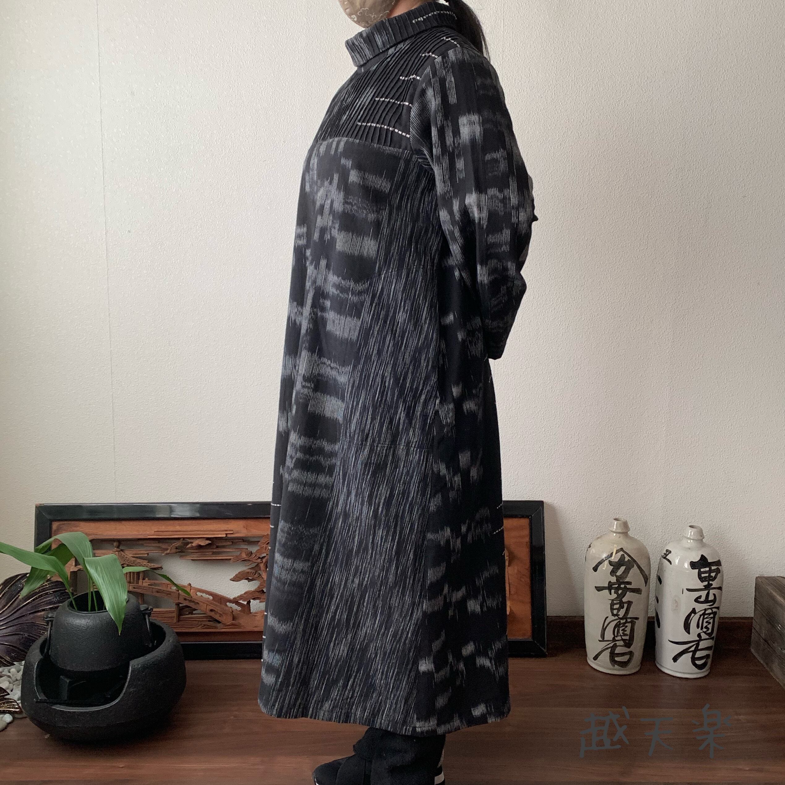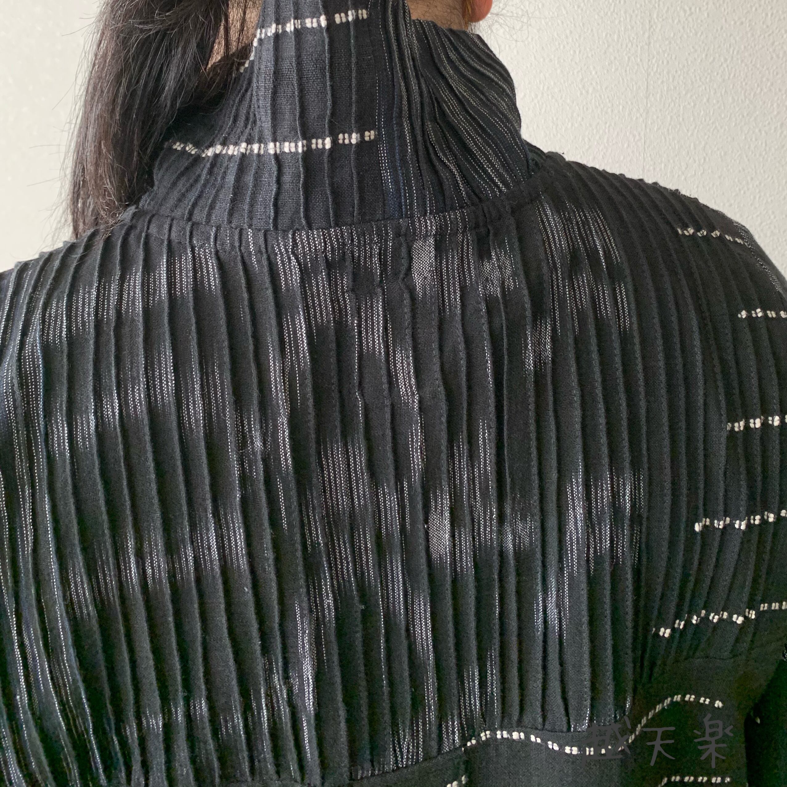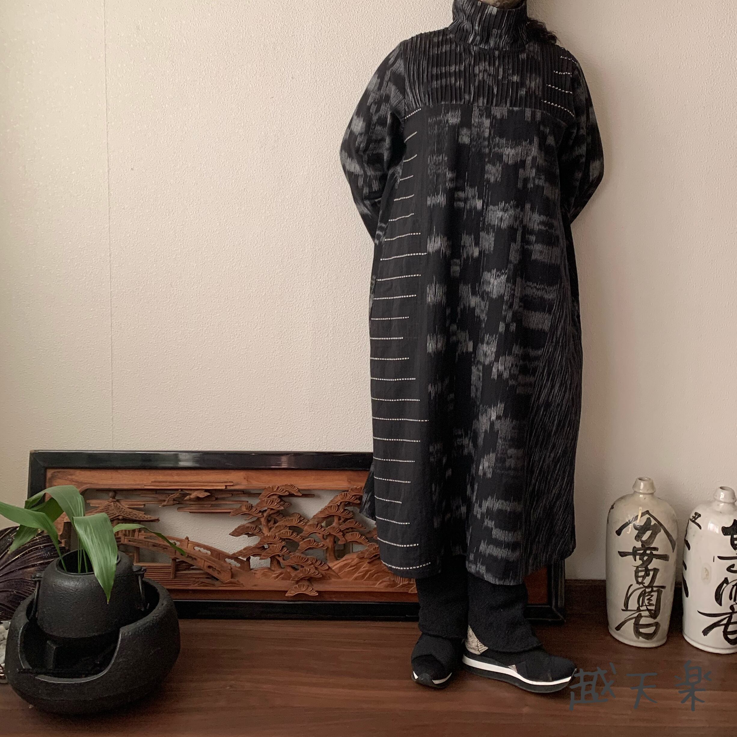 ハイネック、上半身総ピンタック手織り綿長袖ワンピース 高め襟と後ろ上下に走るボタンですっきり着こなし 黒グレイ絣