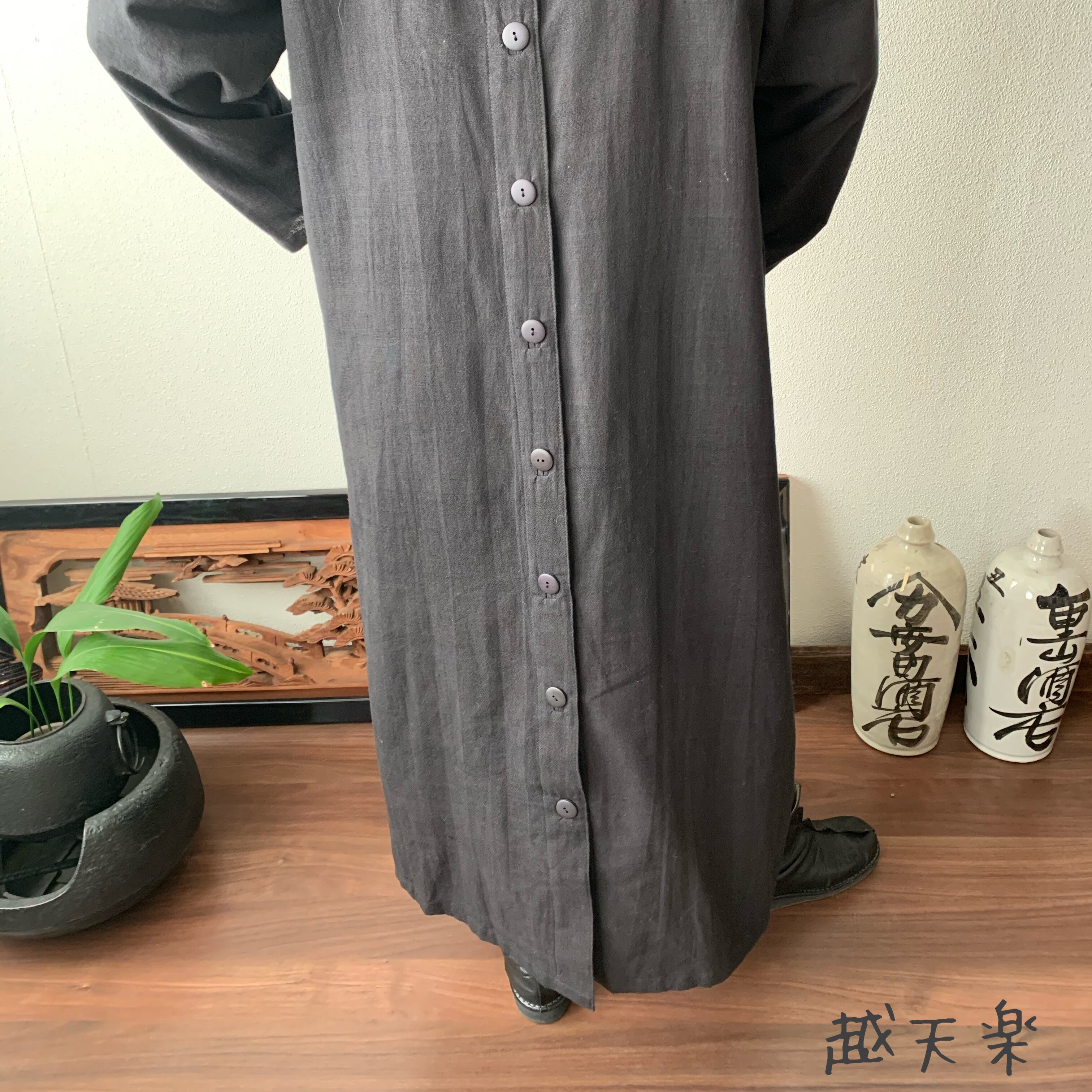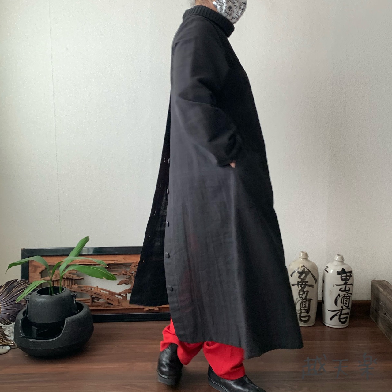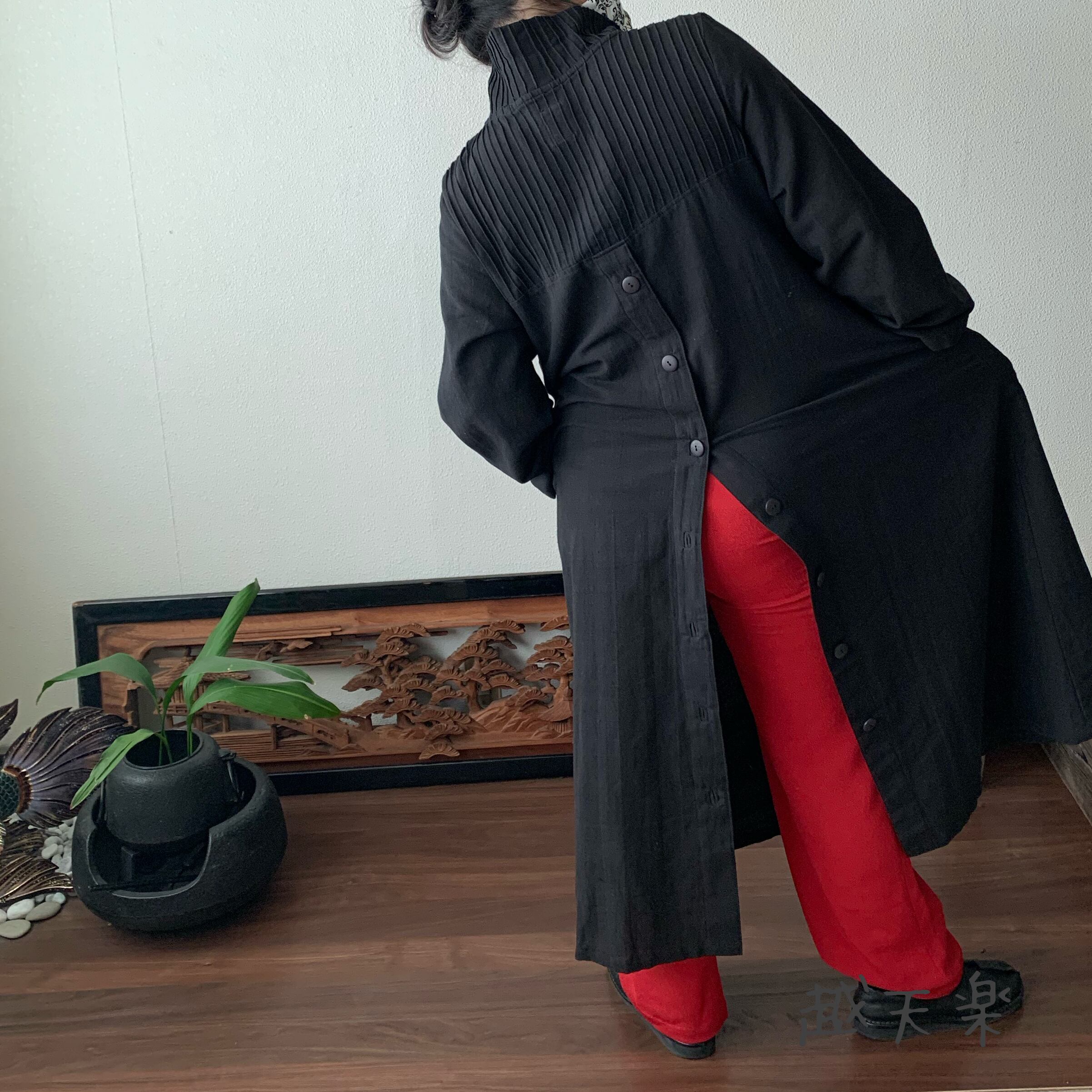 後ろ部分も越天楽得意の上下に走る飾りボタンをつけよりかっこよく着こなせるようにしています。