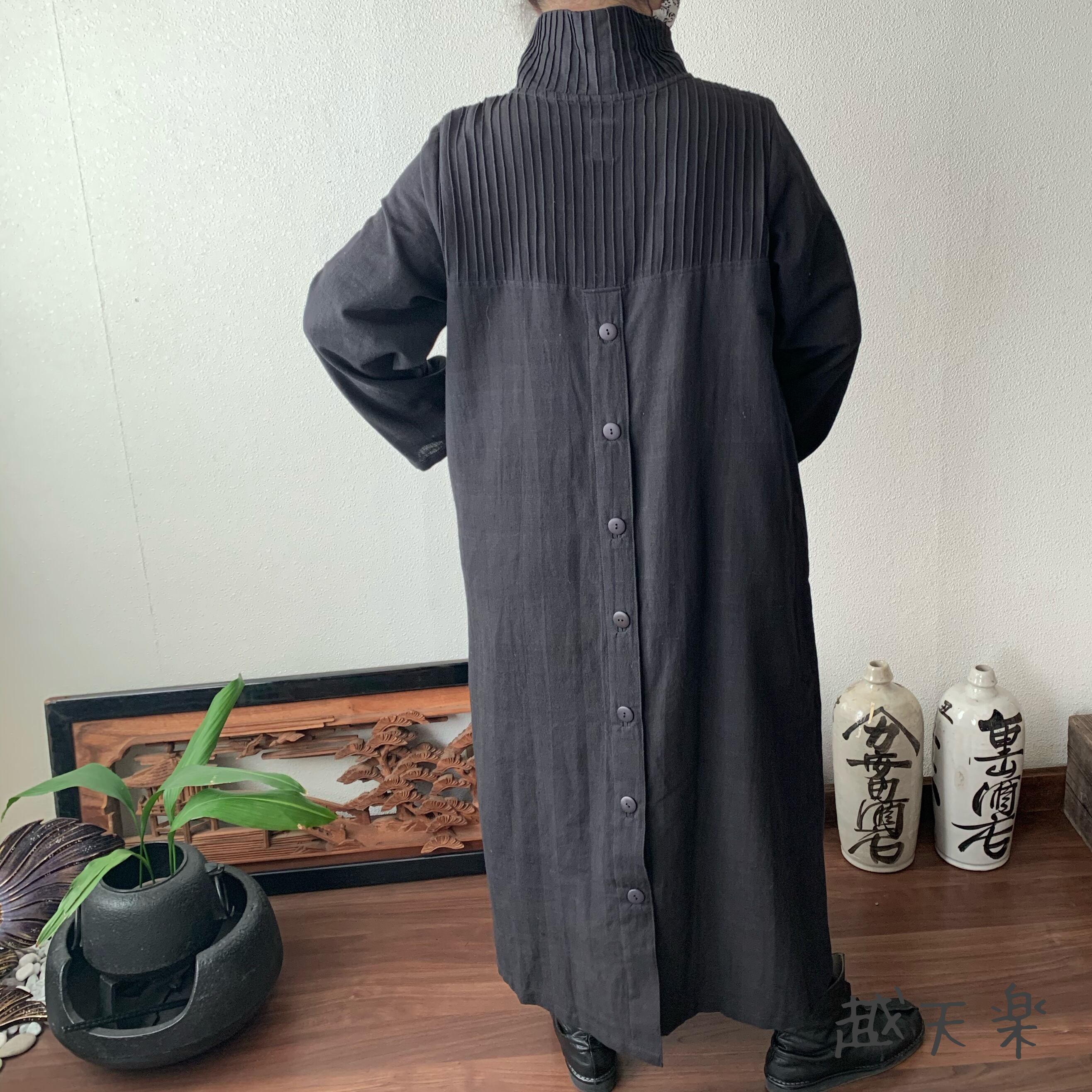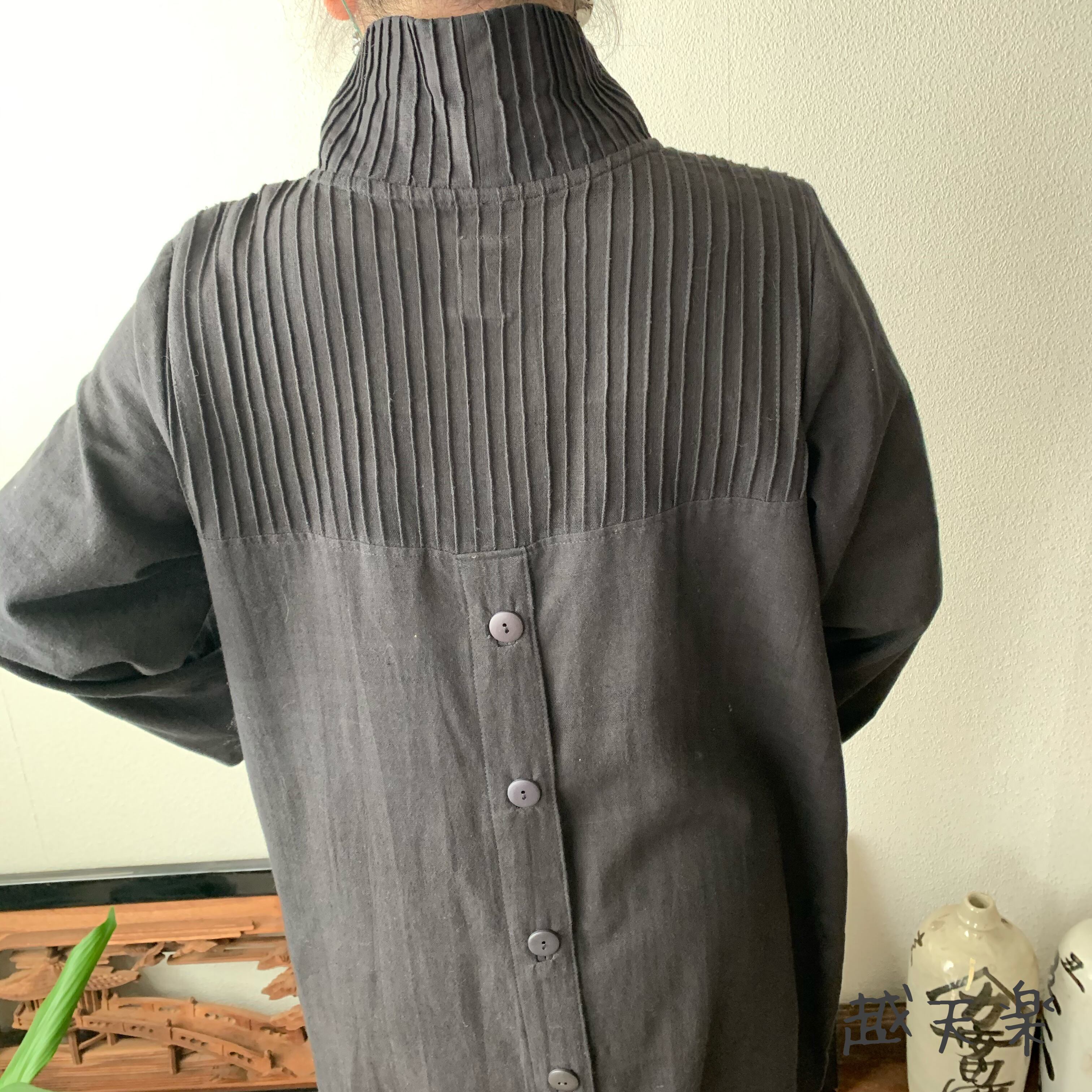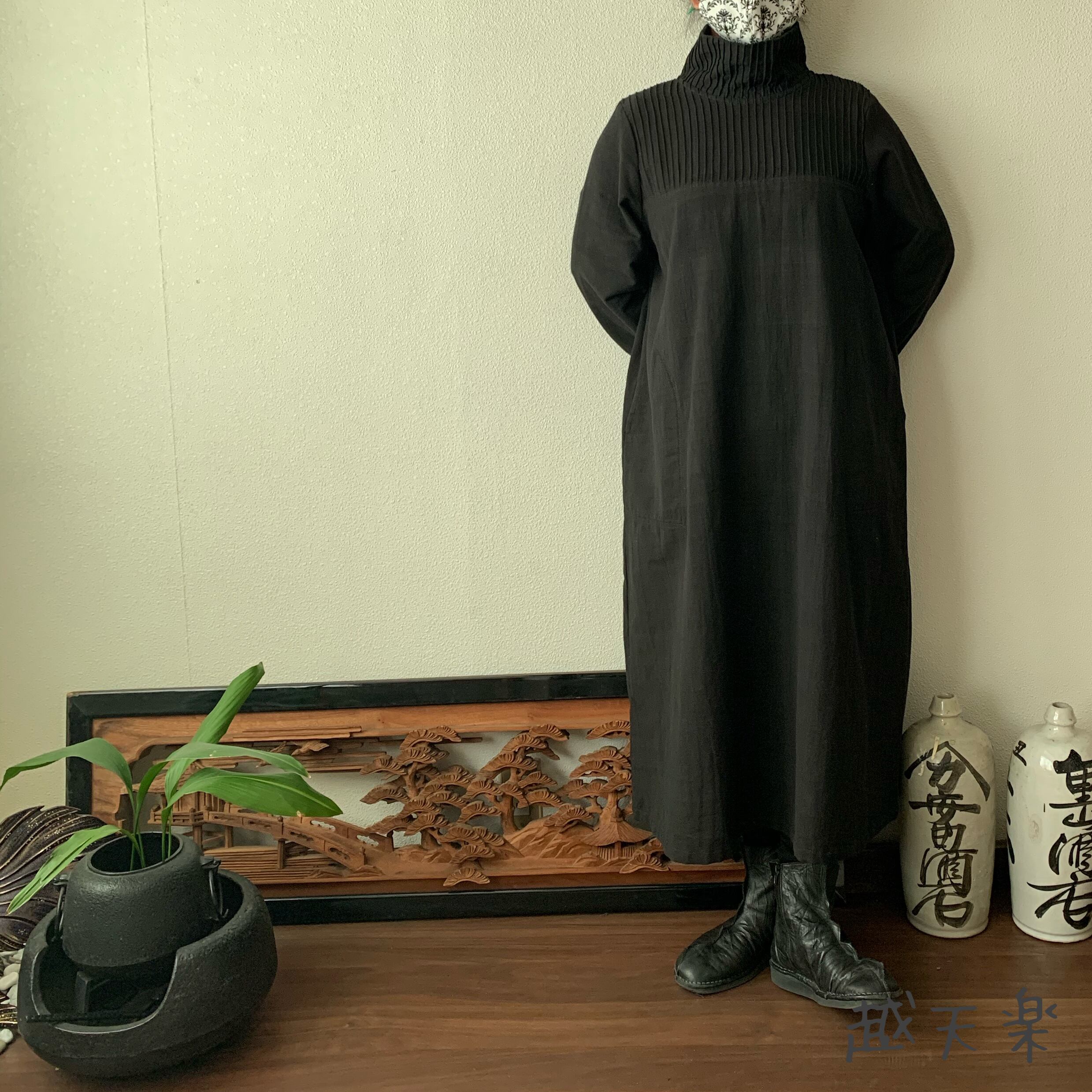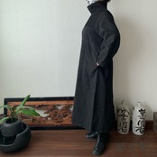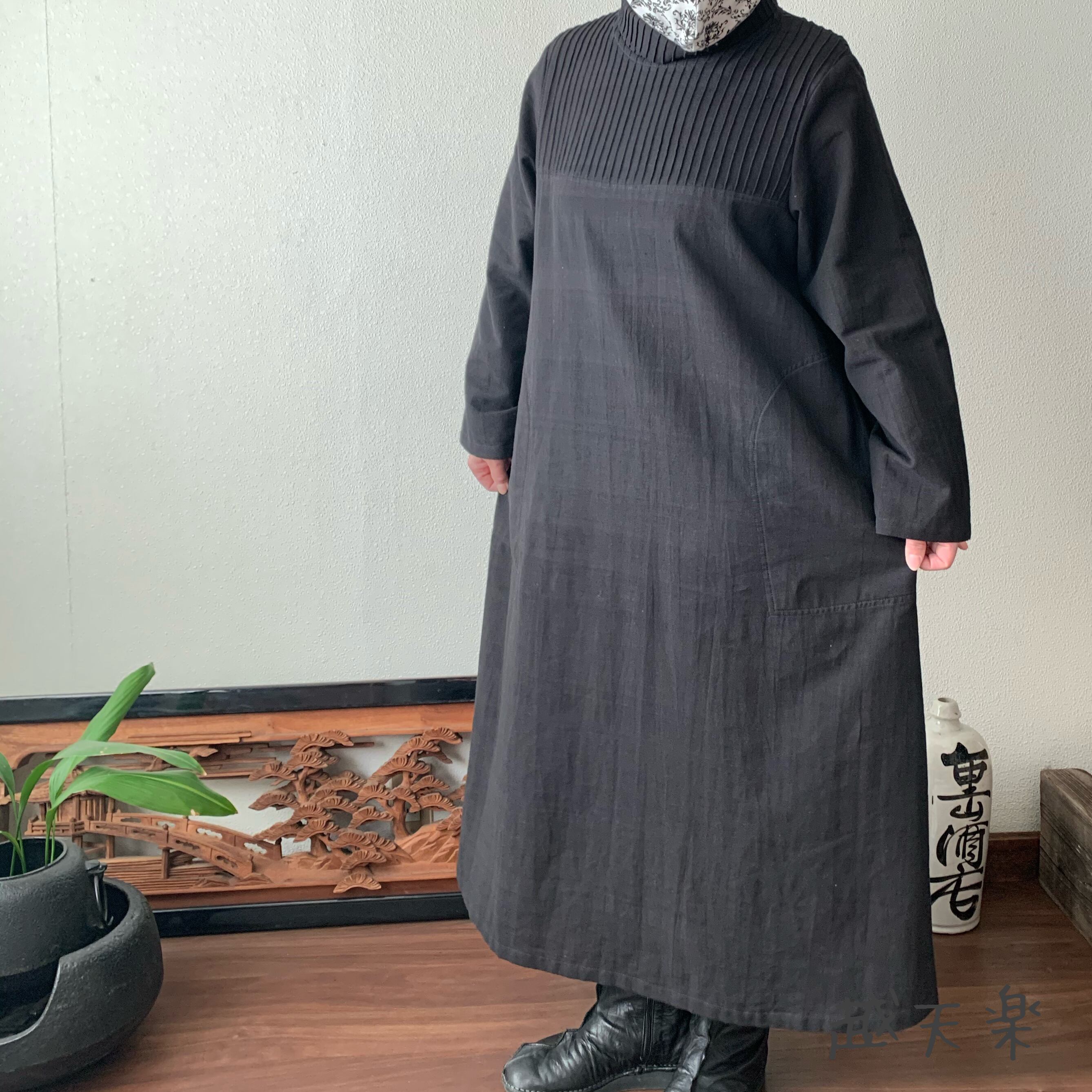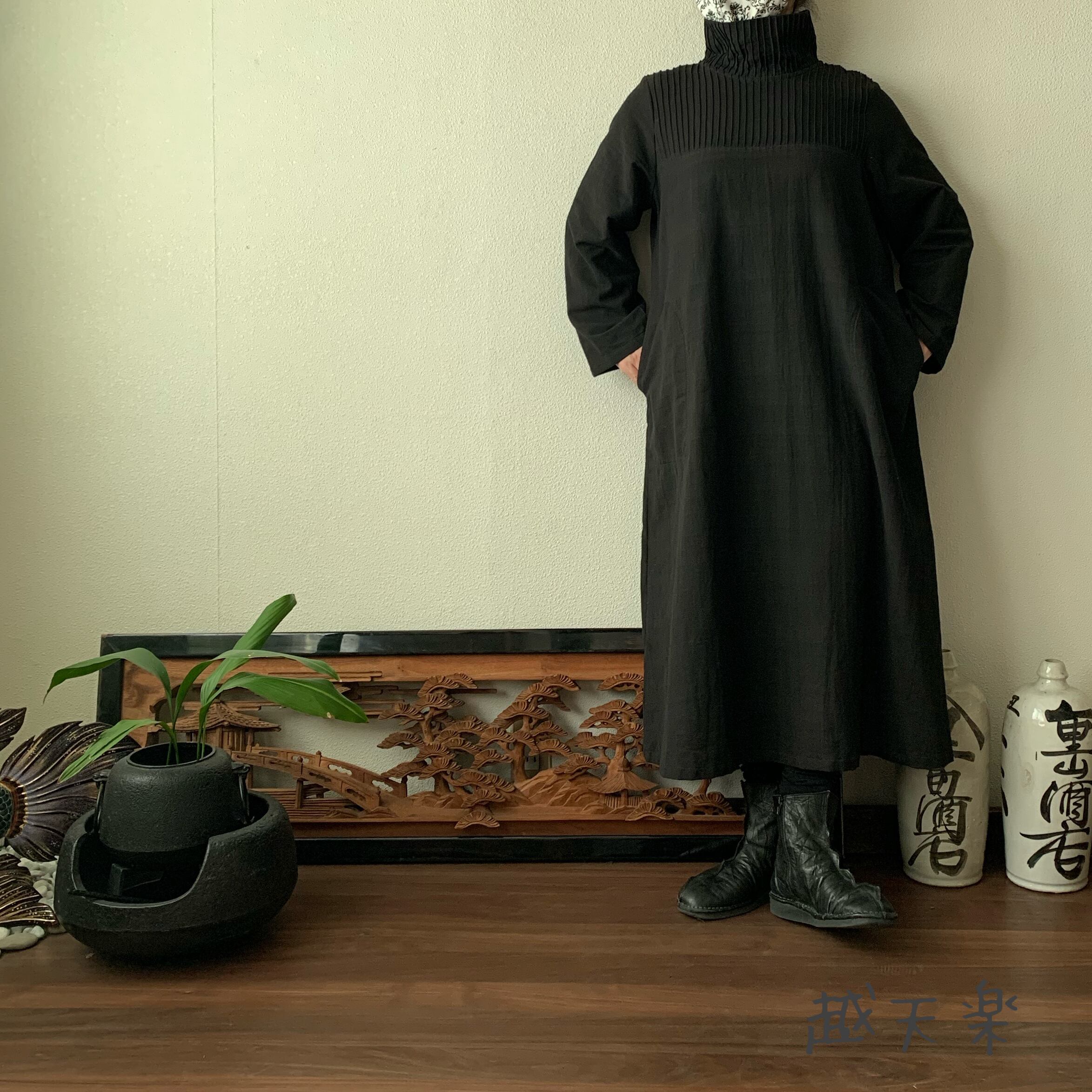 『ハイネック、上半身総ピンタック手織り綿長袖ワンピース 高め襟と後ろ上下に走るボタンですっきり着こなし』