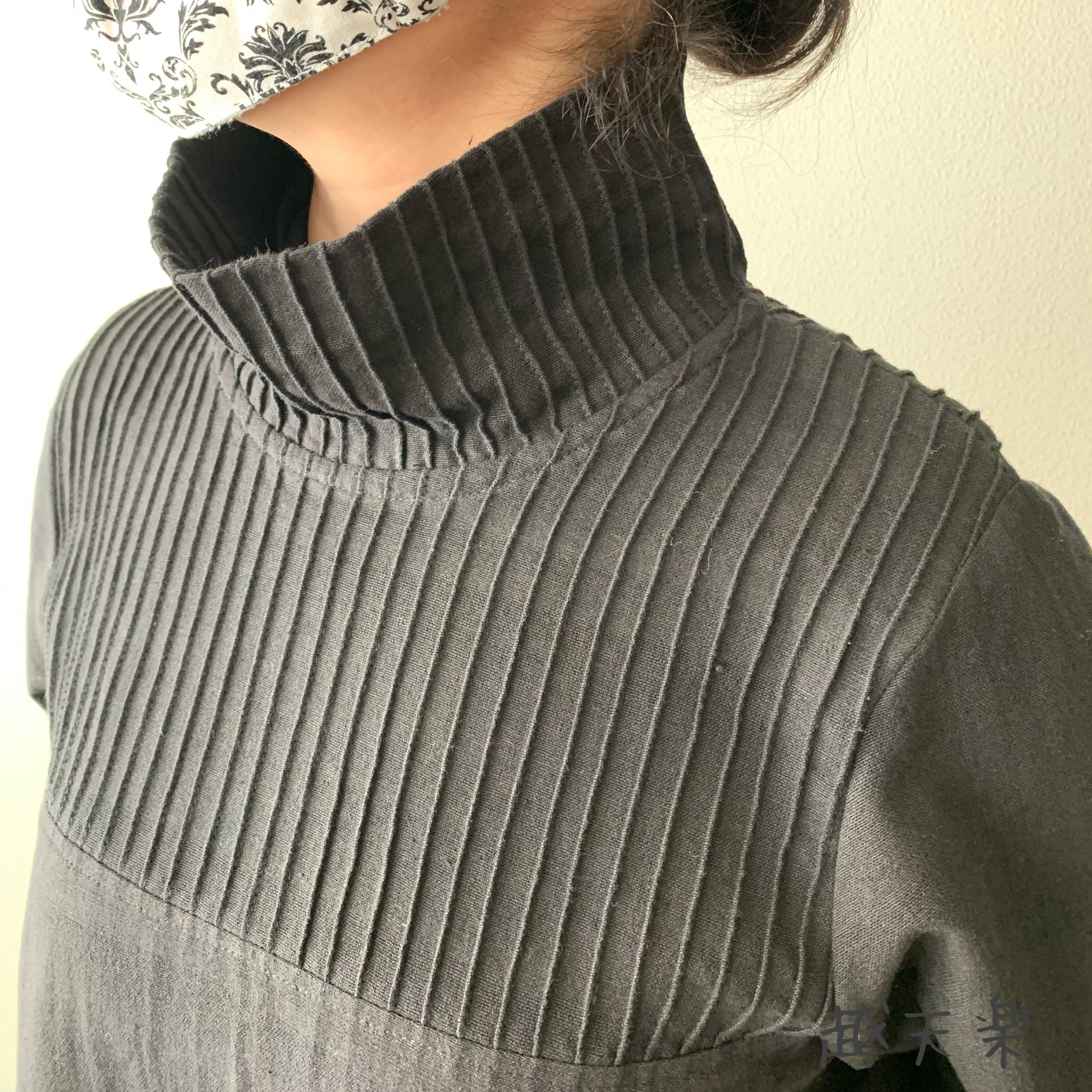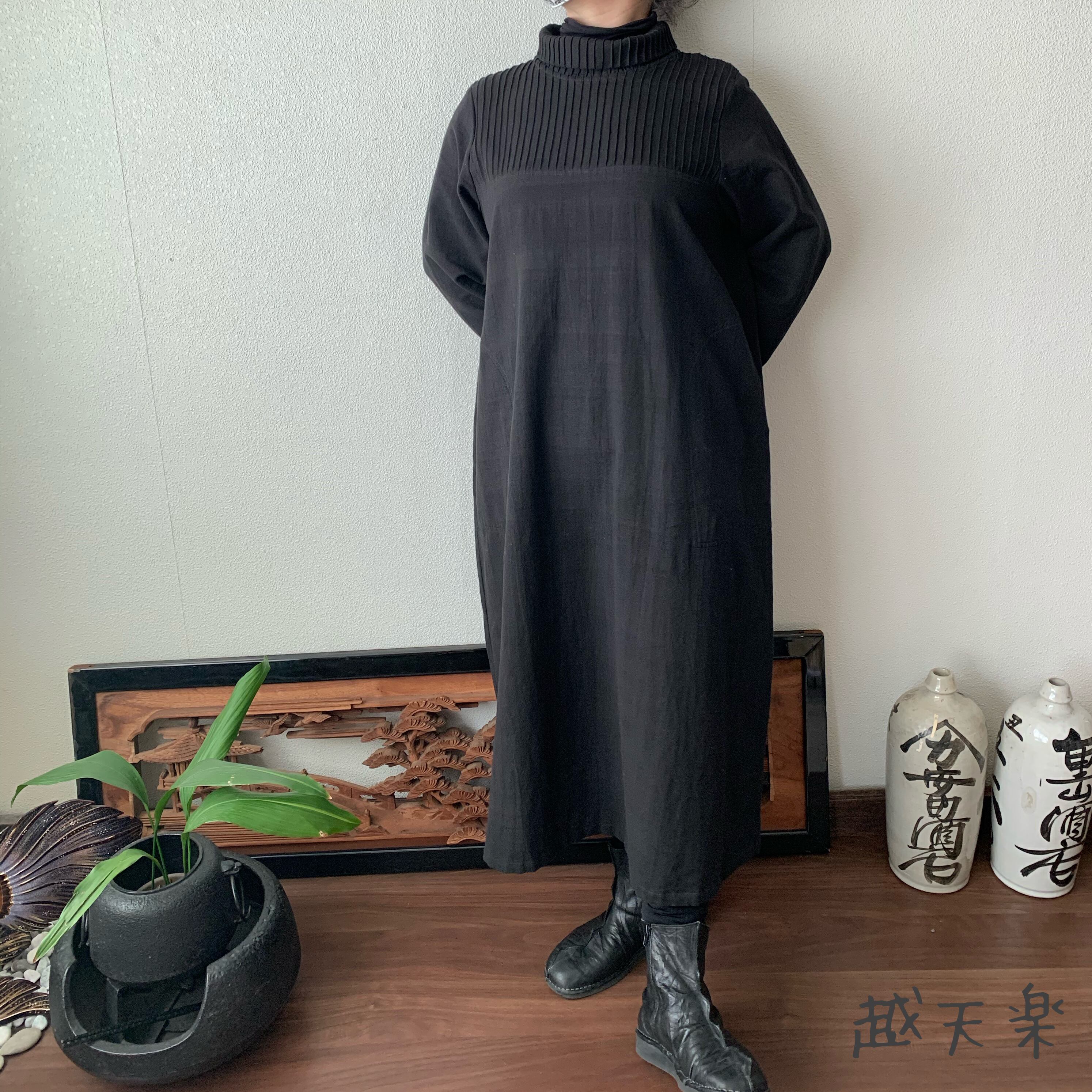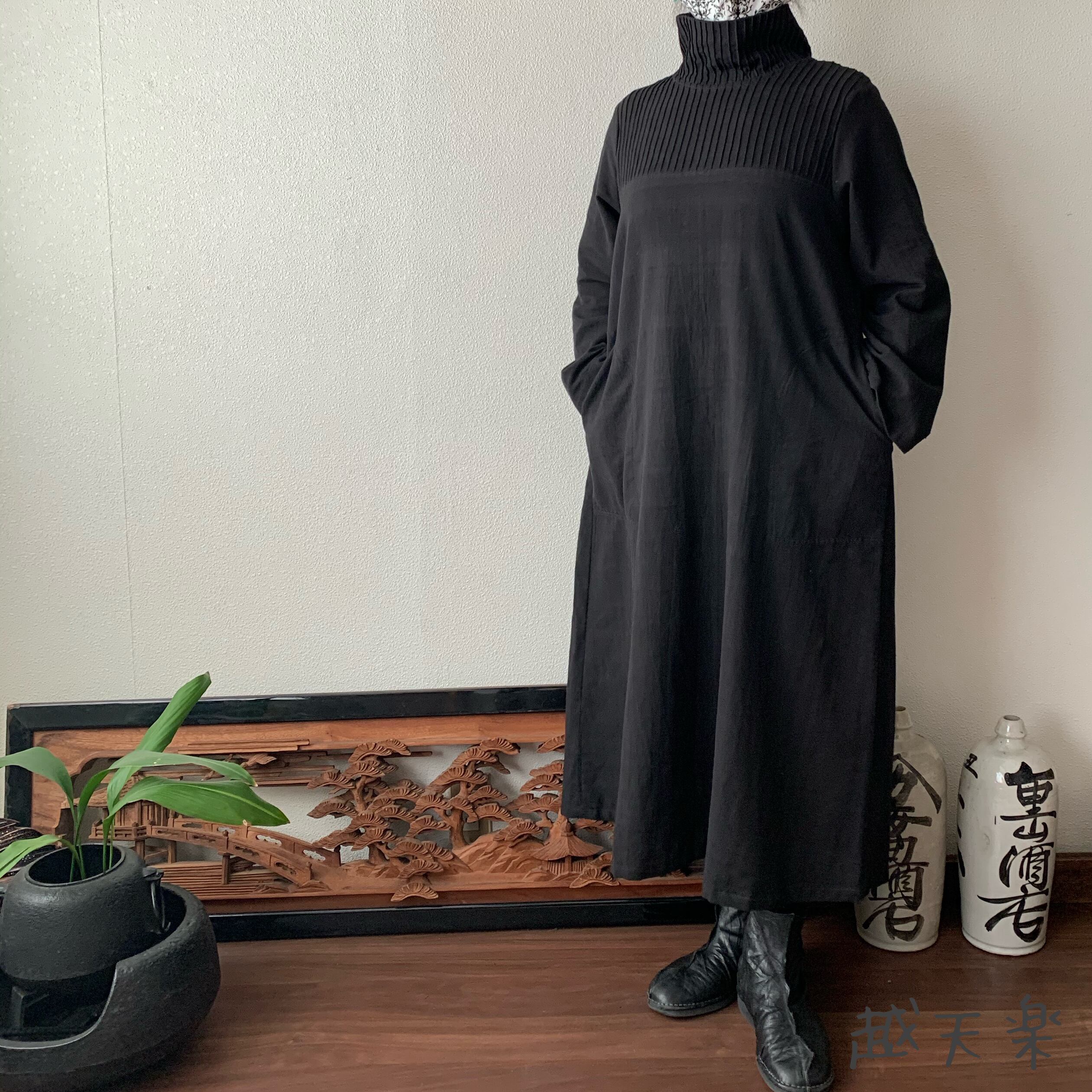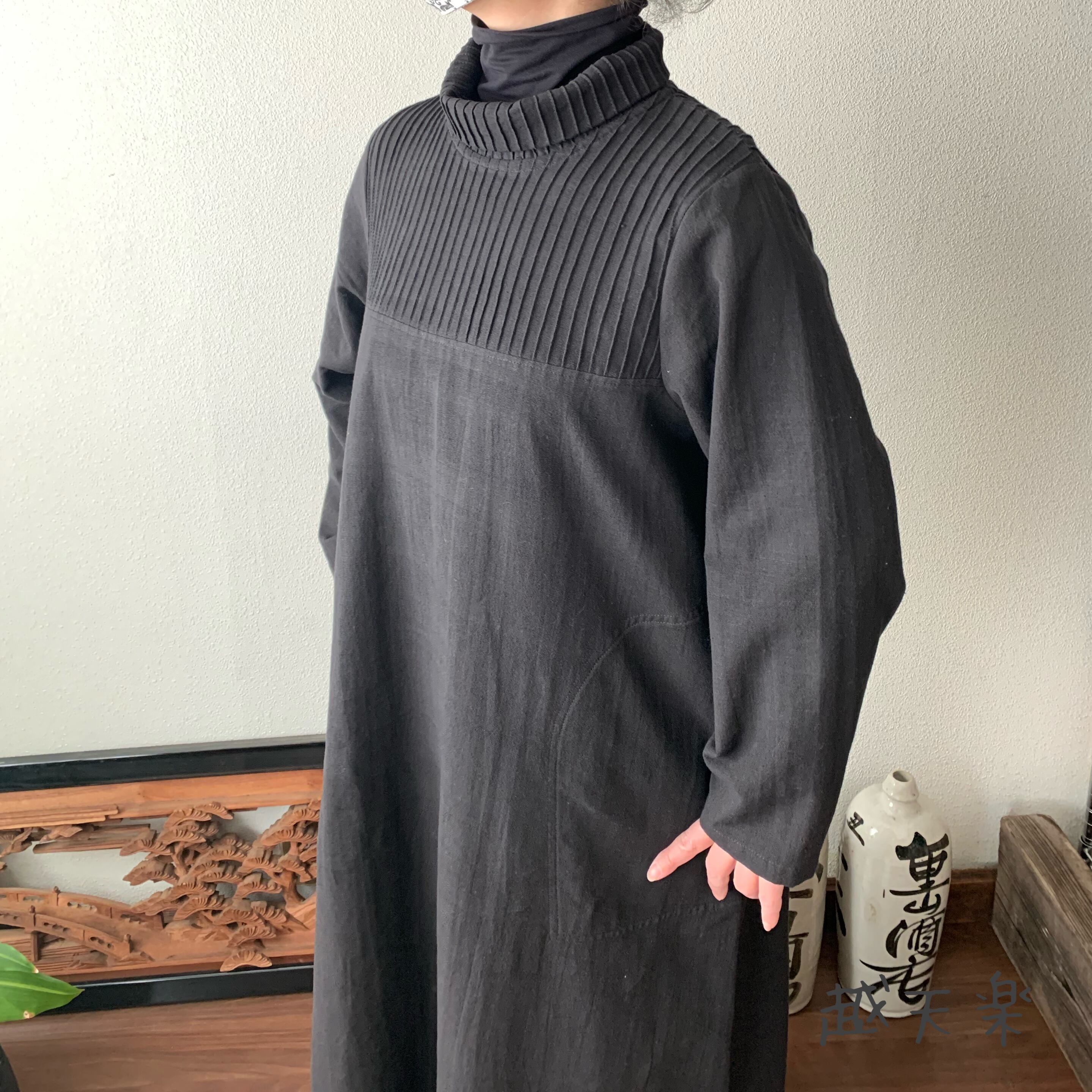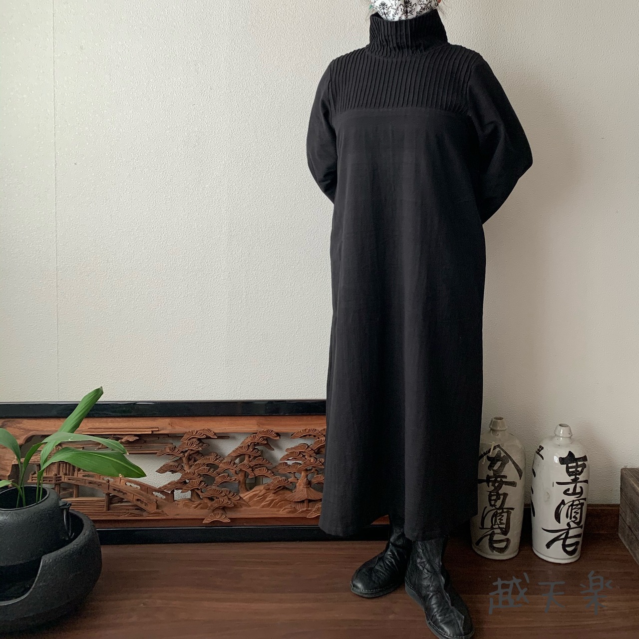 『ハイネック、上半身総ピンタック手織り綿長袖ワンピース 高め襟と後ろ上下に走るボタンですっきり着こなし』