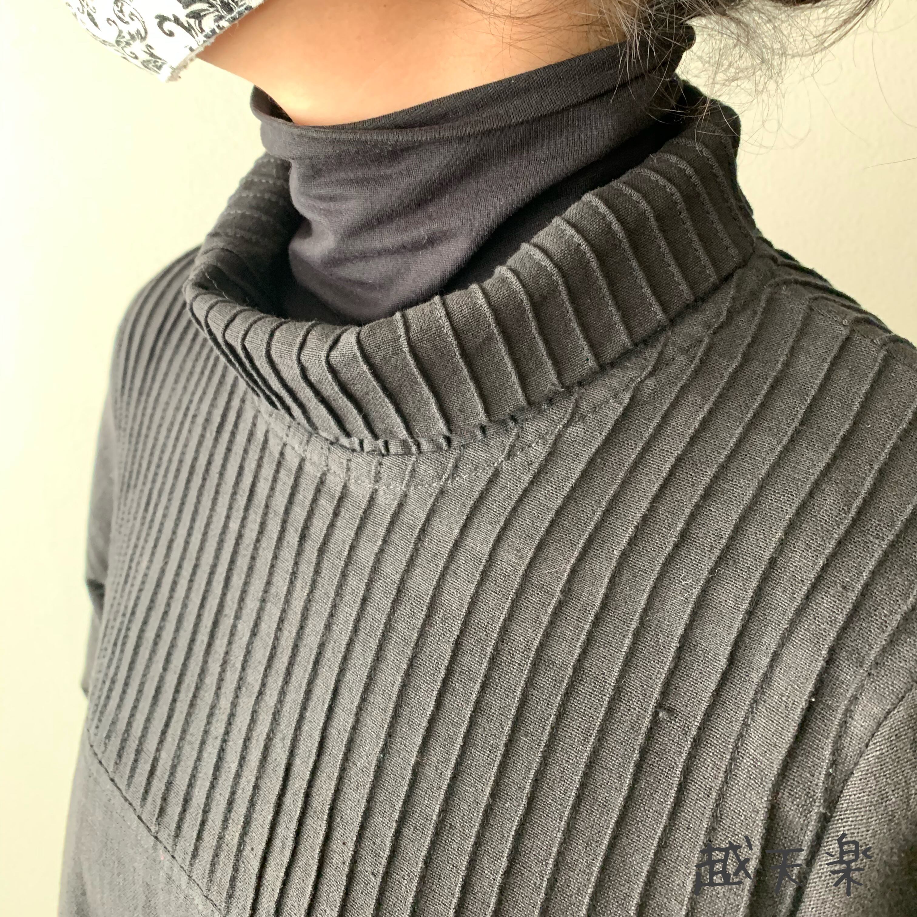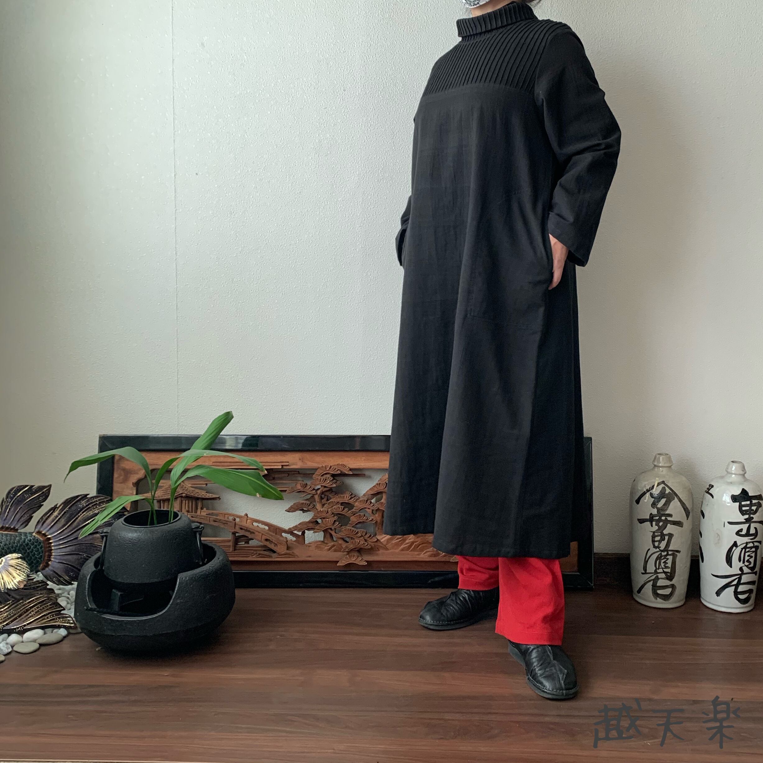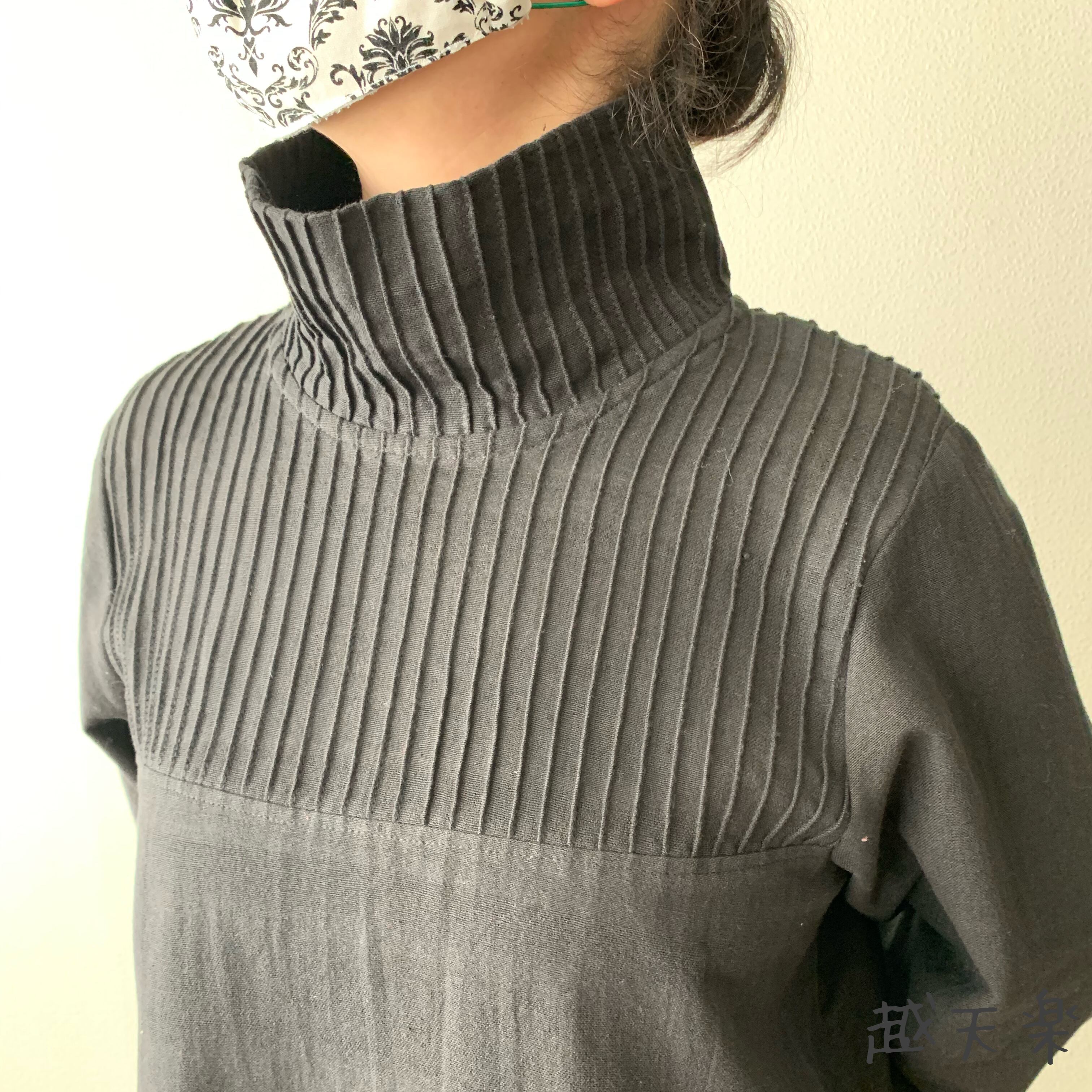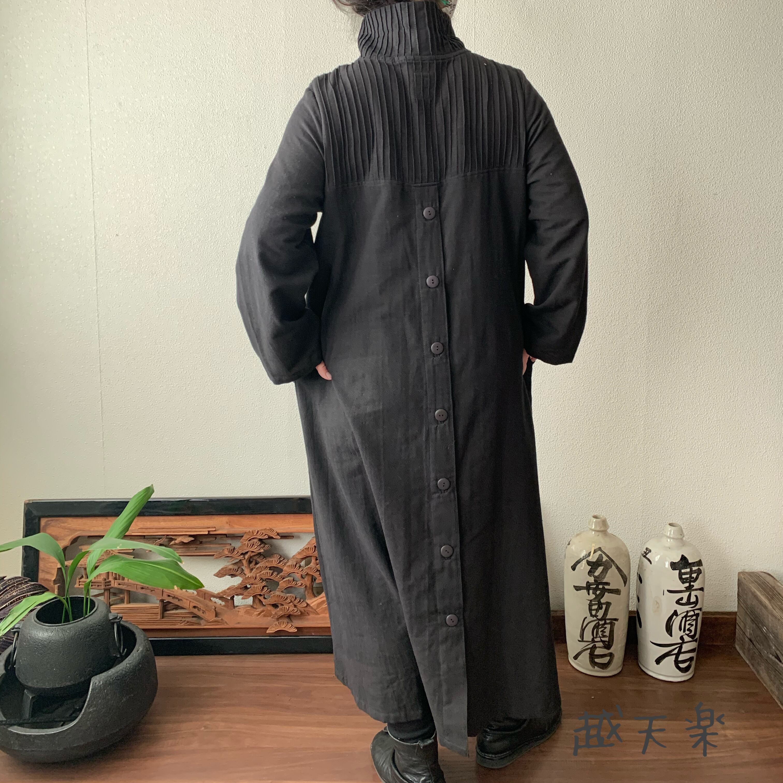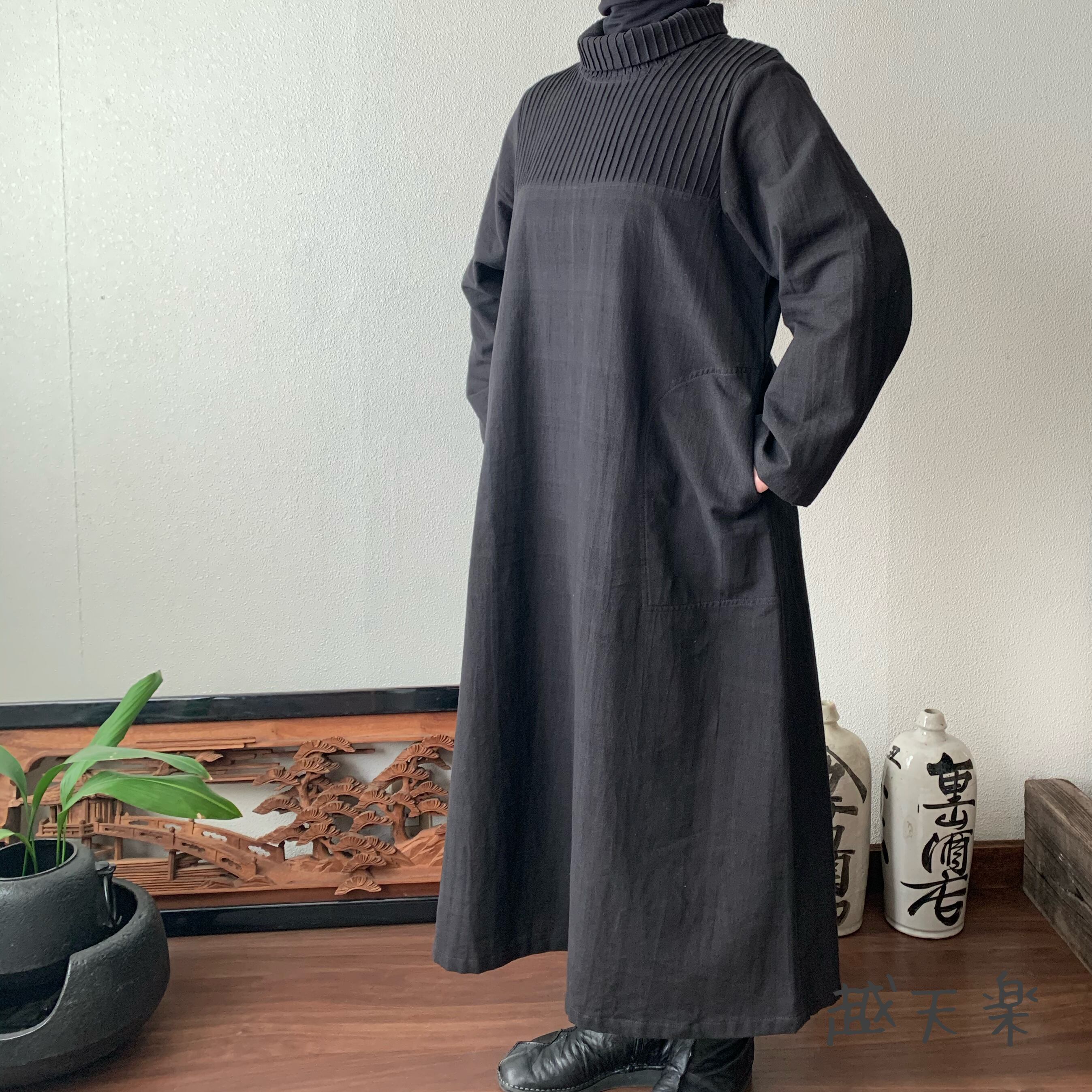 『ハイネック、上半身総ピンタック手織り綿長袖ワンピース 高め襟と後ろ上下に走るボタンですっきり着こなし』