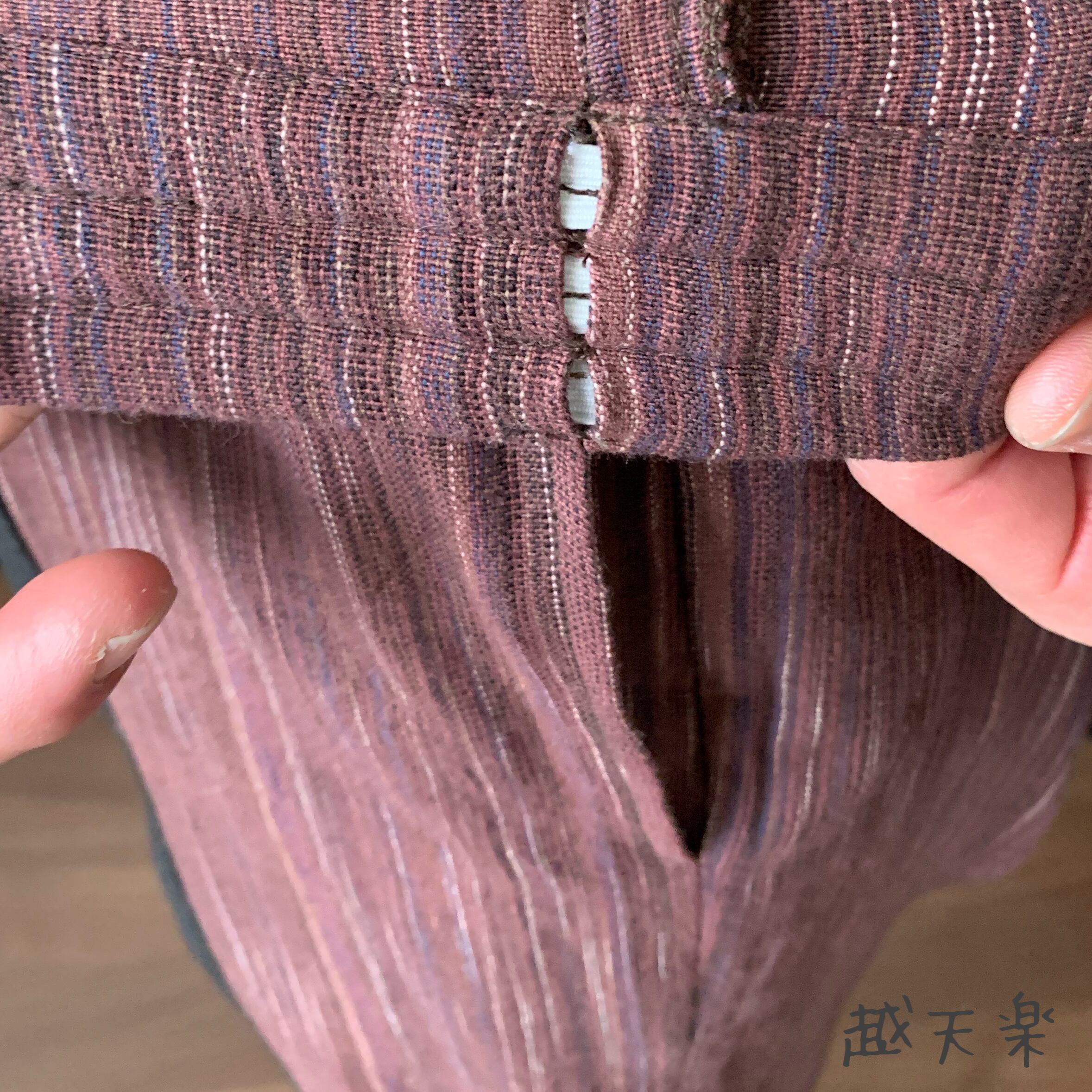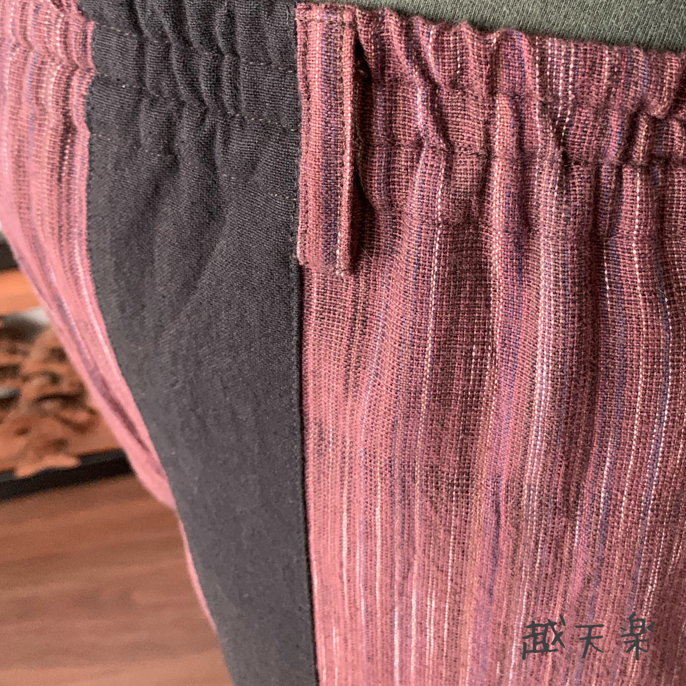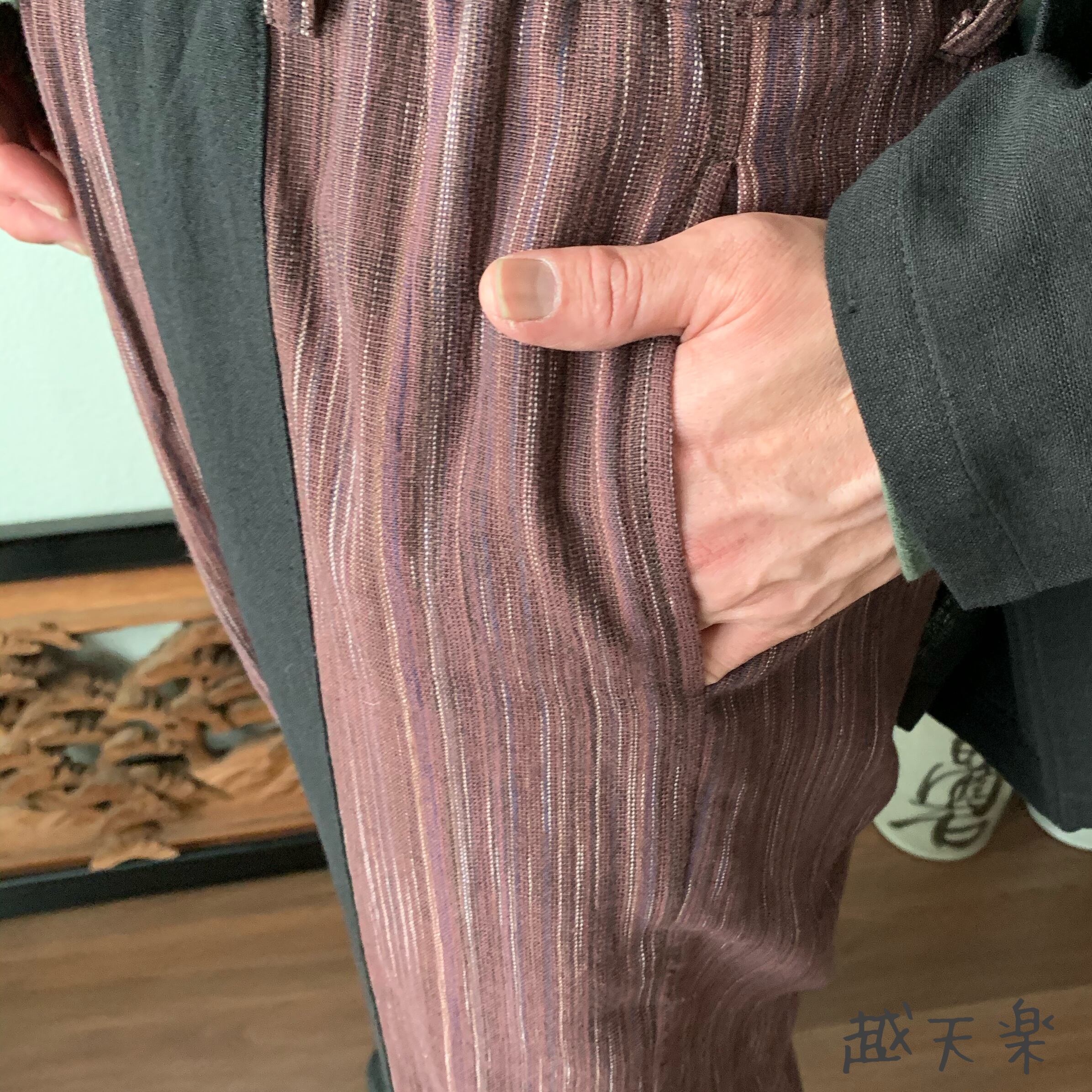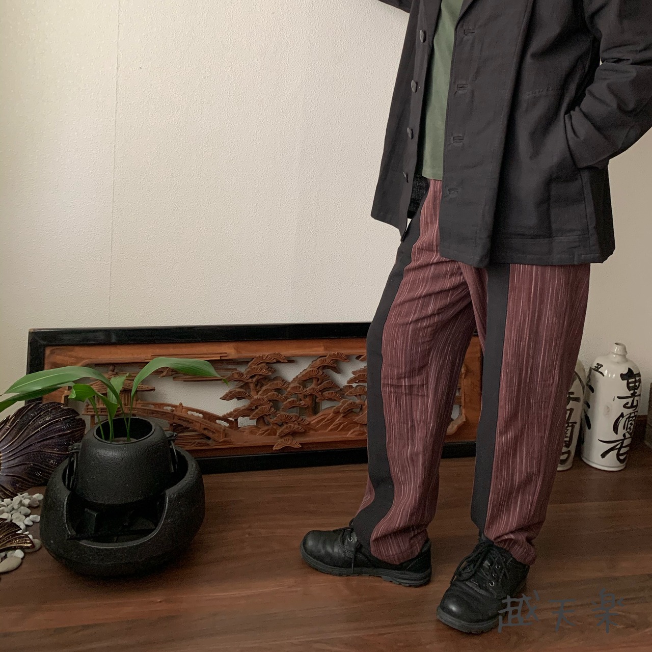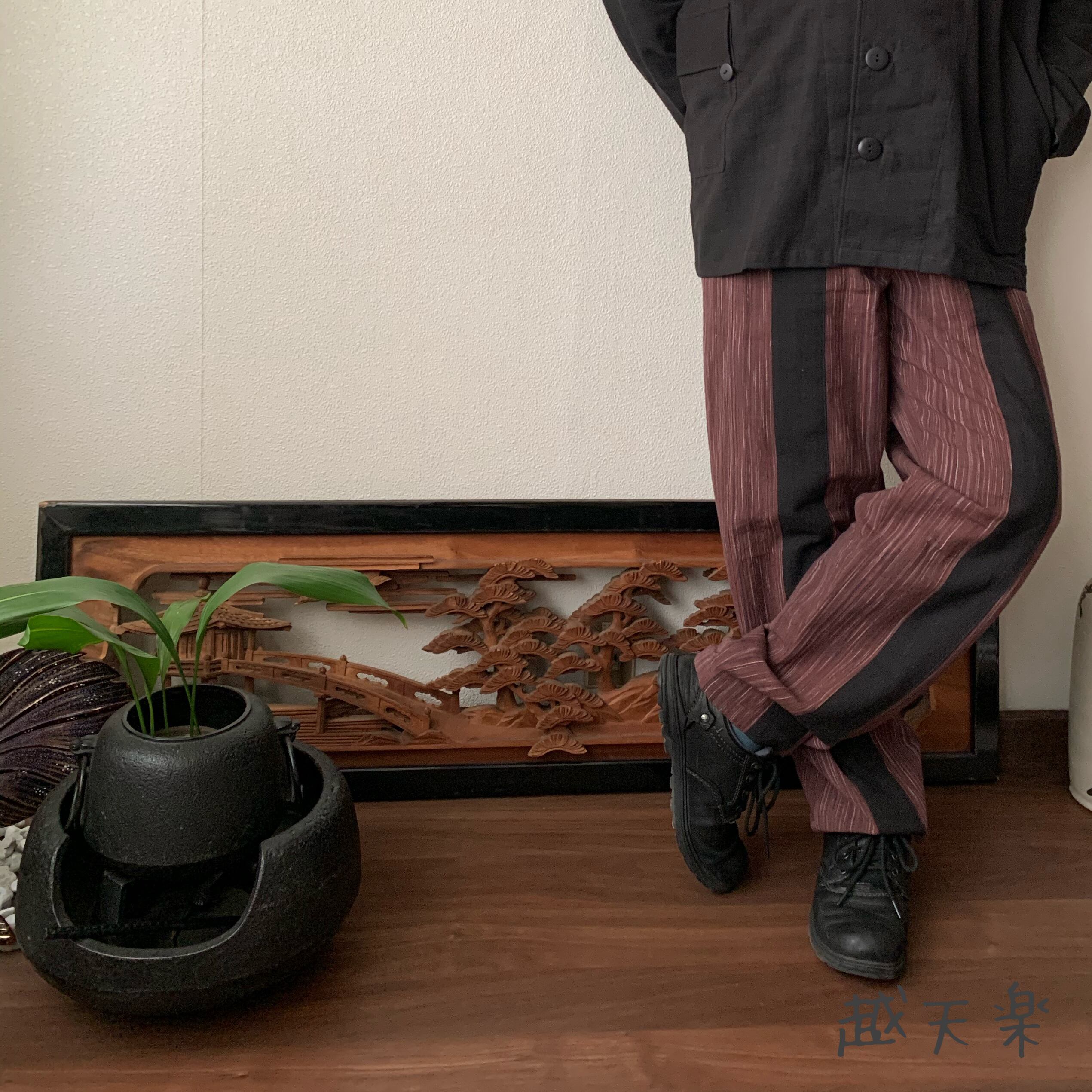 越天楽の得意な前と後ろに出方の違うデザインで前身頃だけ上から下に無地の生地ラインつけることにより視覚的に足が長く見える手織り綿メンズパンツです。