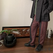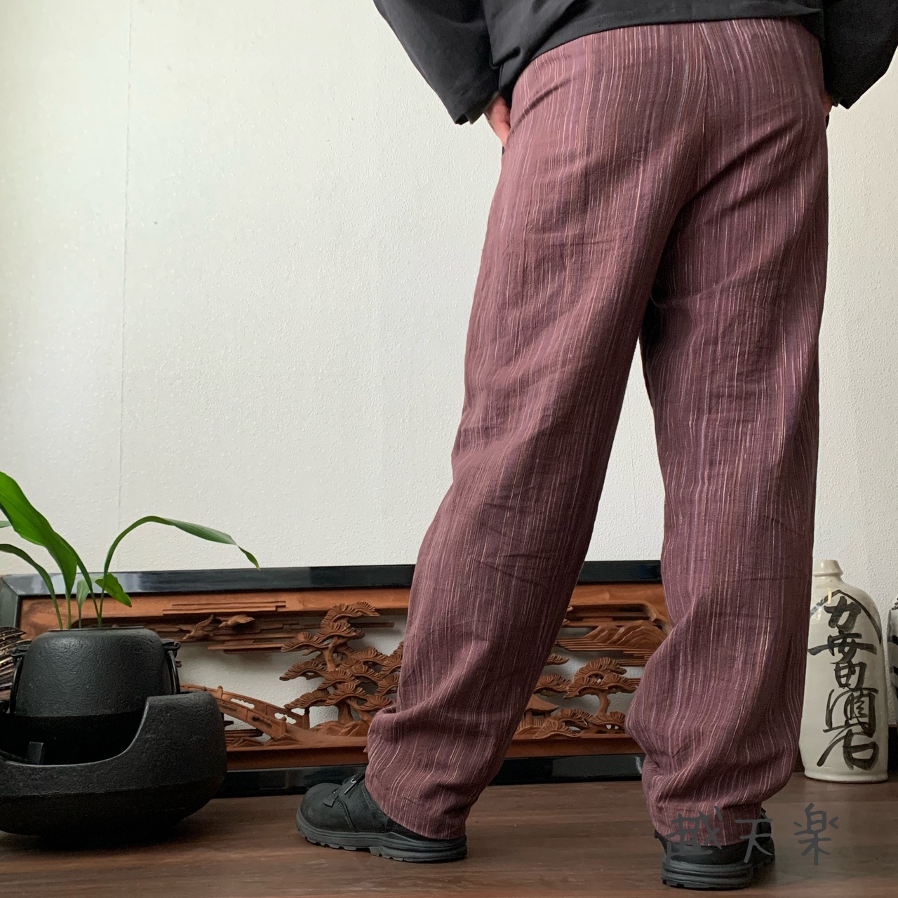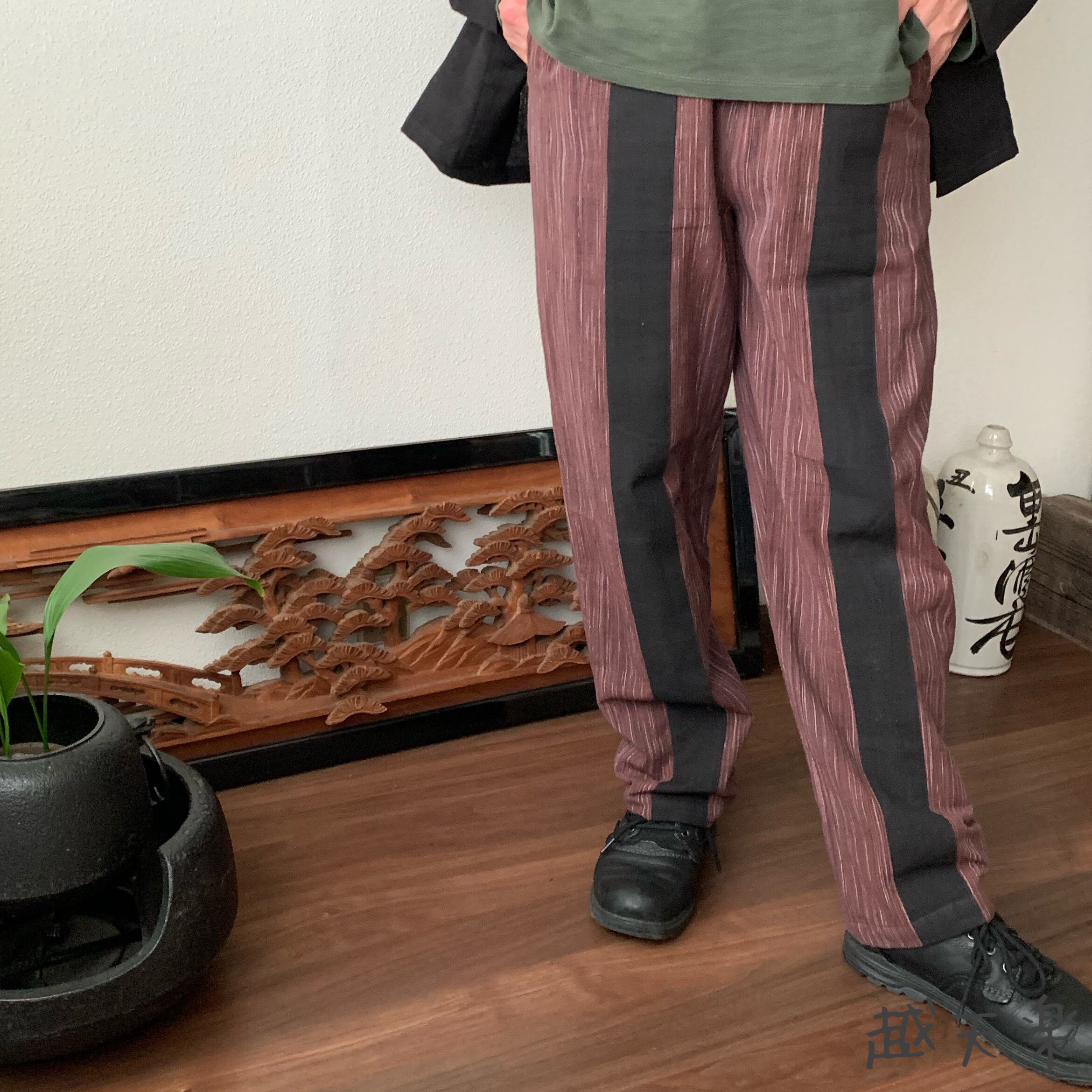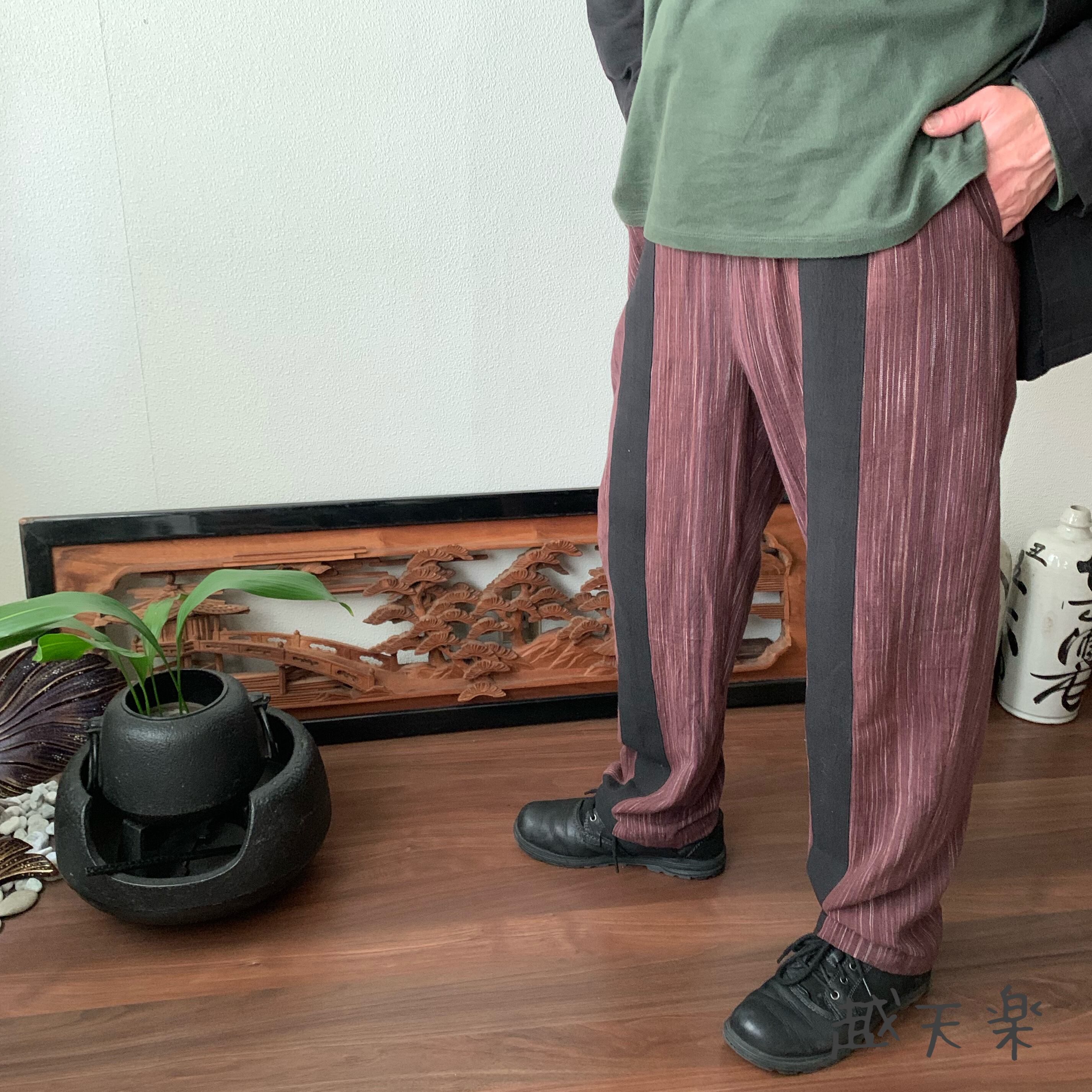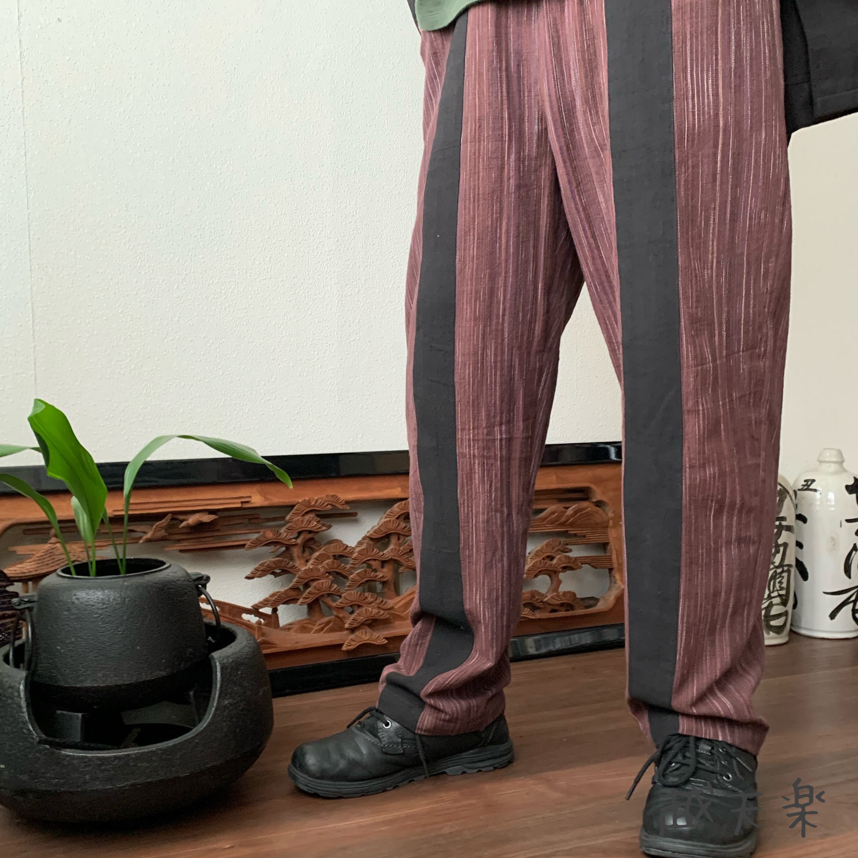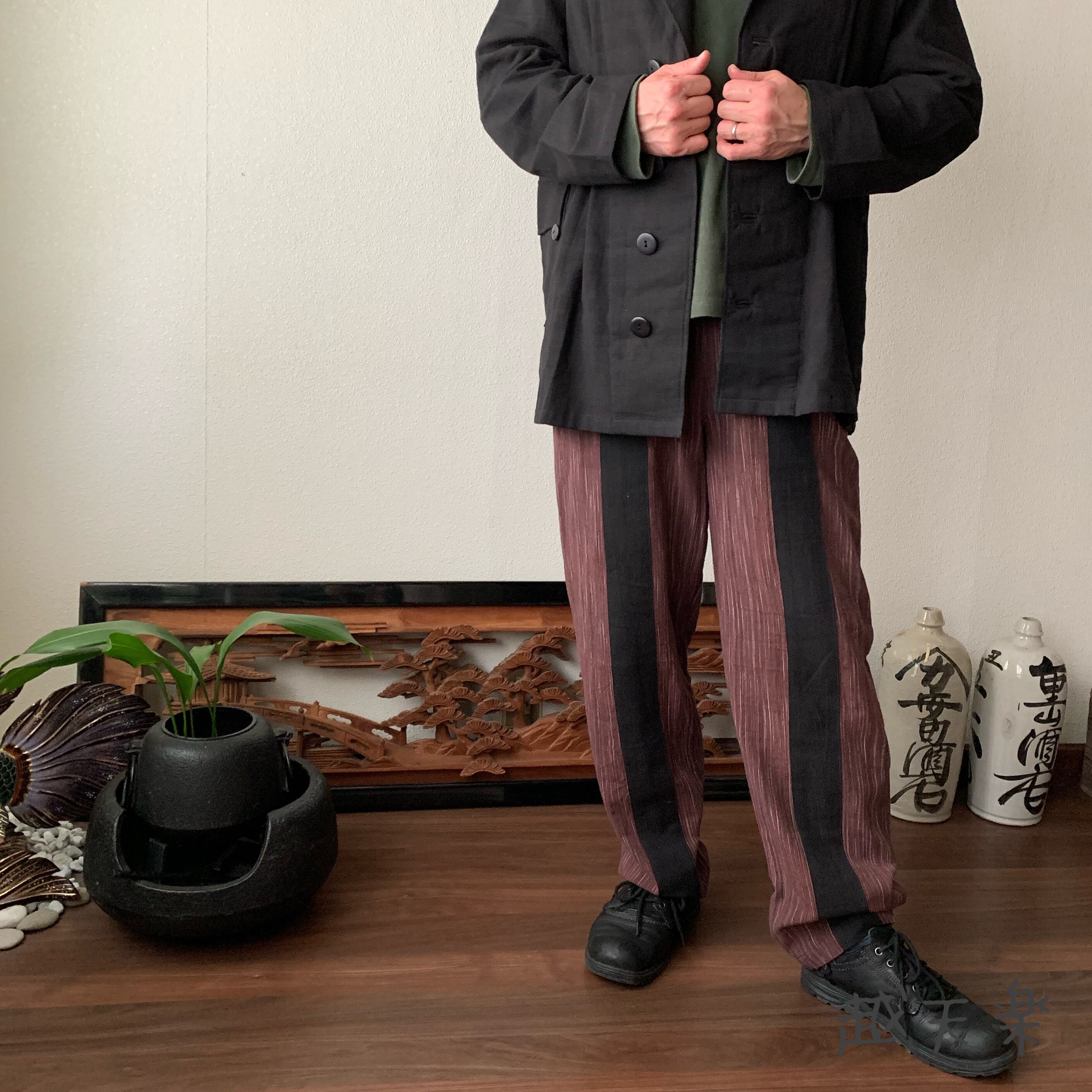 前身切り替えライン手織り綿メンズパンツ 前身頃を上下に切り替えラインが走るシャープな印象 赤紫絣