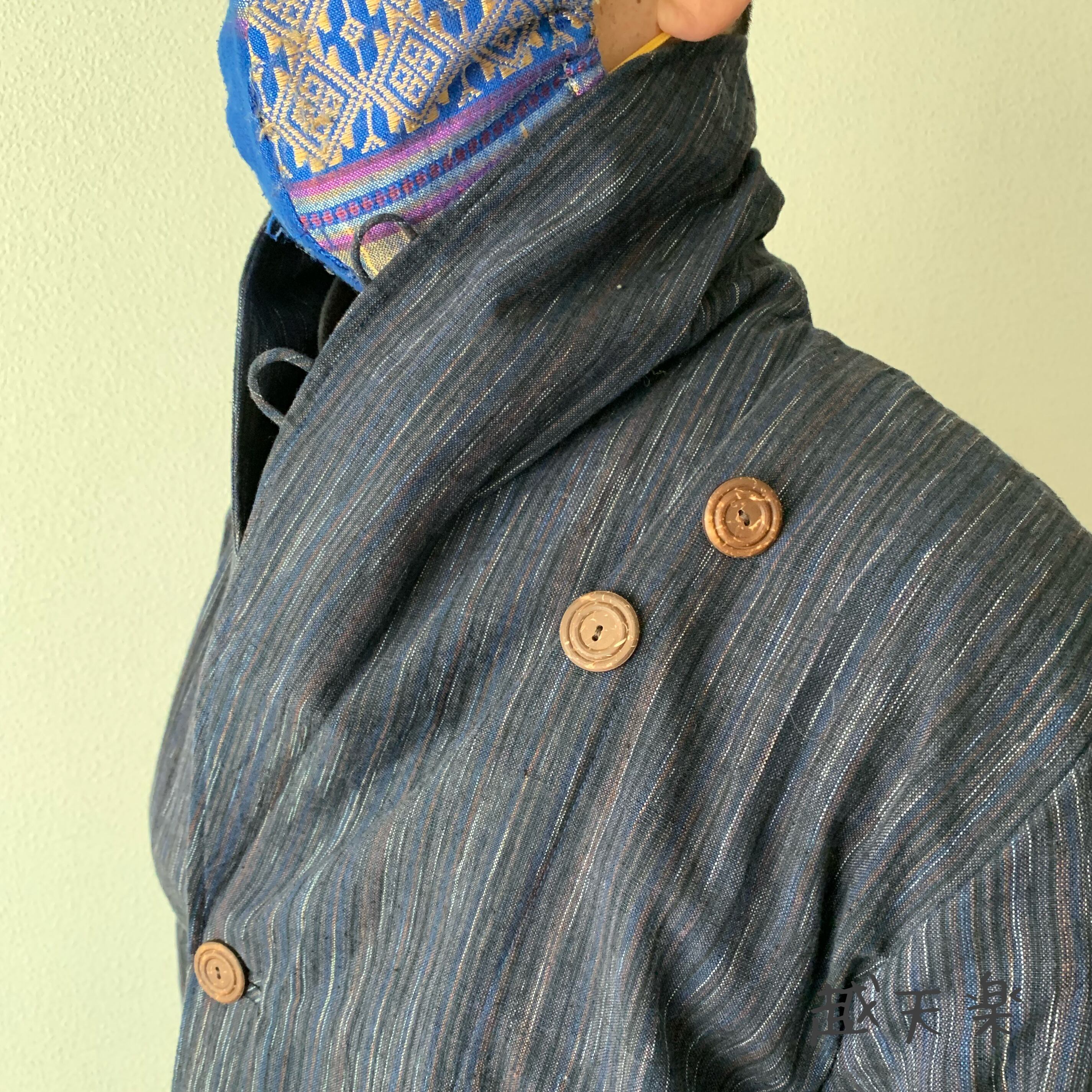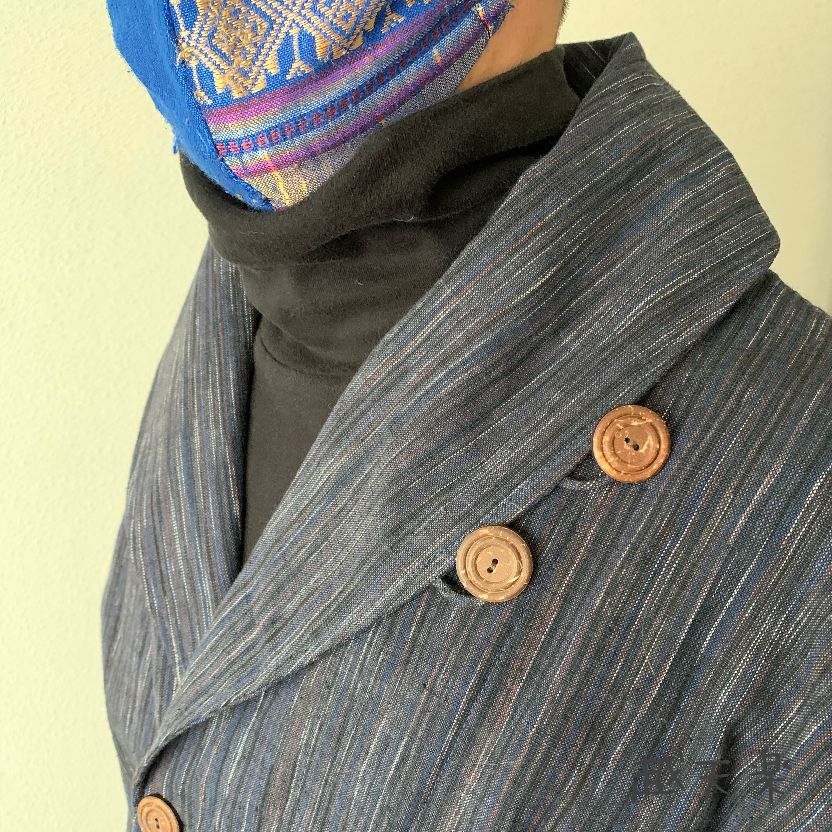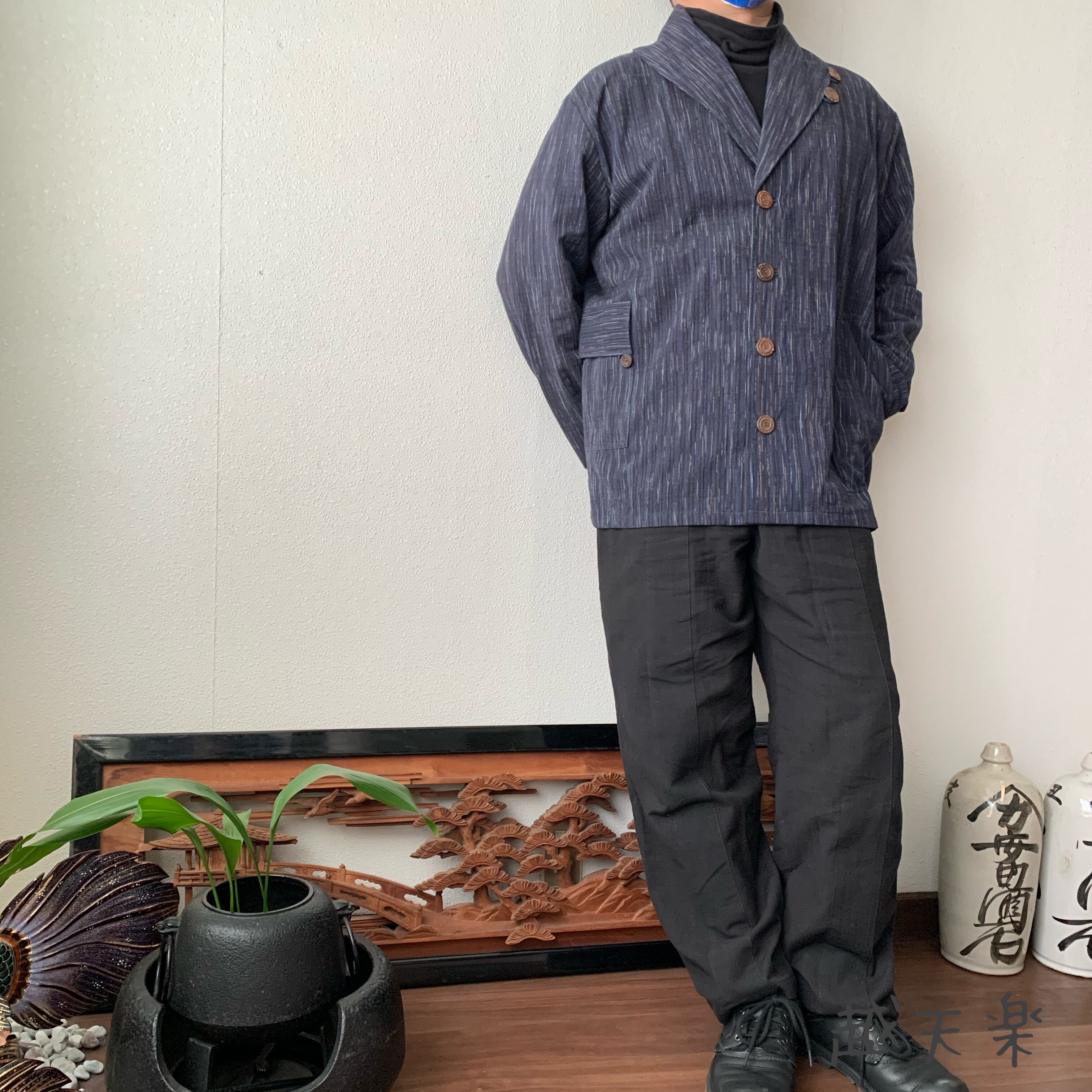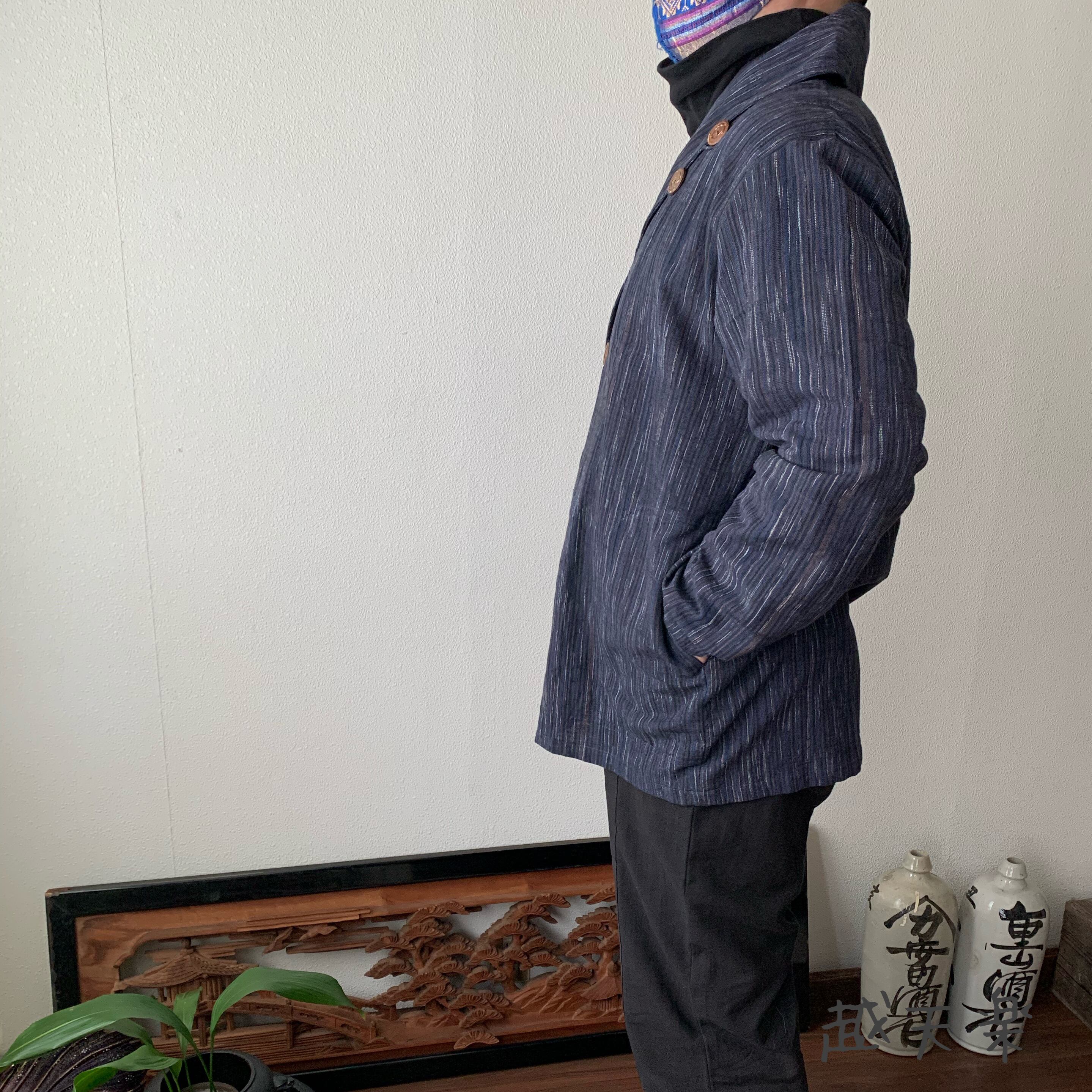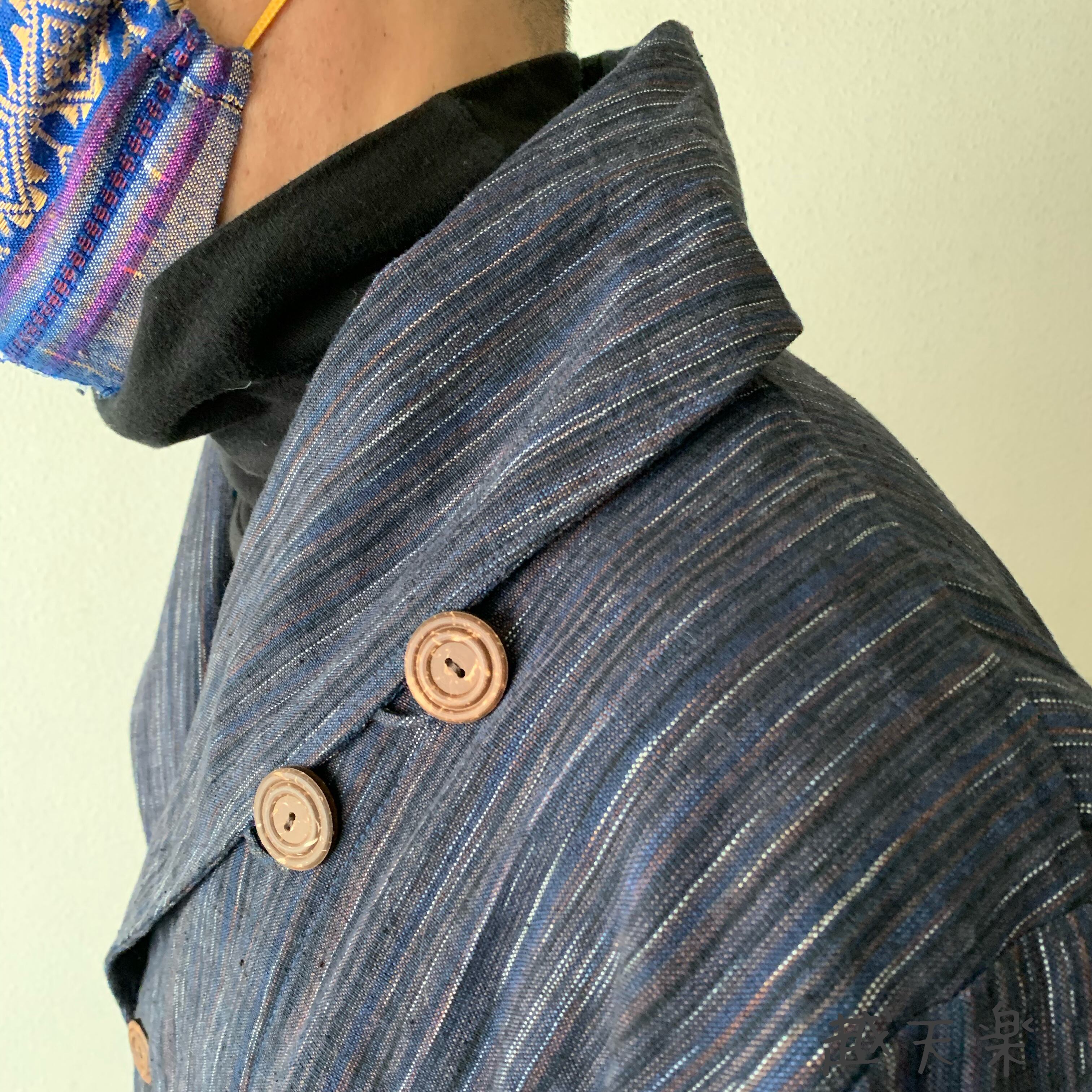 イタリアンカラー手織り綿長袖メンズブラウス 襟についたダブルボタン、サイドポケットでよりかっこよく 紺絣