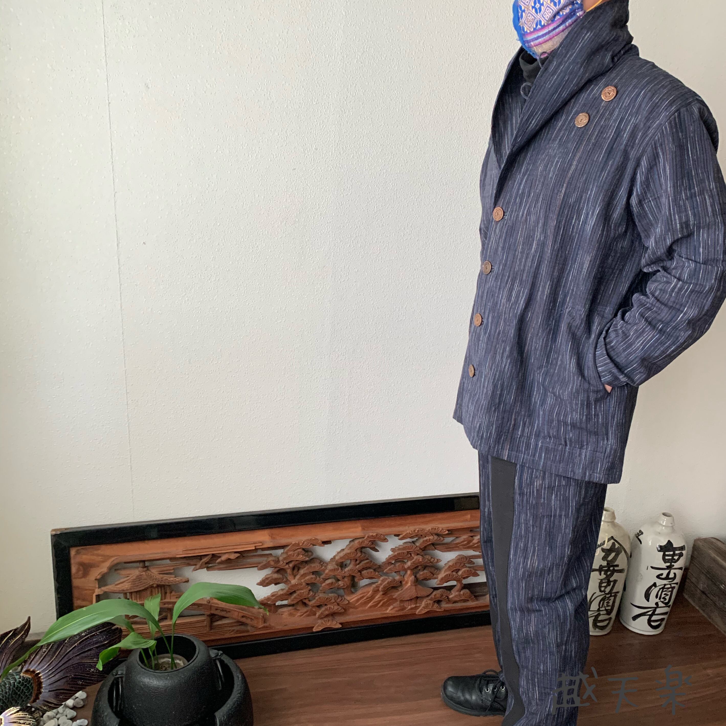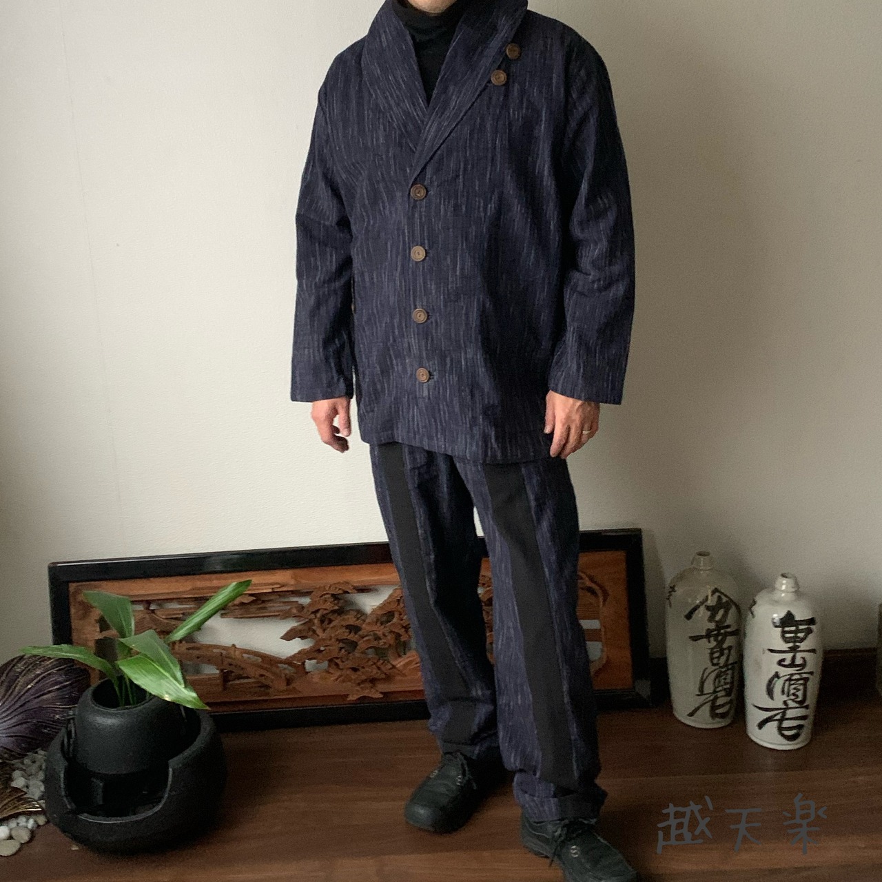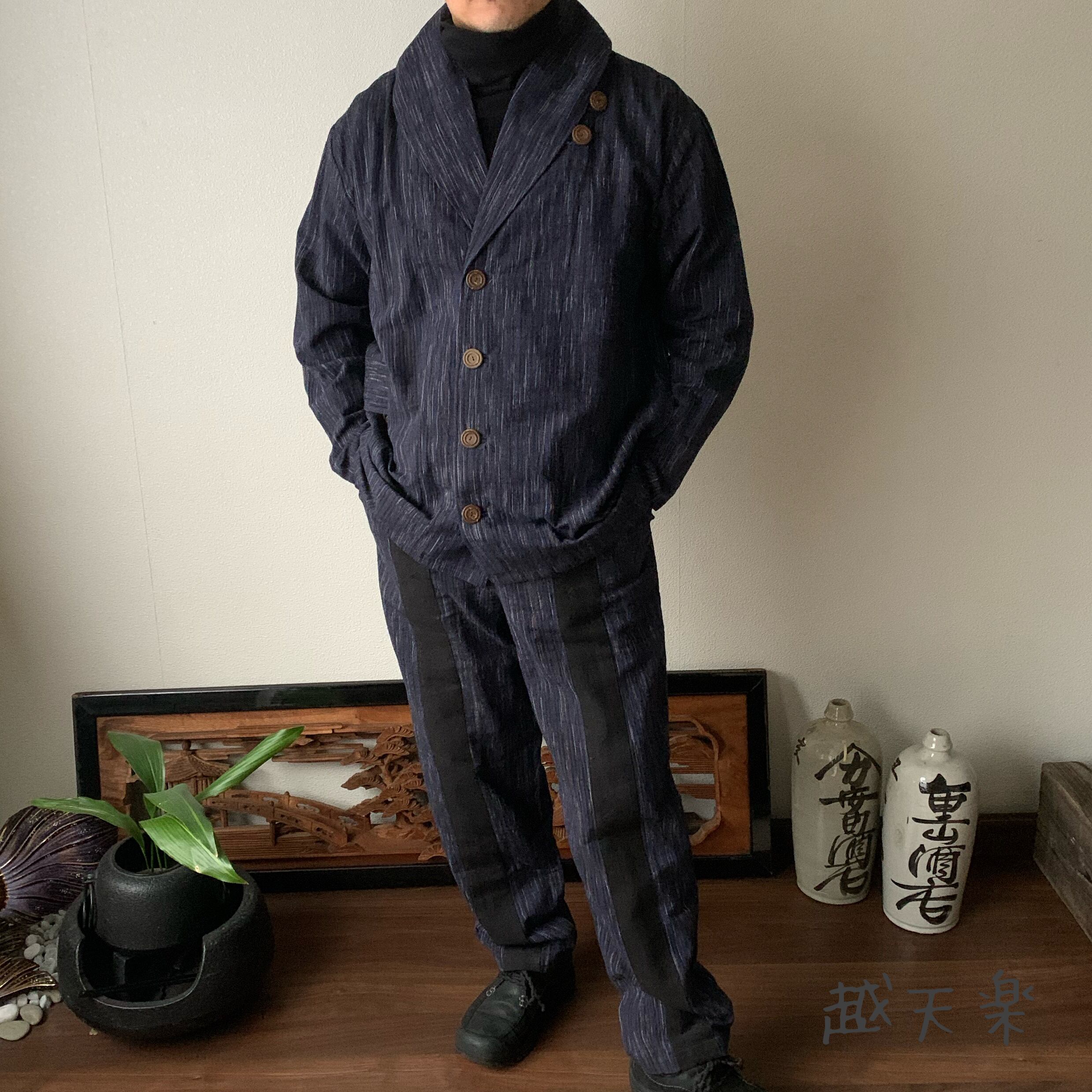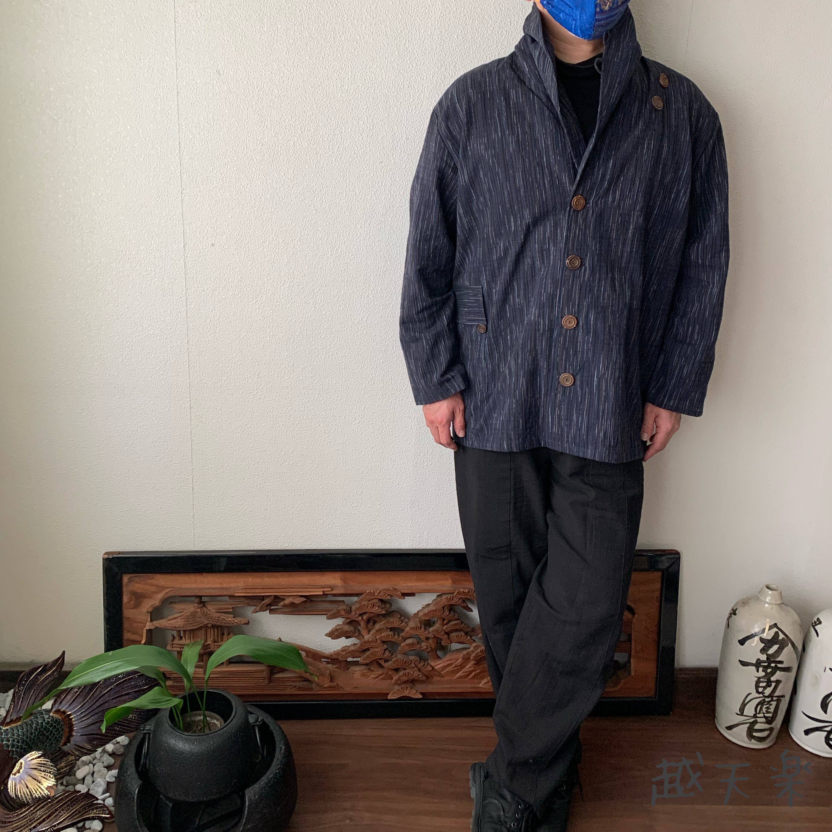 イタリアンカラー手織り綿長袖メンズブラウス 襟についたダブルボタン、サイドポケットでよりかっこよく 紺絣